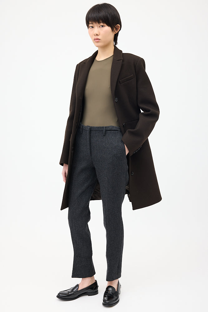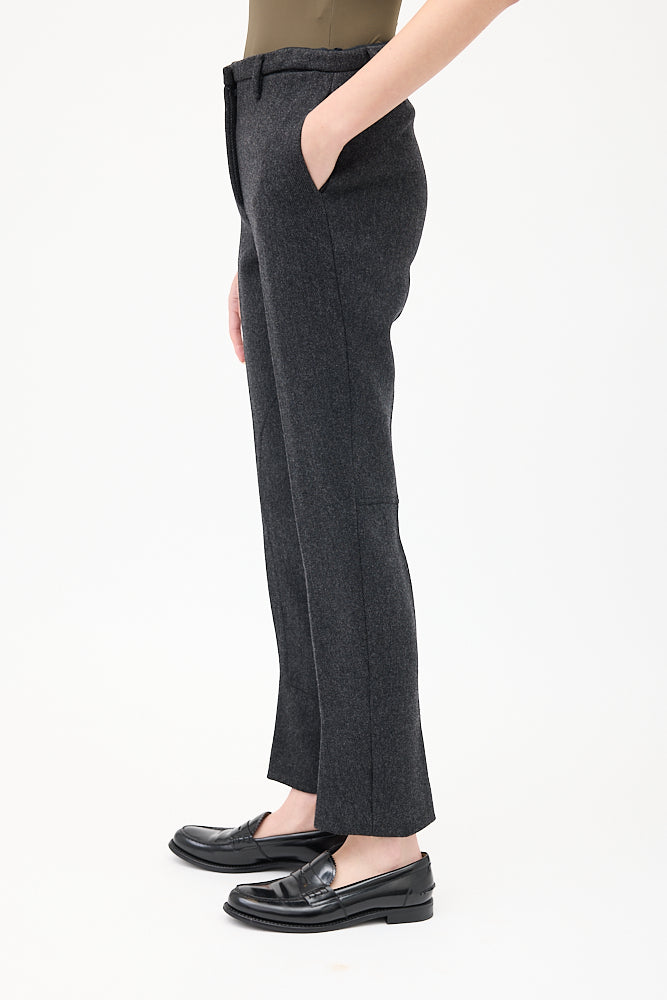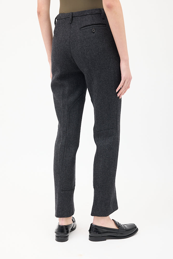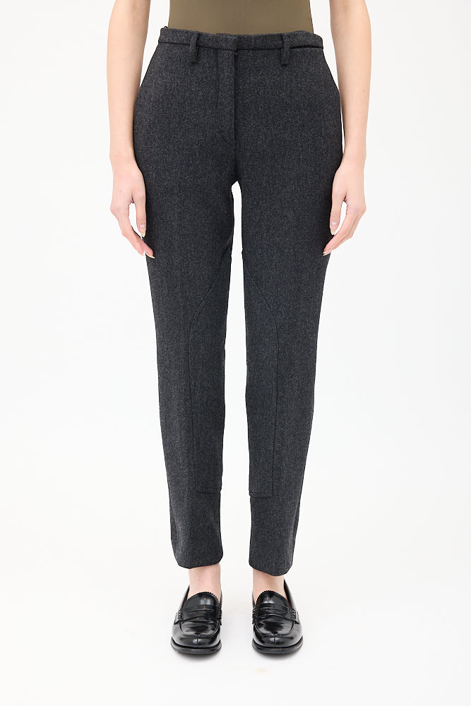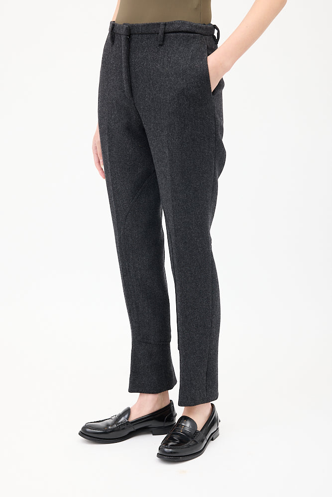 Pre-owned Prada dark grey riding trousers featuring a high waist, tapered leg with front and back creases, panelling at inseam, in seam pockets, slip pocket at front left waist, buttoned welt pocket at back right waist, and zip fly.