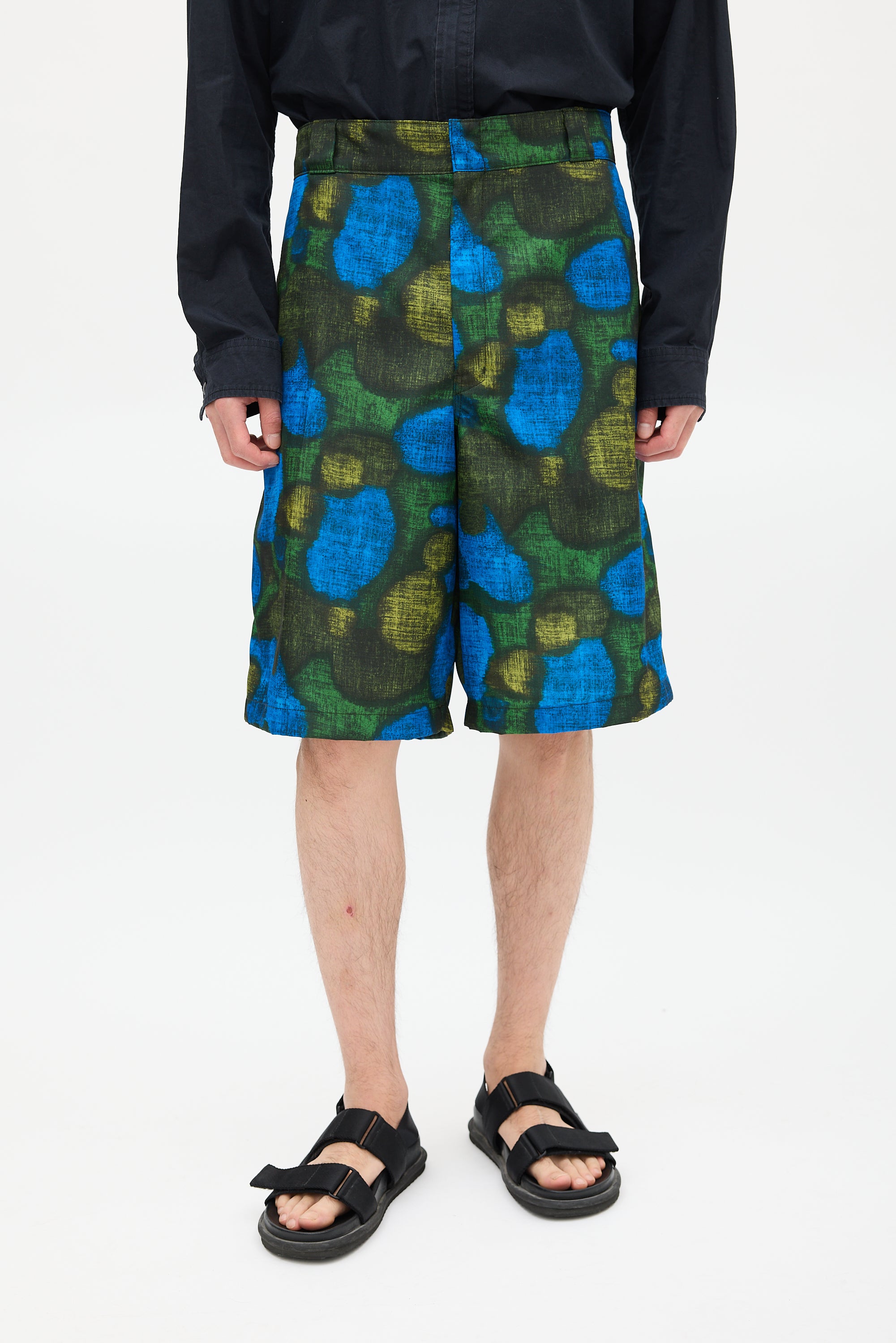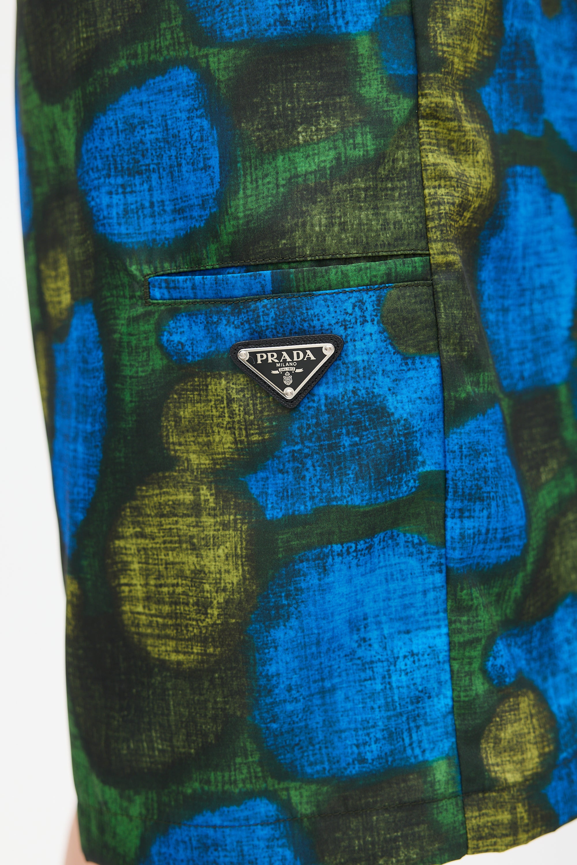 Pre-owned Prada green nylon shorts featuring a blue geometric pattern throughout, two slip pockets at hip, two welt pockets at back, one slip pocket at side with an enamelled metal triangle logo on saffiano leather, wide leg, and zip fly with hook and eye closure. Shorts were clipped to fit model.