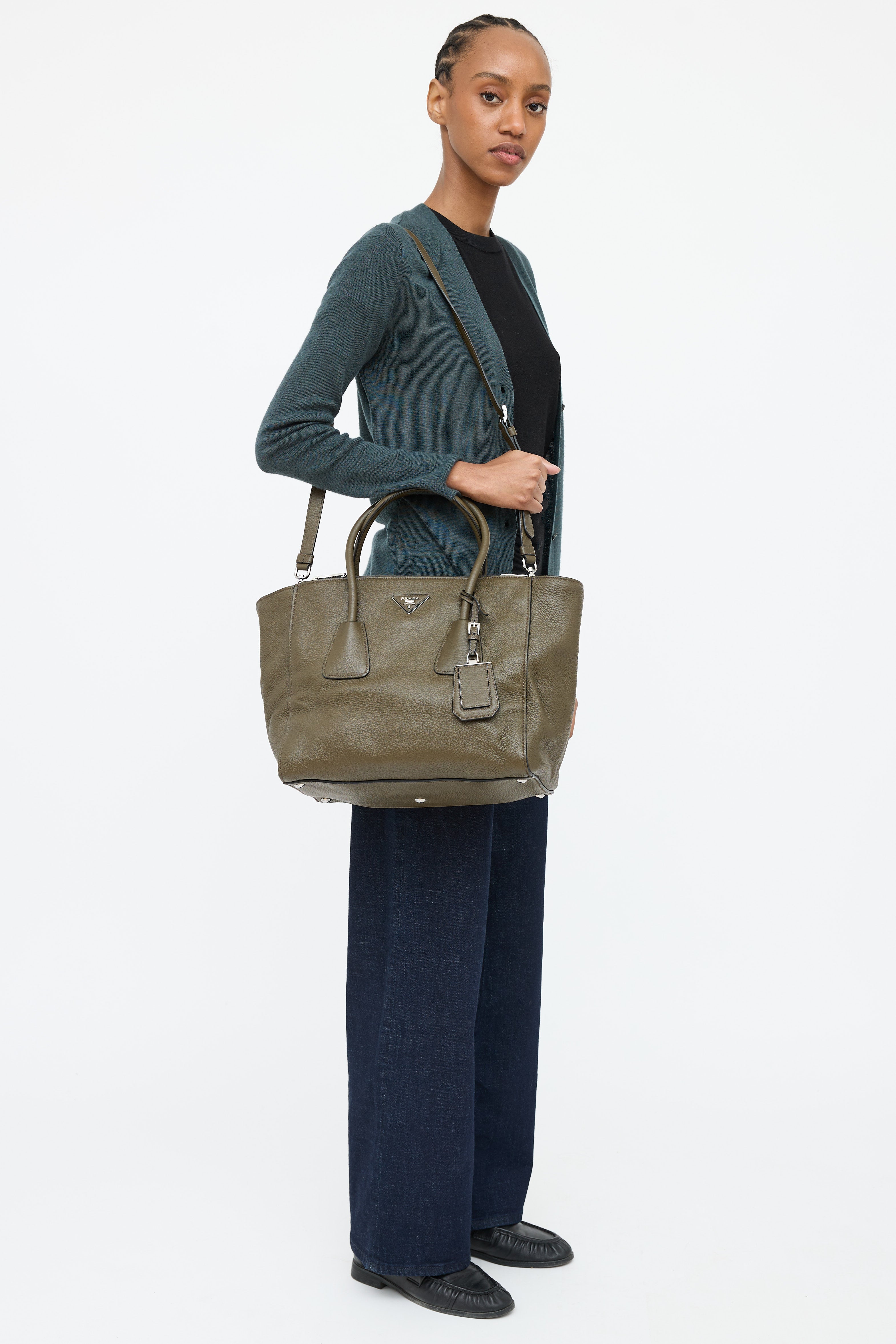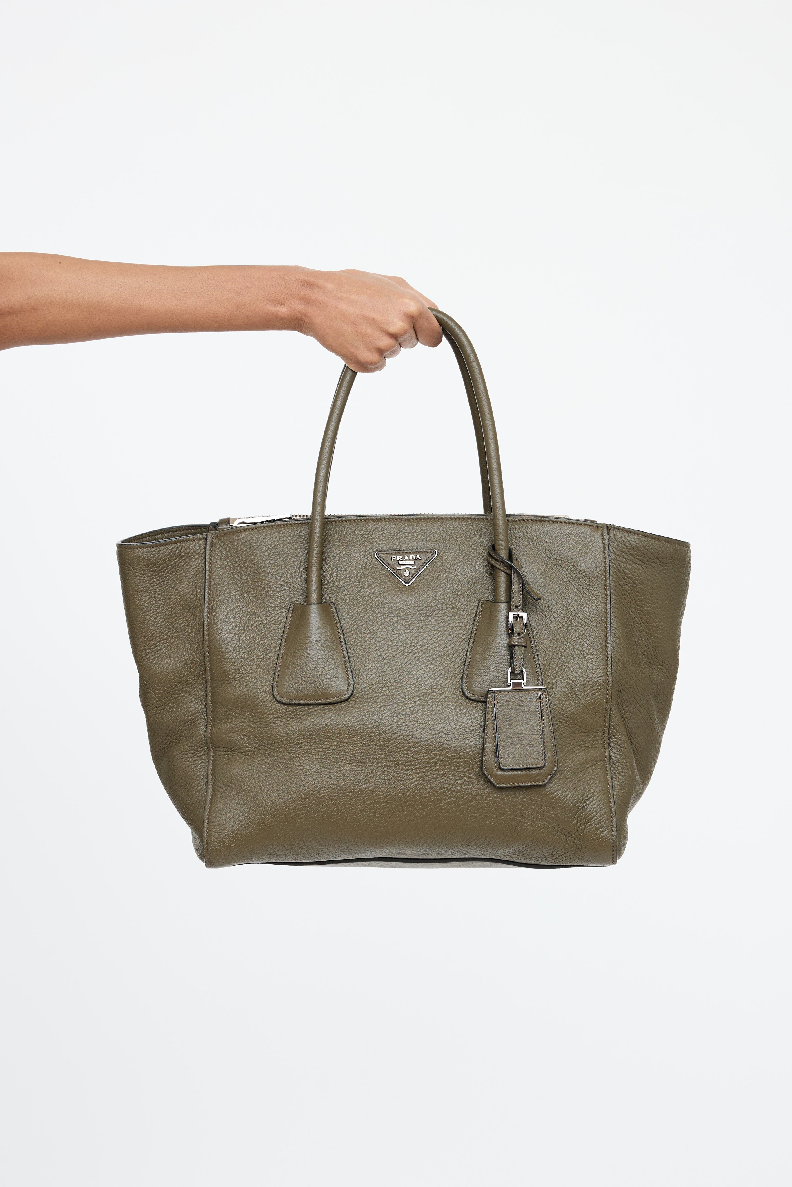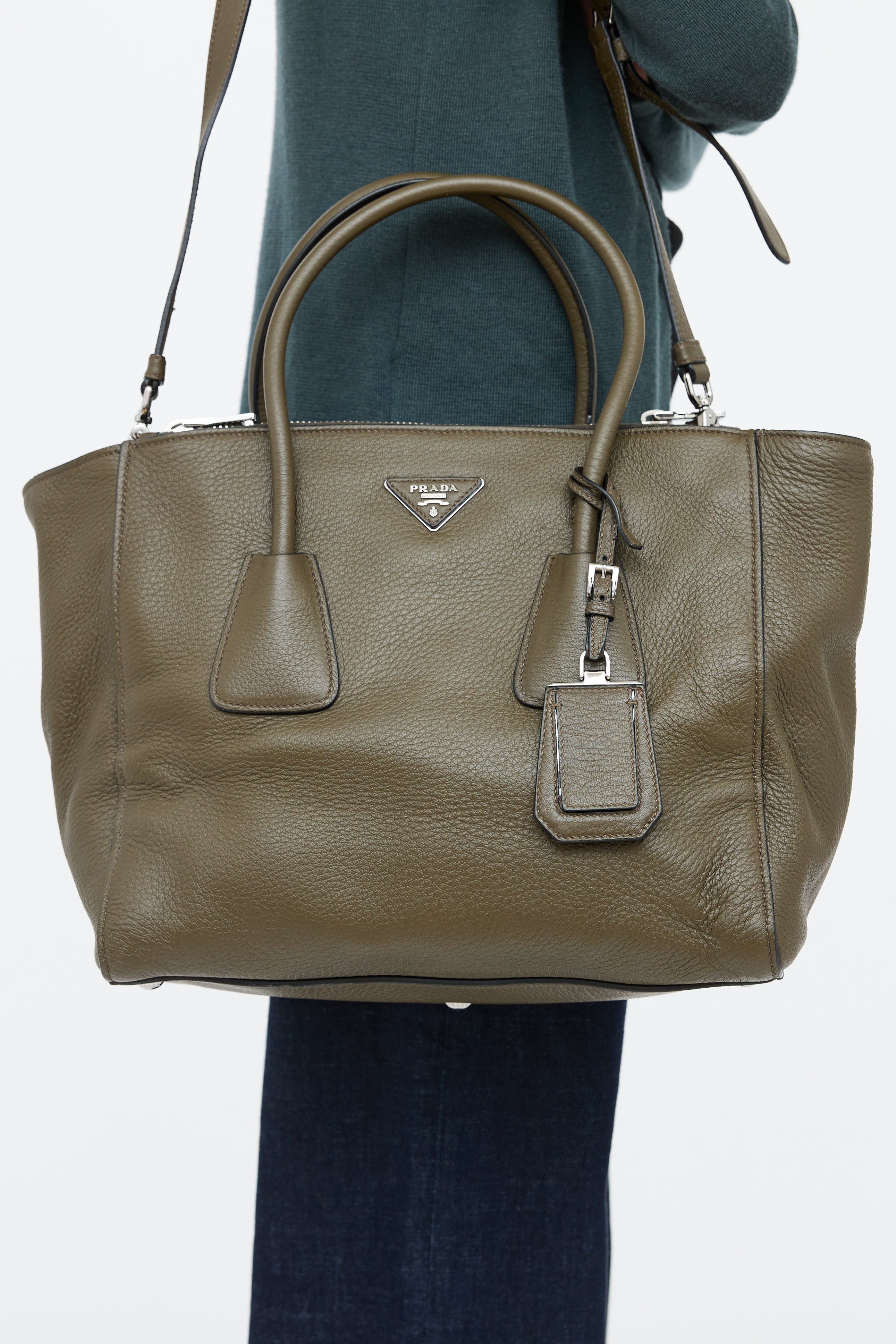 Pre-owned Prada green Cervo twin pocket bag featuring dual rolled top handles, pebbled leather, silver tone hardware, logo plaque on front, clochette, protective feet on bottom, dual zip pockets and snap button closure. One main compartment, single zip pocket and single slip pocket.