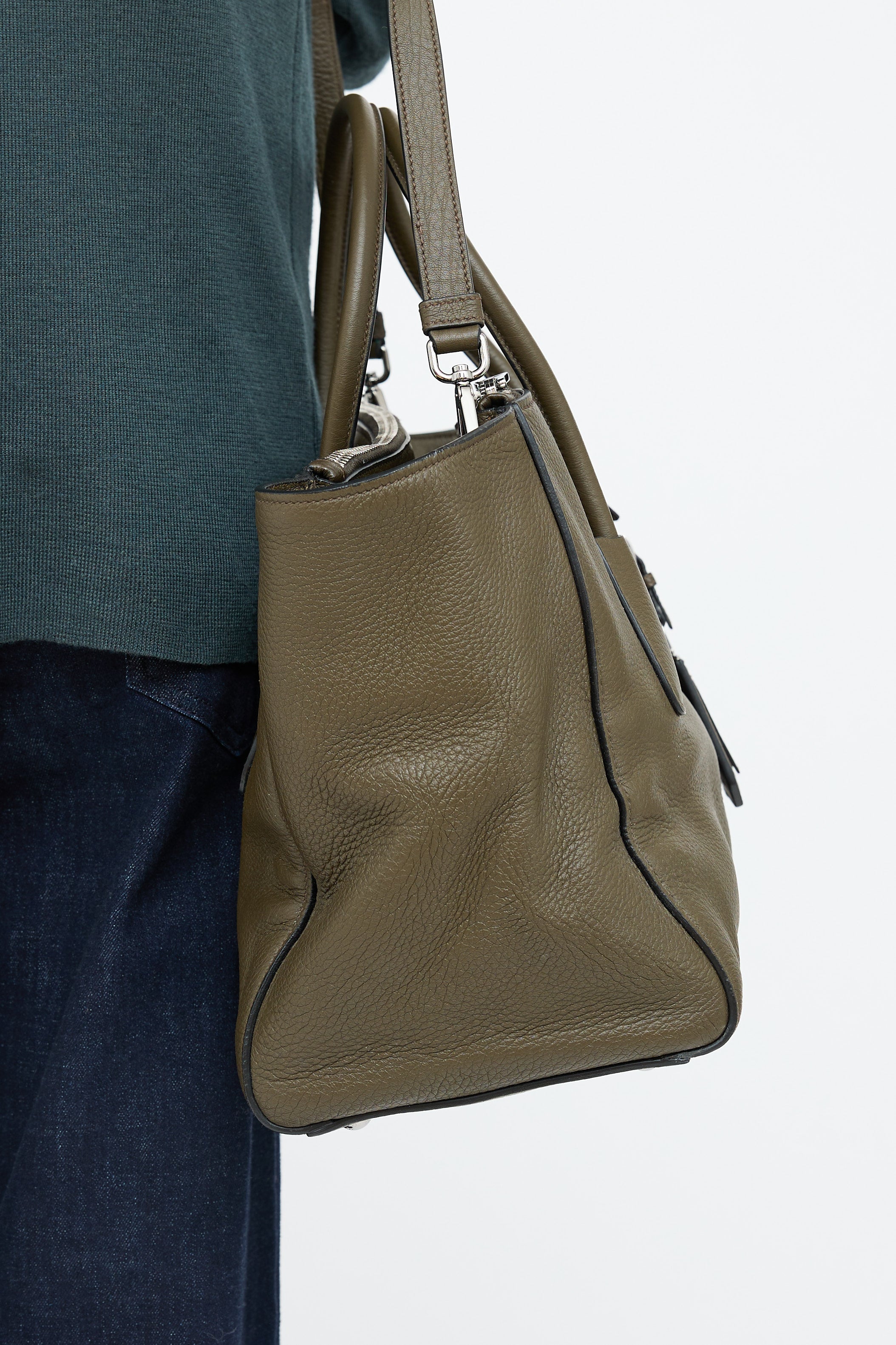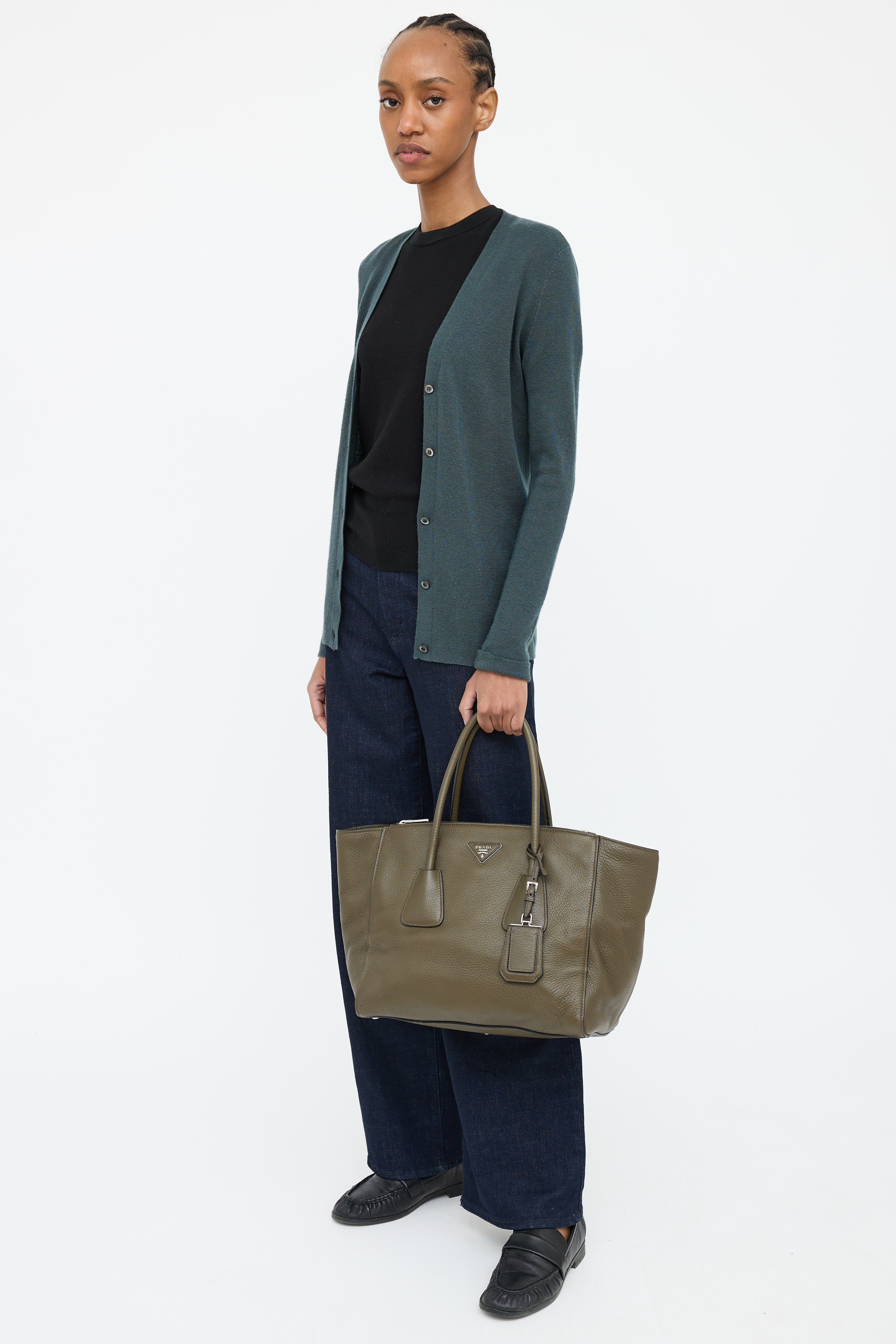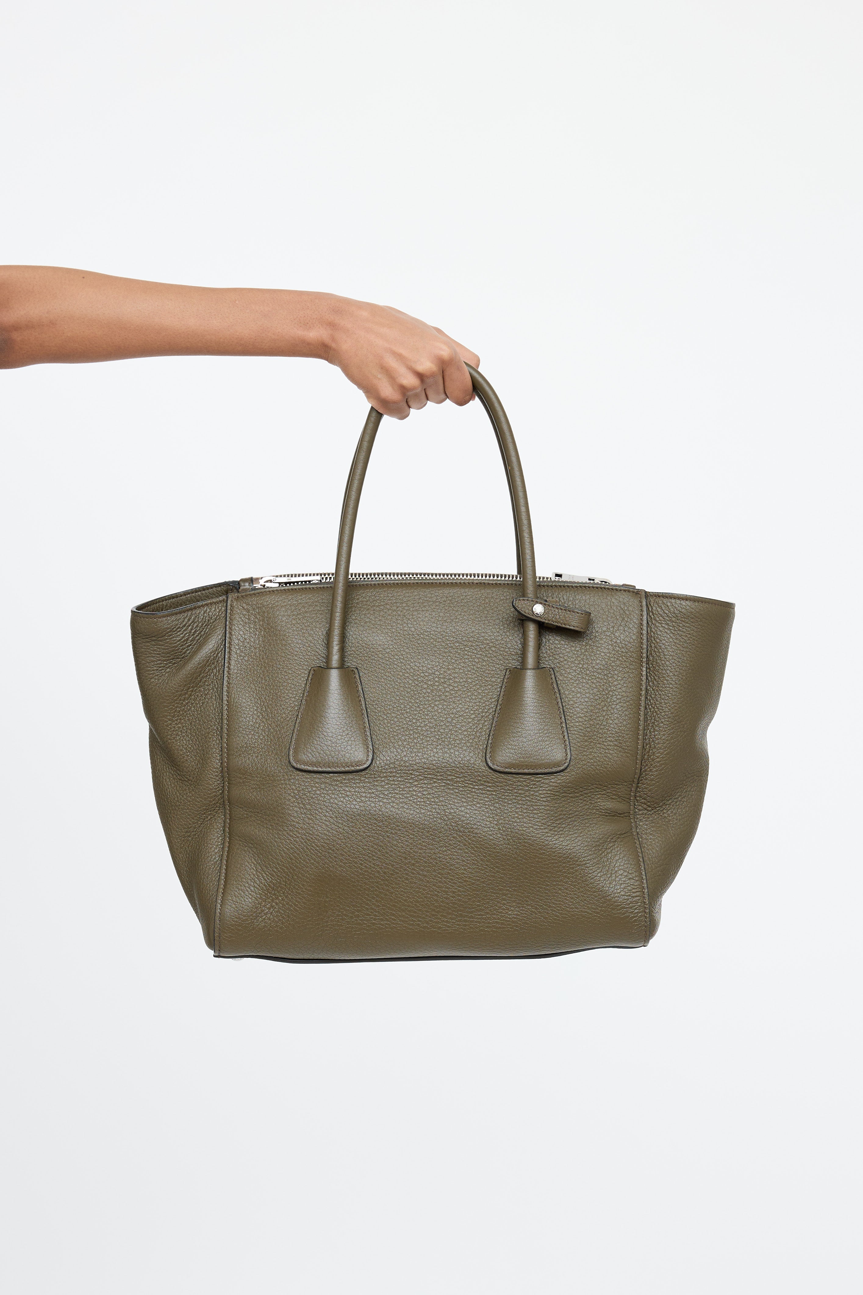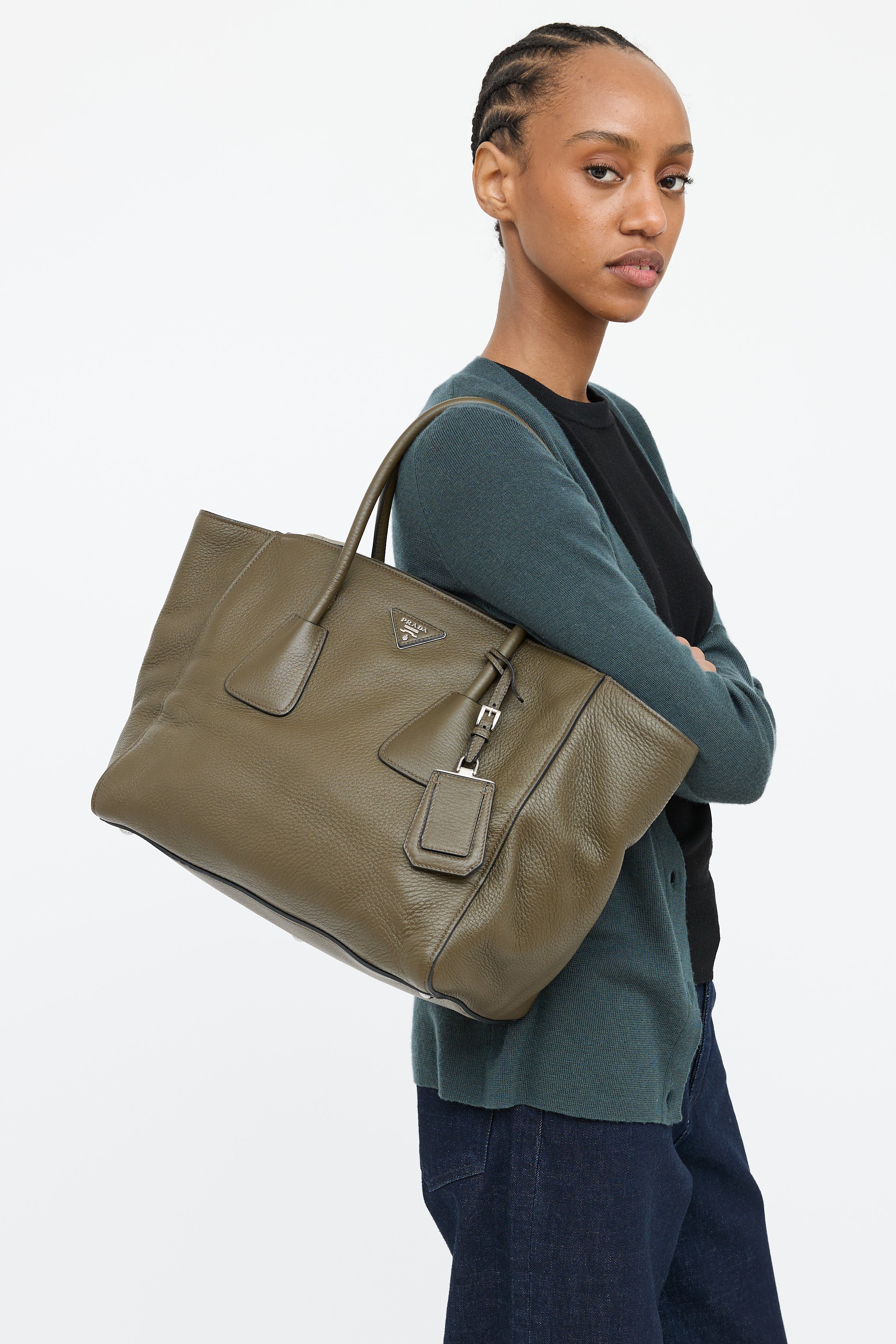 Pre-owned Prada green Cervo twin pocket bag featuring dual rolled top handles, pebbled leather, silver tone hardware, logo plaque on front, clochette, protective feet on bottom, dual zip pockets and snap button closure. One main compartment, single zip pocket and single slip pocket.