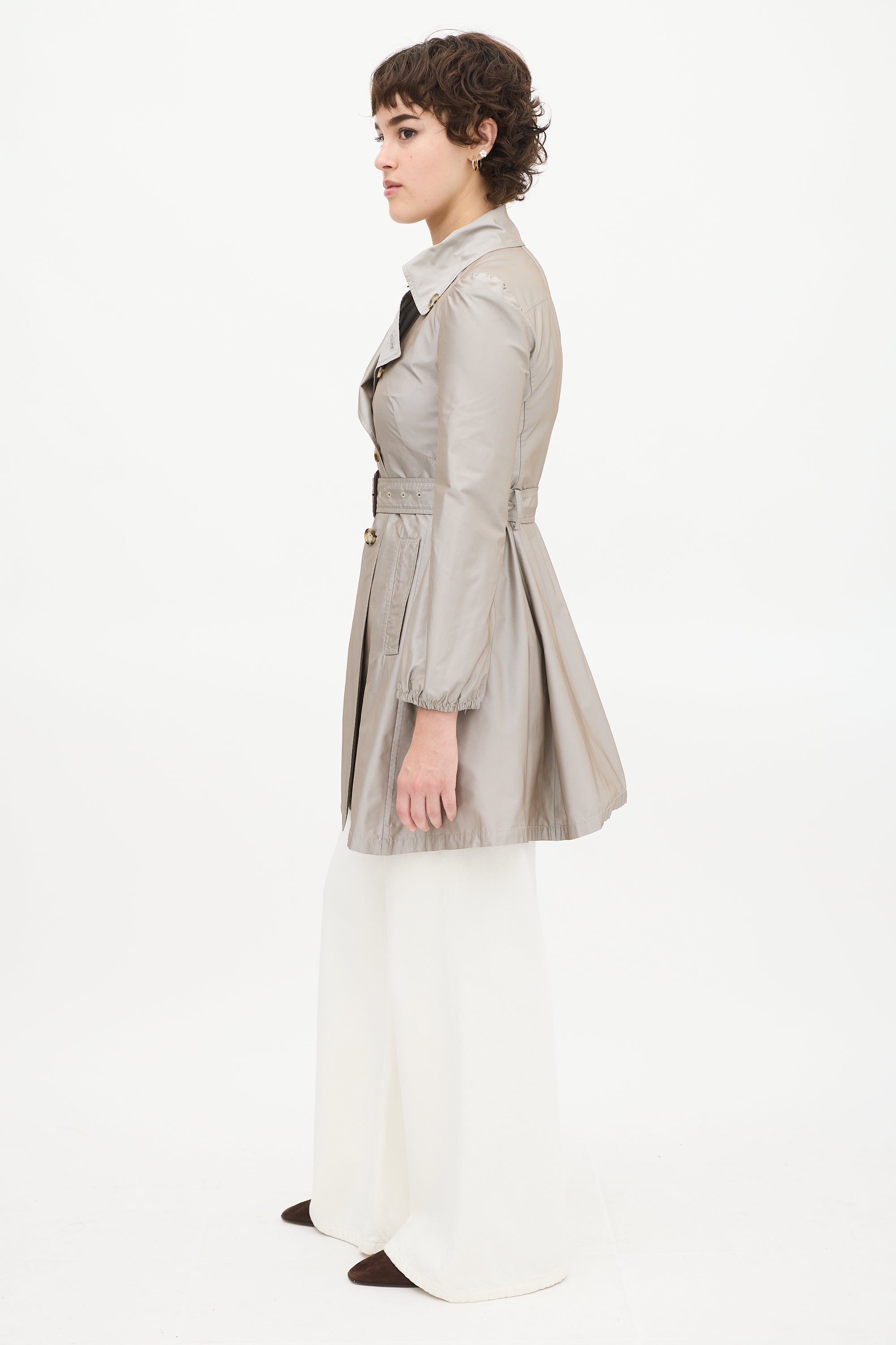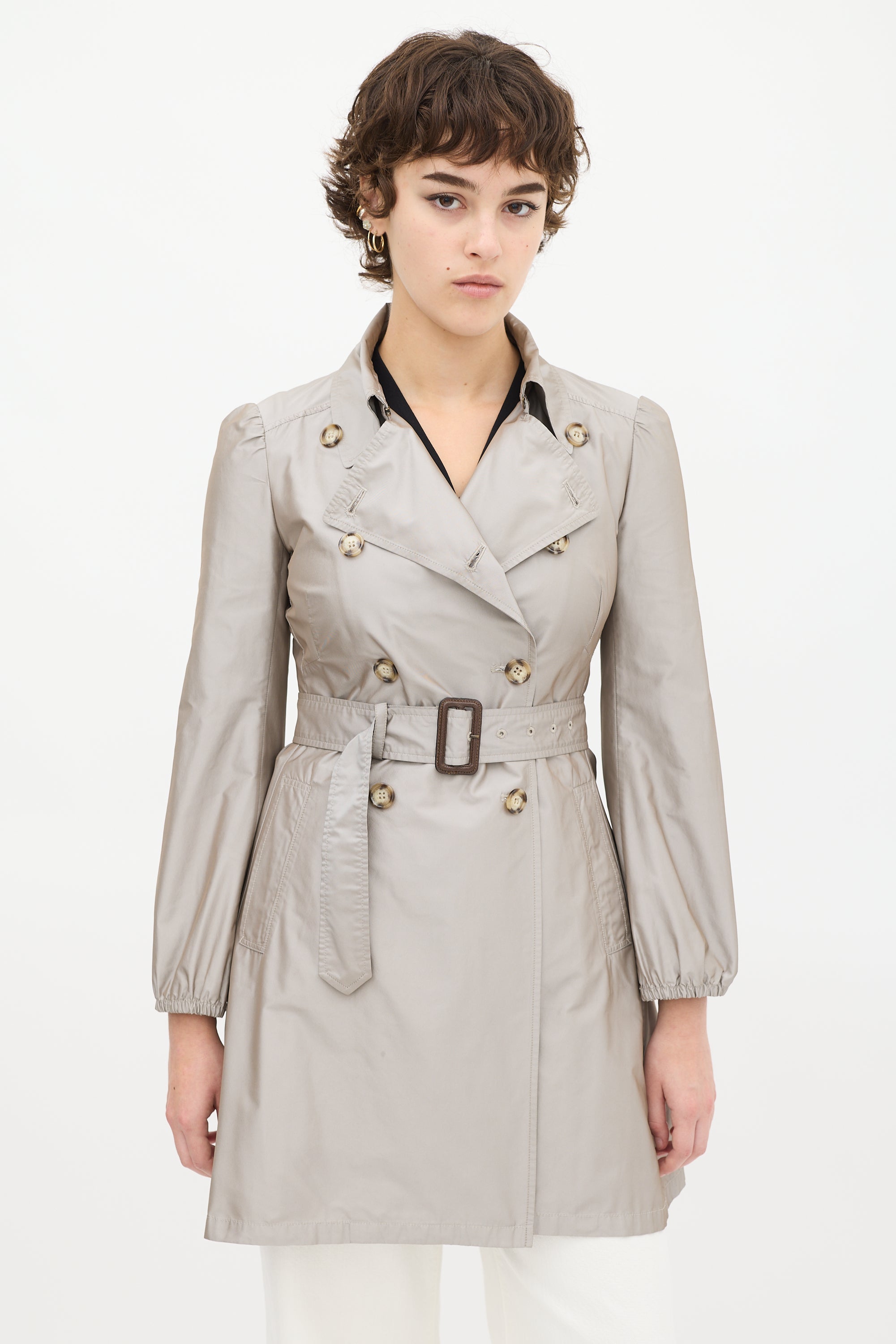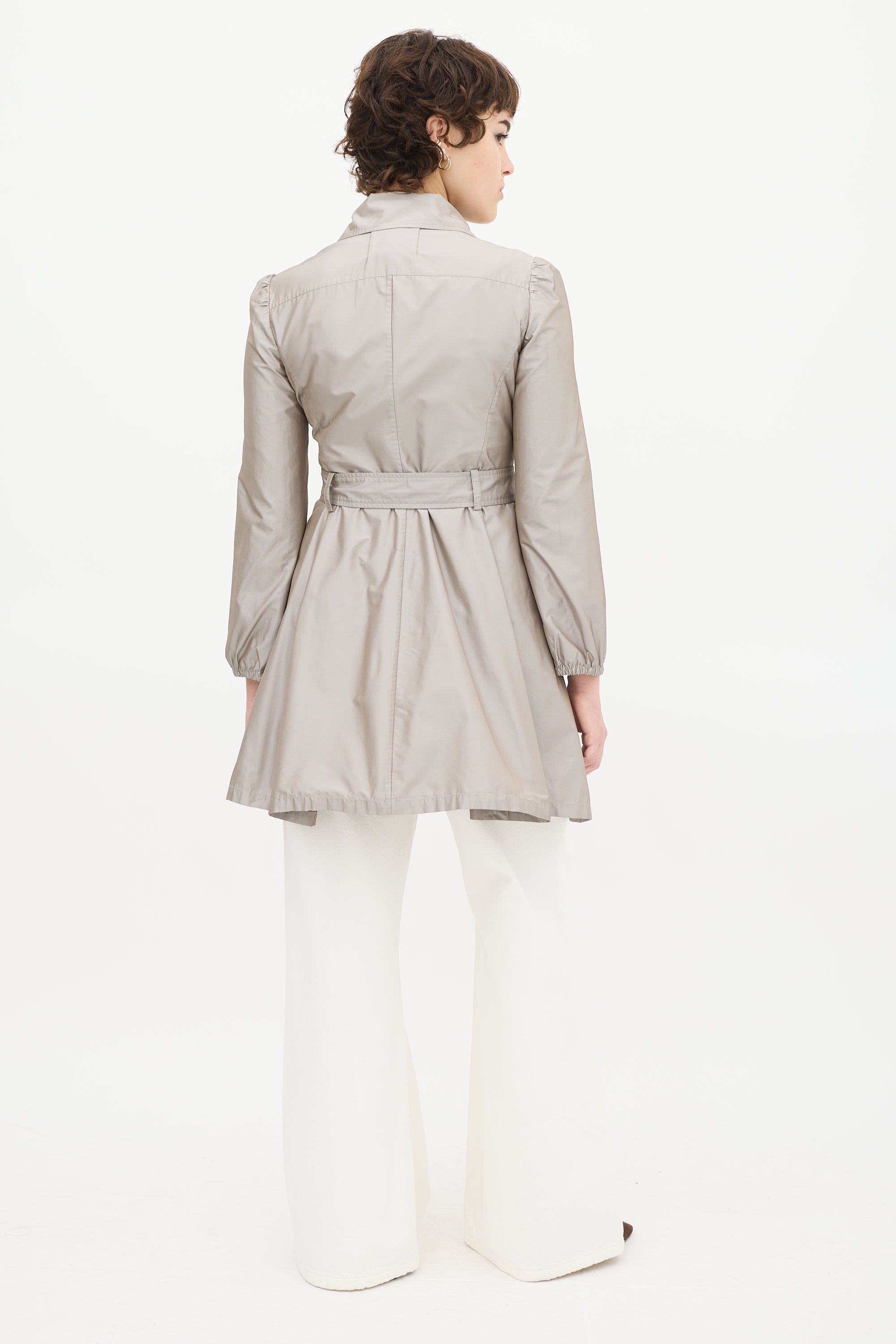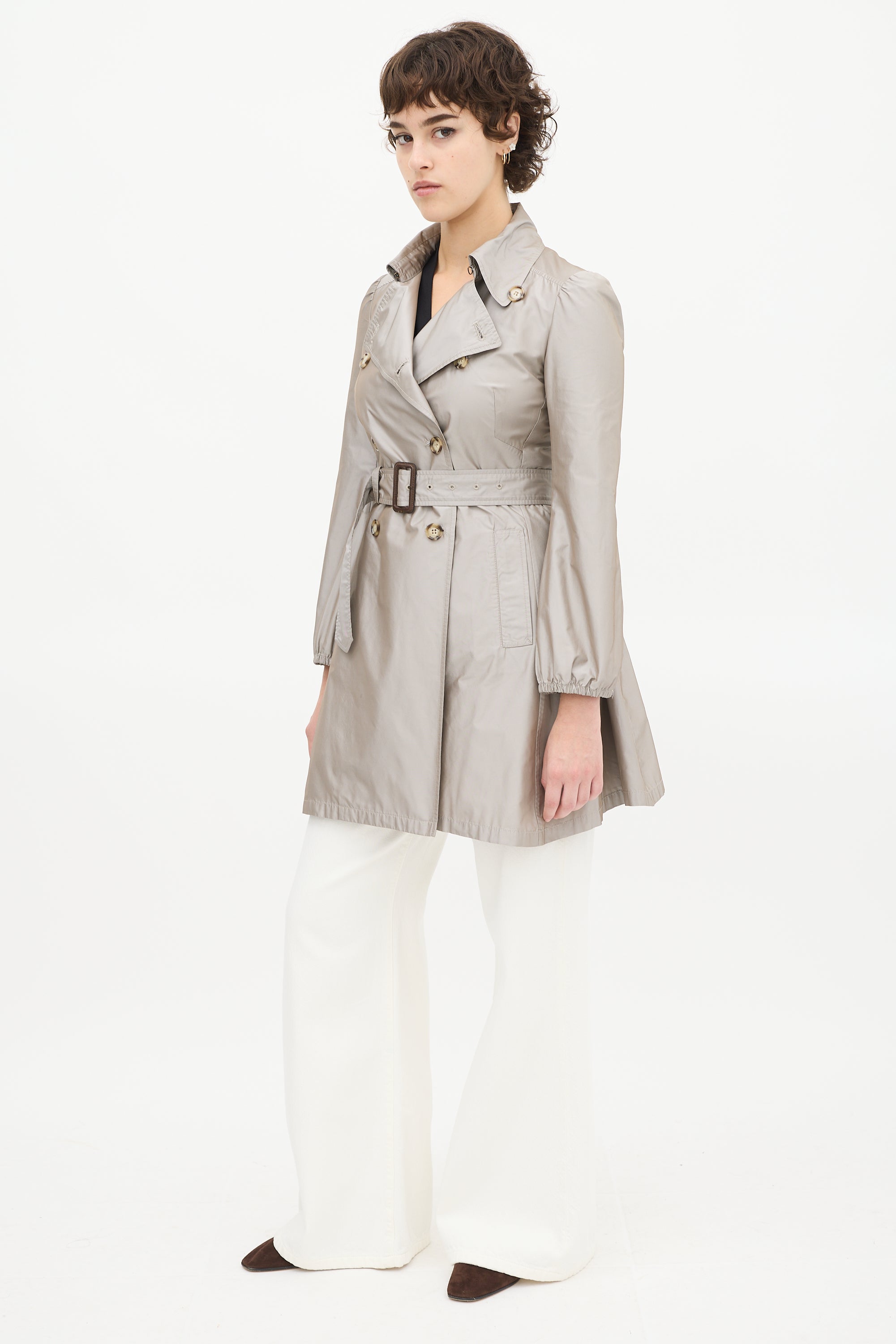 Pre-owned Prada grey satin mid length trench coat featuring a spread collar, A-line cut, belted waist, double breasted button up front, two front slip pockets, and long sleeves with gathered shoulders and elasticized cuffs.