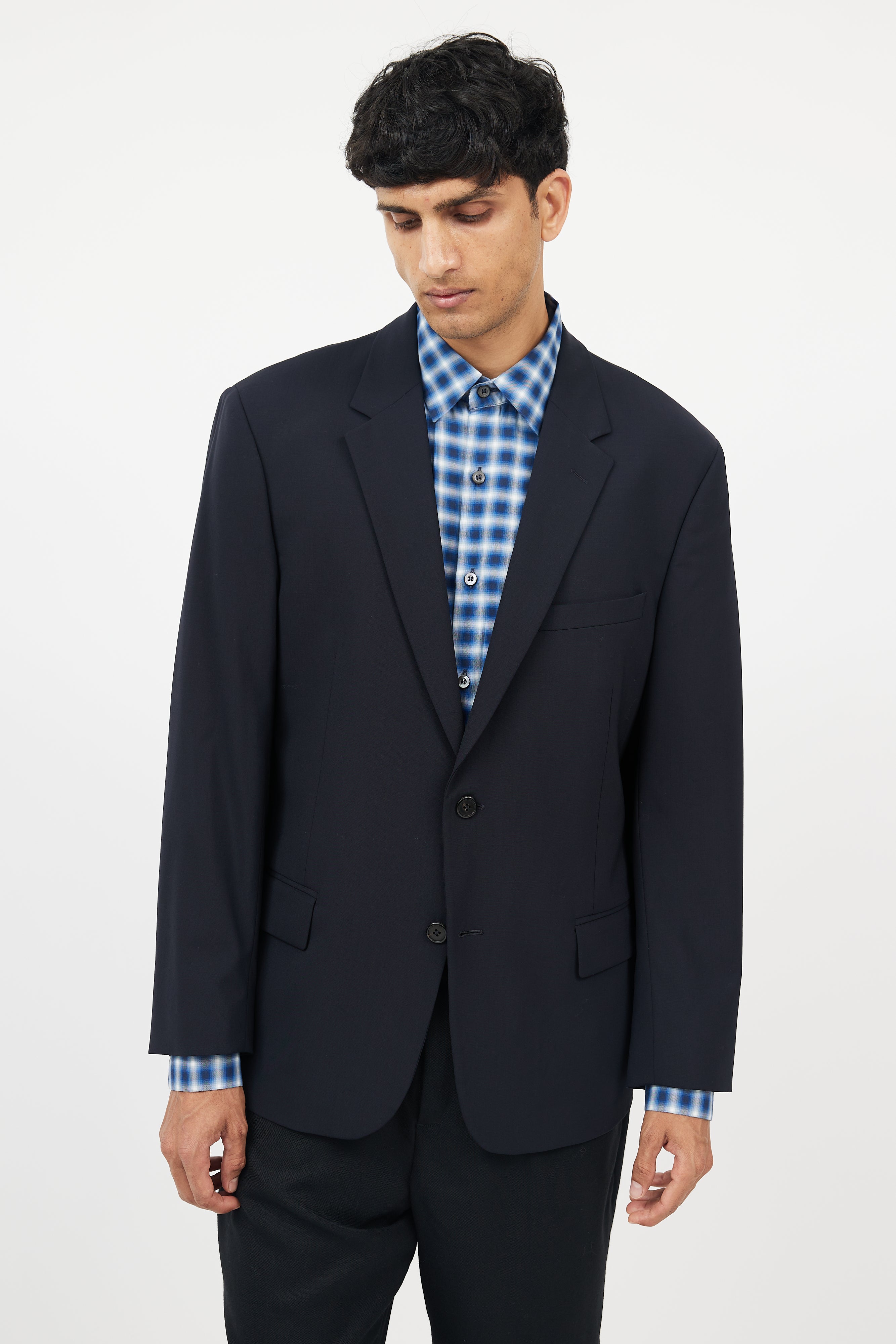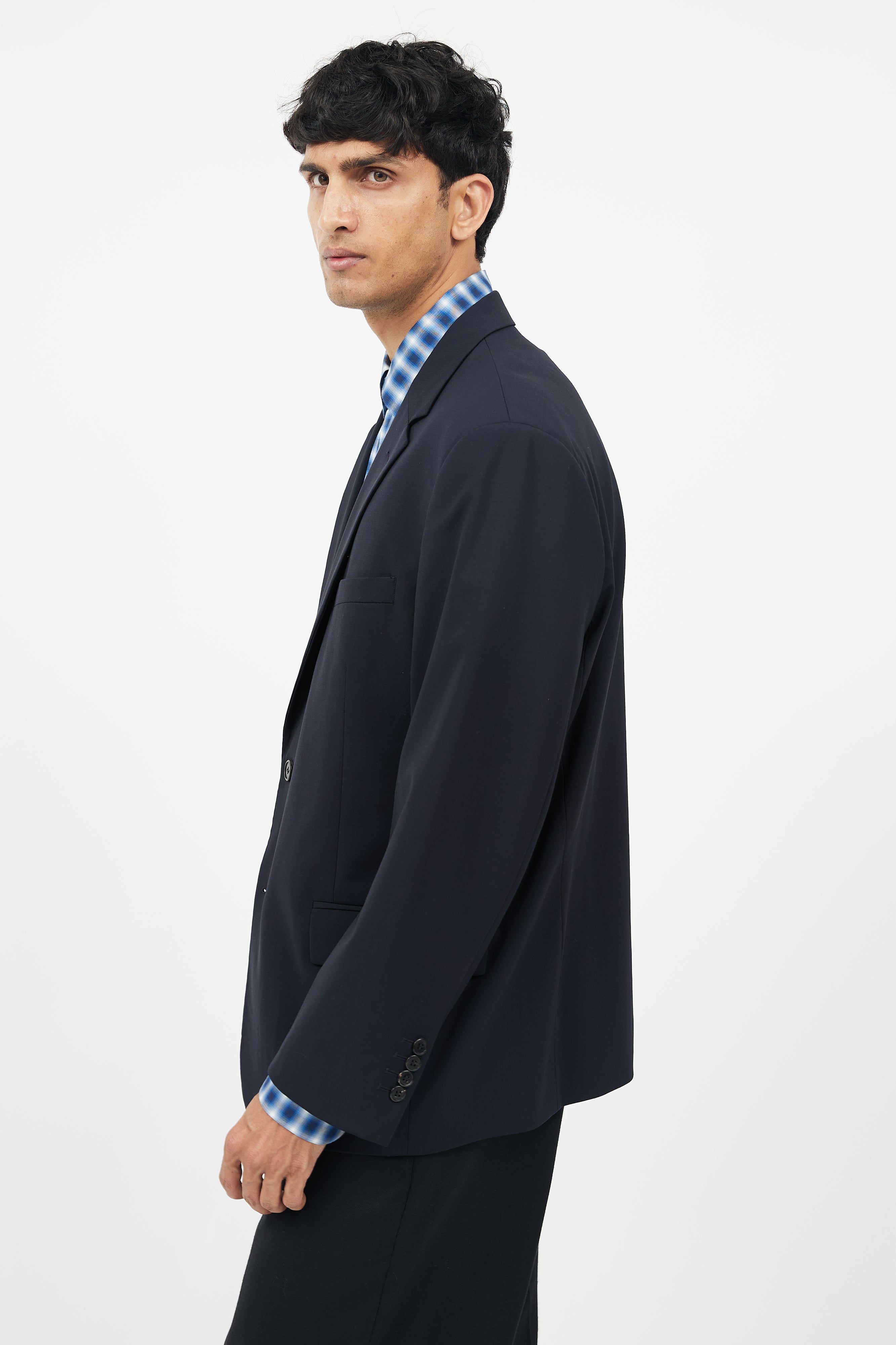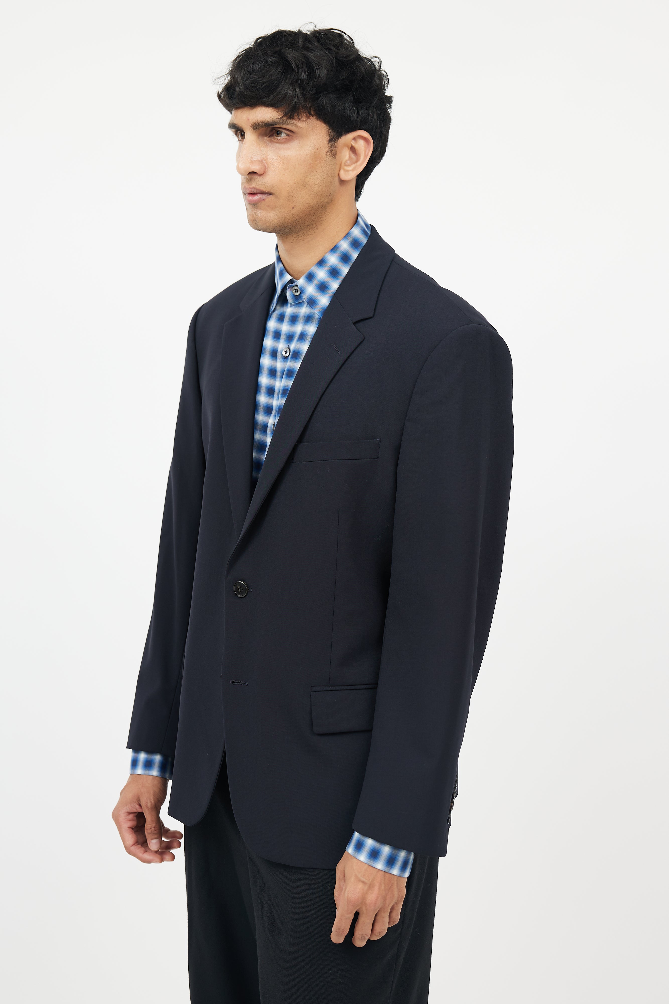 Pre-owned Prada blue blazer featuring three pockets at front, notched lapel, buttoned cuffs, and single vent at back. Lined.