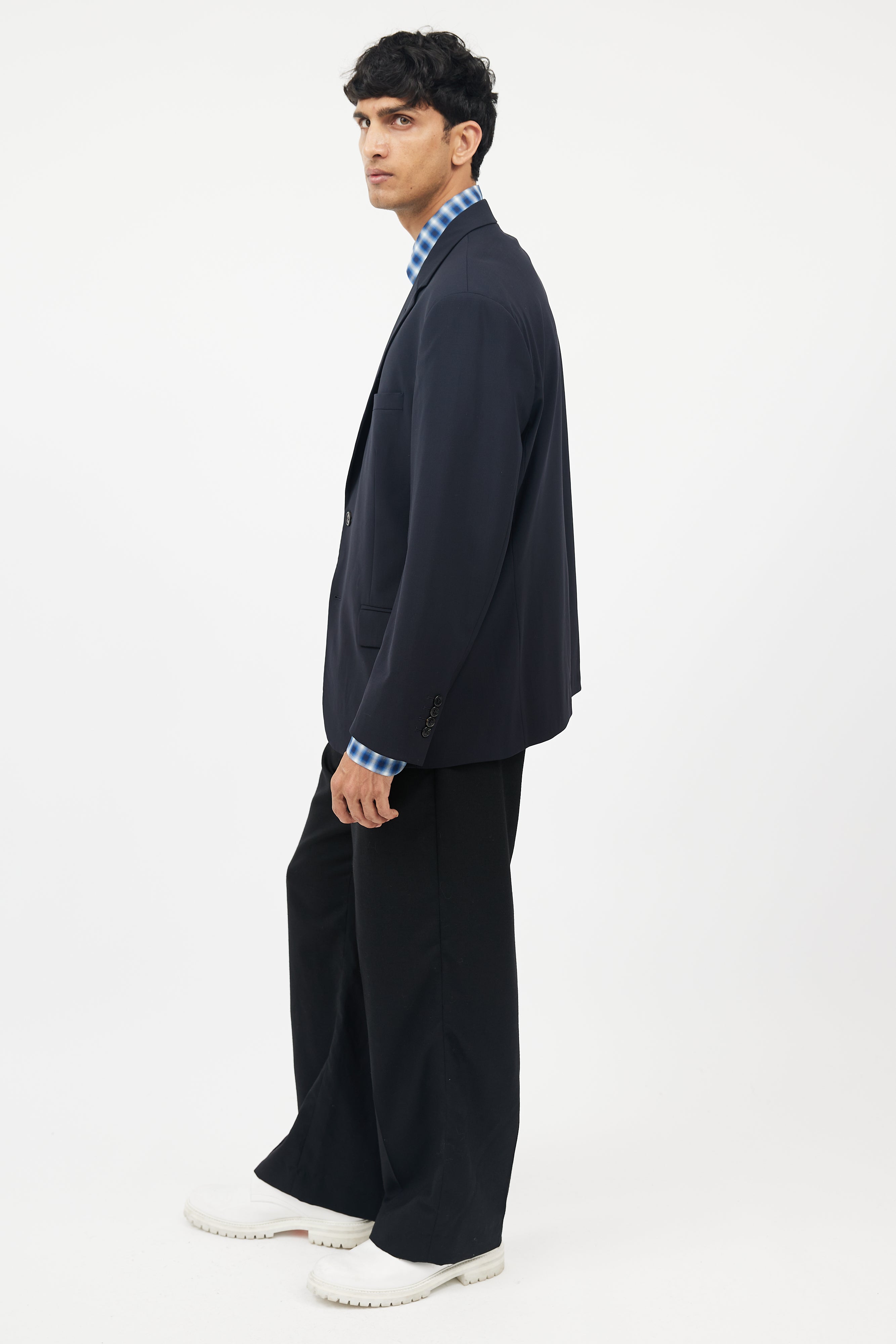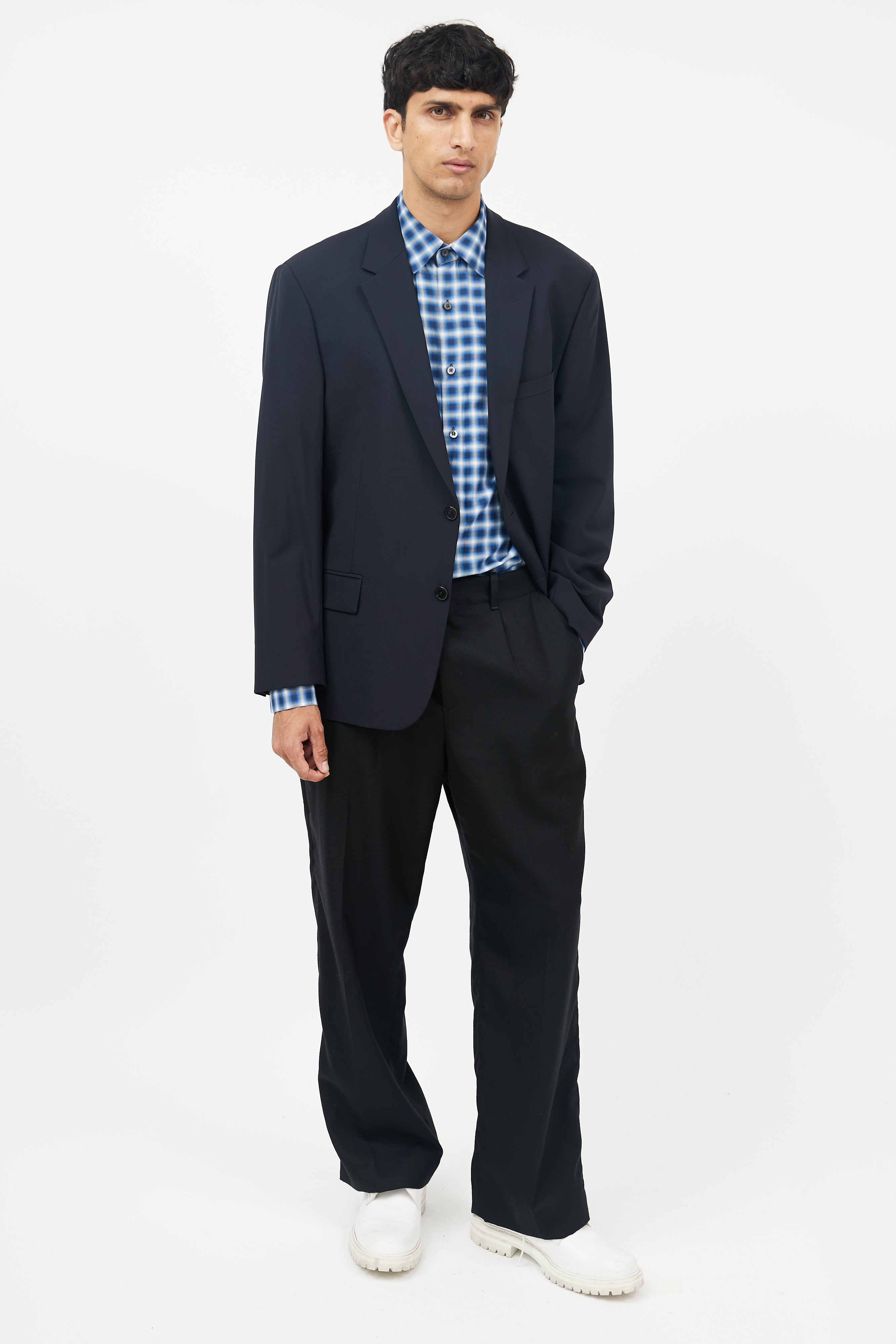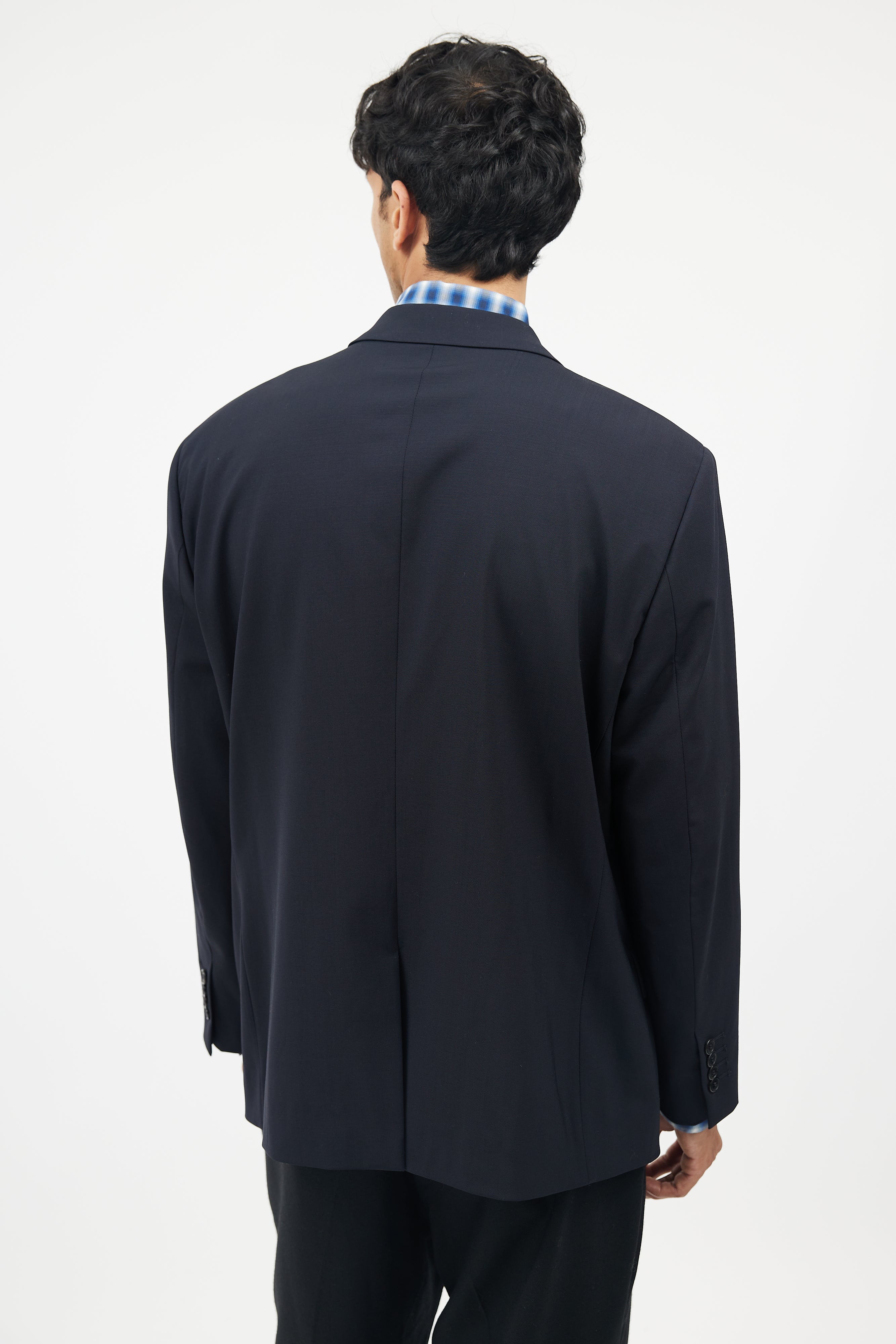 Pre-owned Prada blue blazer featuring three pockets at front, notched lapel, buttoned cuffs, and single vent at back. Lined.