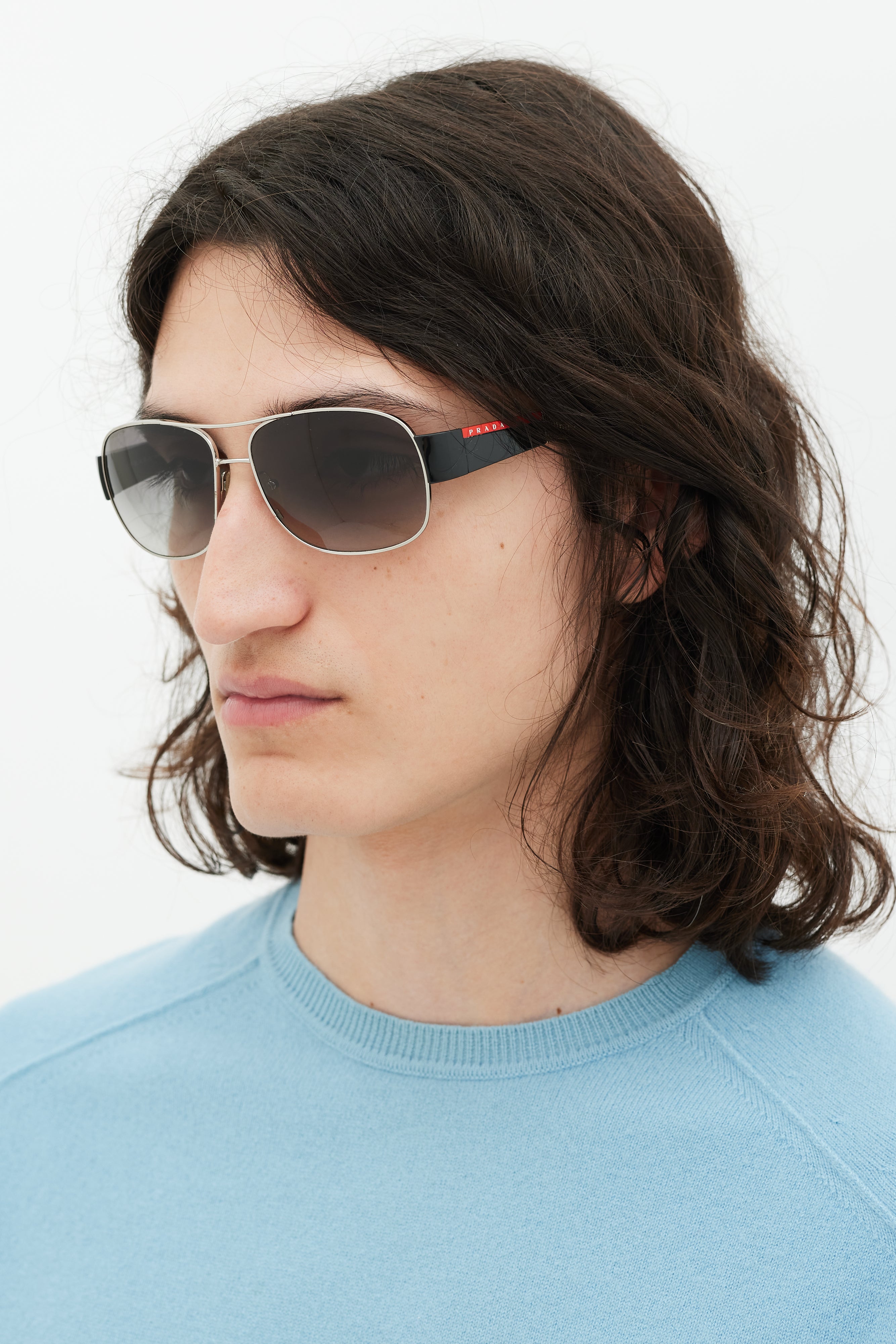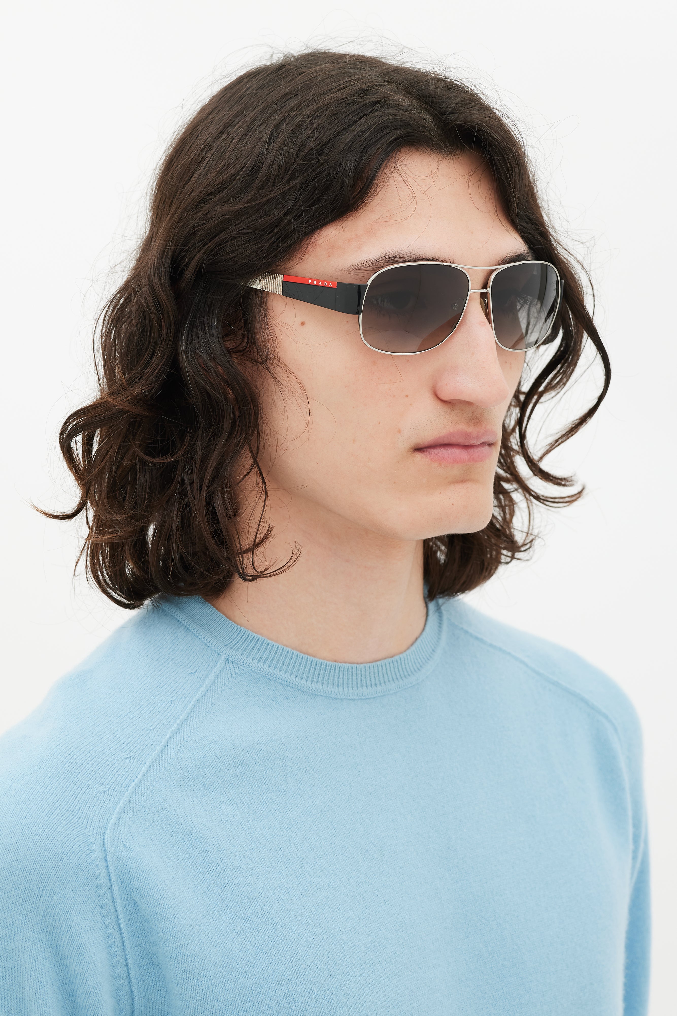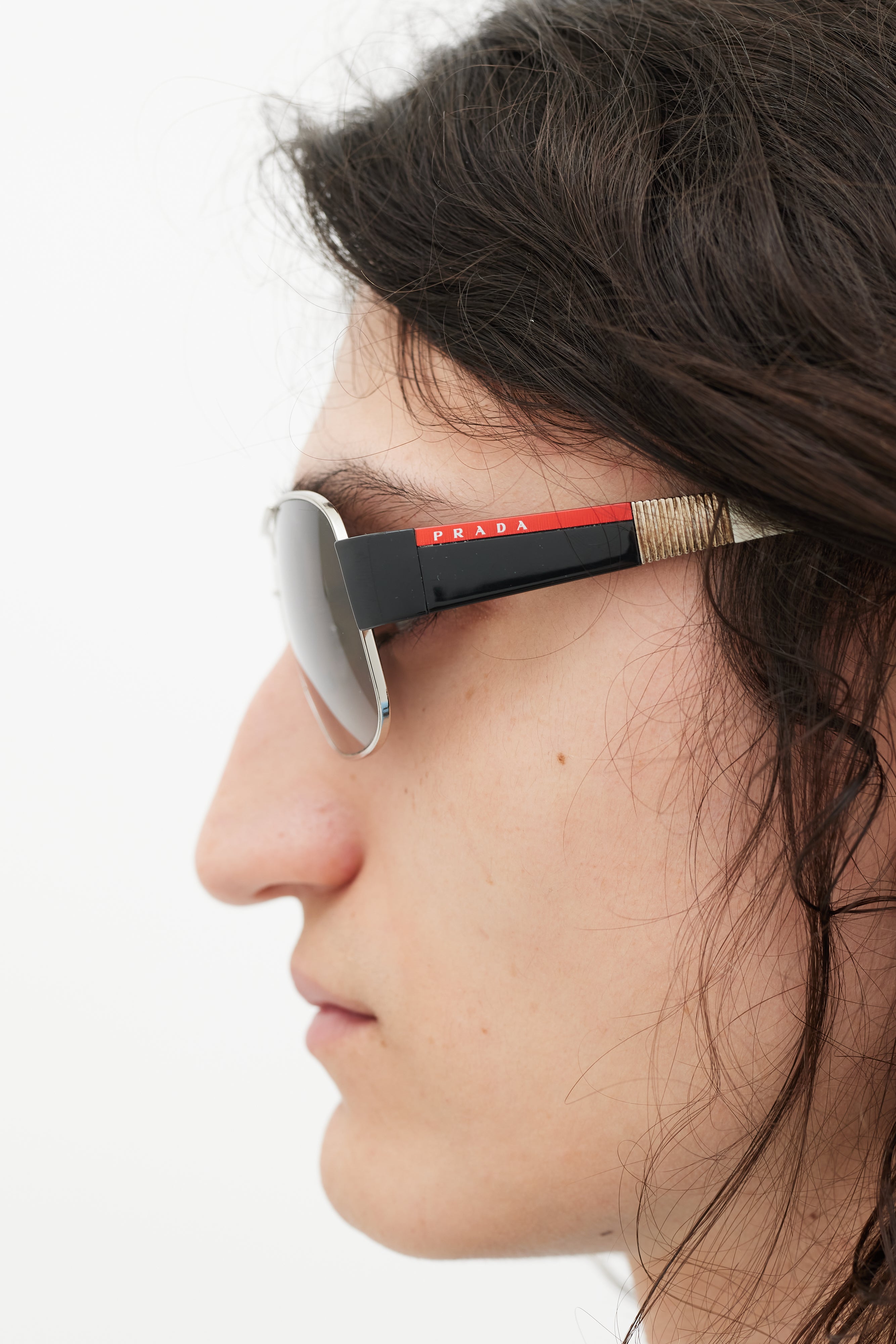 Pre-owned Prada Sport silver SPS56H aviator sunglasses featuring a wire frame, tinted lenses, nose pads, double brow bar, multicolour arms, and embossed logo at temple. Comes with original case.