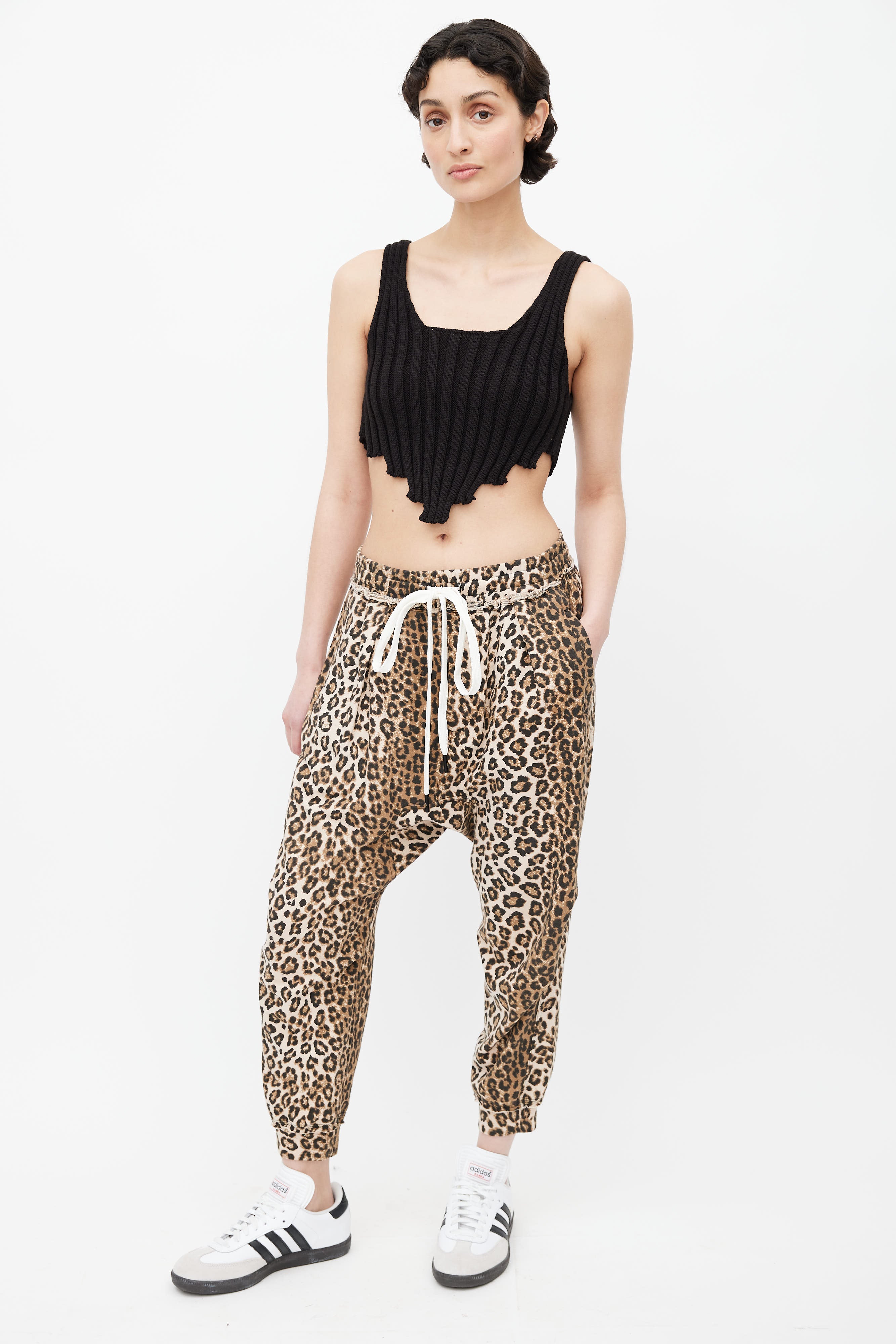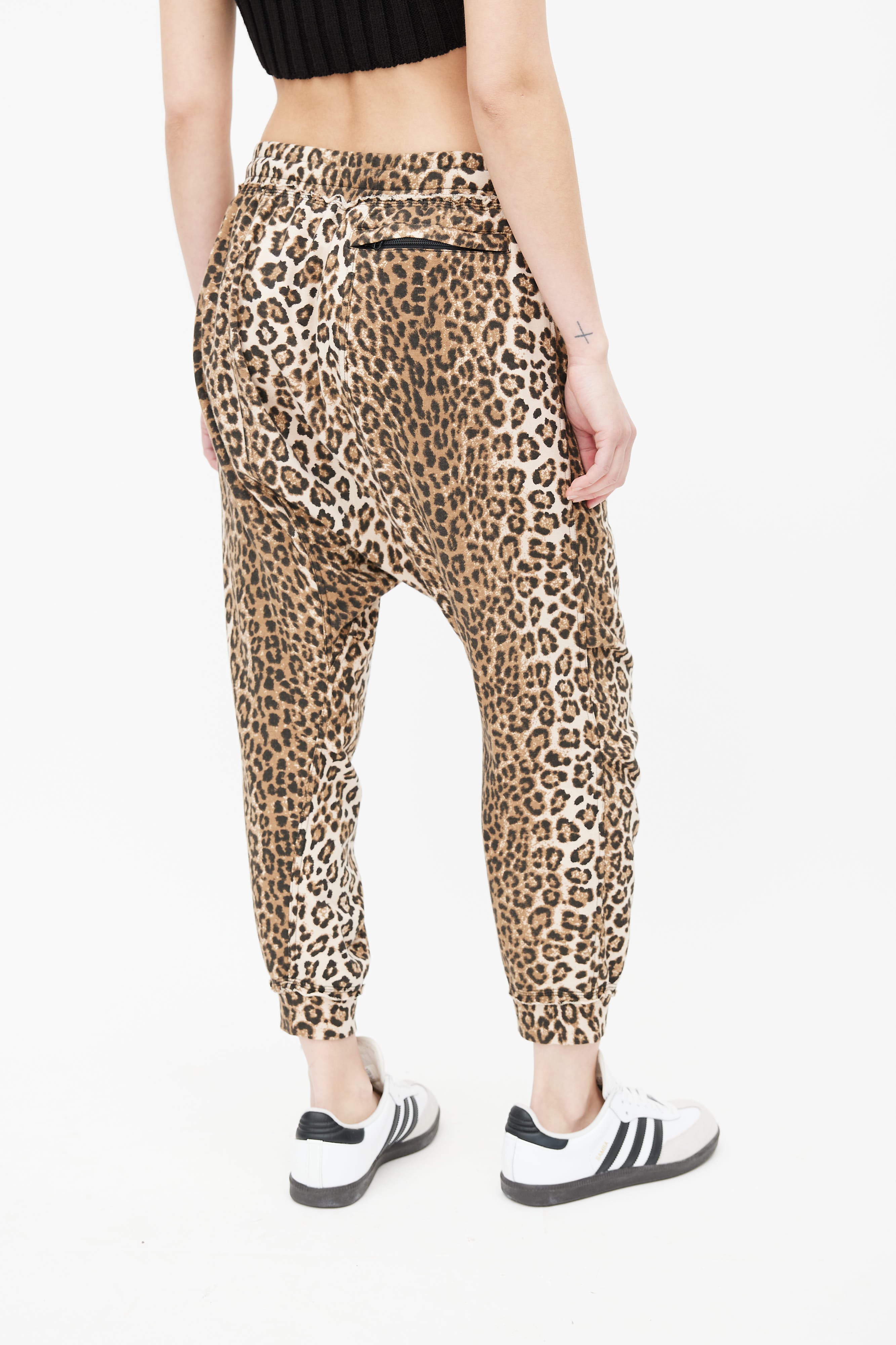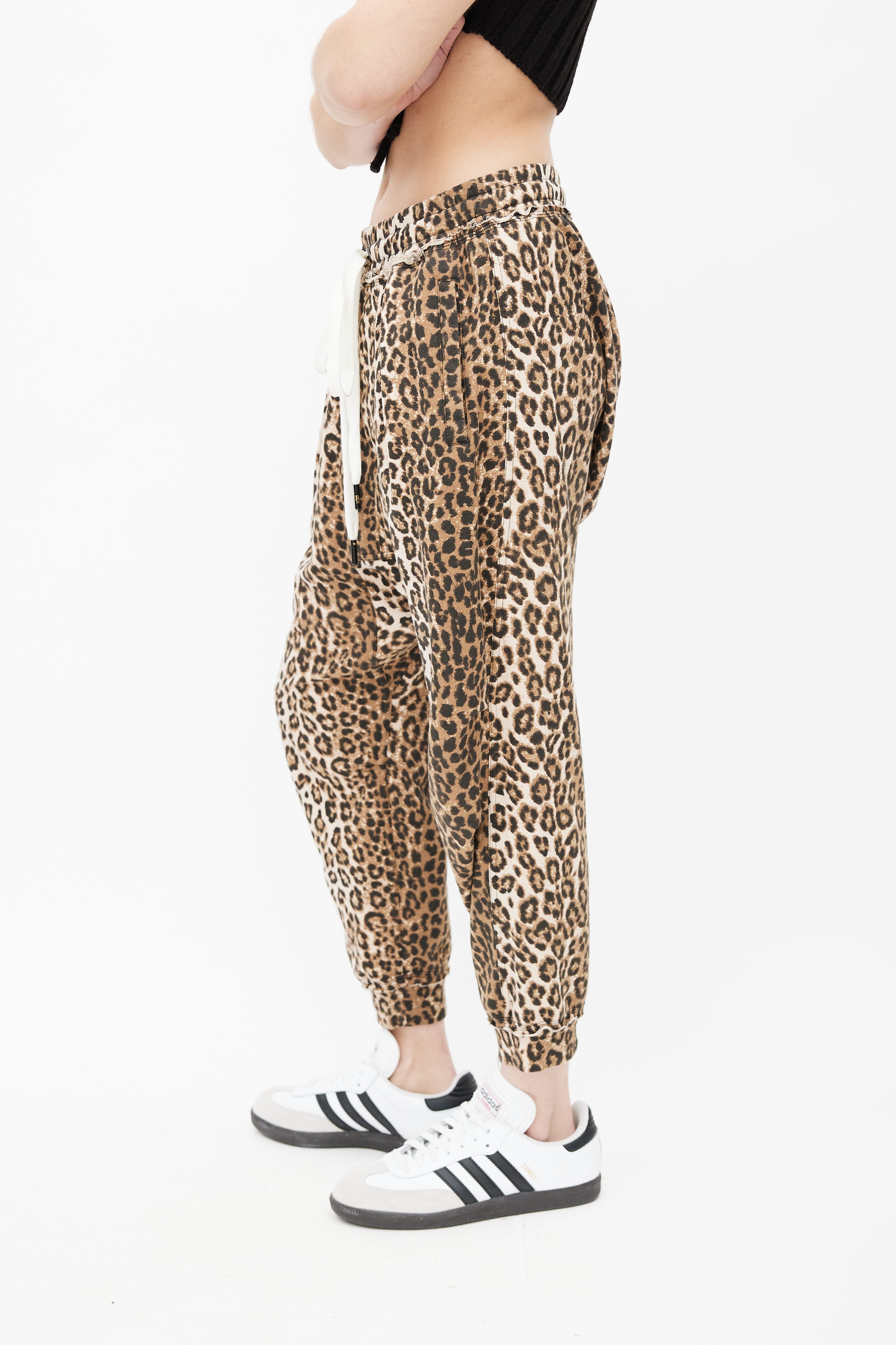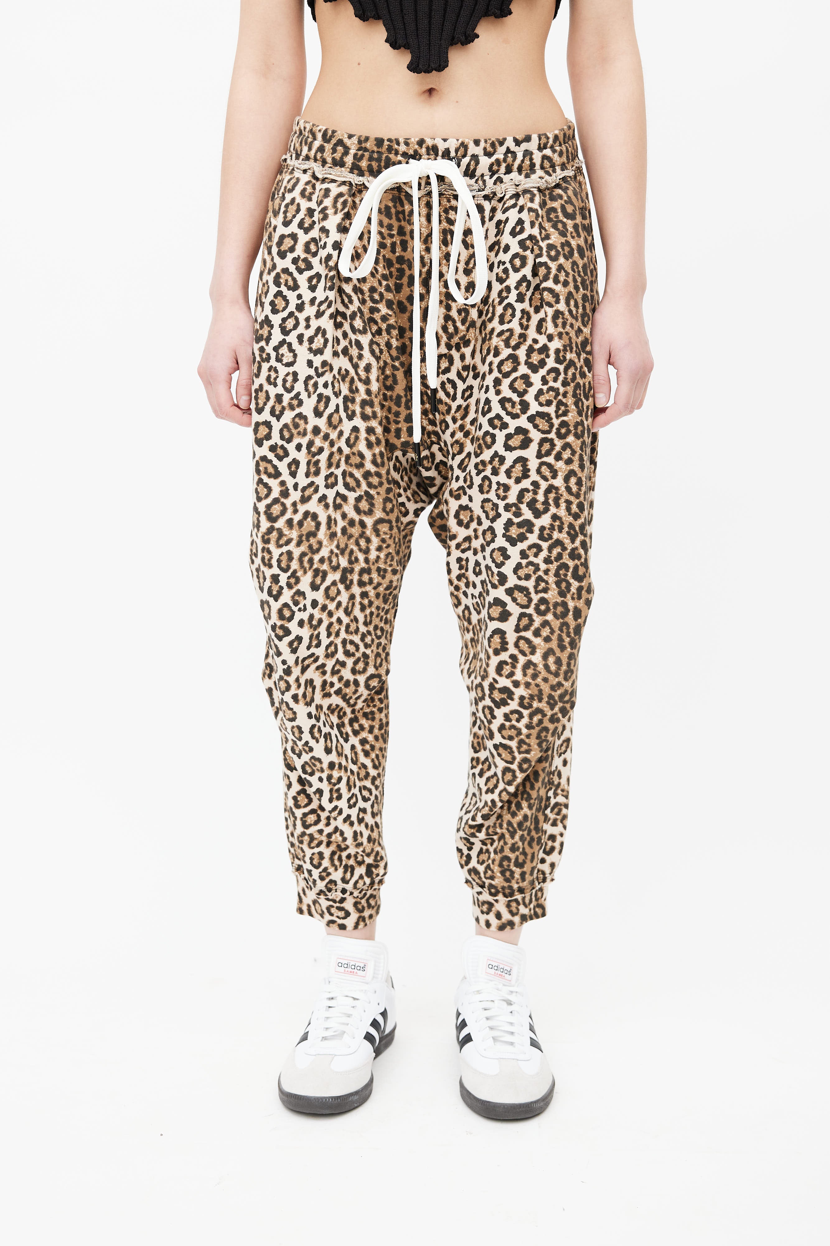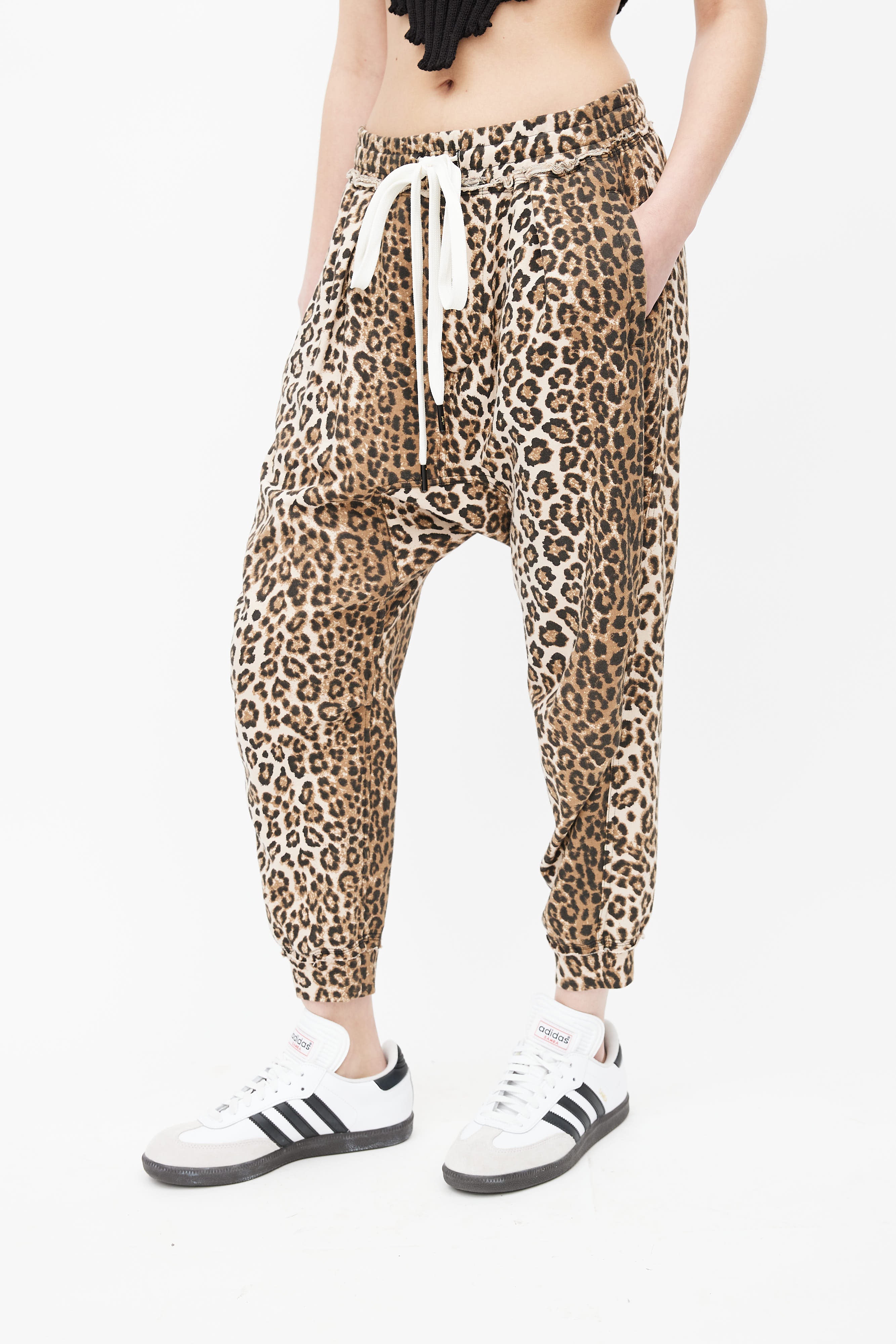Pre-owned R13 brown drop seat sweatpants featuring leopard print, elasticized waistband with drawstring fastening, raw waist hem, two slash pockets at front, and one zip pocket at back.