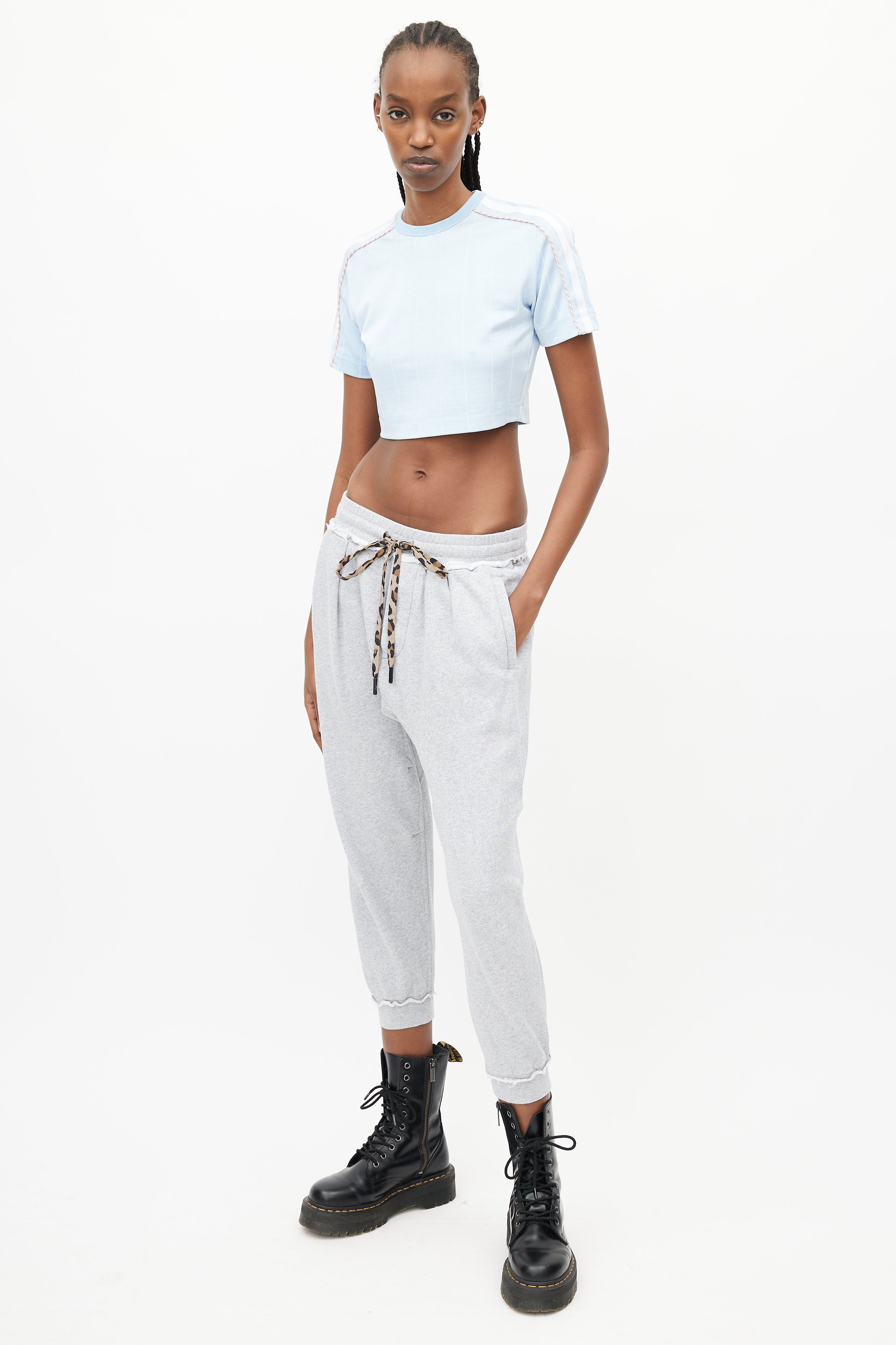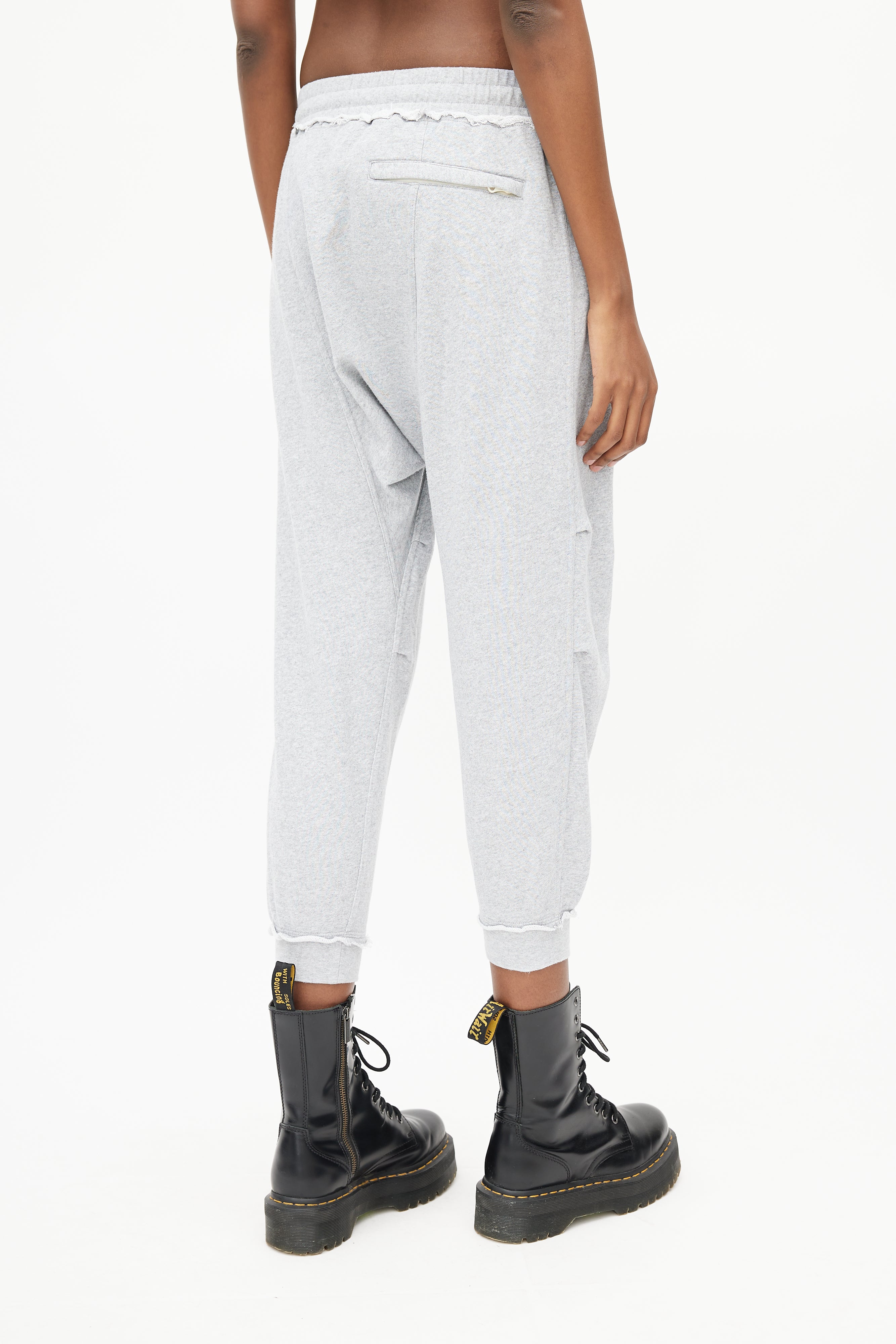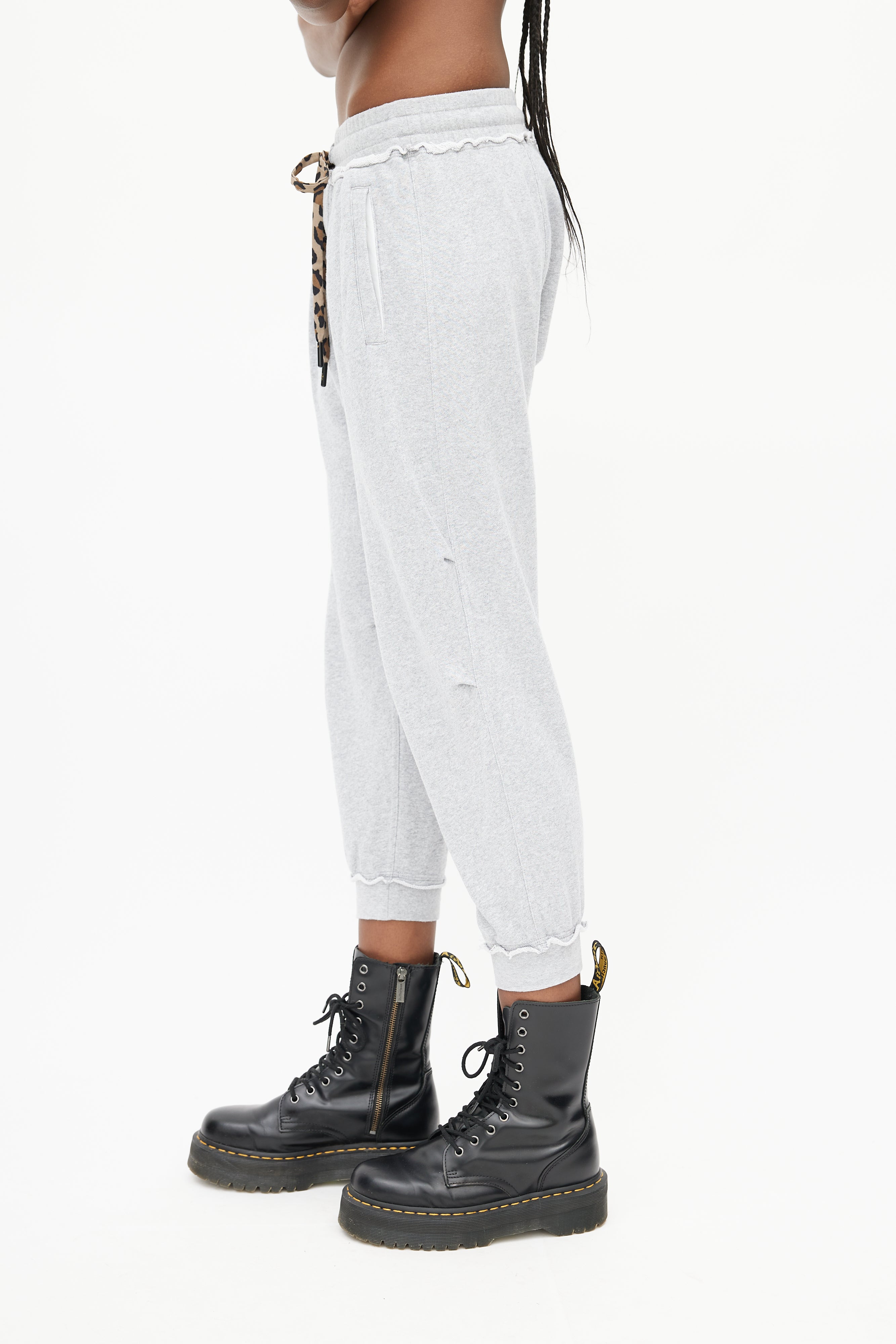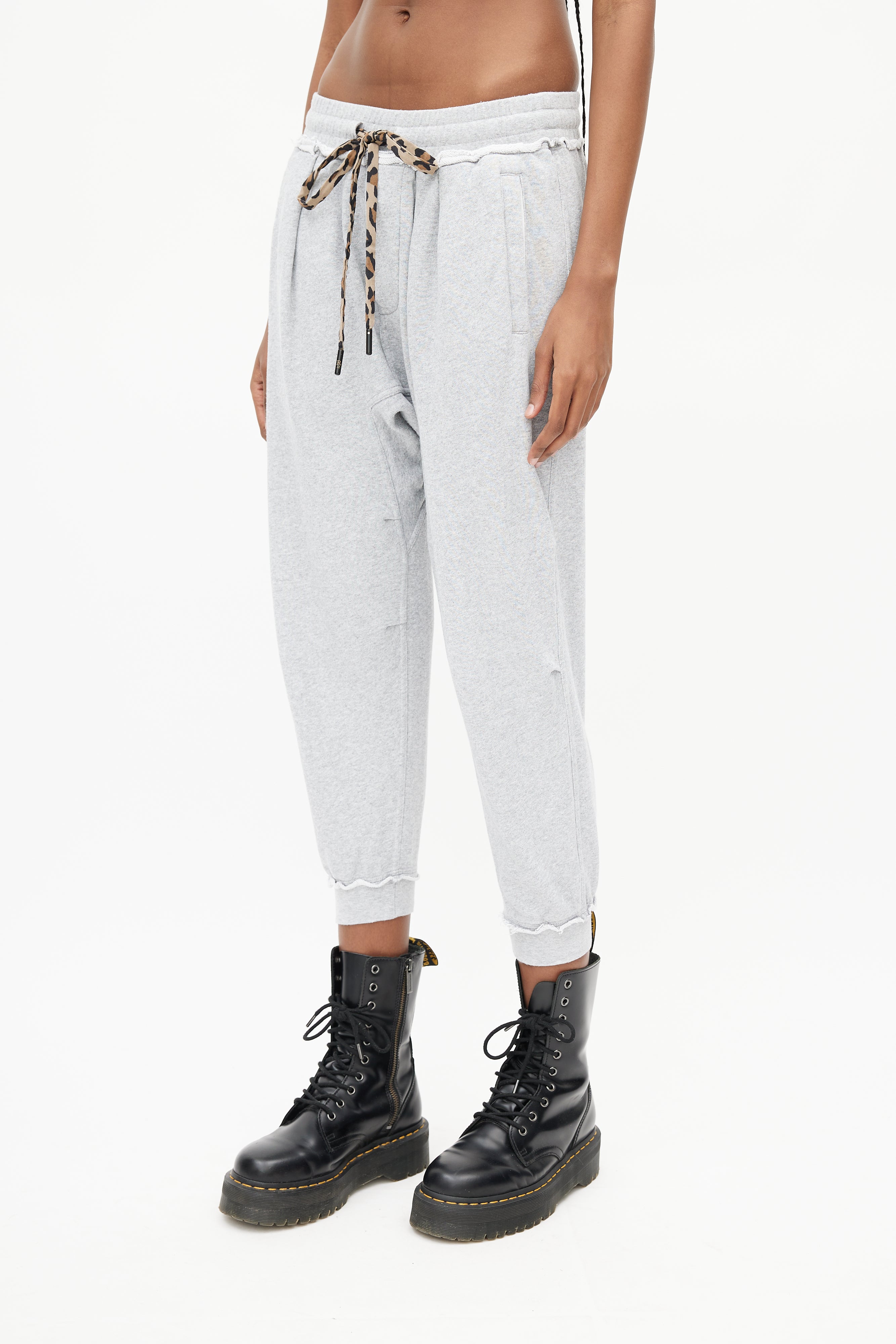 Pre-owned R13 grey sweatpants featuring elasticized waist, cheetah print drawstring, raw hem, drop seat, two welt pockets at hips, and one zip pocket at back.