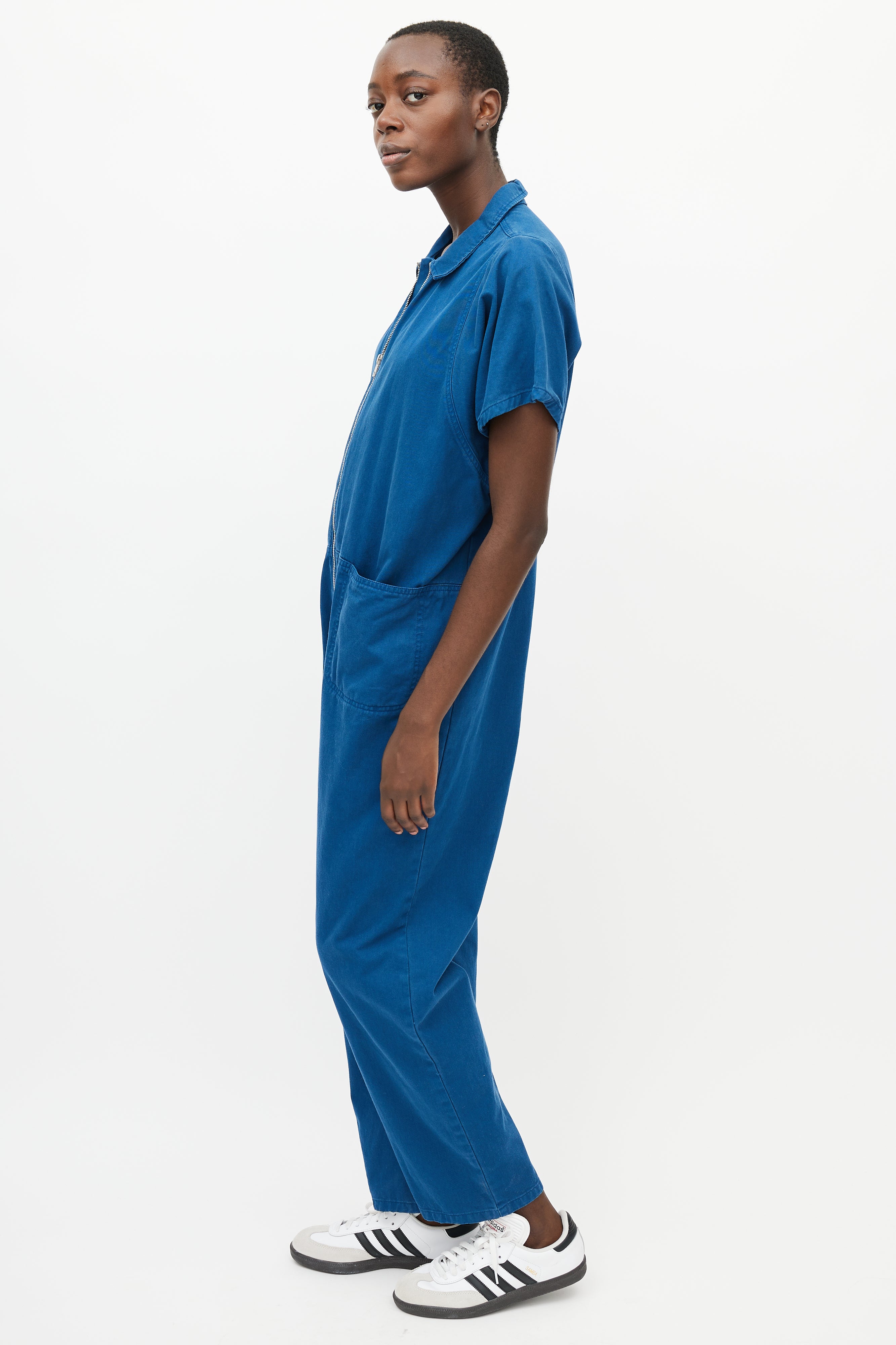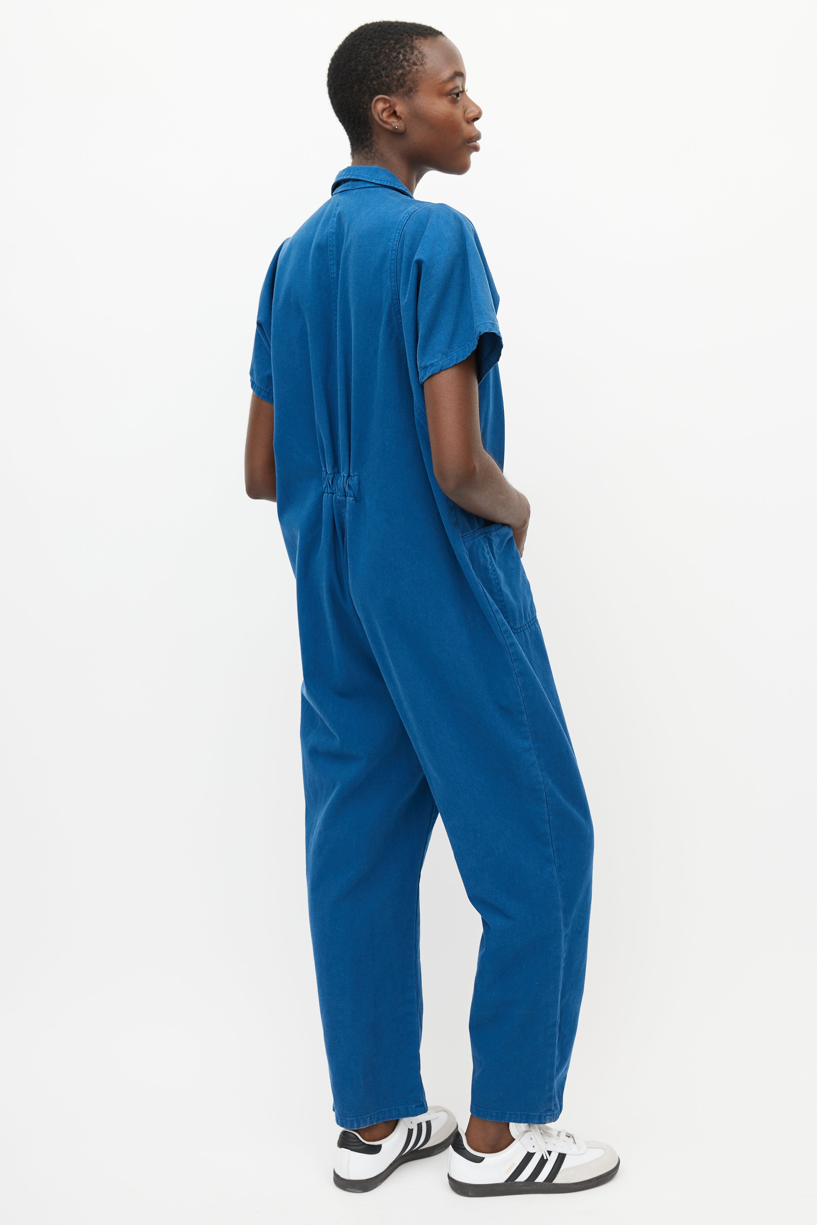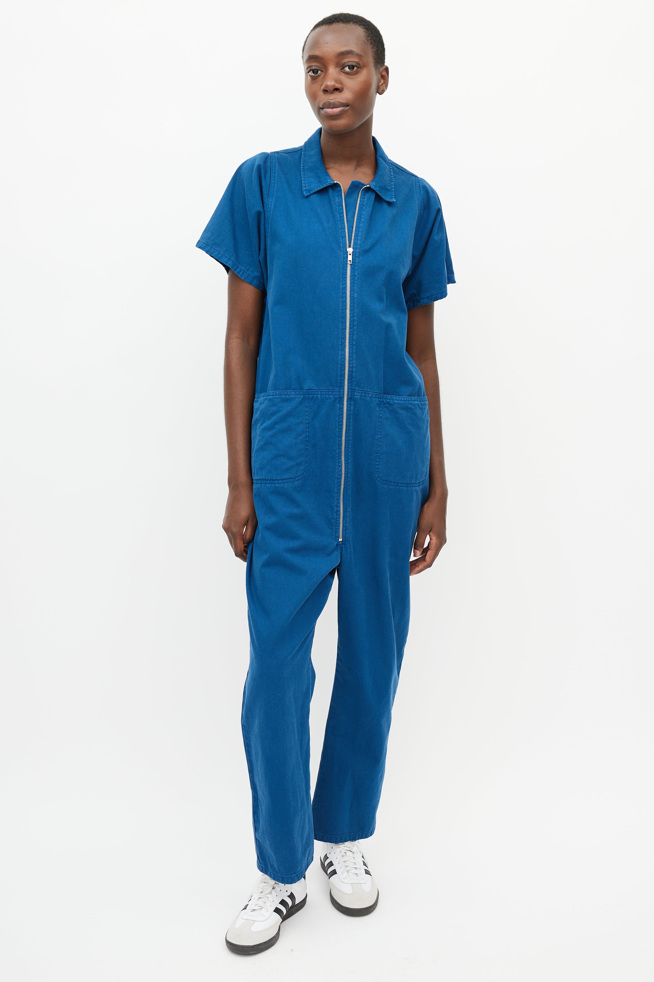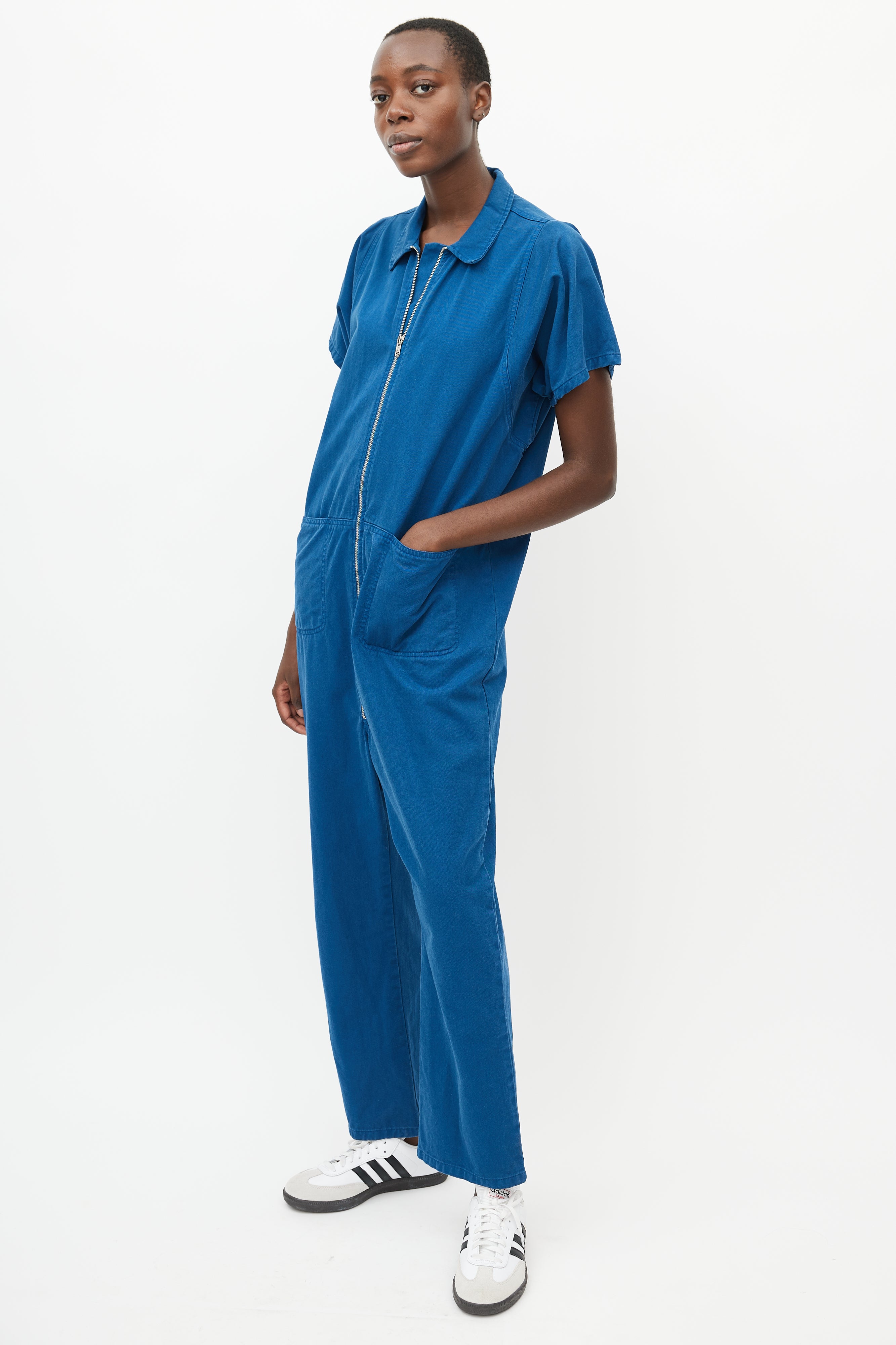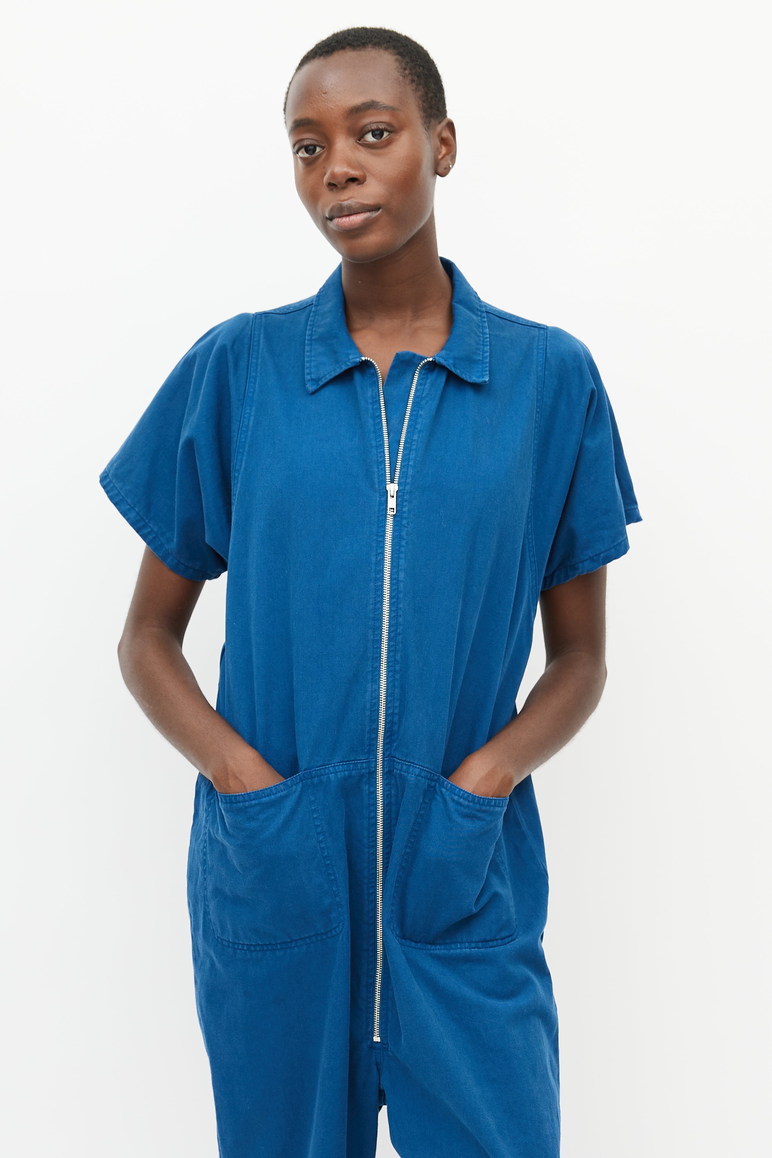 Pre-owned Rachel Comey blue jumpsuit featuring a pointed collar, two patch pockets at hip, short sleeves, straight leg, and zip closure at front.