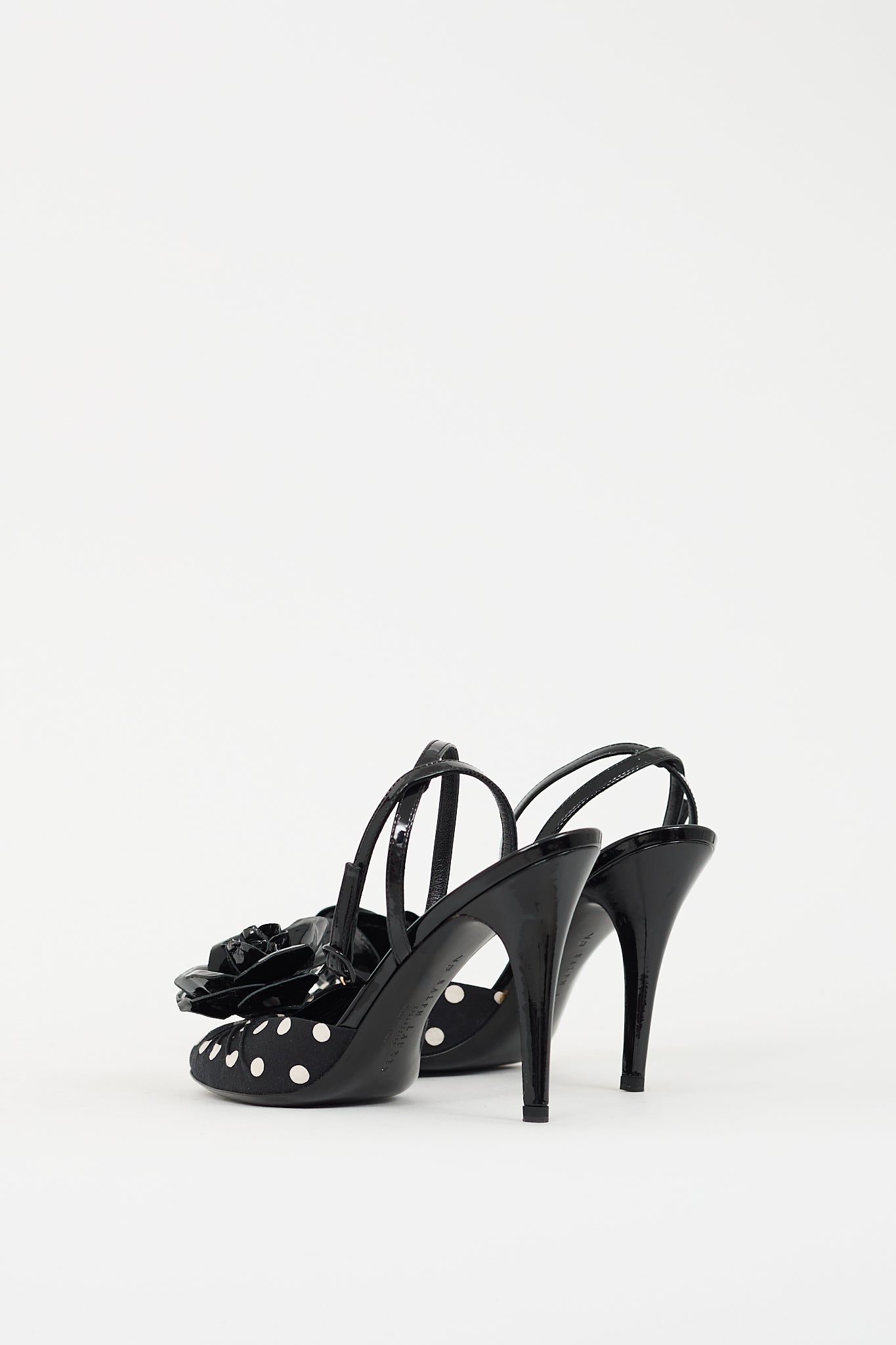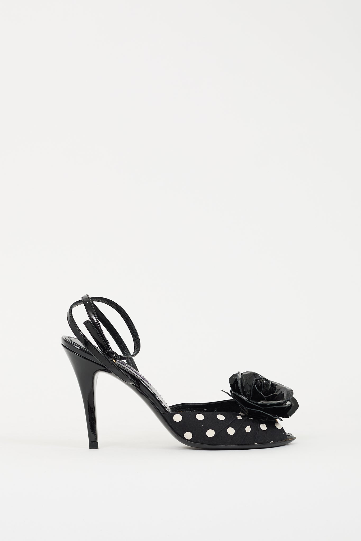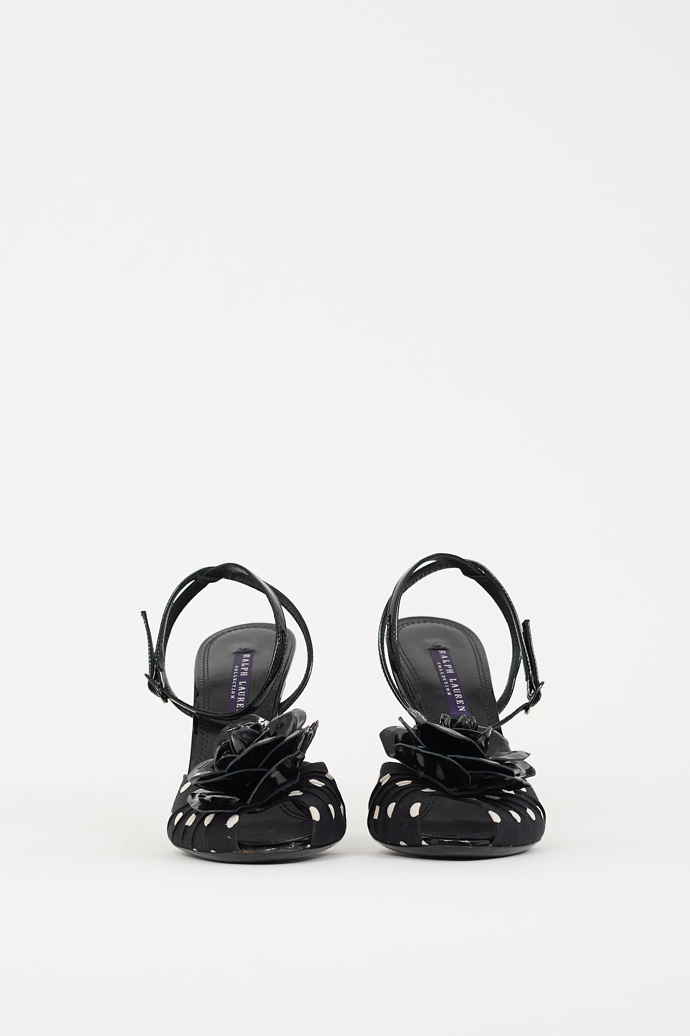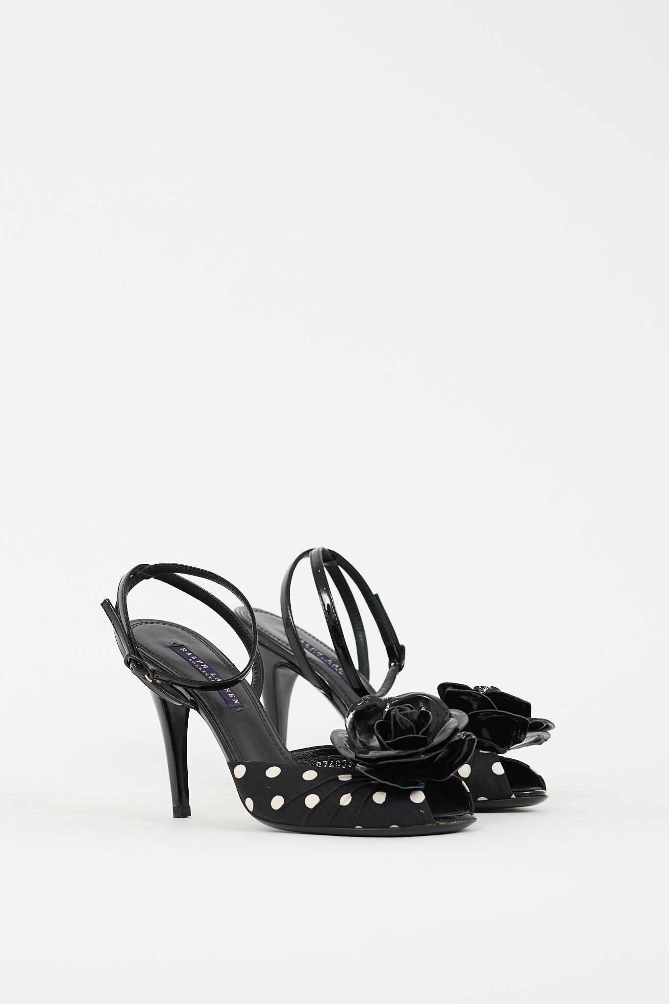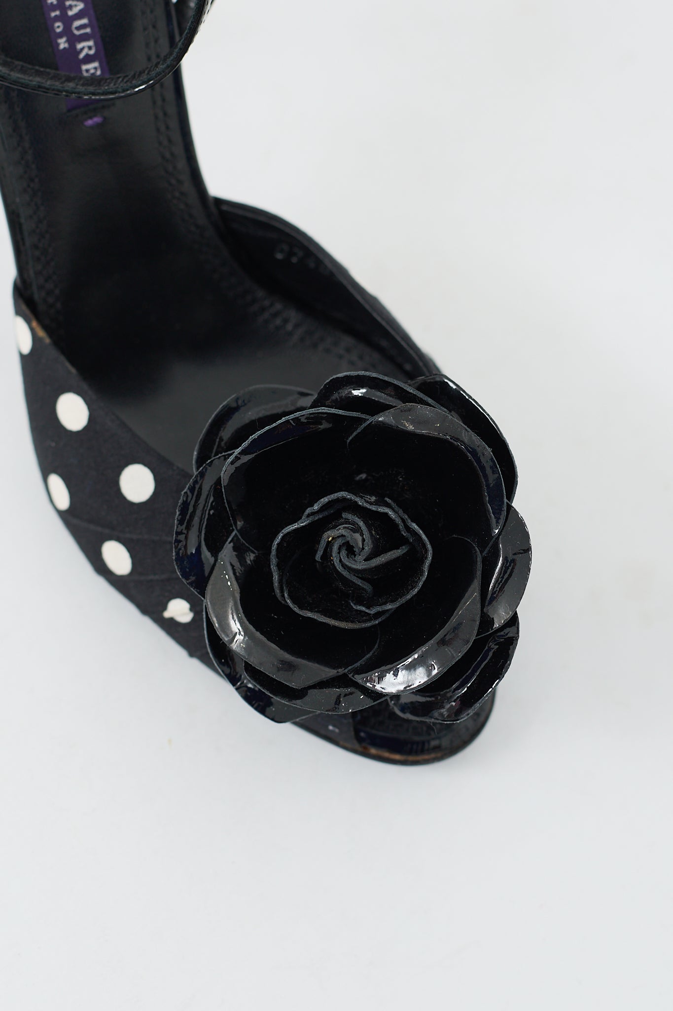 Pre-owned Ralph Lauren black patent leather heels featuring almond peep toe, polka dotted vamp with rosette appliqué, adjustable wraparound ankle strap with buckle fastening, and covered heel.