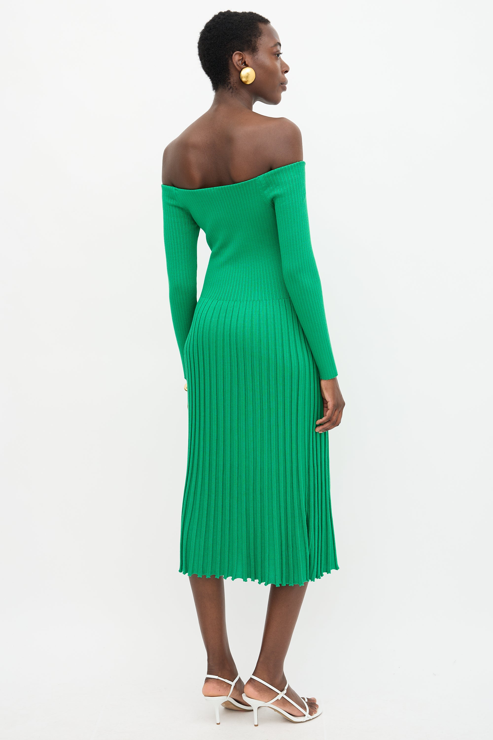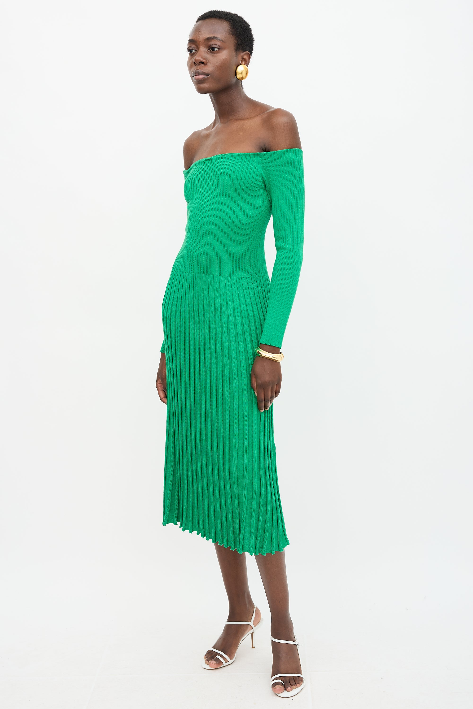 Pre-owned Ralph Lauren green silk blend rib knit dress featuring elasticized off shoulder topline and long sleeves.