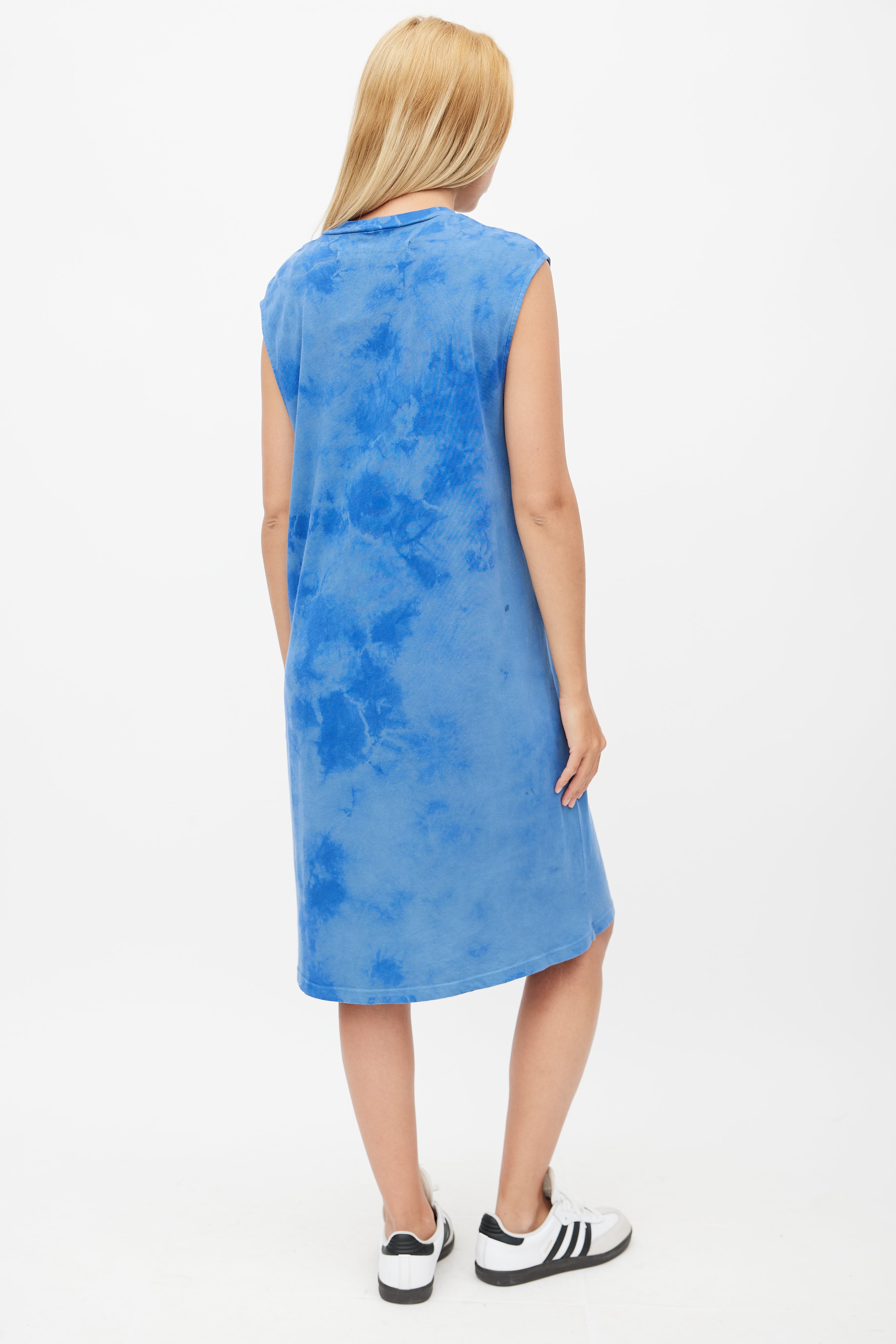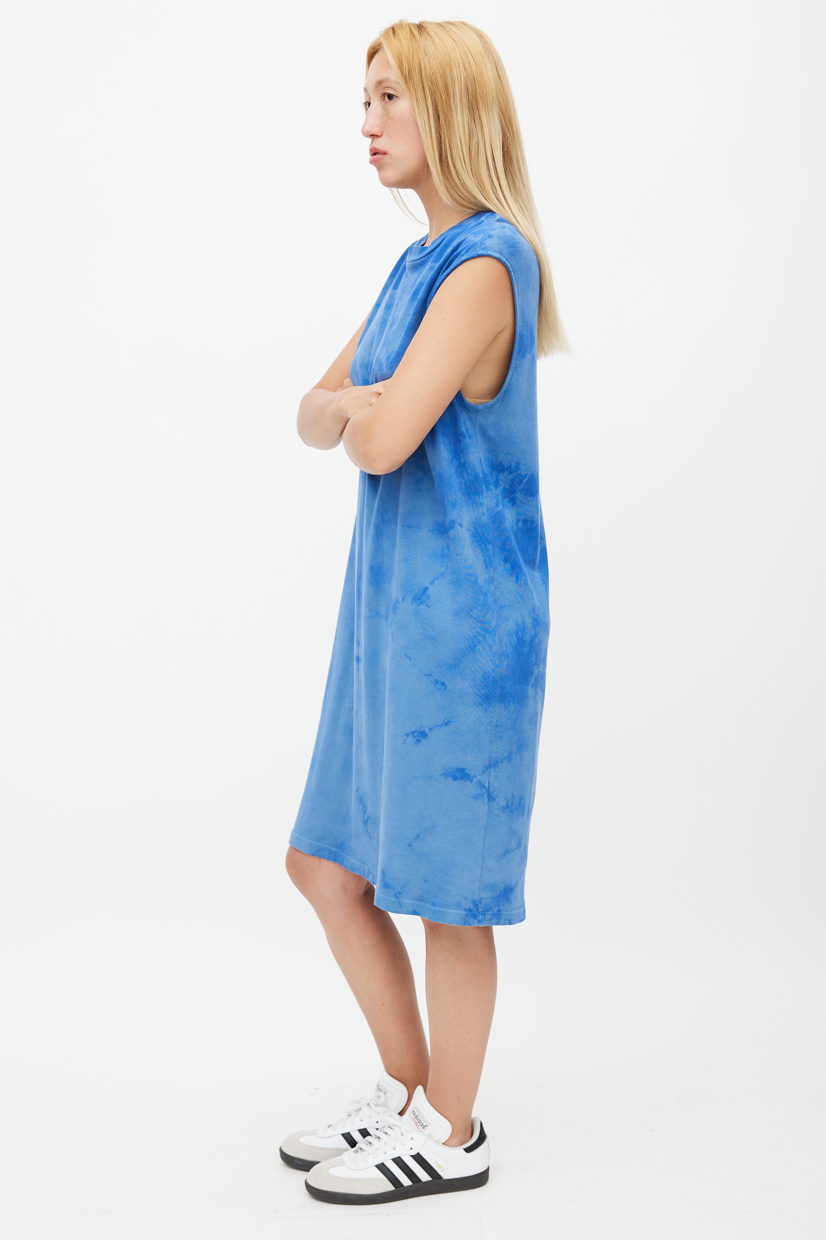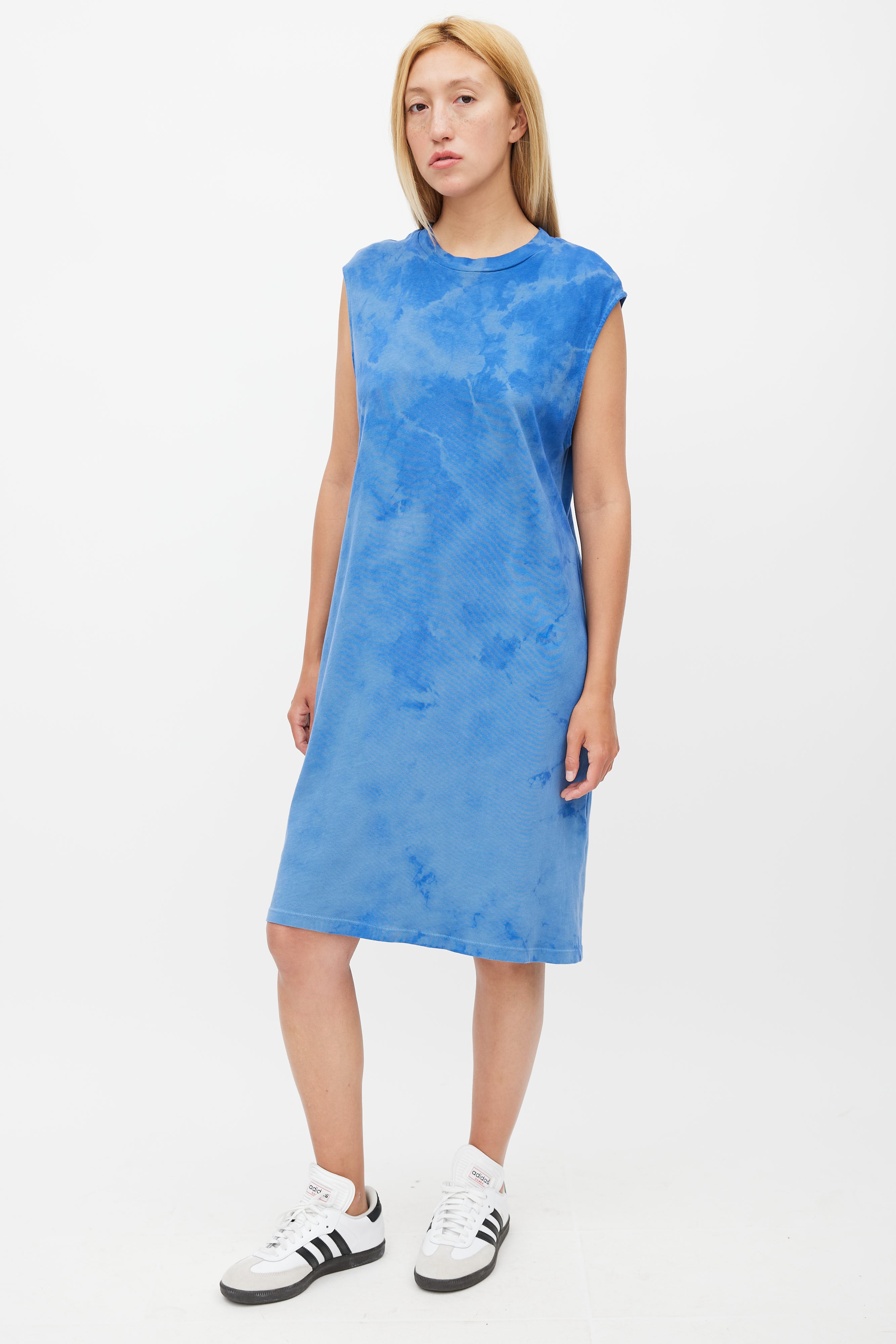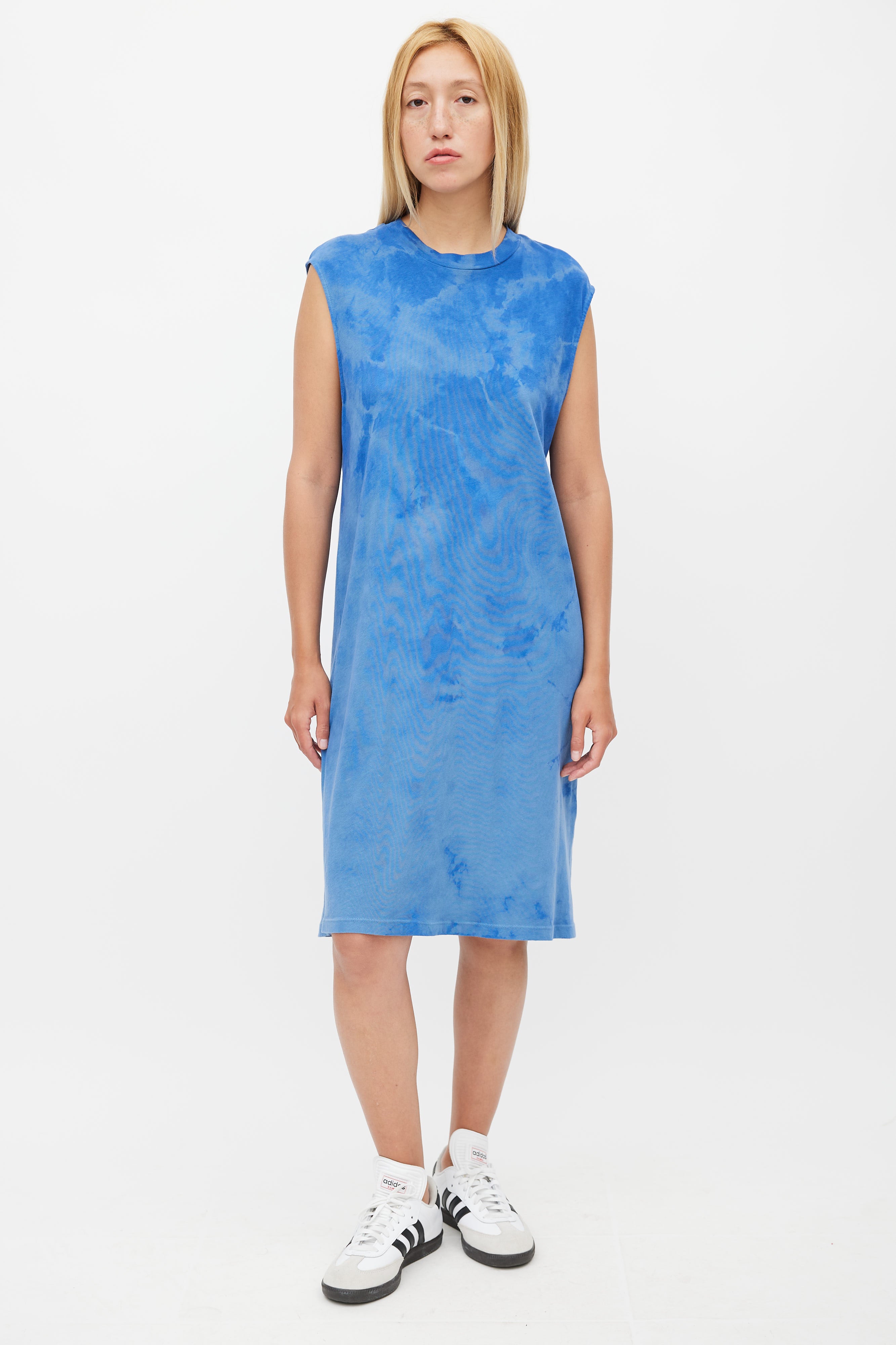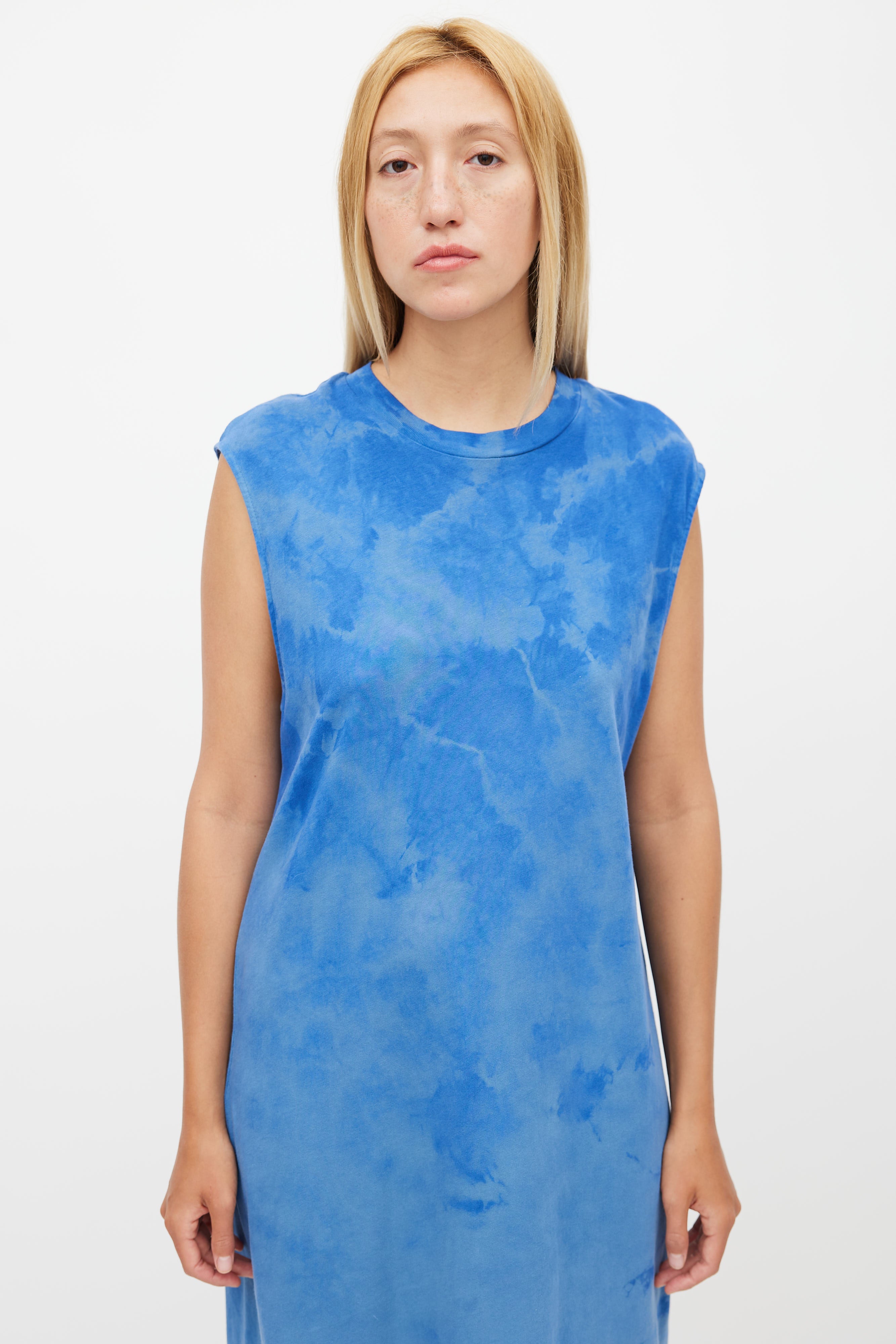 Pre-owned Raquel Allegra blue dress featuring tonal tie die print throughout, crew neckline, and sleeveless styling.