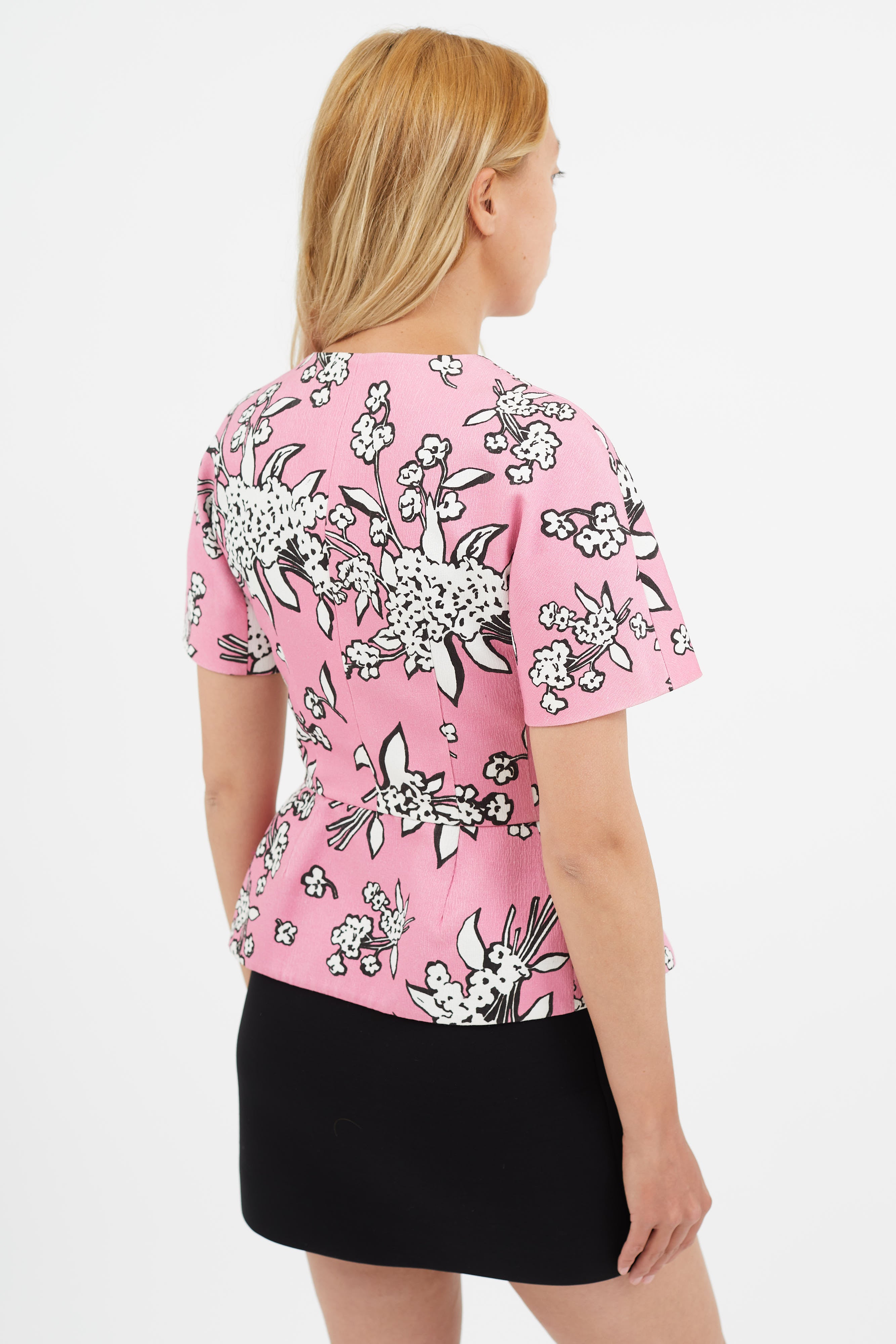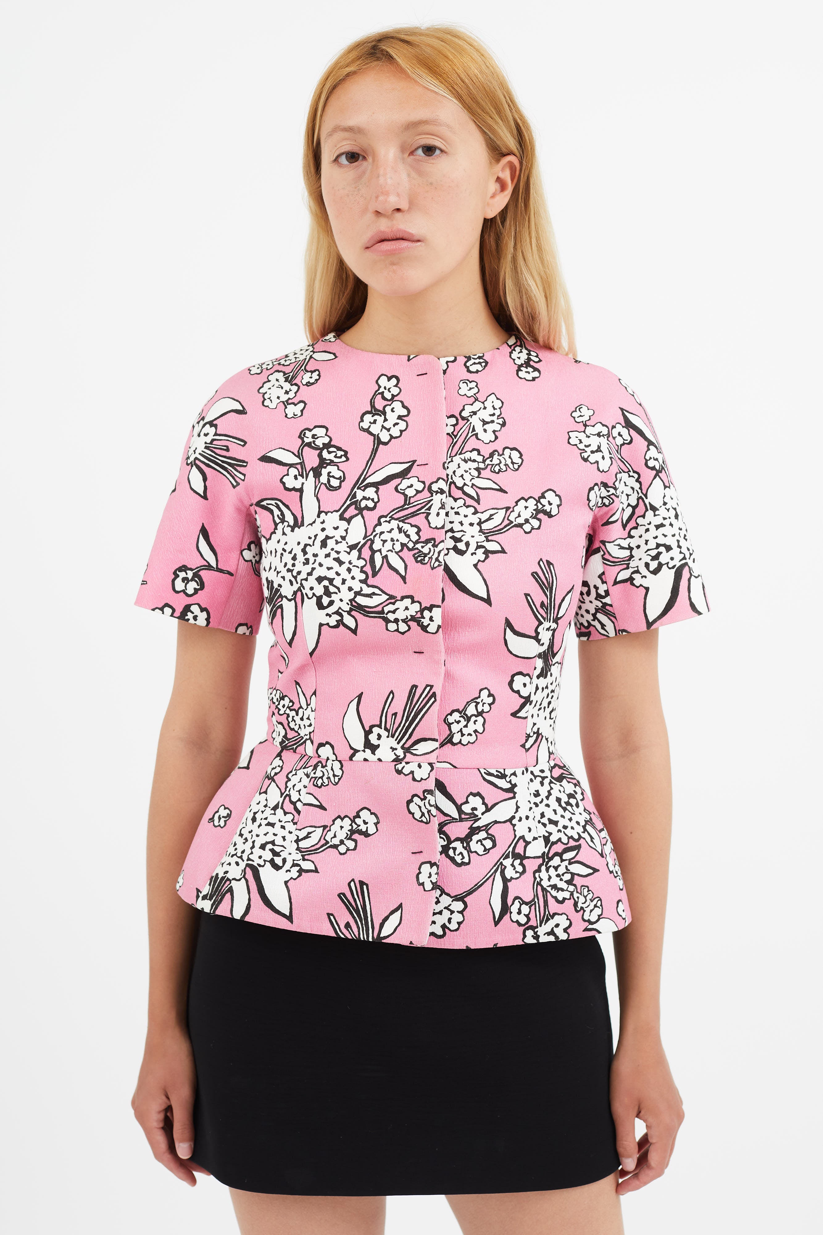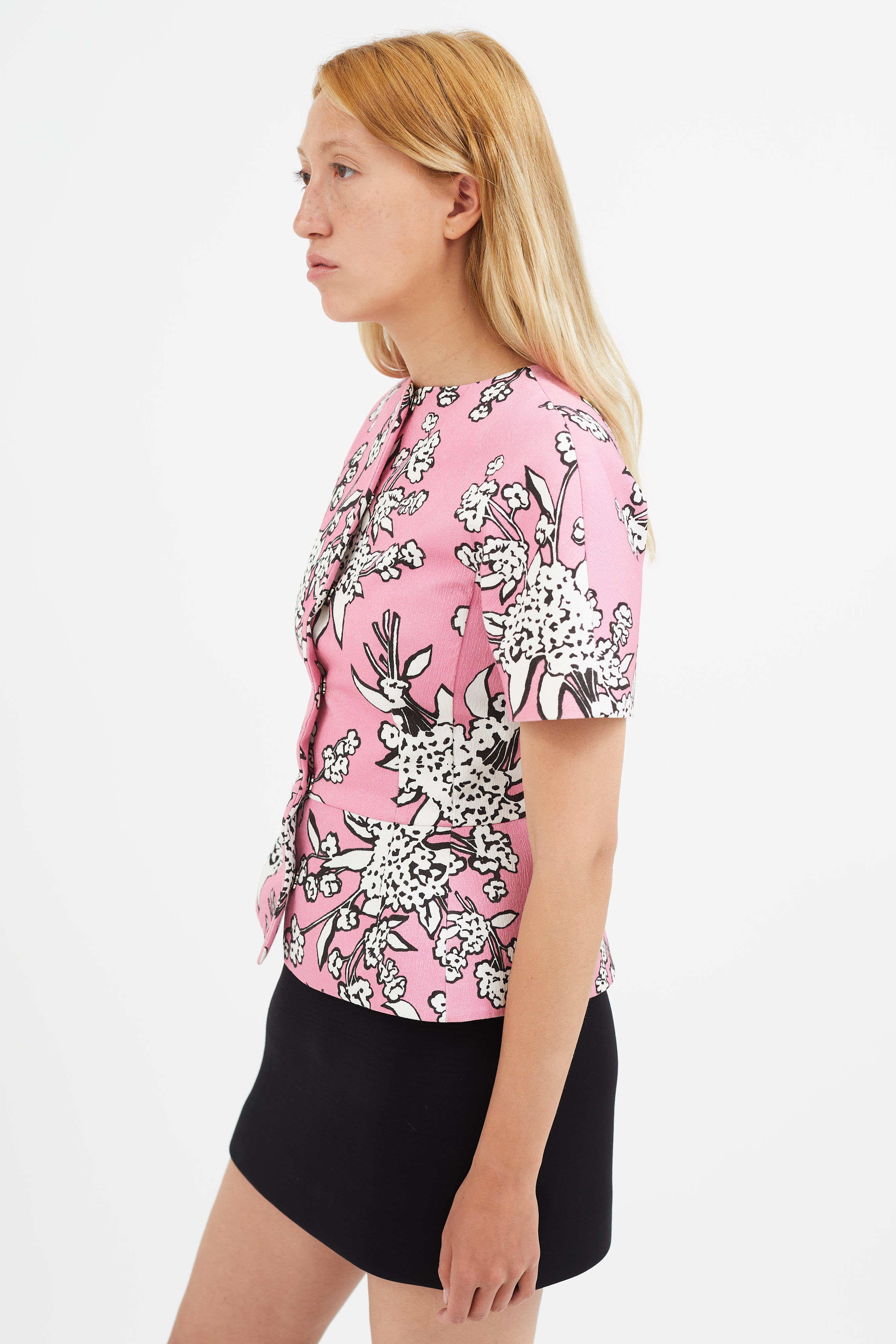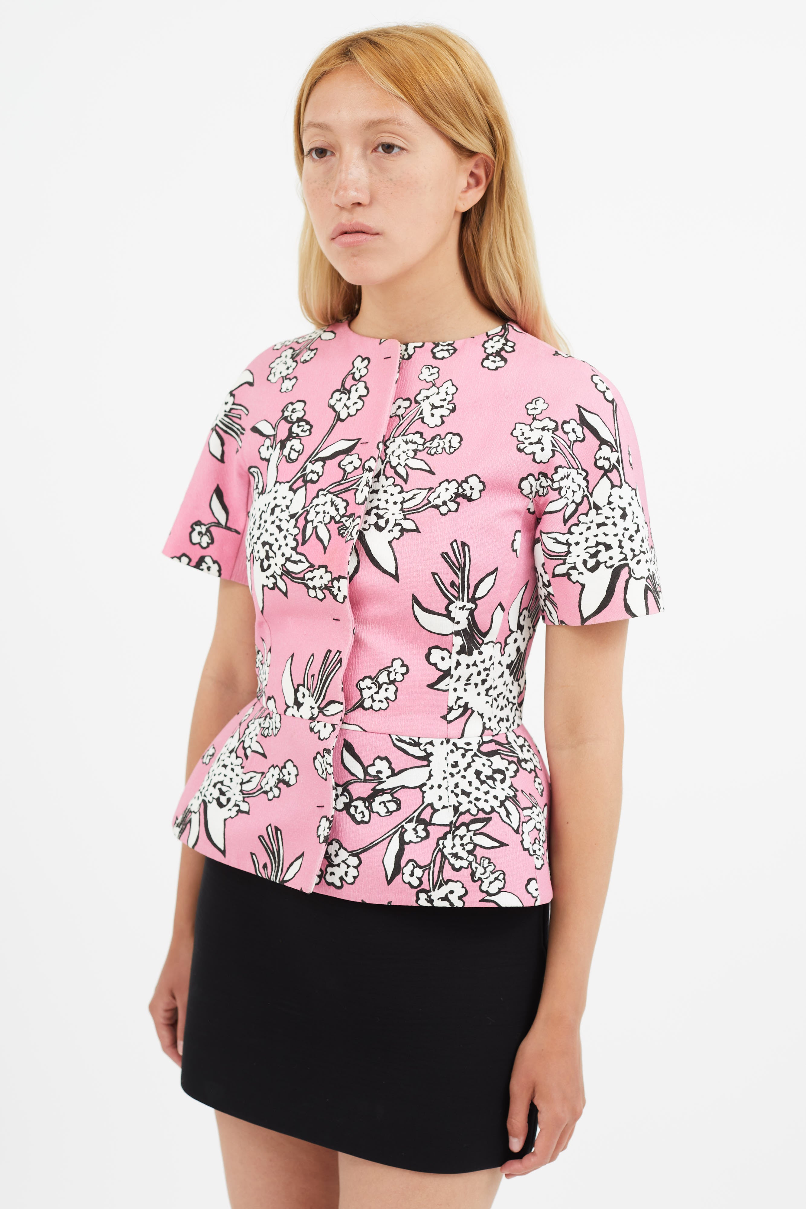 Pre-owned Red Valentino peplum blazer in pink featuring white and black floral print, round collar, concealed snap button closure at front, seamless short sleeves and darting throughout. Lined