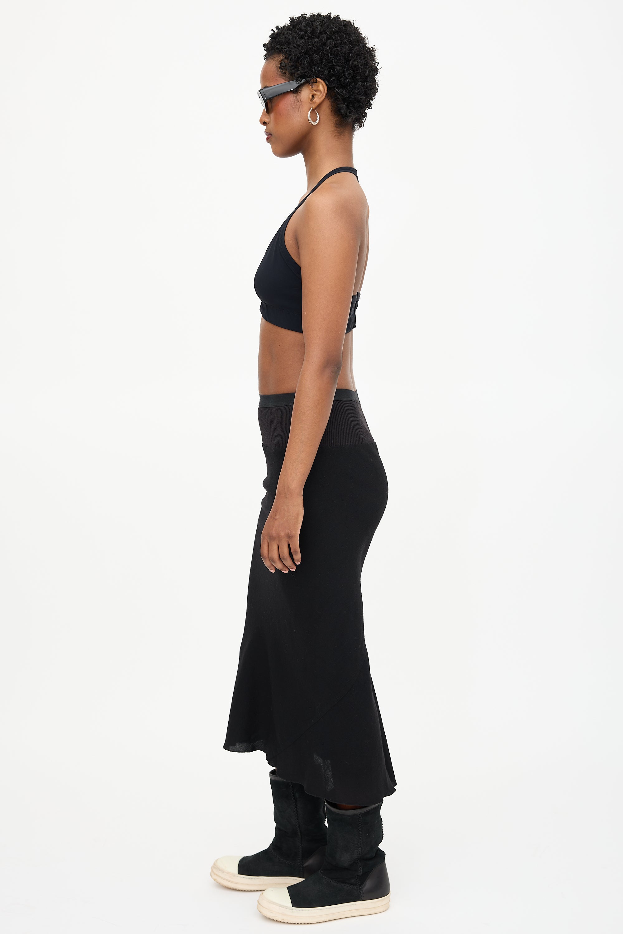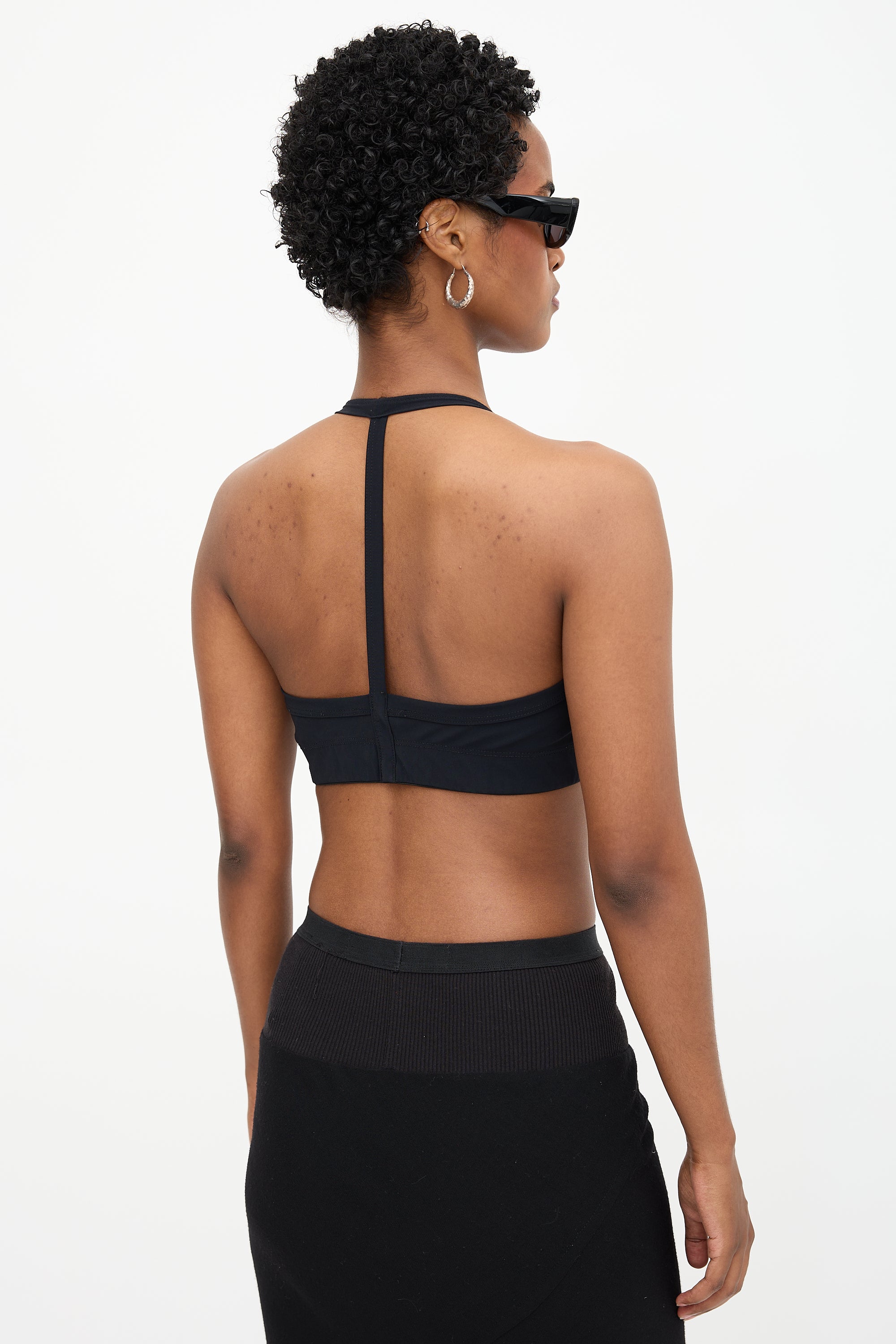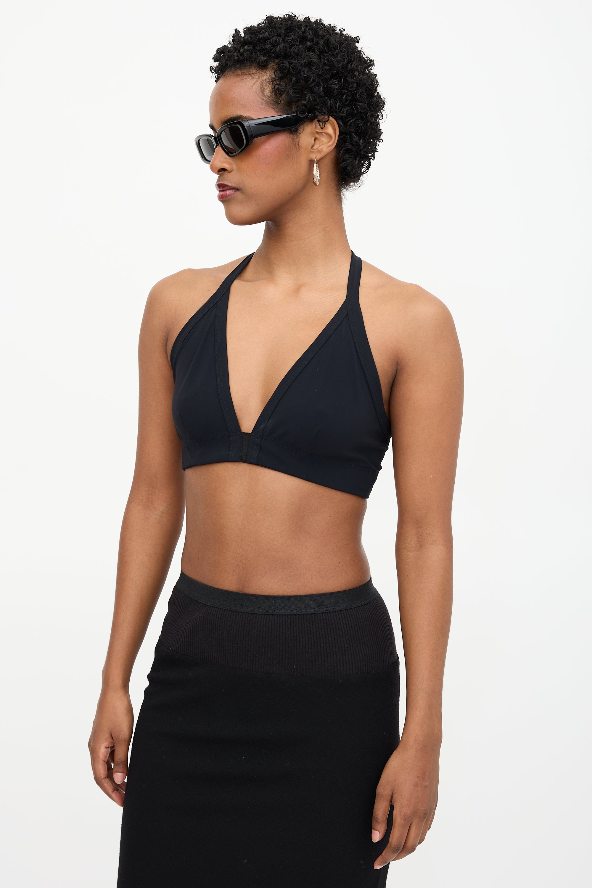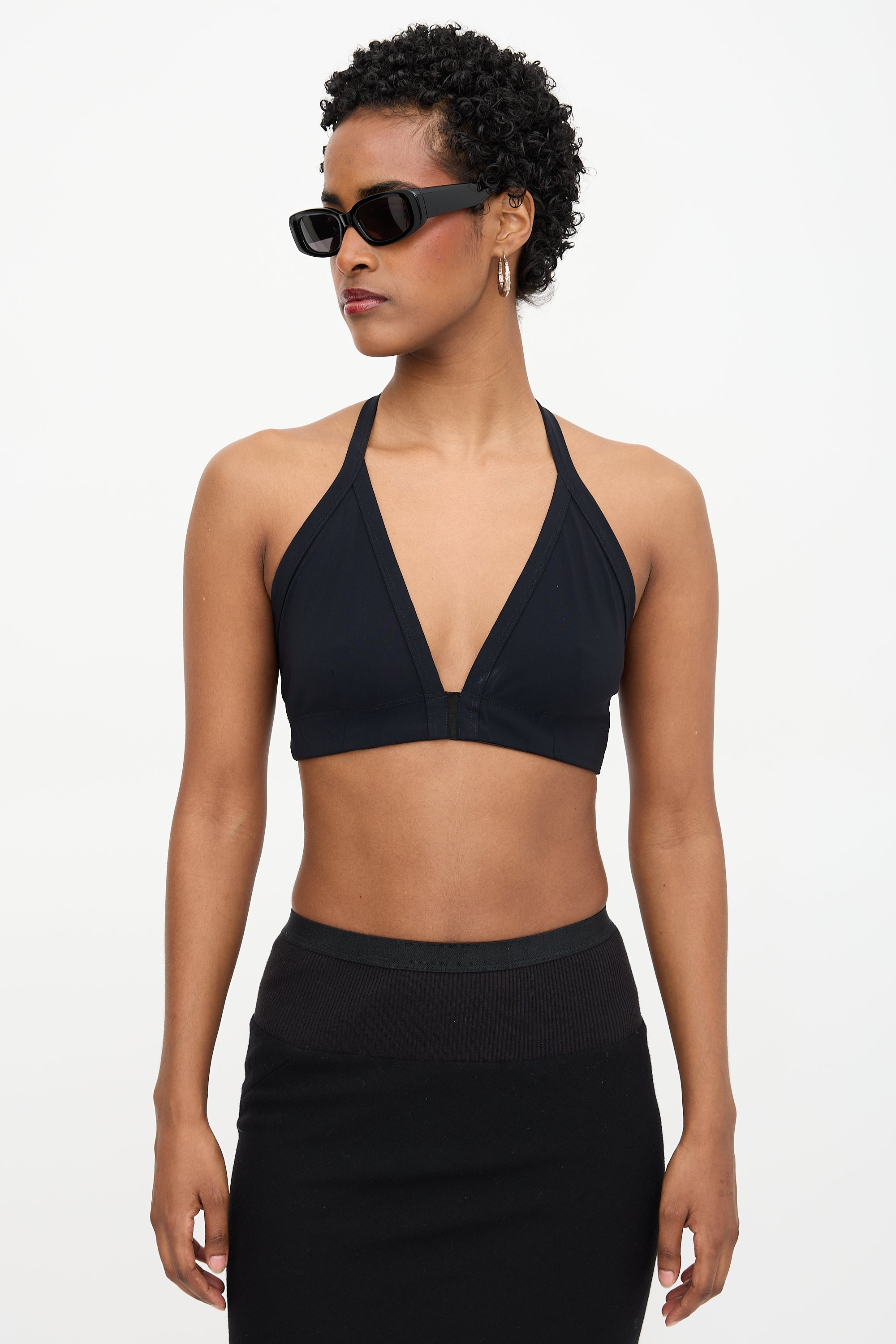 Pre-owned Rick Owens black nylon blend jersey bikini top featuring triangle cups, halter neck, T-strap back and elastic band at hem.