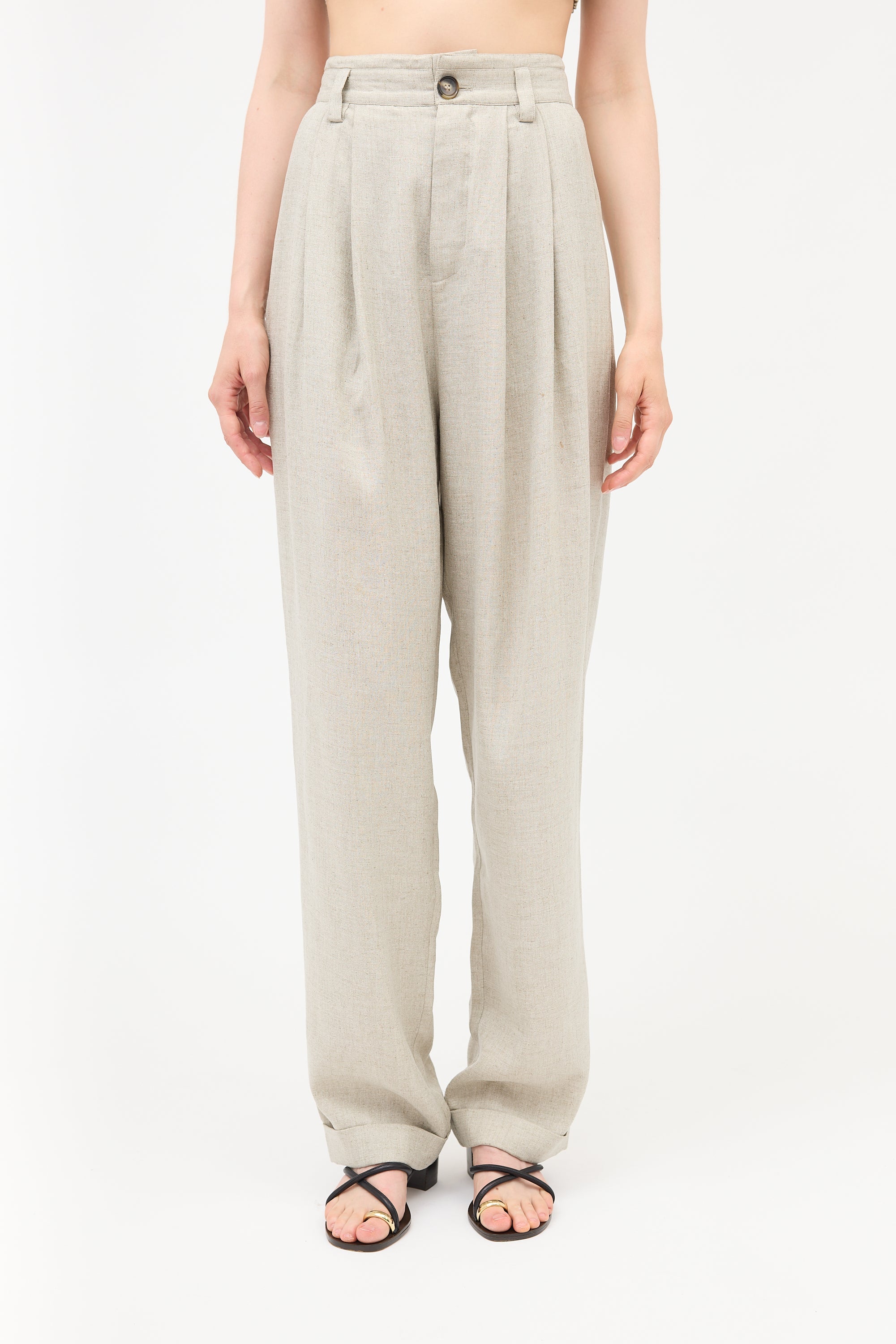 Pre-owned Ronny Kobo heathered beige trousers featuring a zip fly, pleated front waist, belt loops, four pocket styling, and a tapered leg with cuffed hem.