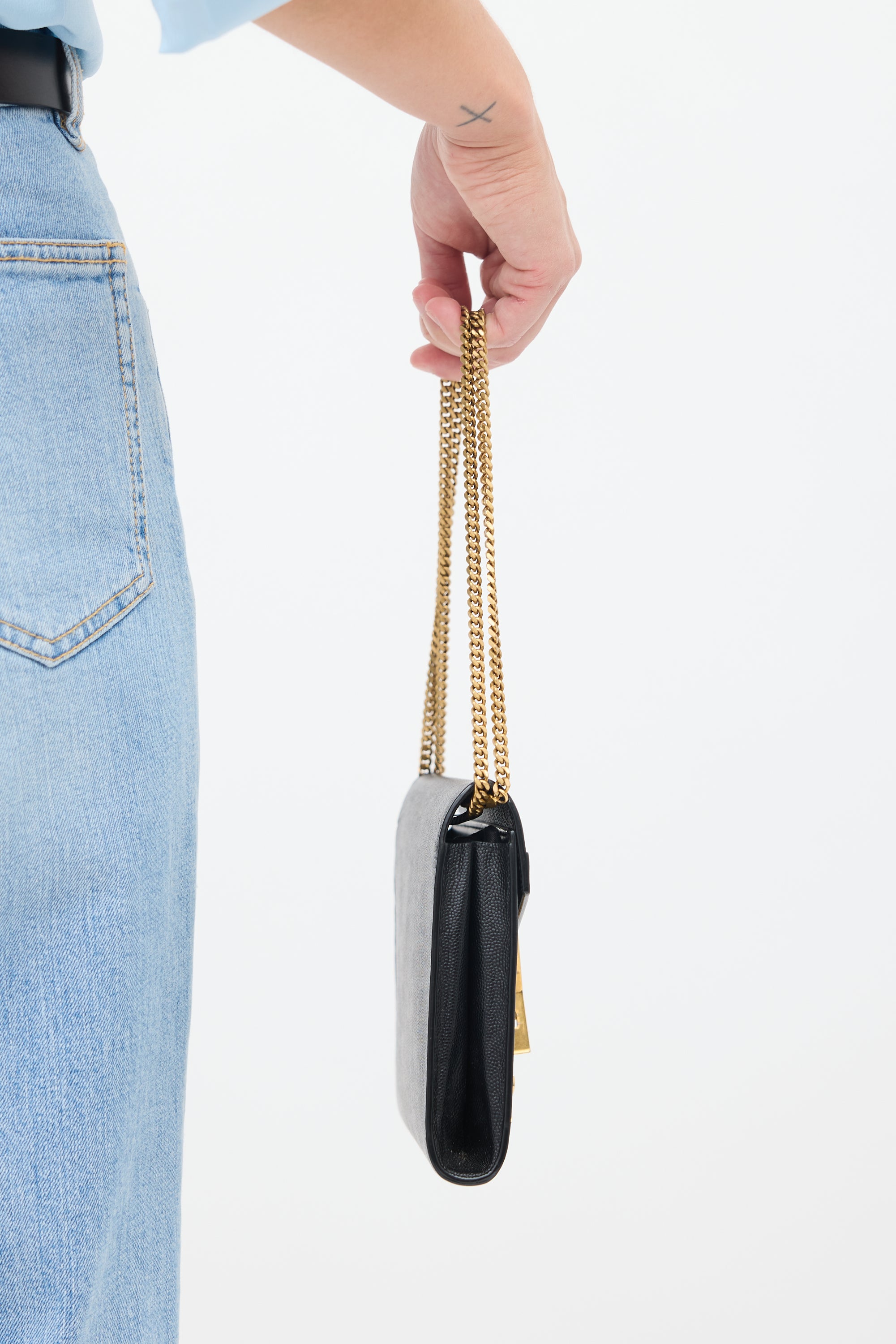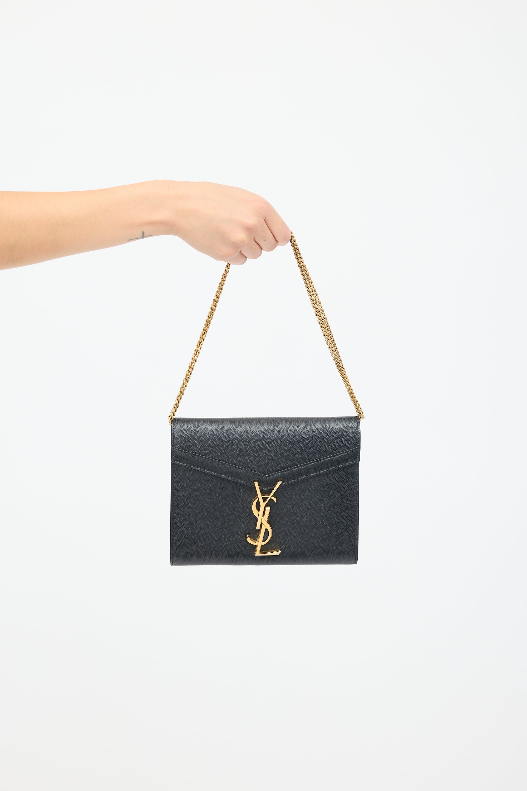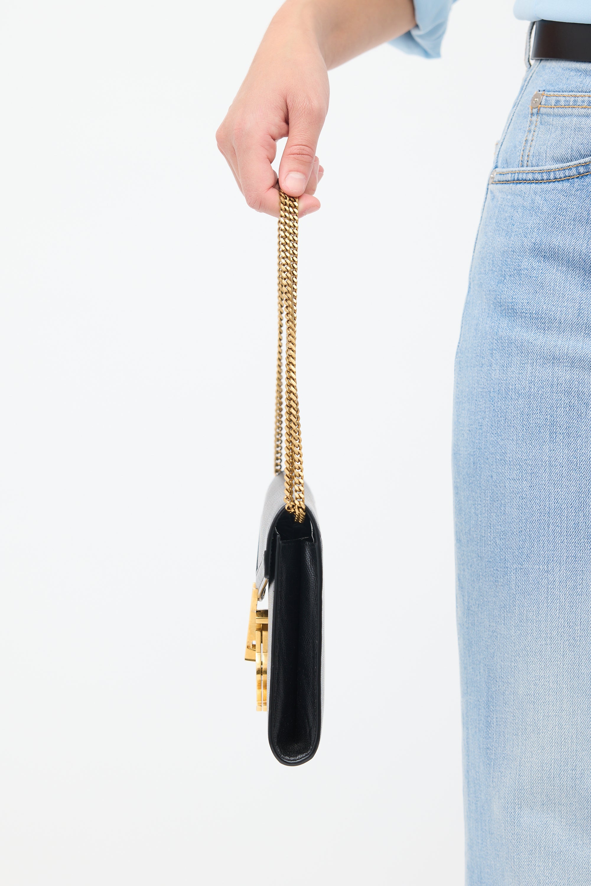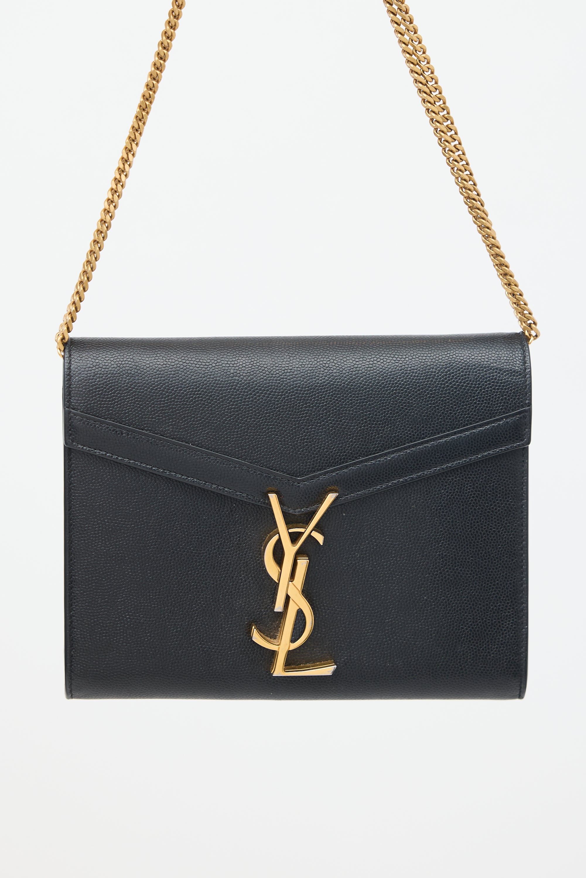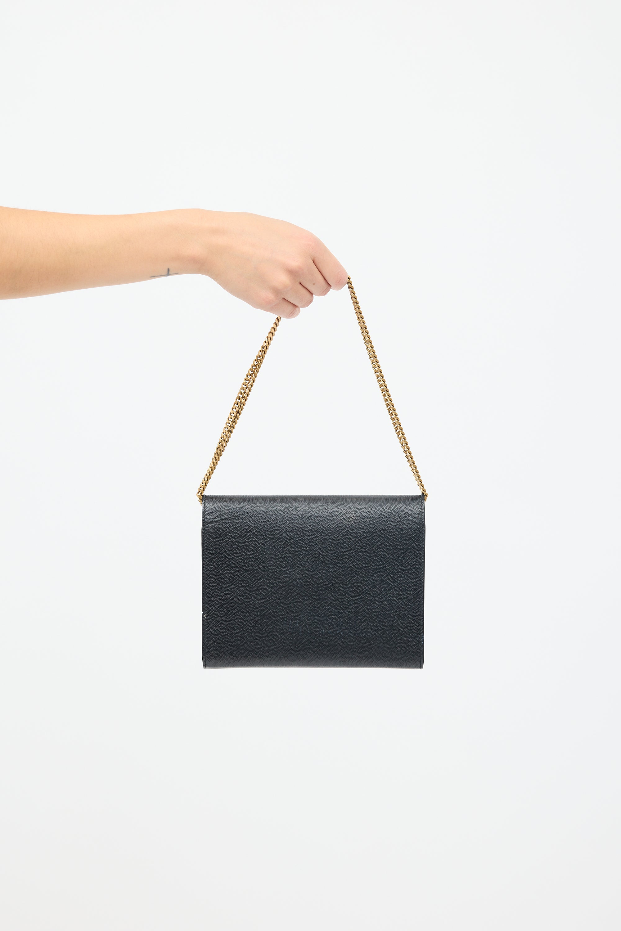 Pre-owned Saint Laurent black grained leather Cassandra wallet on chain featuring twist lock closure with Cassandre logo at front, detachable fixed gold tone chain strap, one main compartment, one slip pocket inside, and three slip pockets inside. Comes with original dust bag.