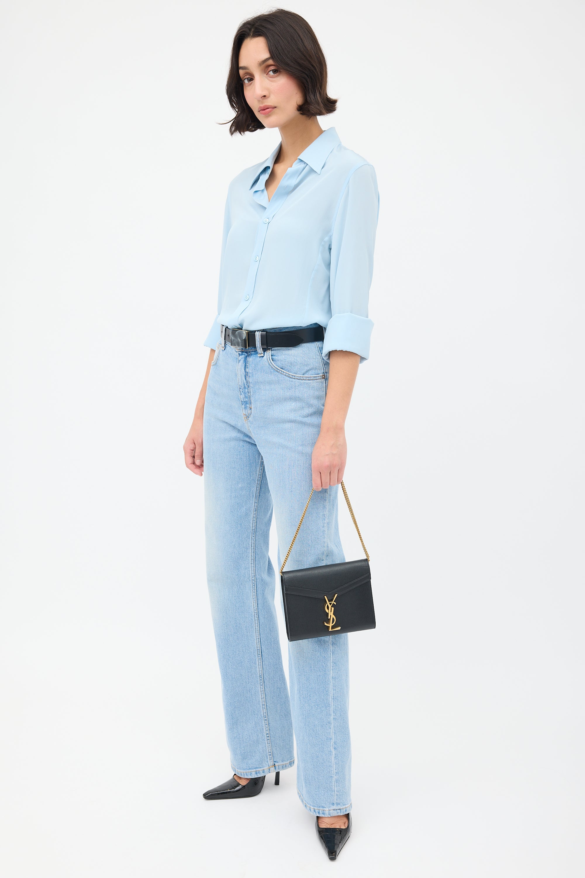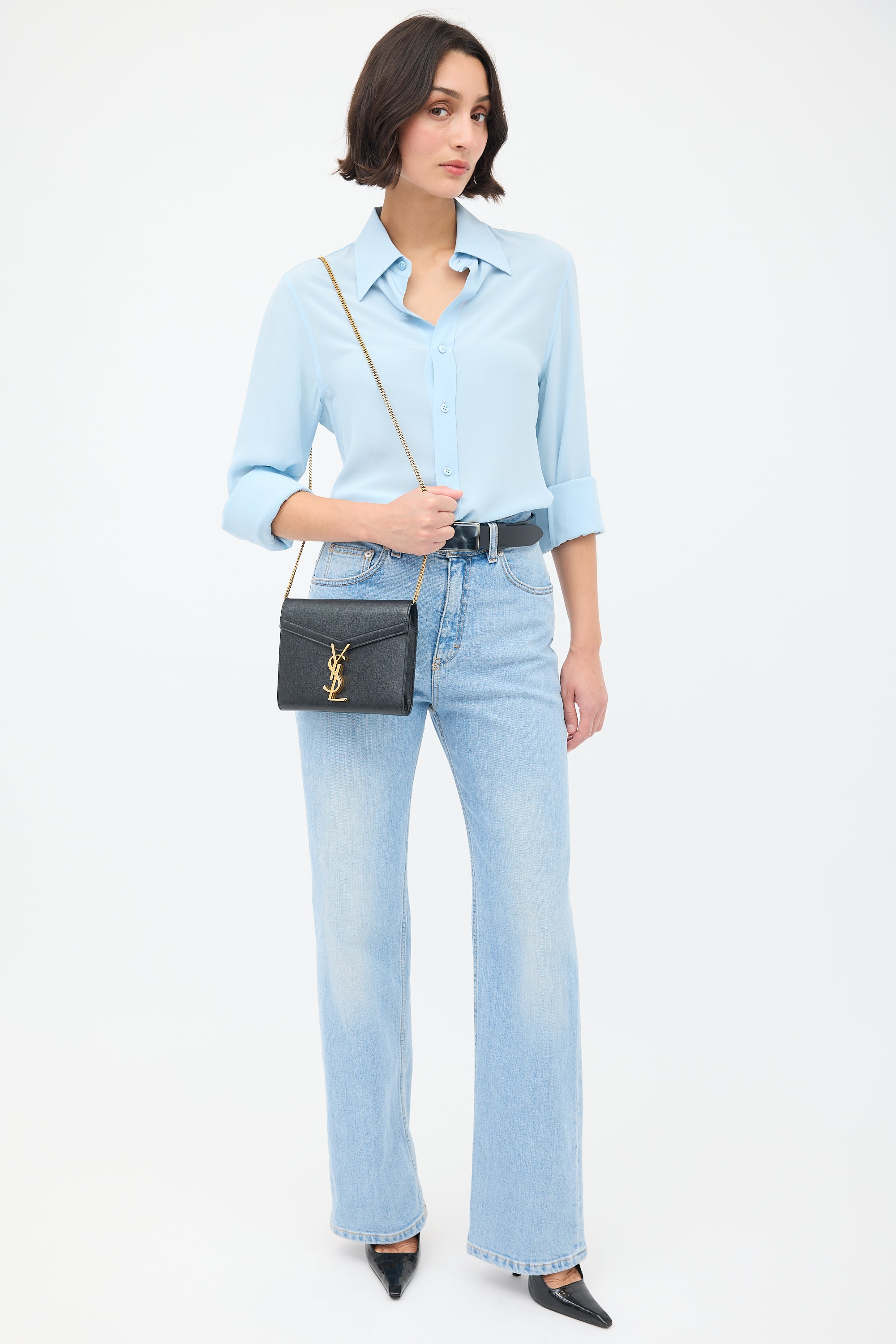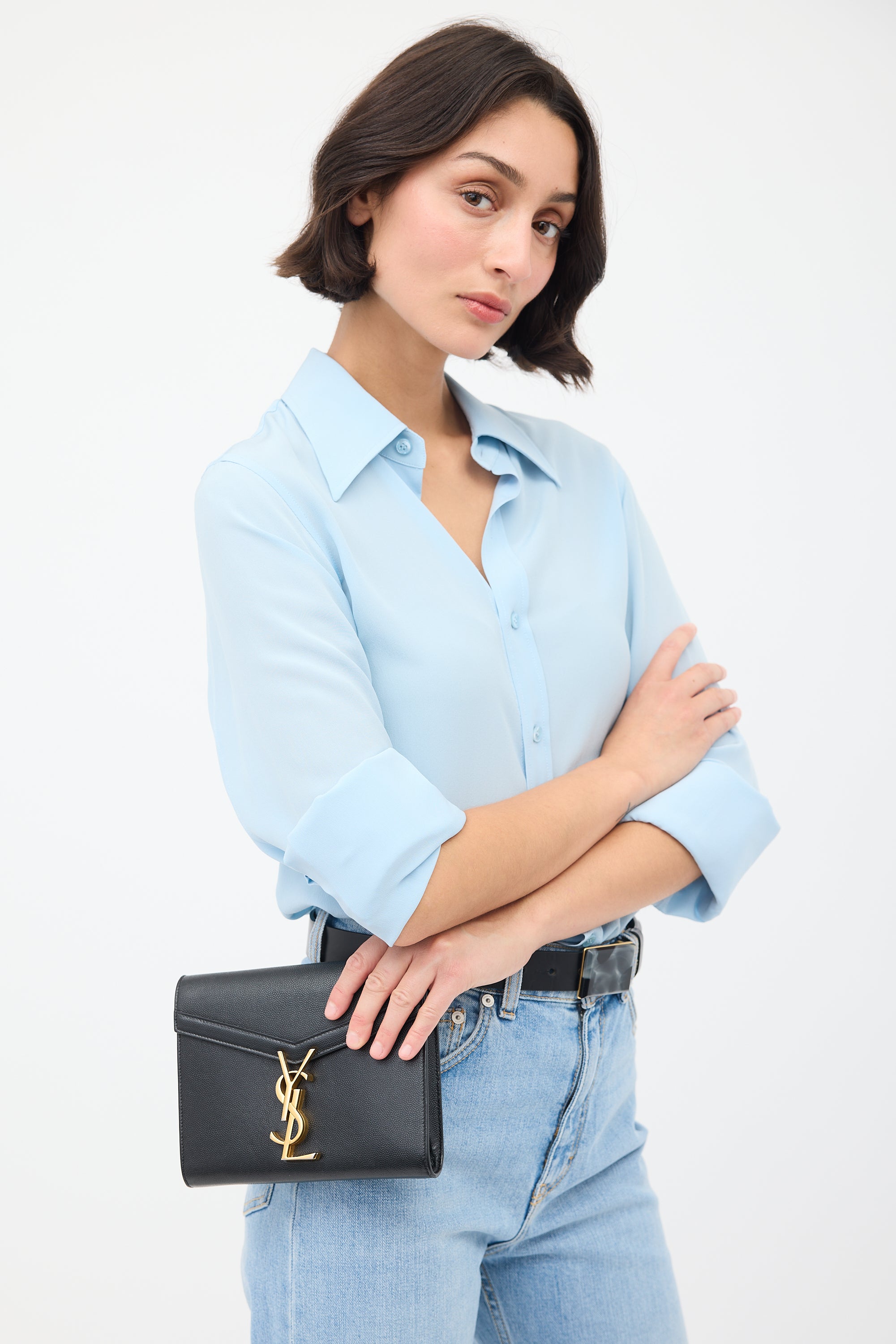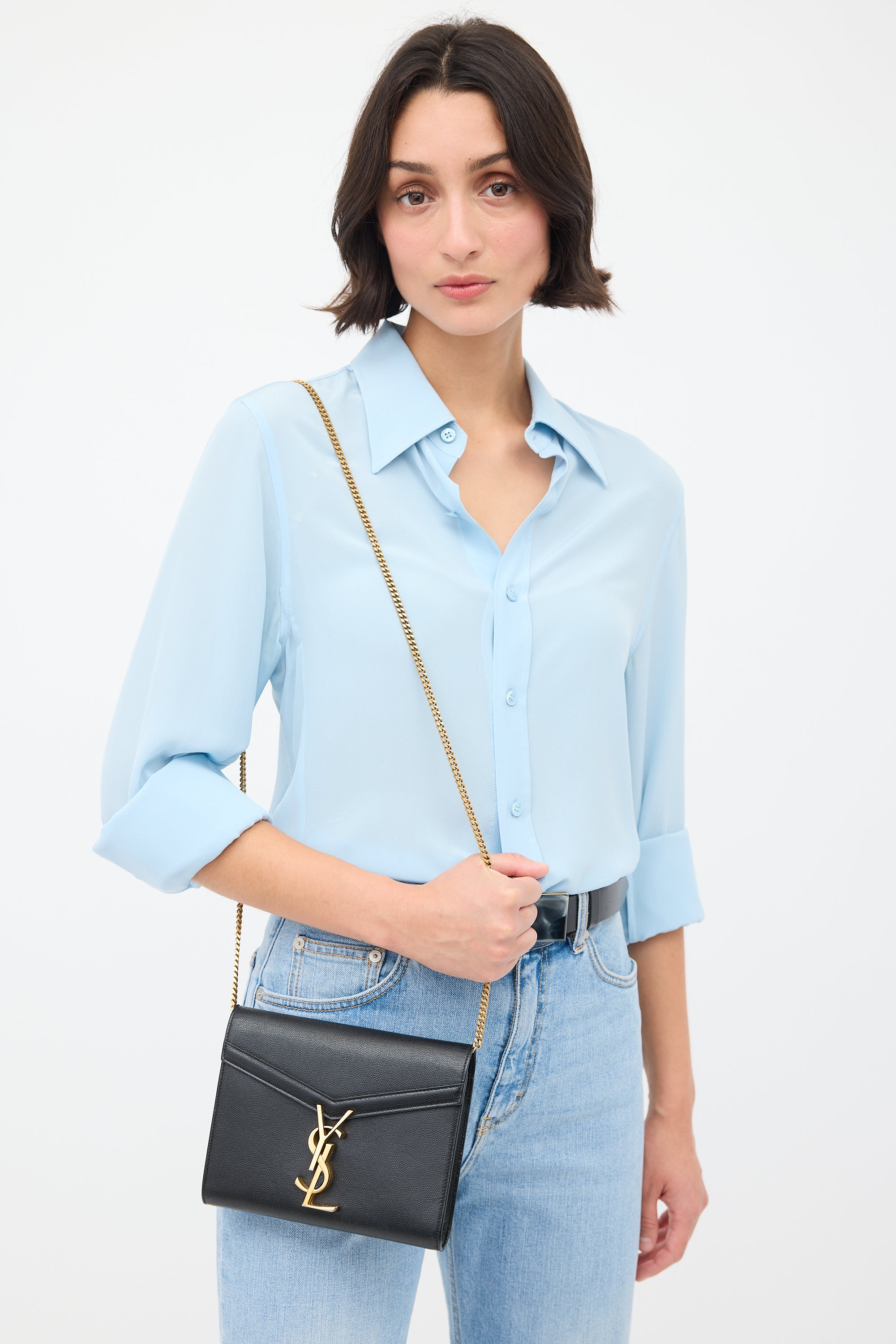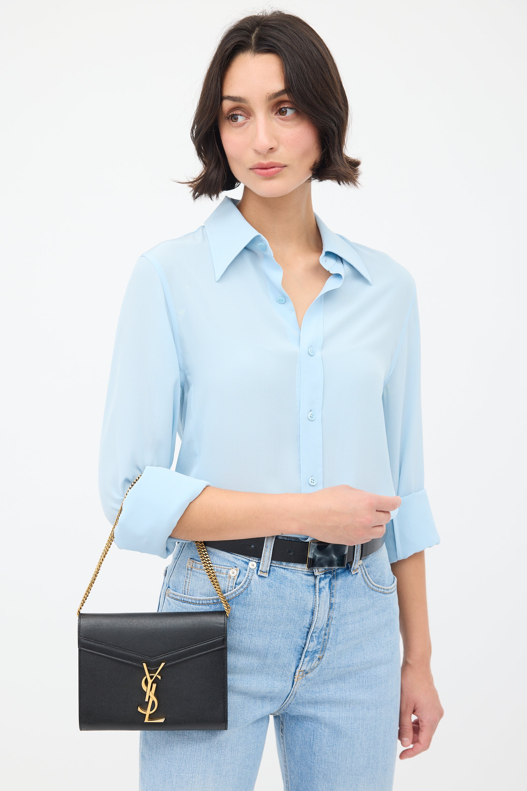 Pre-owned Saint Laurent black grained leather Cassandra wallet on chain featuring twist lock closure with Cassandre logo at front, detachable fixed gold tone chain strap, one main compartment, one slip pocket inside, and three slip pockets inside. Comes with original dust bag.