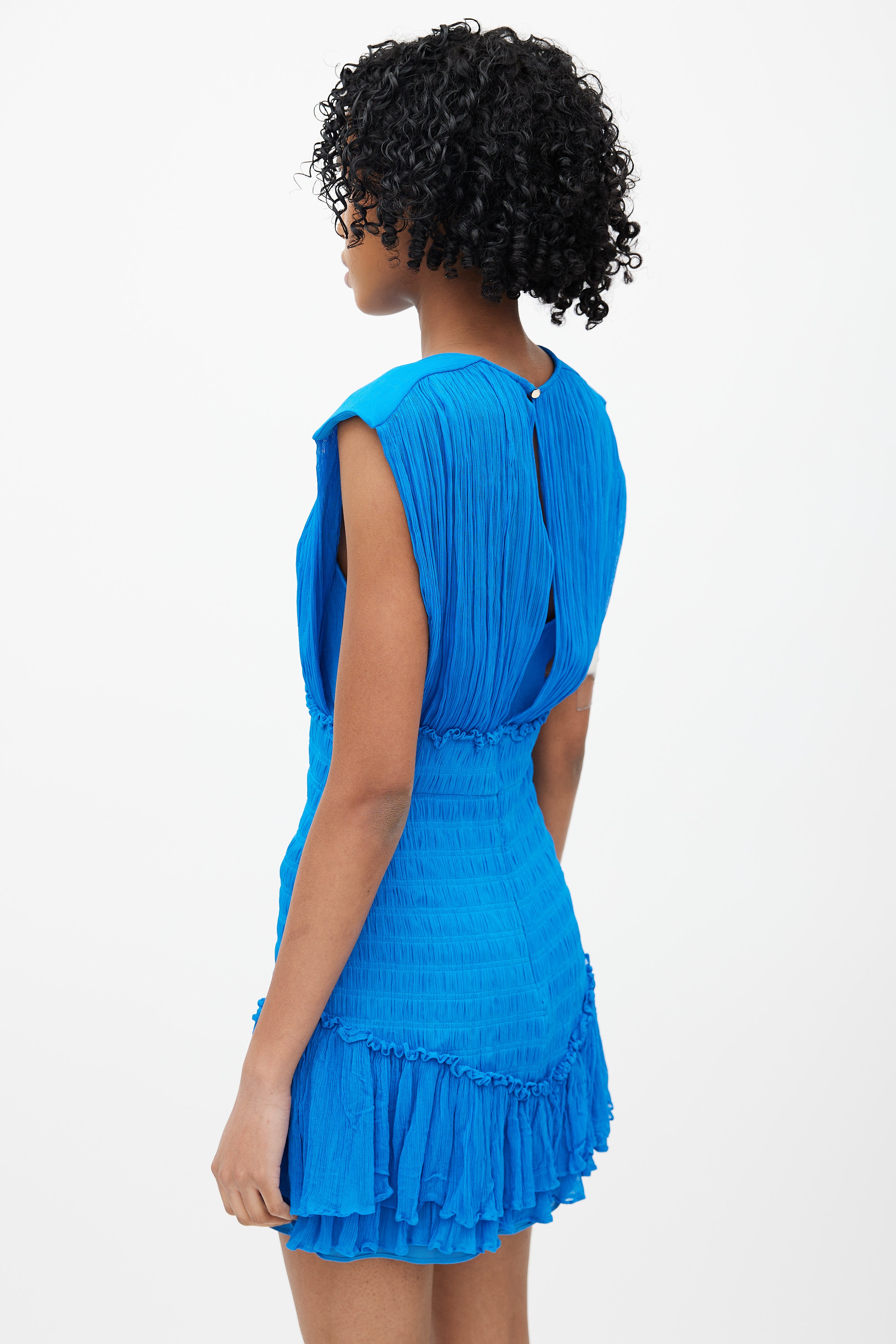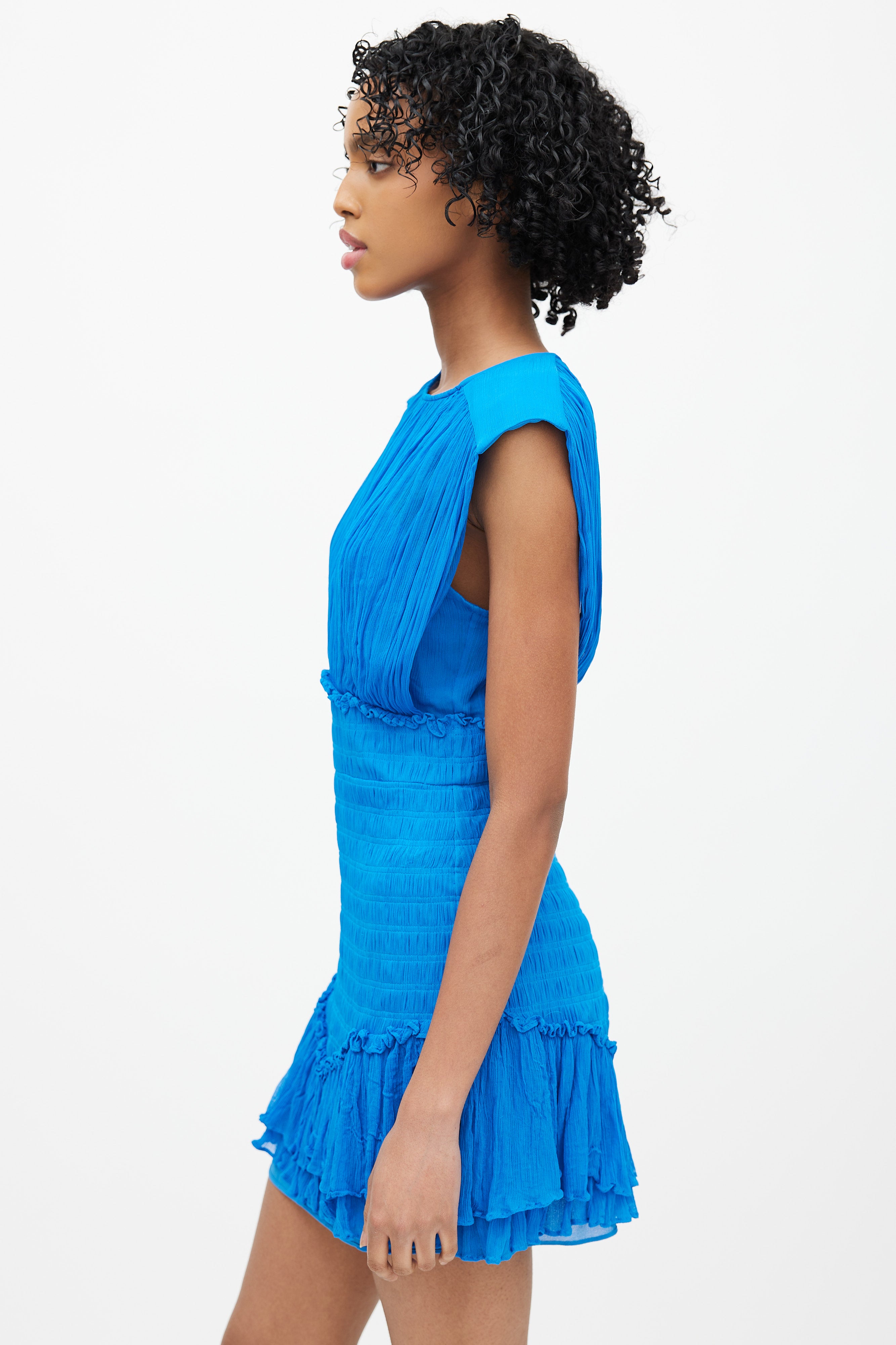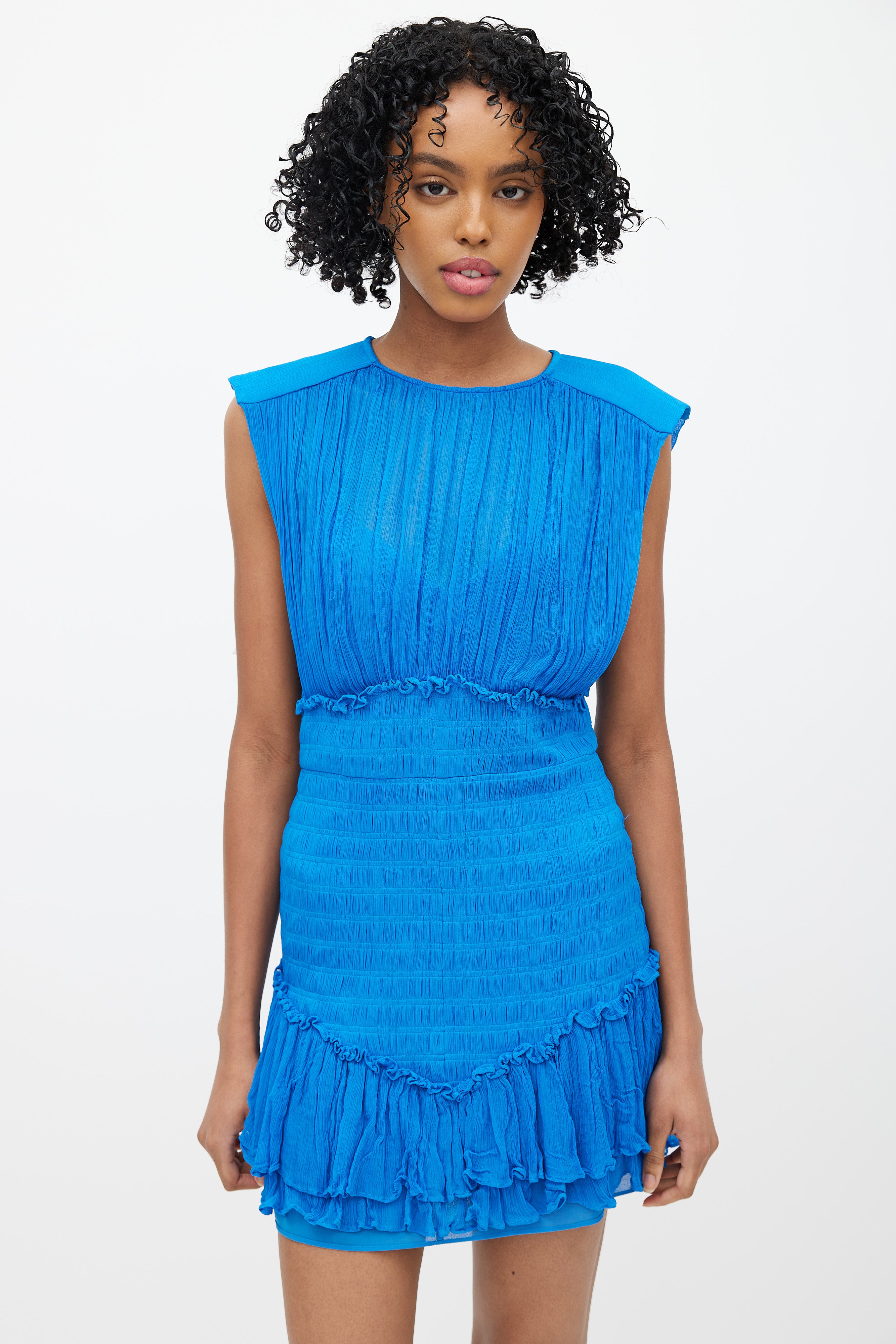 Pre-owned Shona Joy blue dress featuring a round neckline, smocked detailing throughout, sleeveless styling, ruffled hem, and zip at back with hook and eye closure. Lined.