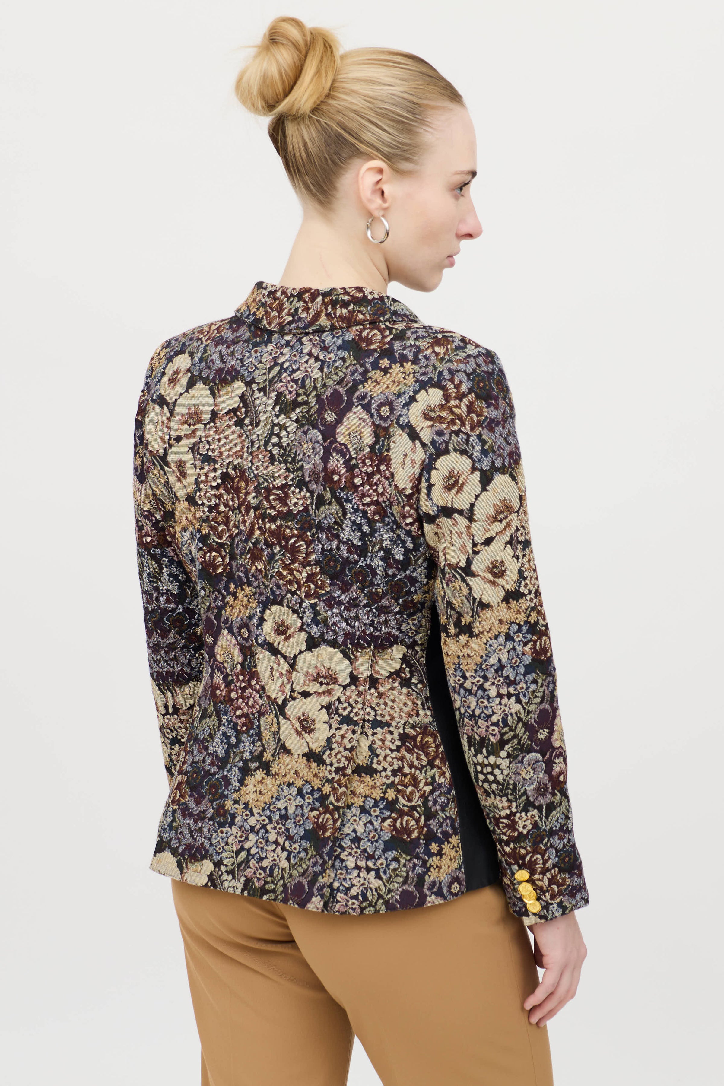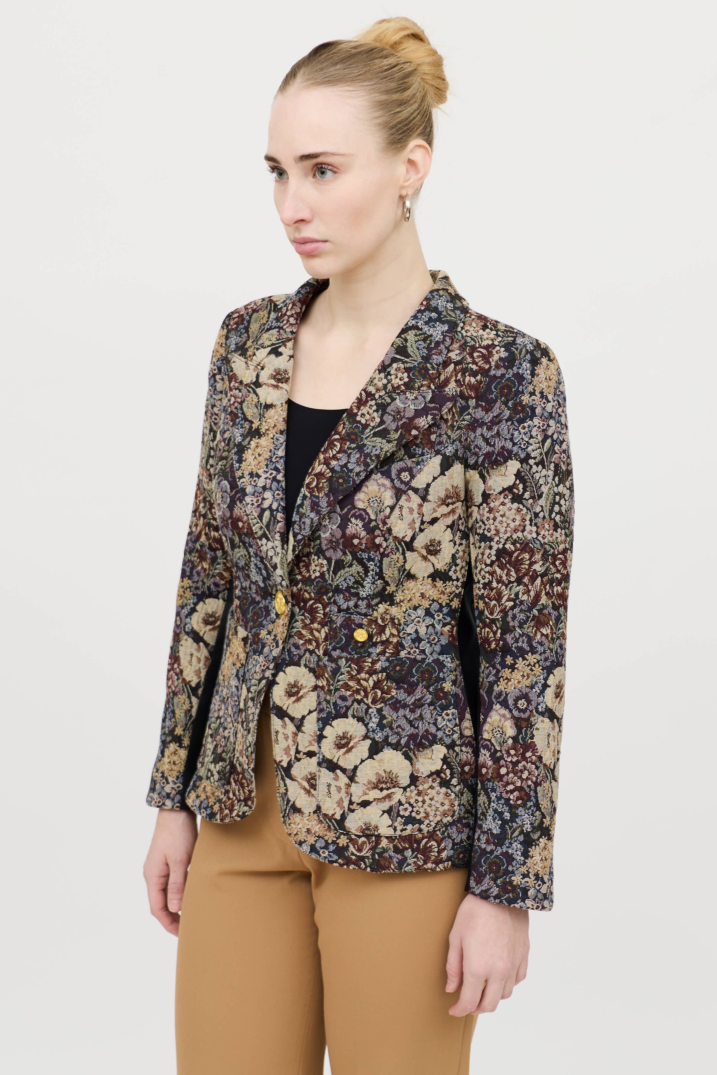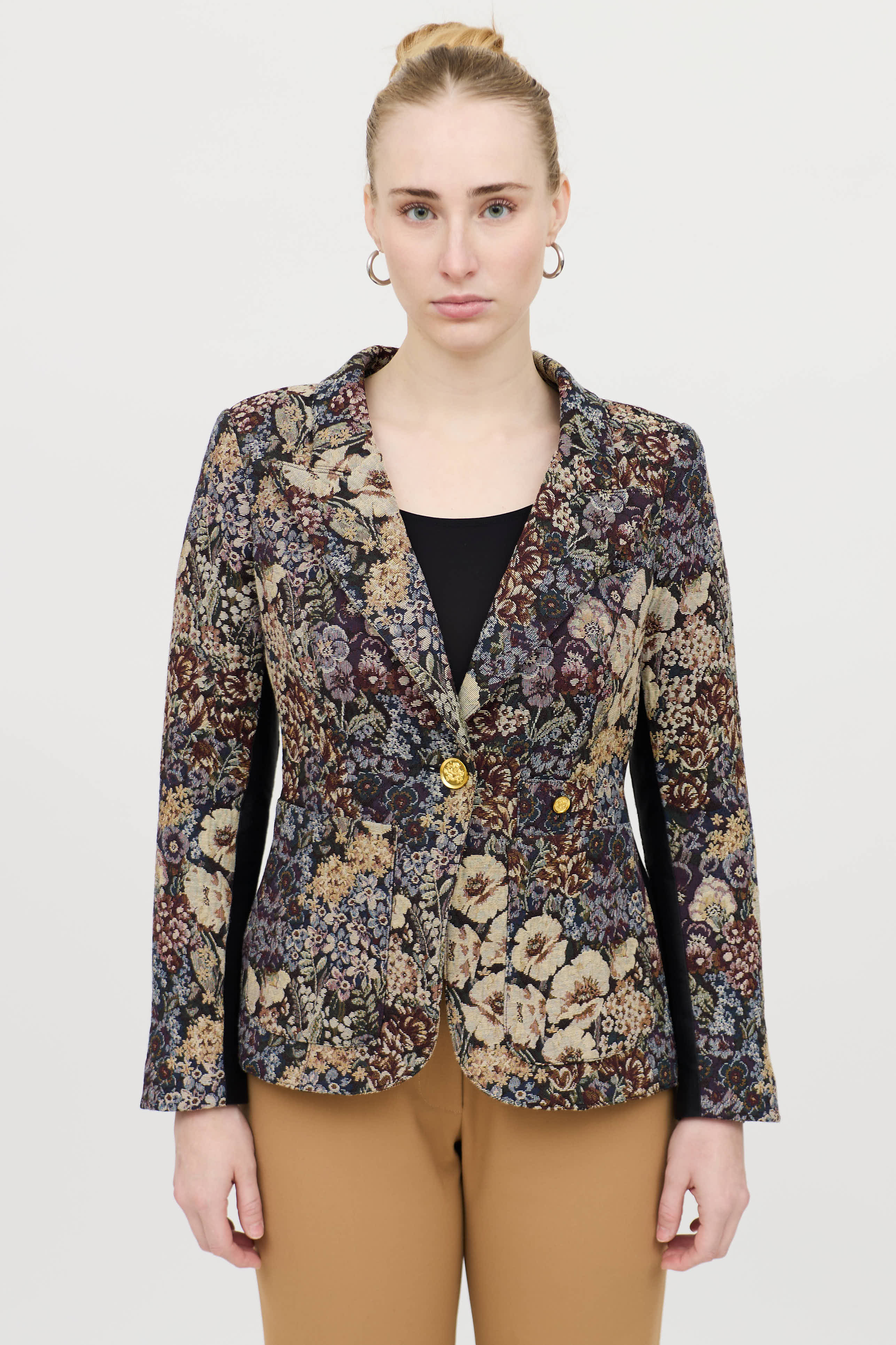 Pre-owned Smythe beige and multicolor blazer featuring floral jacquard pattern, peak lapel collar, shoulder pads, gold tone singular button front, patch pockets at front, buttoned cuffs, panel under arm, and slit at back hemline. Lined.
