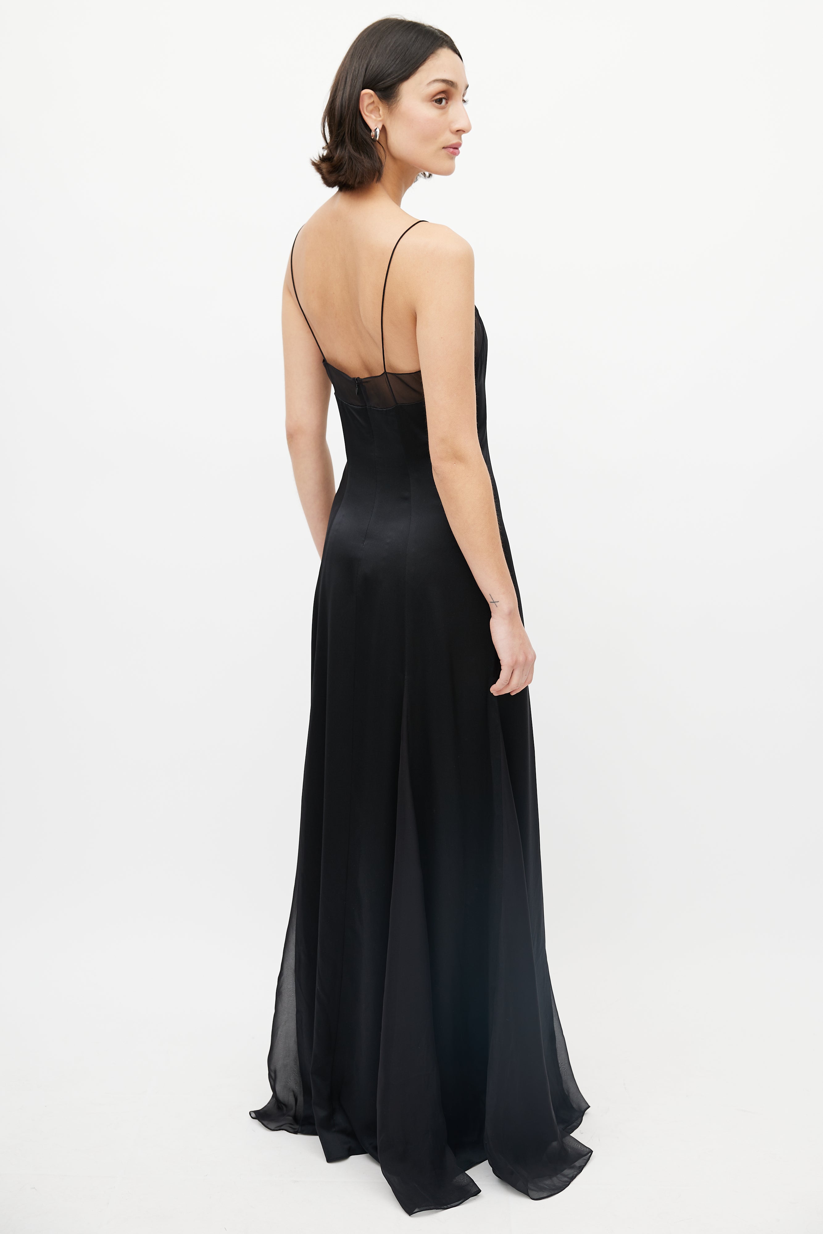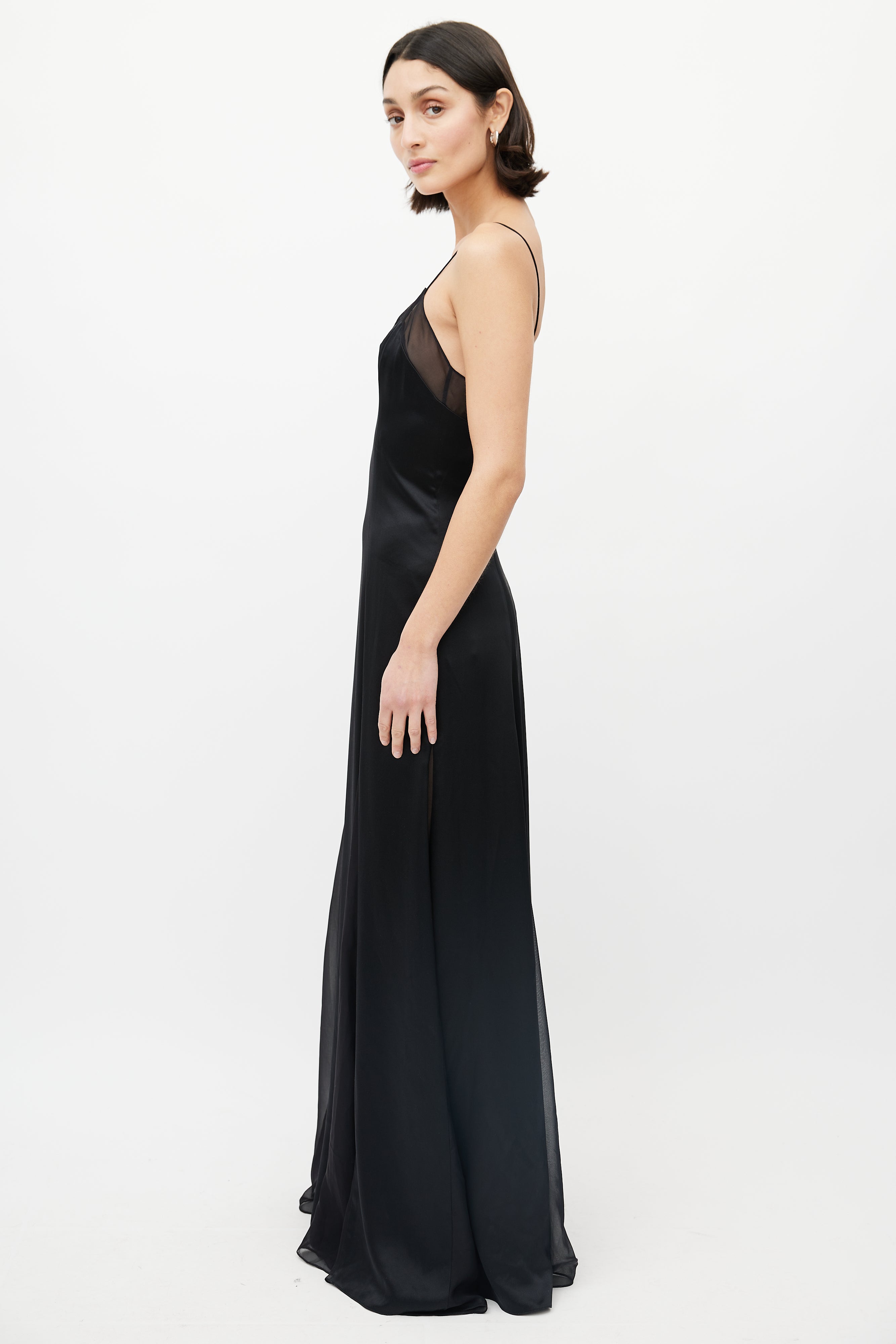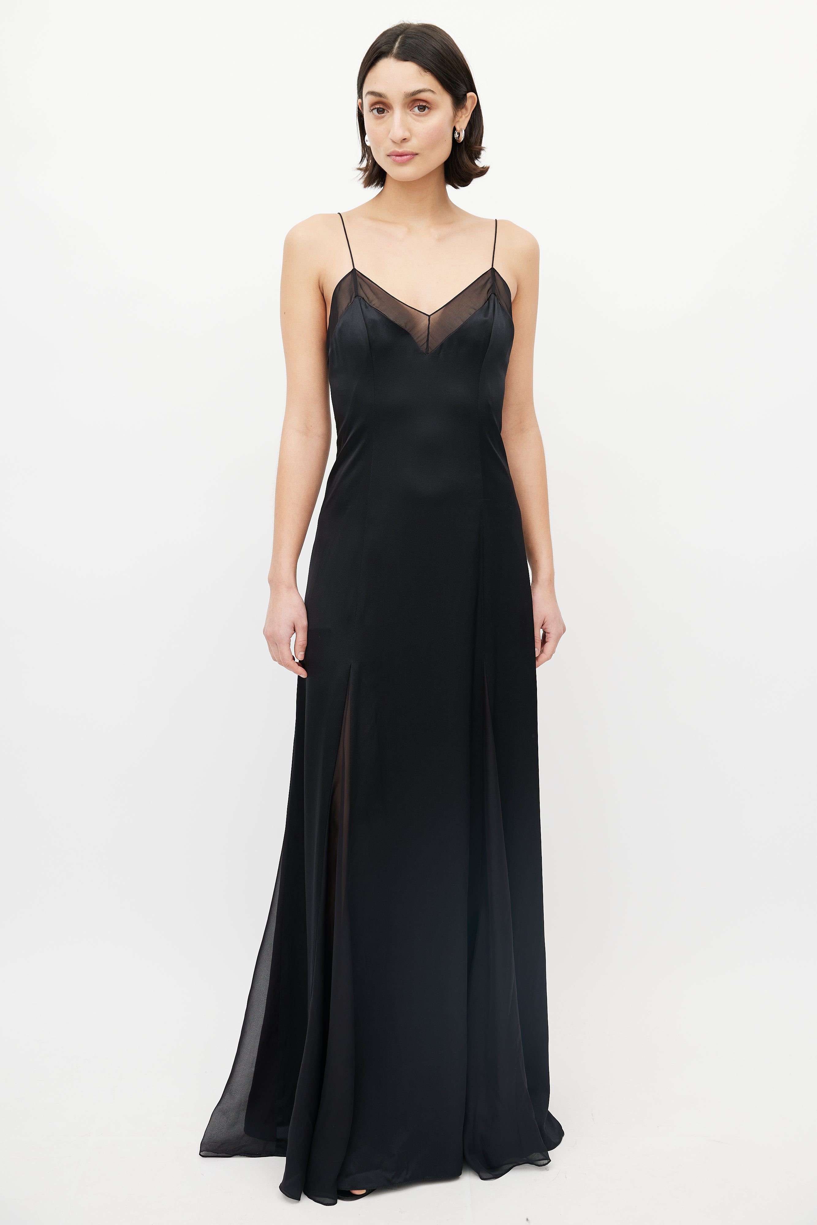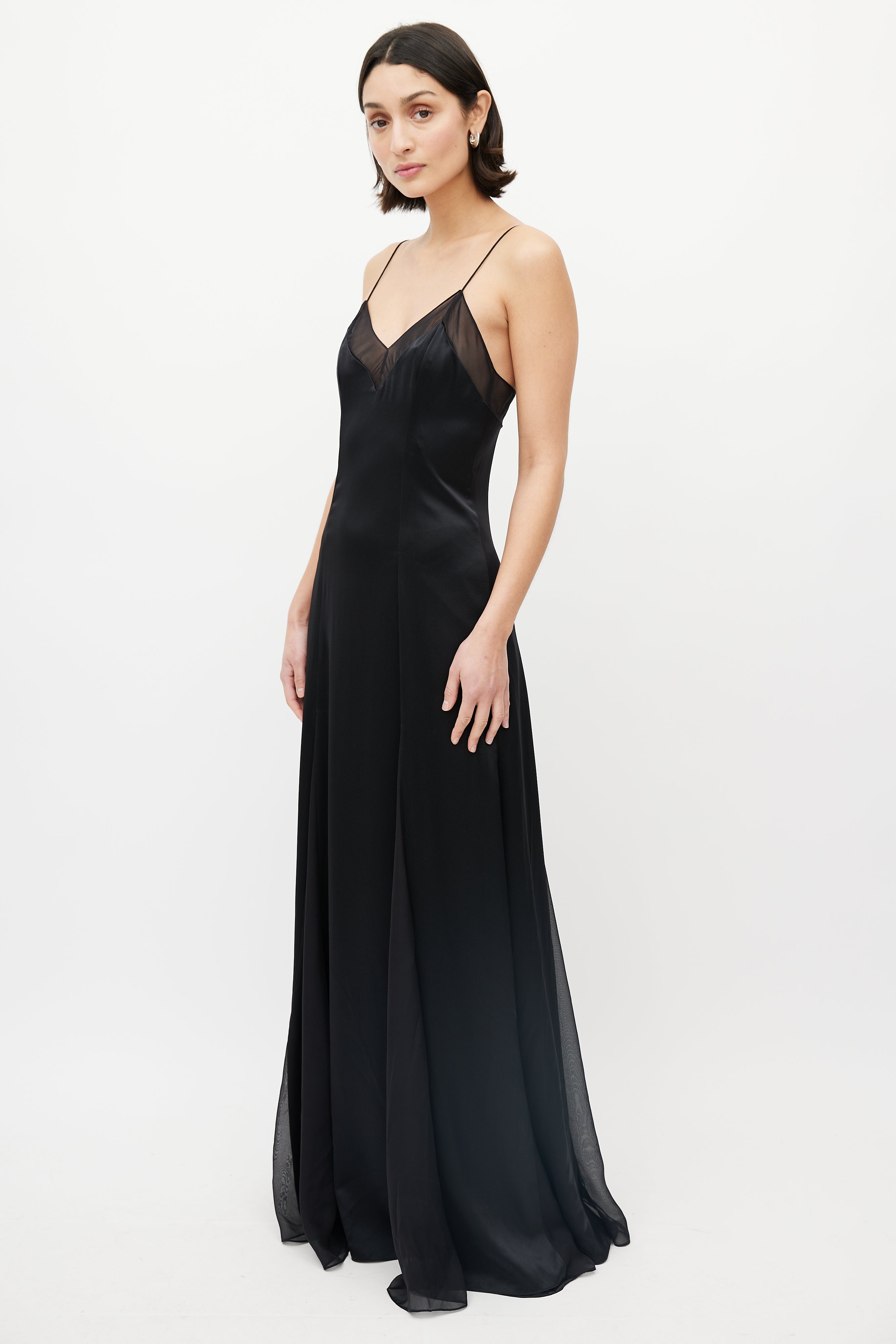 Pre-owned SPRWMN black satin dress featuring a v-neckline, sleeveless styling, mesh panelled inserts throughout, and zip at back with hook and eye closure.
