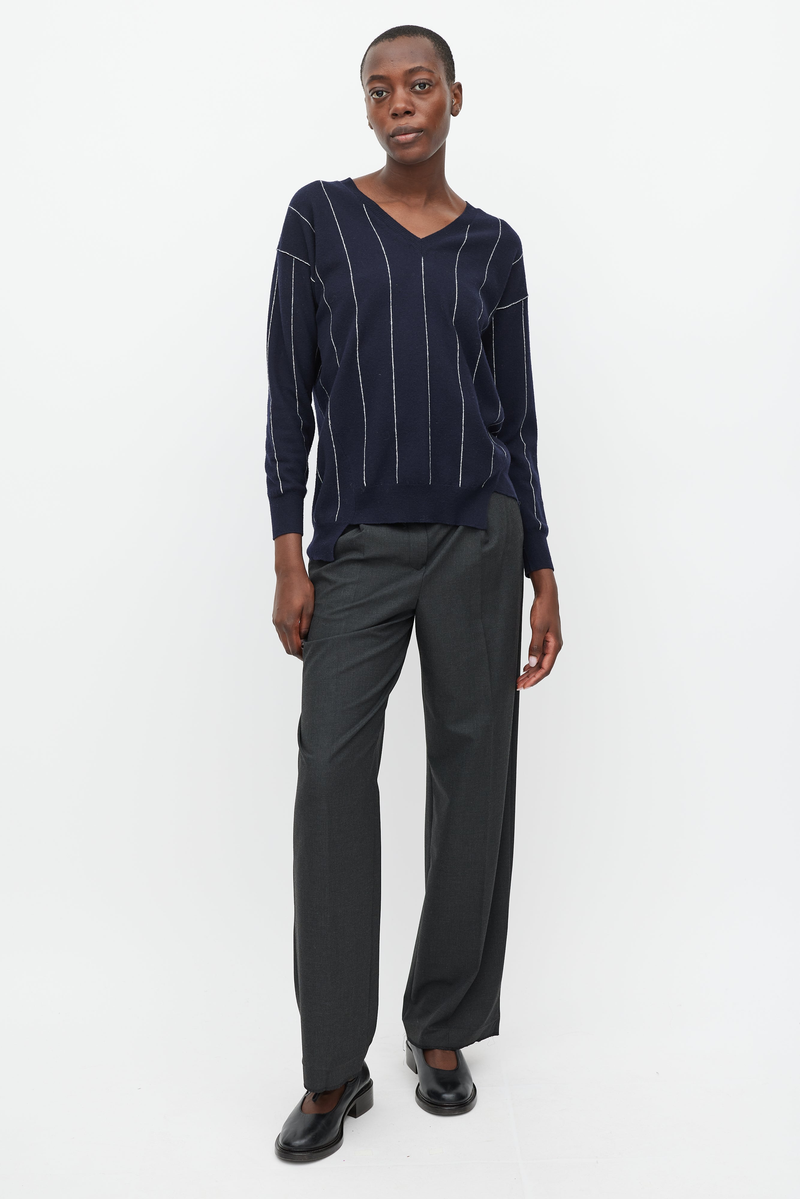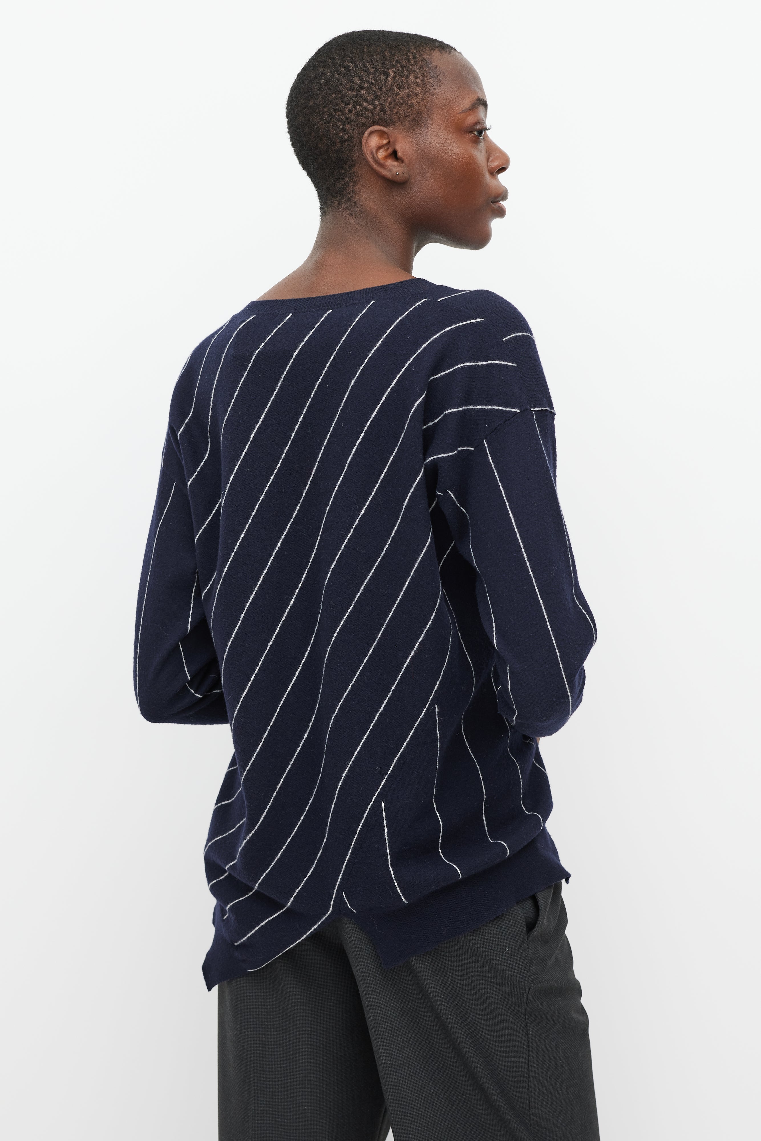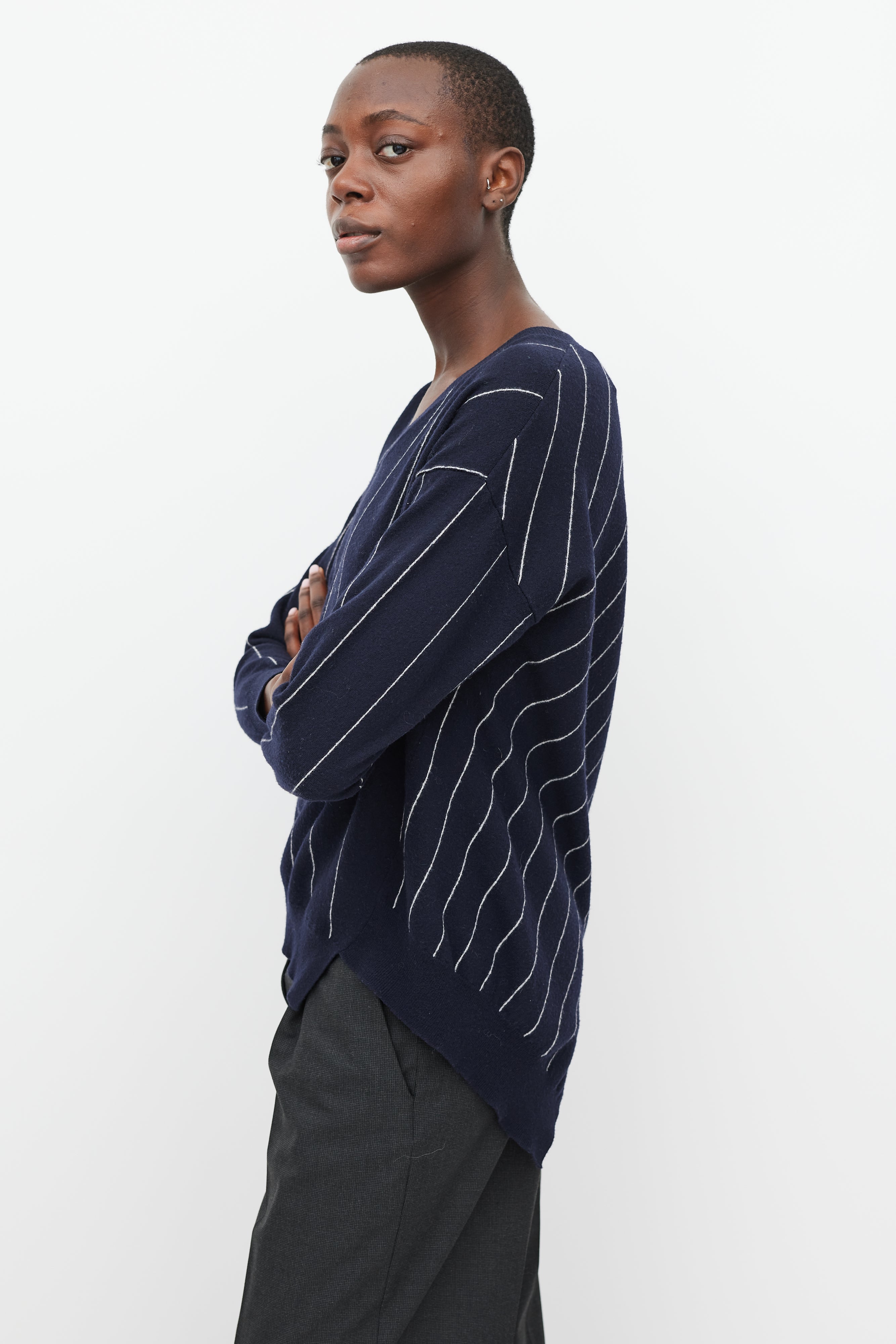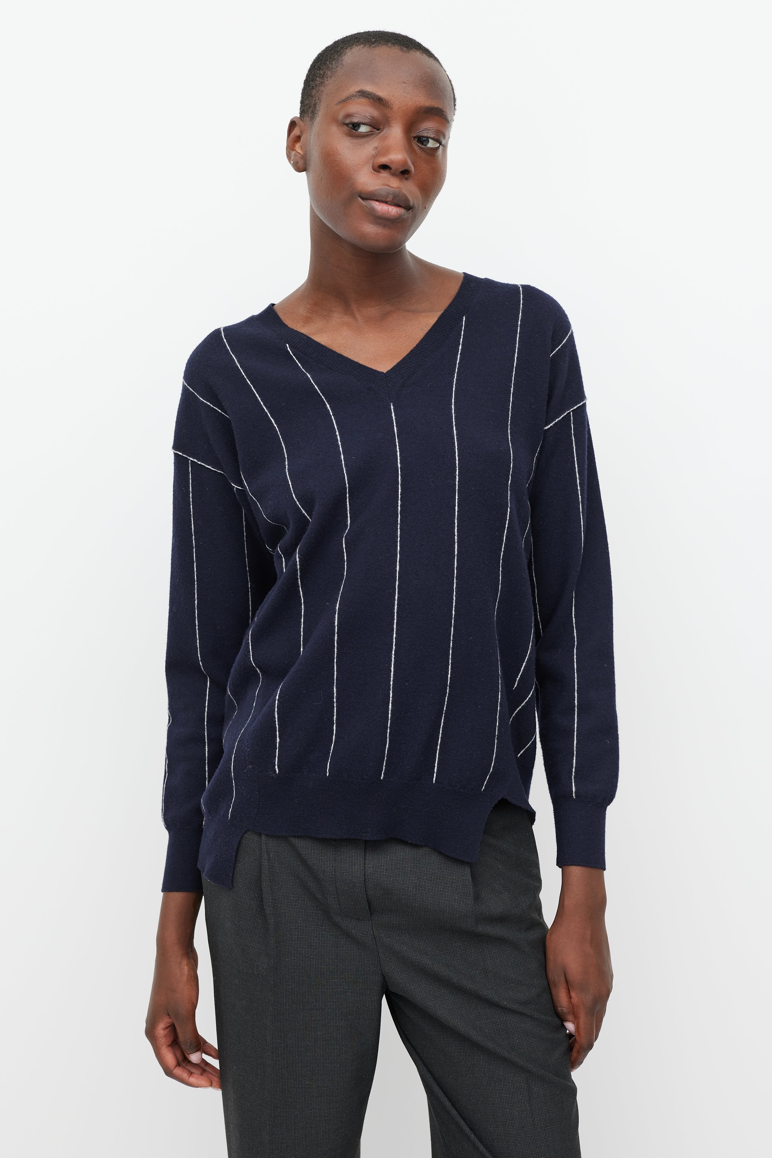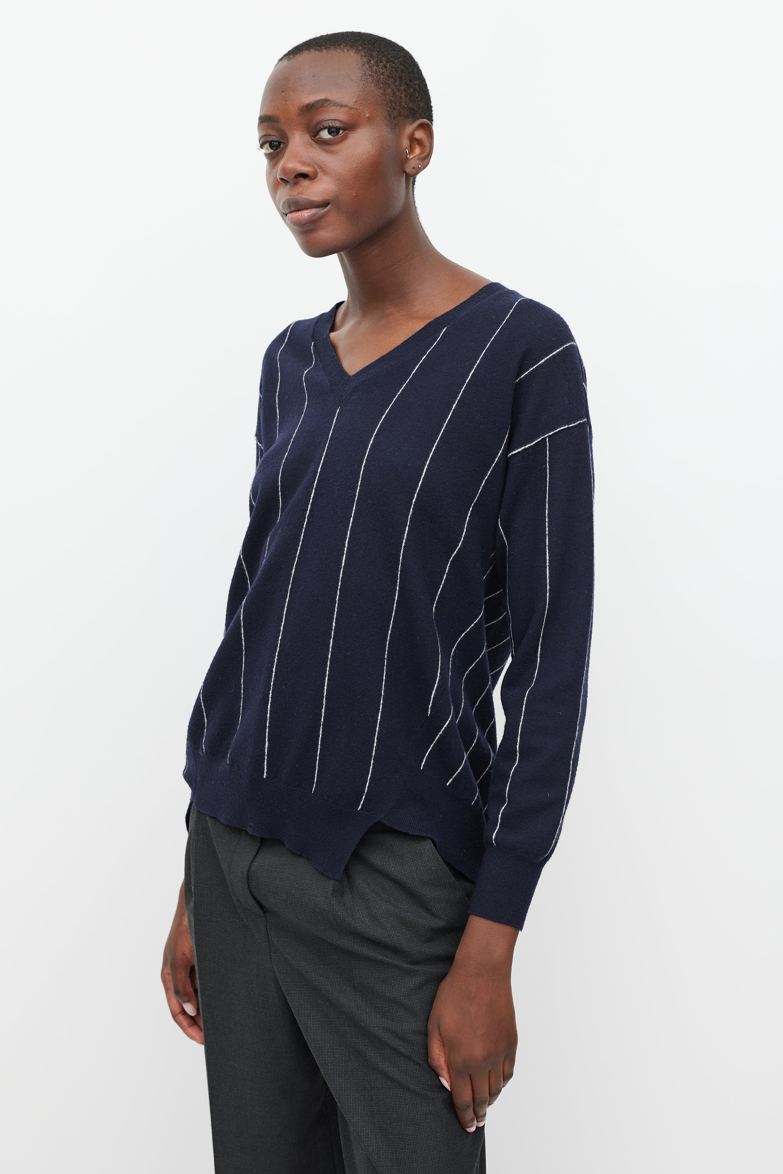 Pre-owned Stella McCartney navy sweater featuring thin white stripes throughout, a V-neckline, long sleeves with a ribbed cuff, and an asymmetric ribbed hemline.