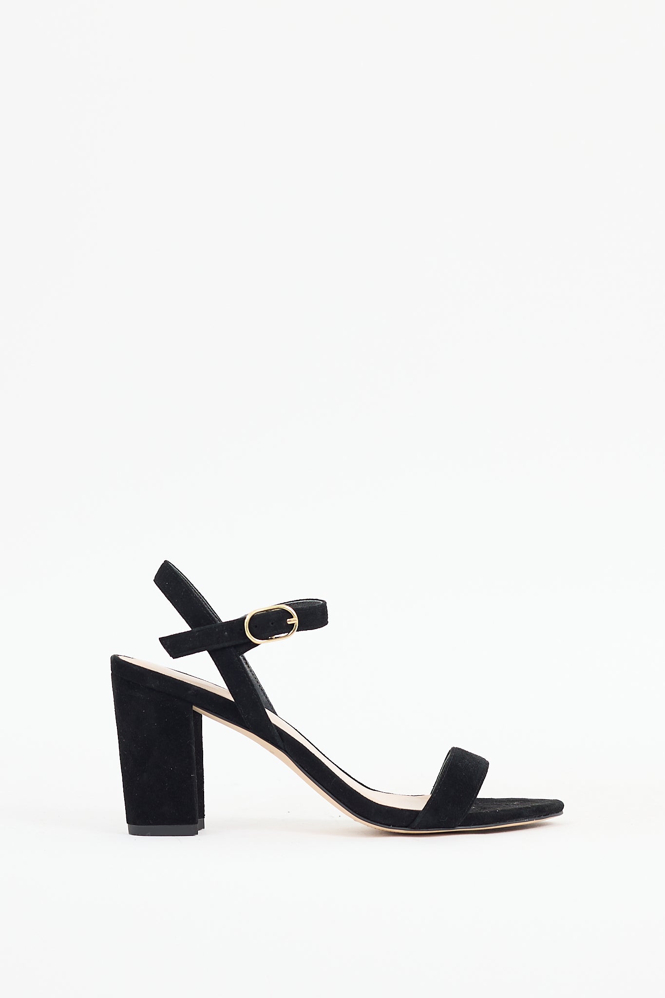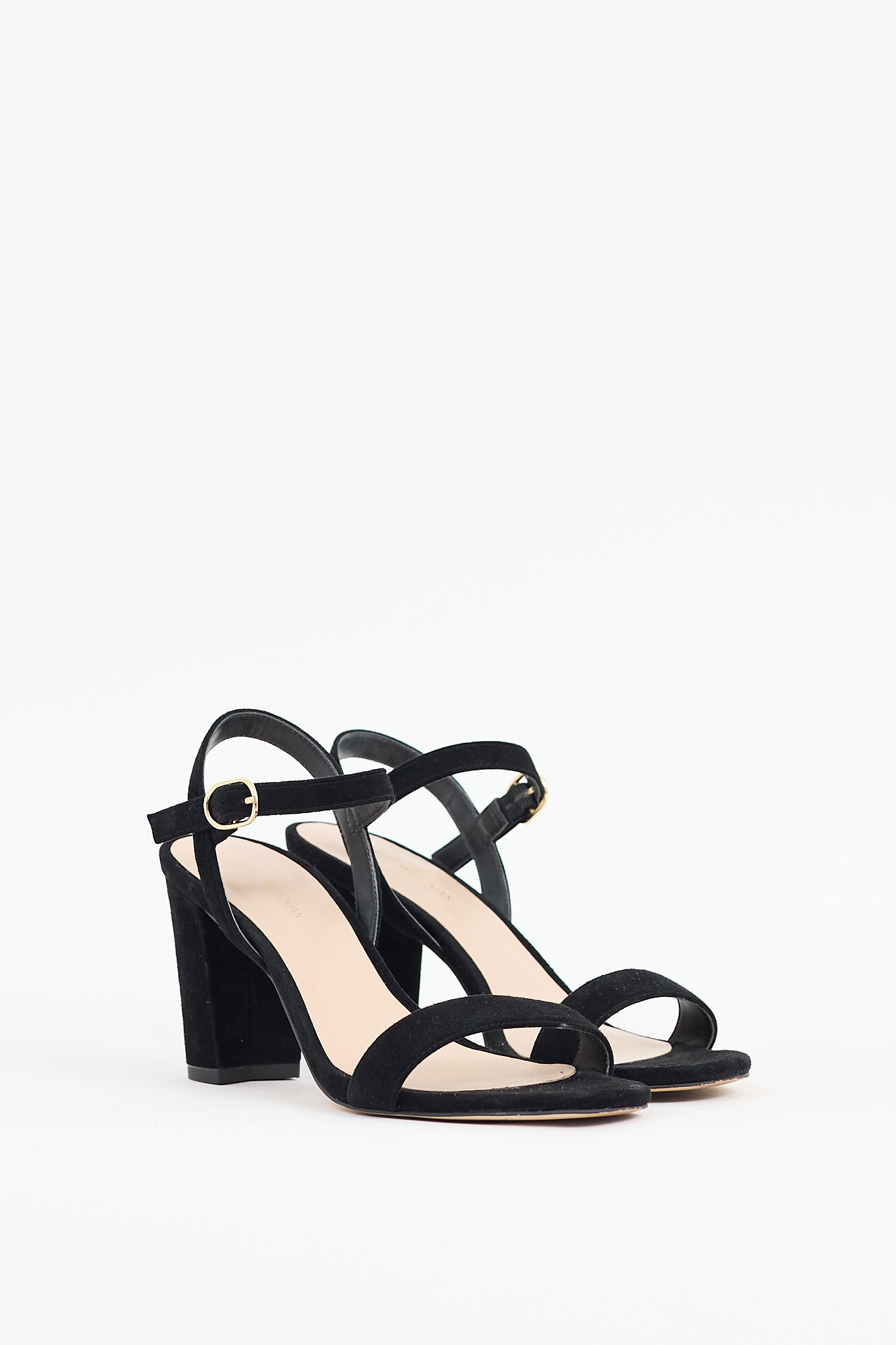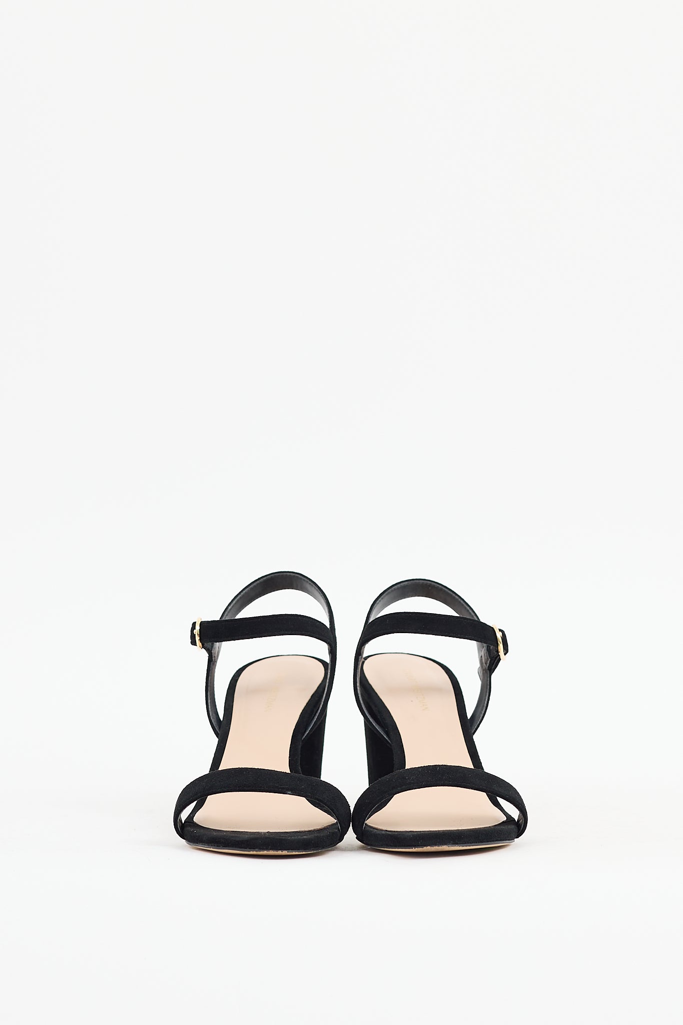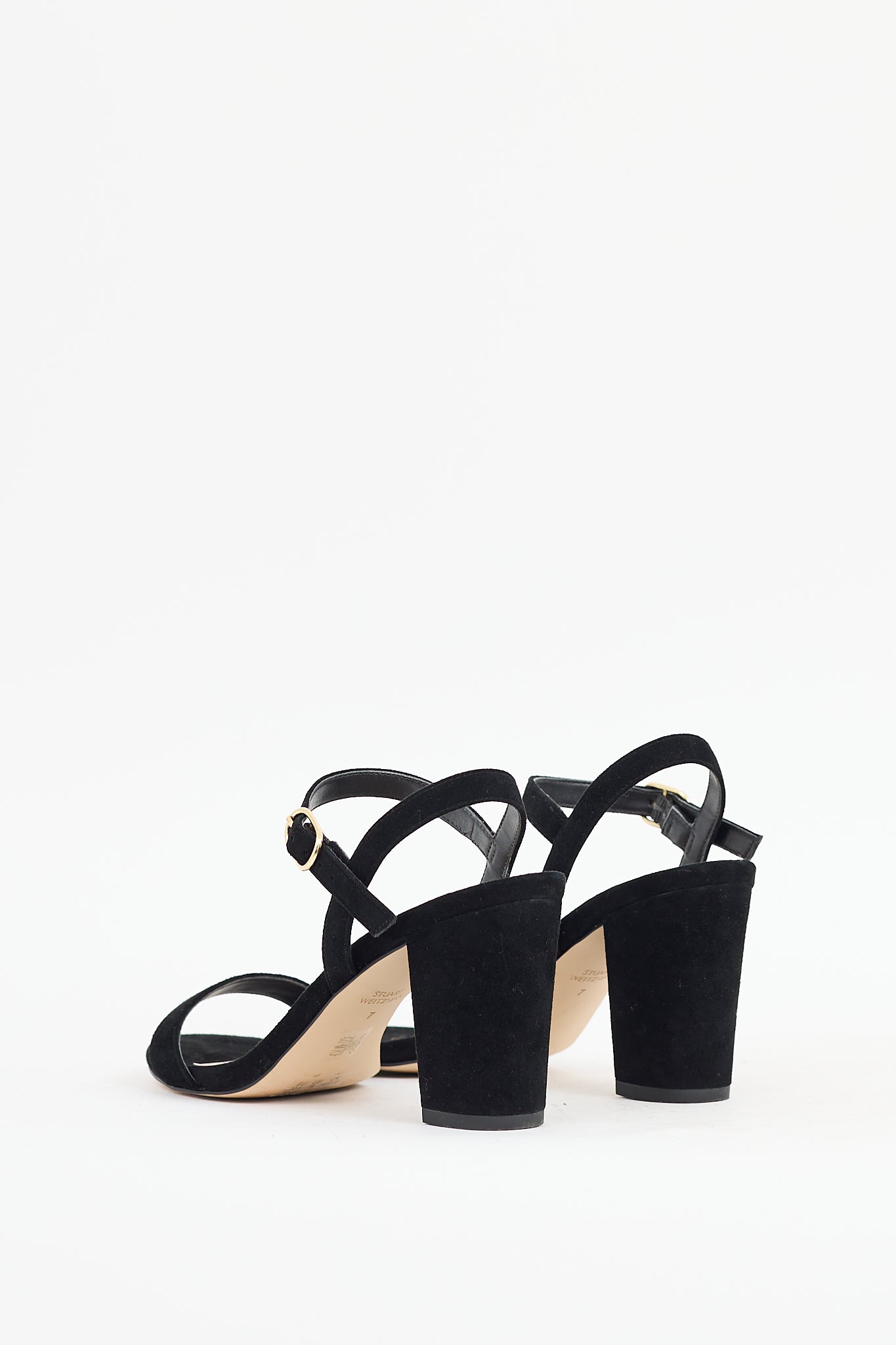 Pre-owned Stuart Weitzman black Tibby suede sandals featuring an open round toe, strap at vamp, wrapped block heel, and adjustable strap at ankle. Comes with original dust bag.