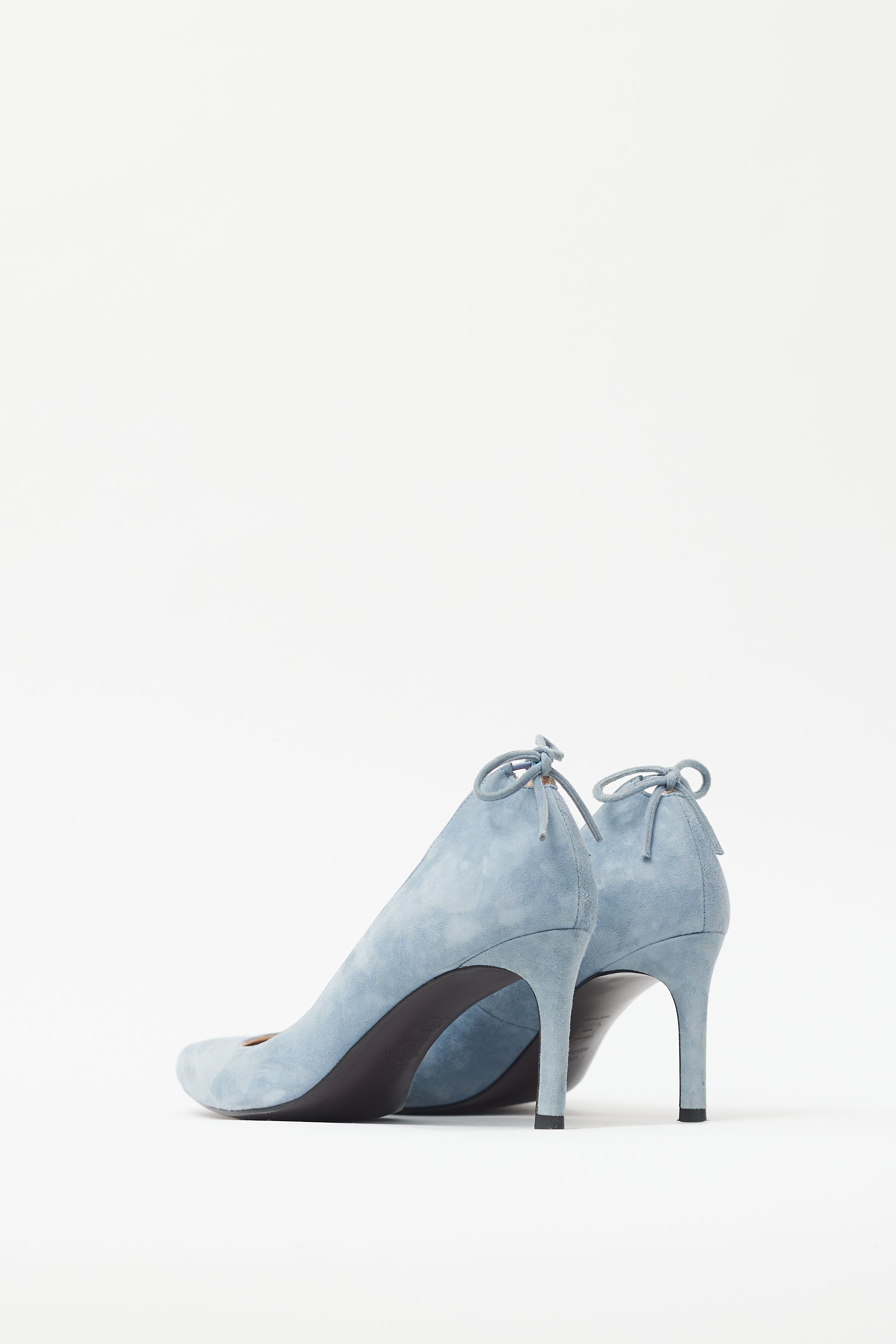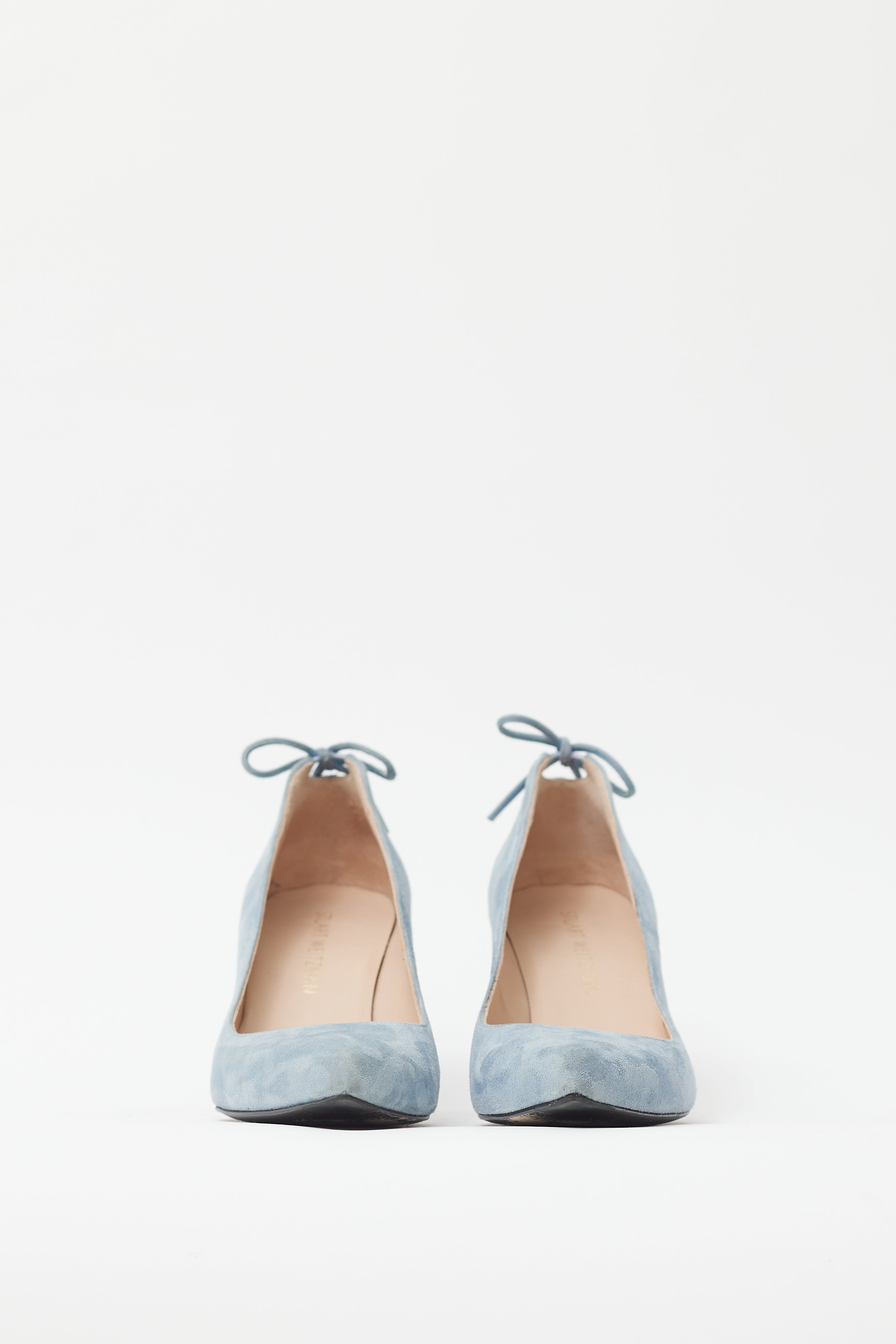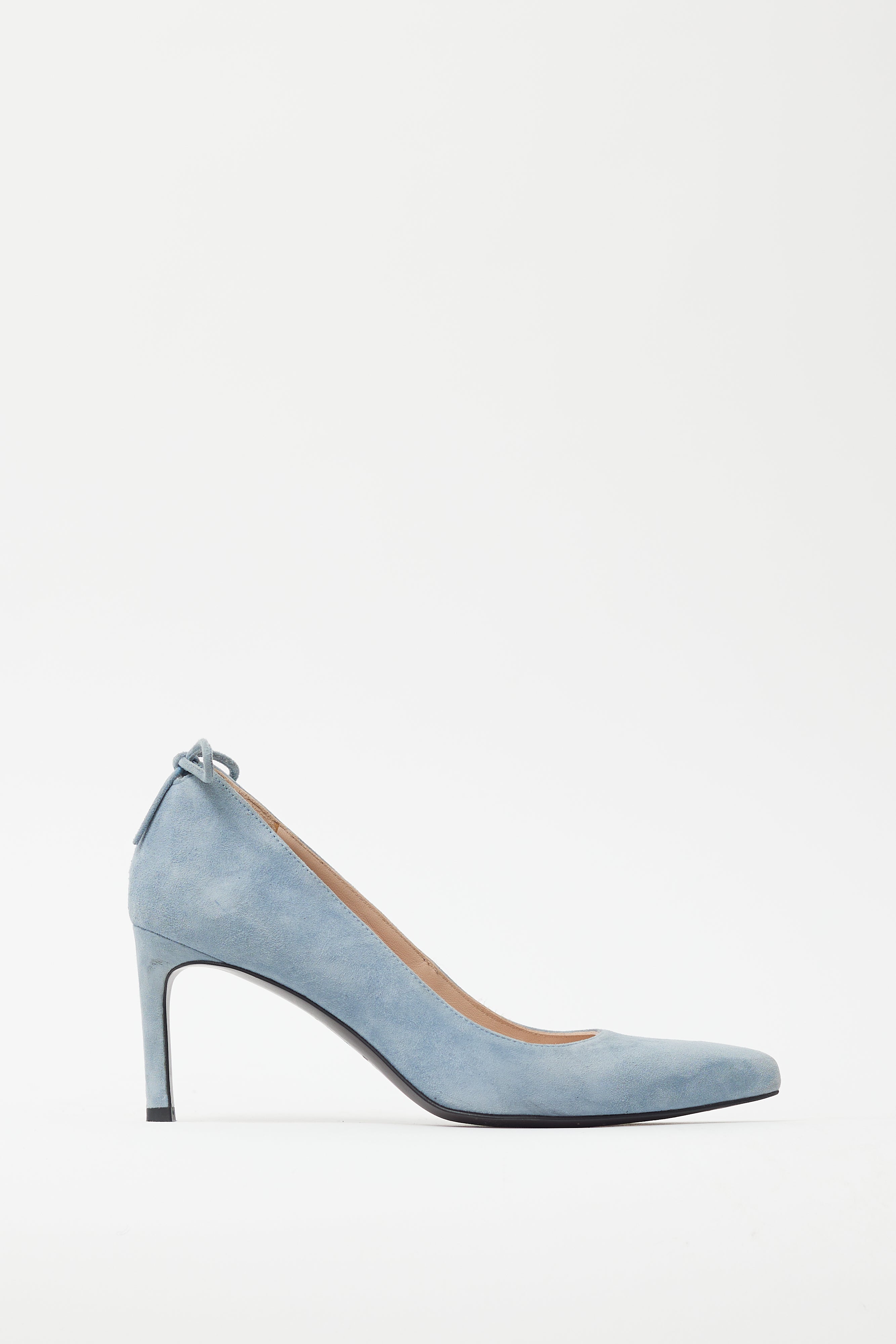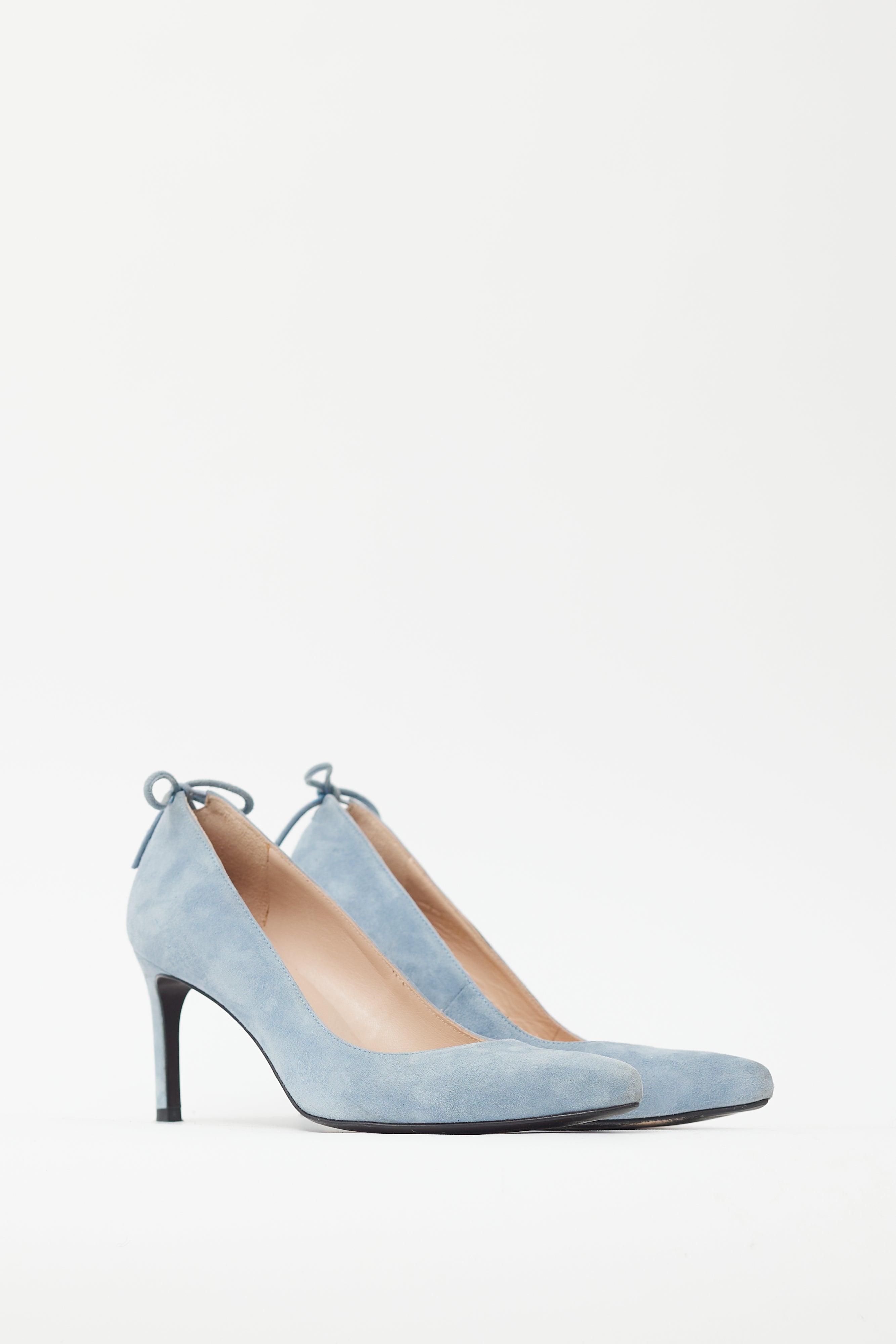 Pre-owned Stuart Weitzman blue suede pumps featuring a pointed toe, self tie bow detail at counter, covered stiletto heel, and leather insole. Comes with original dust bag.