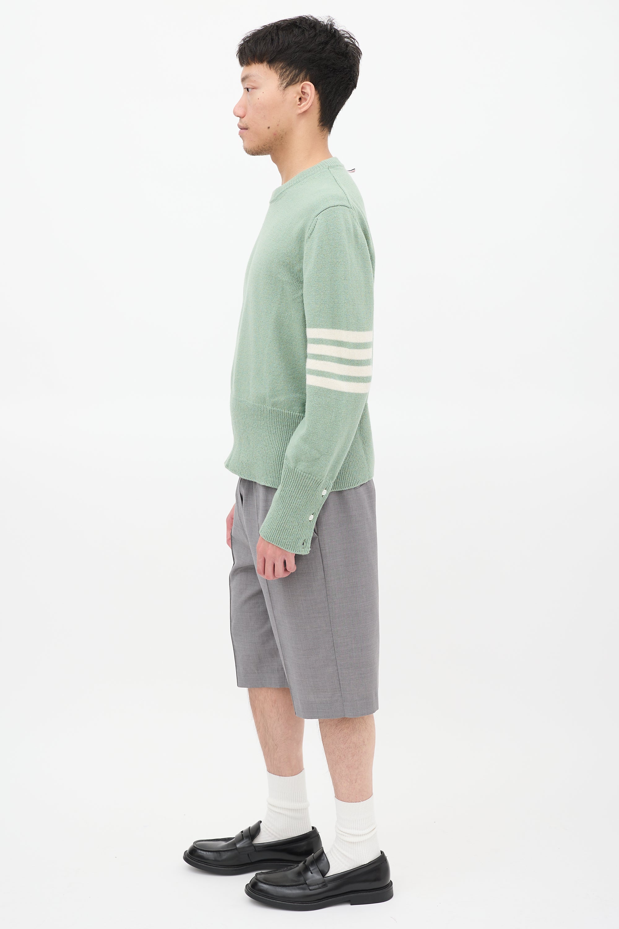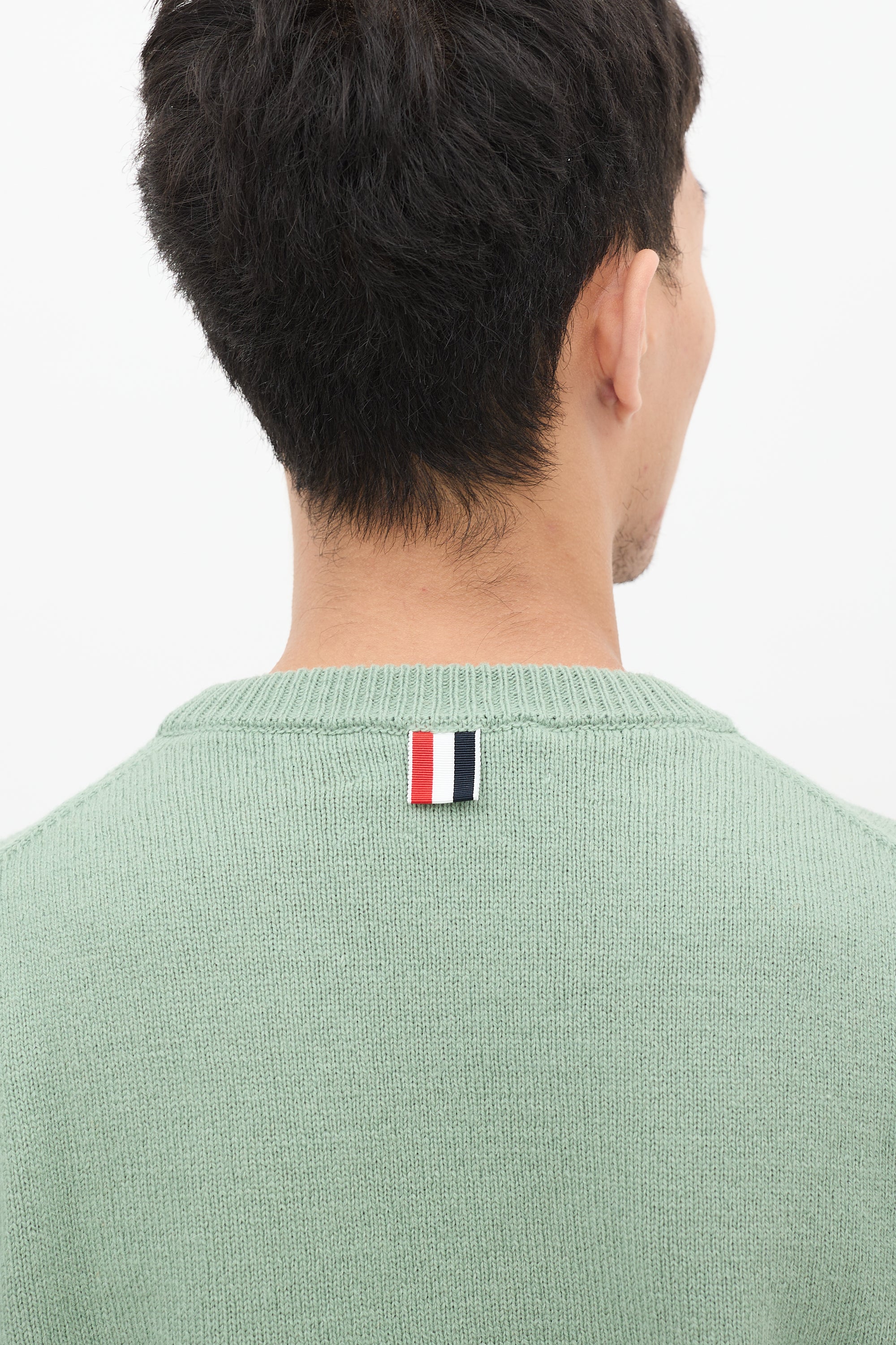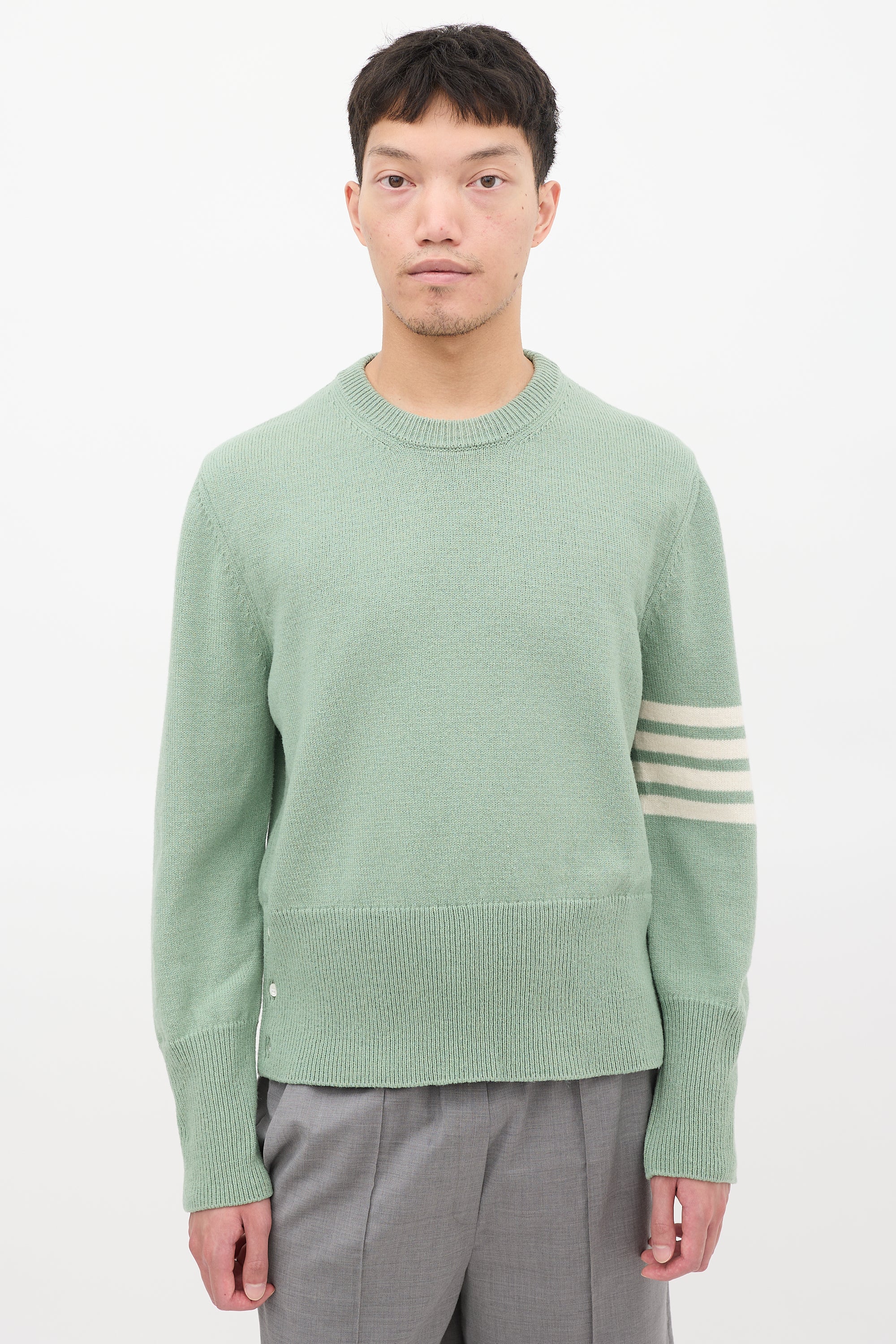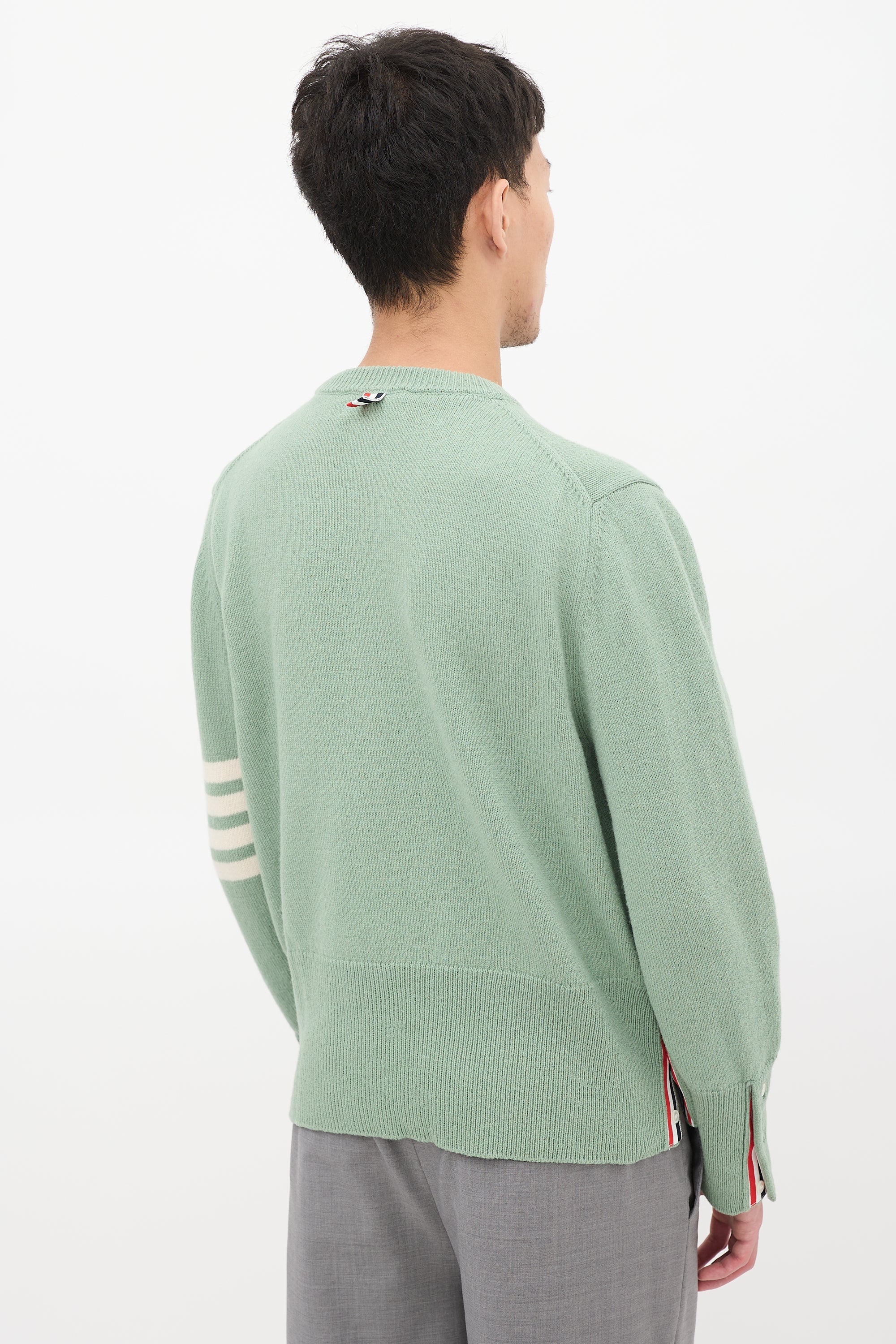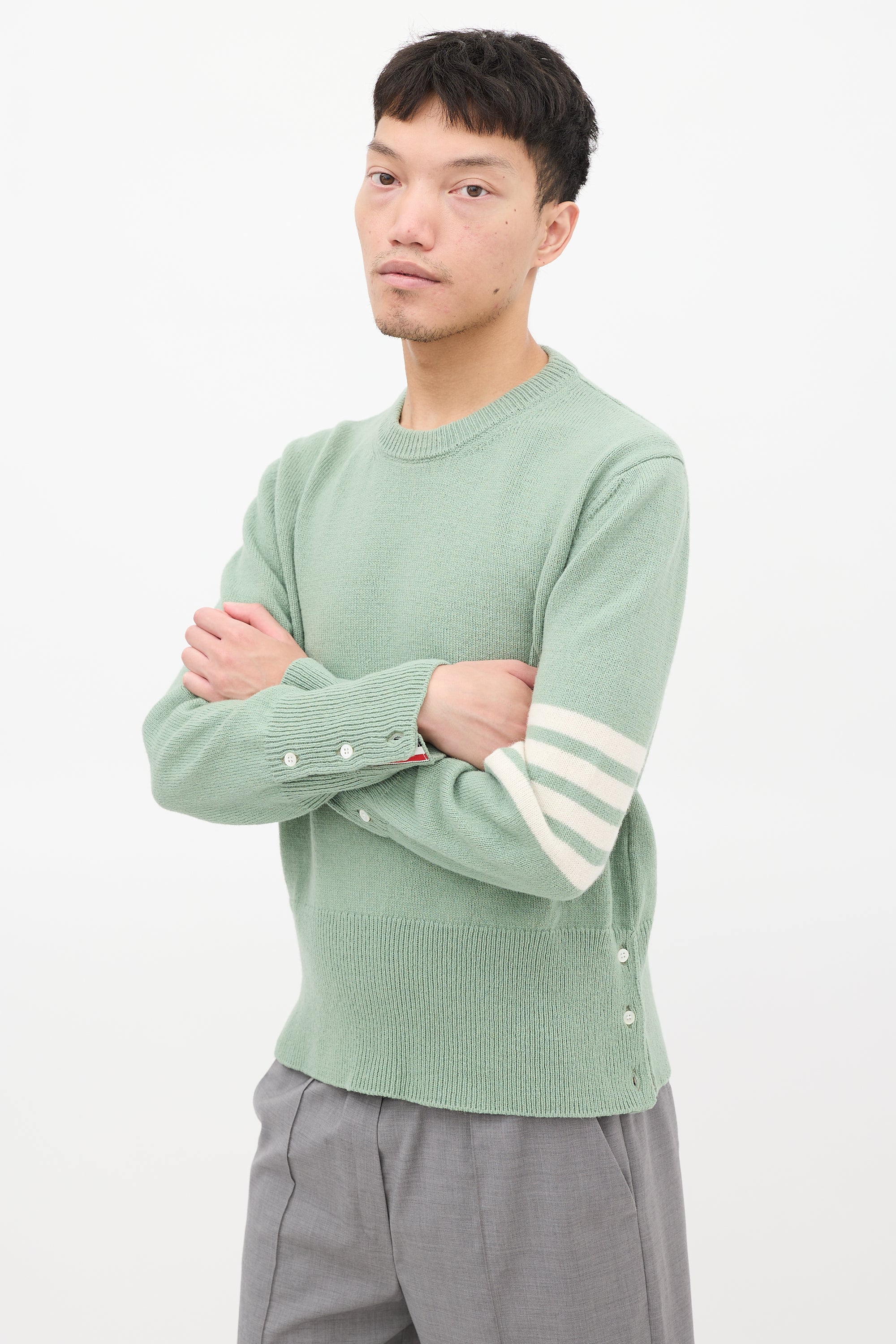 Pre-owned Thom Browne light green wool sweater featuring a round neck, signature tricolour grosgrain ribbon detail at back neck, button up sides, long sleeves, four white bar detail at left arm, and ribbing at neck, hem, and cuffs.