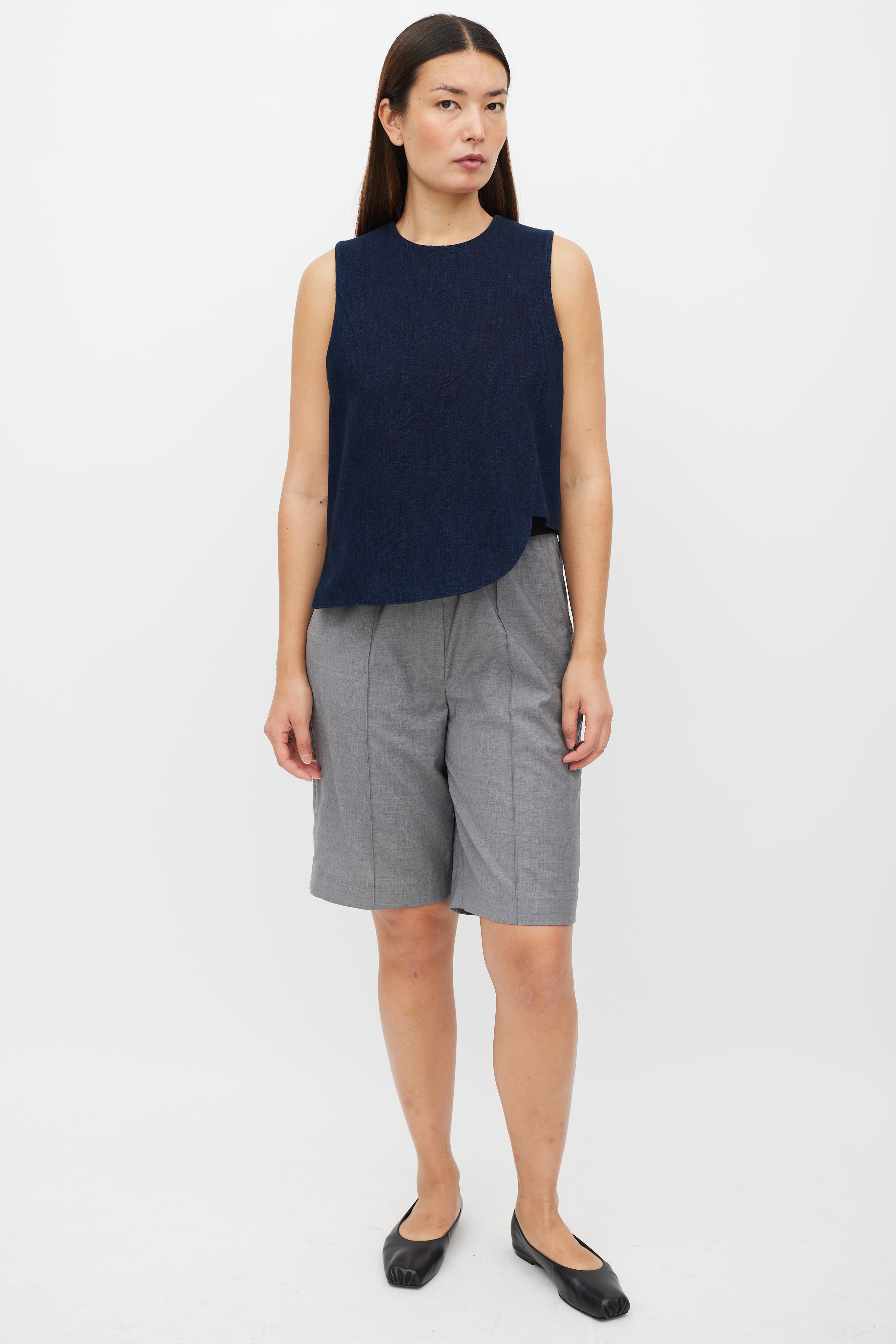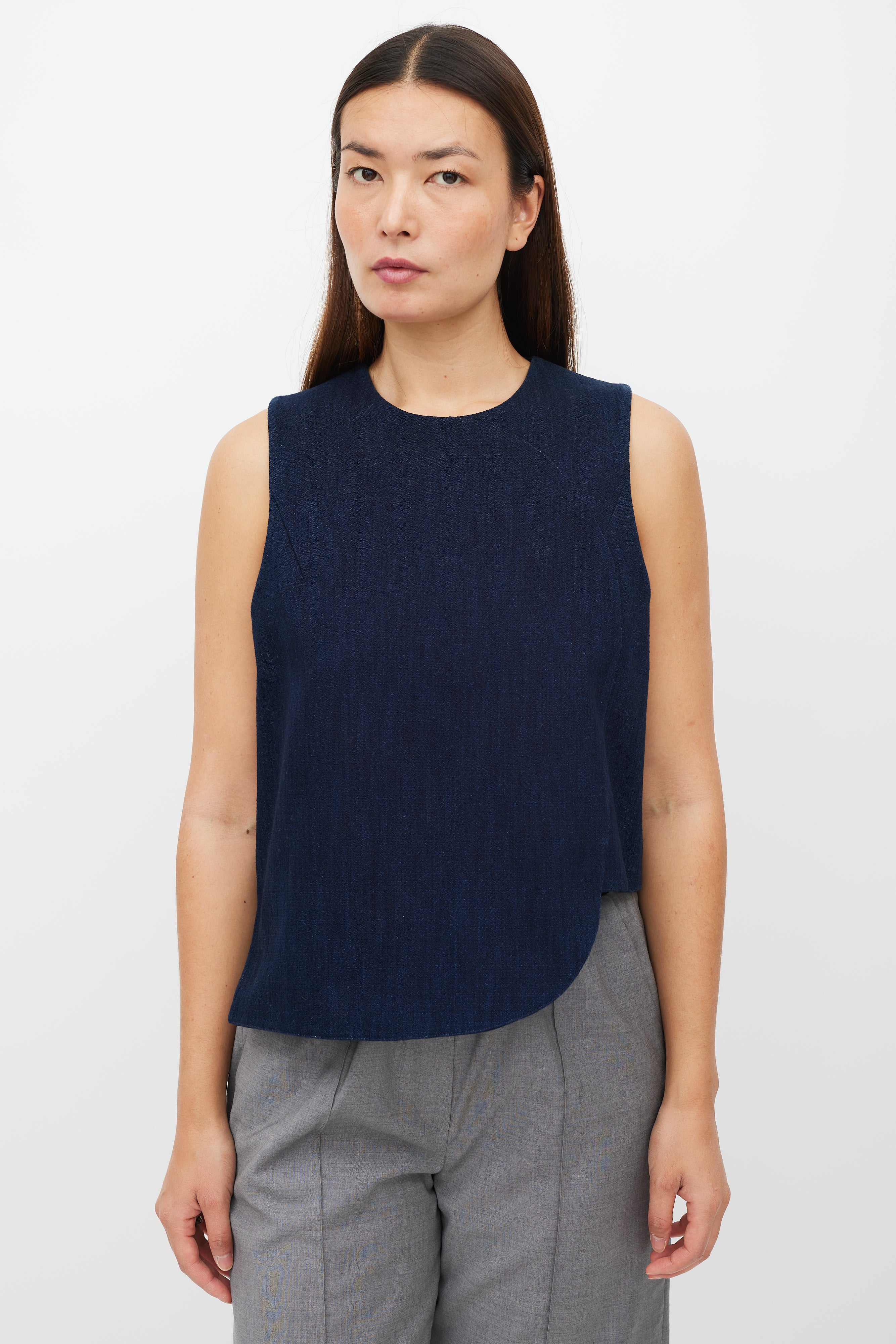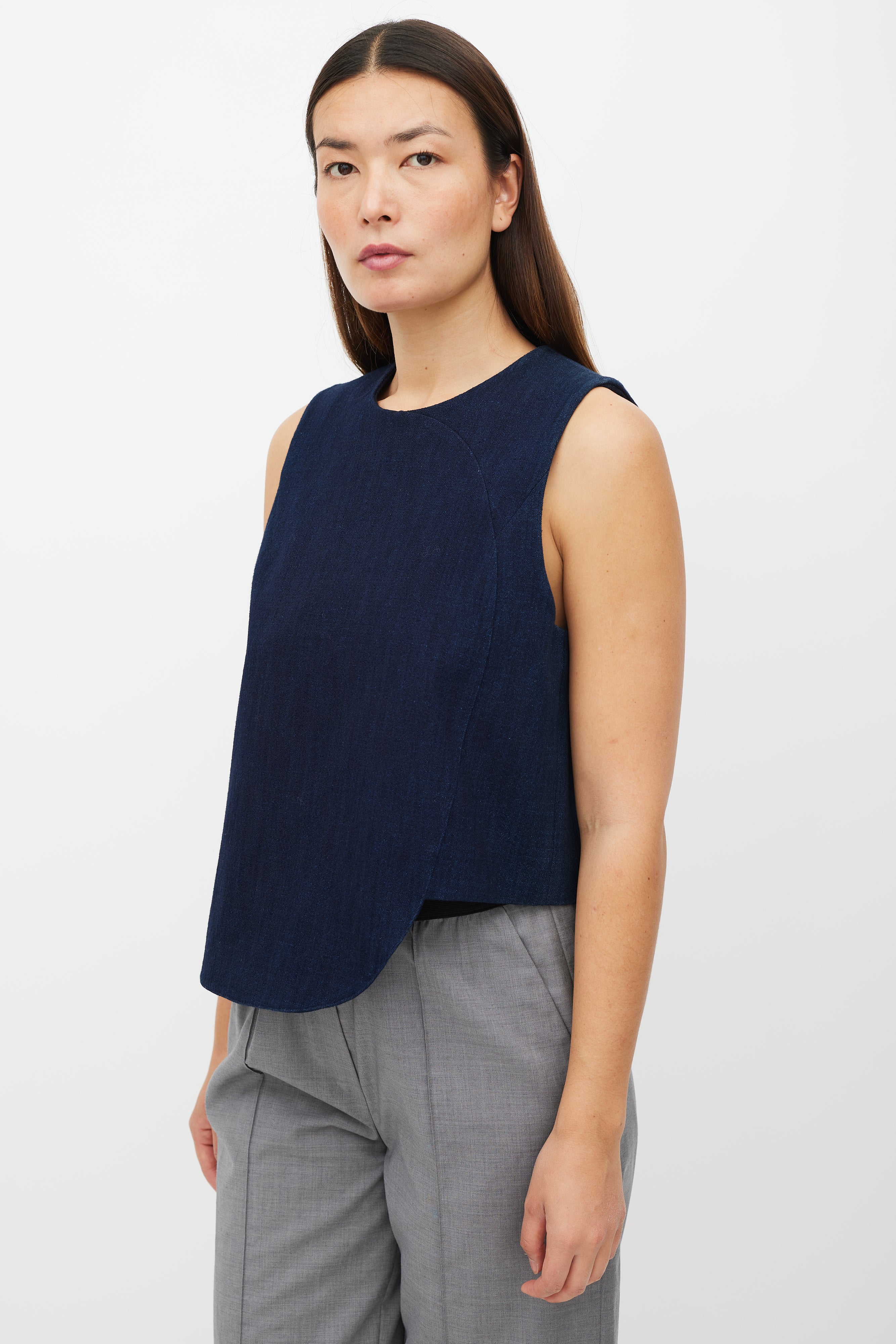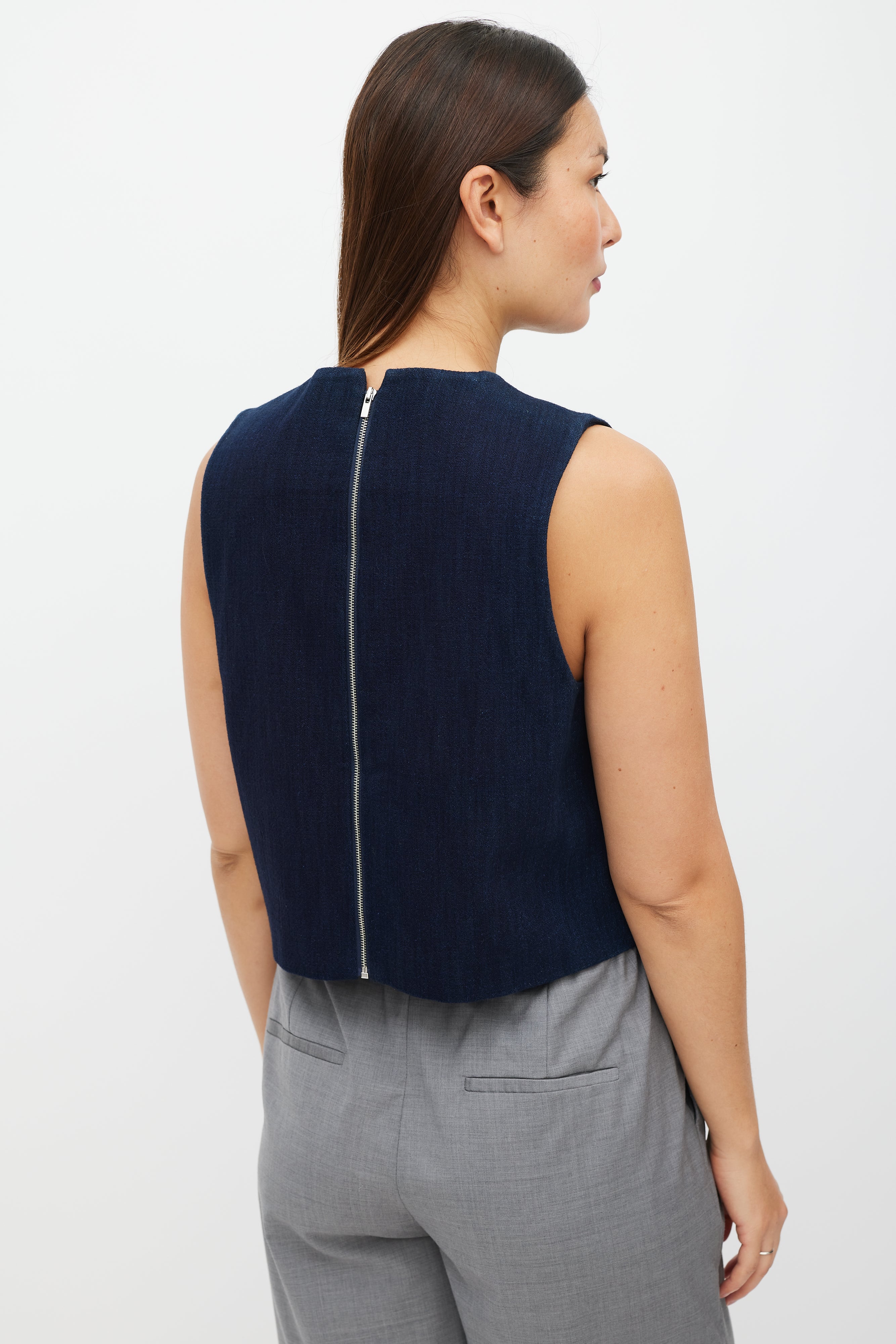 Pre-owned Tibi navy denim vest featuring a round neckline, sleeveless styling, asymmetrical hem, and zip closure at back. Lined.
