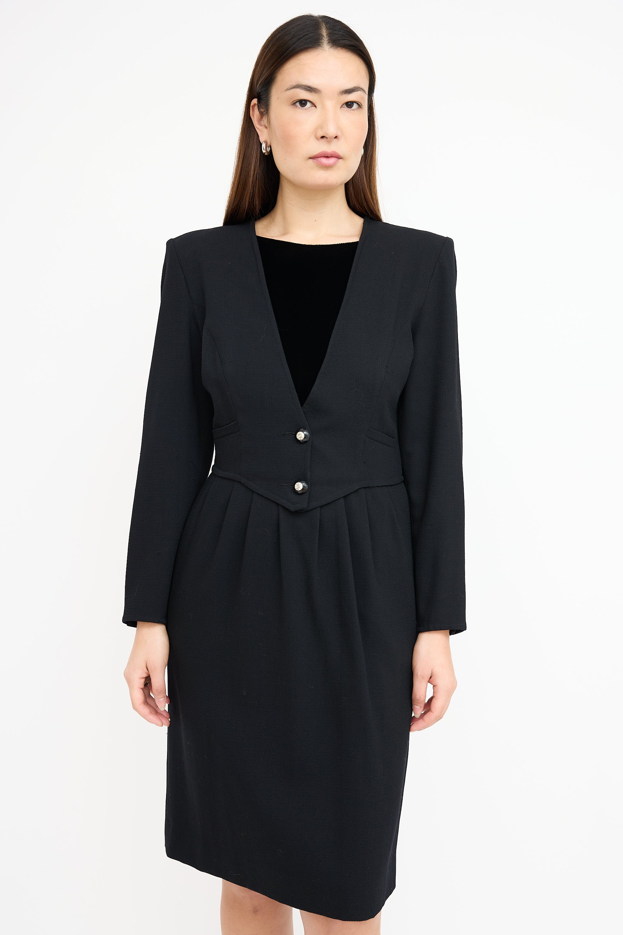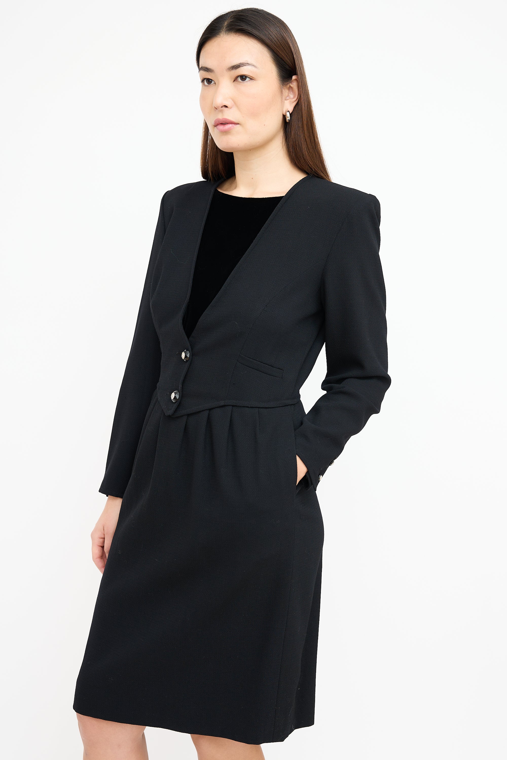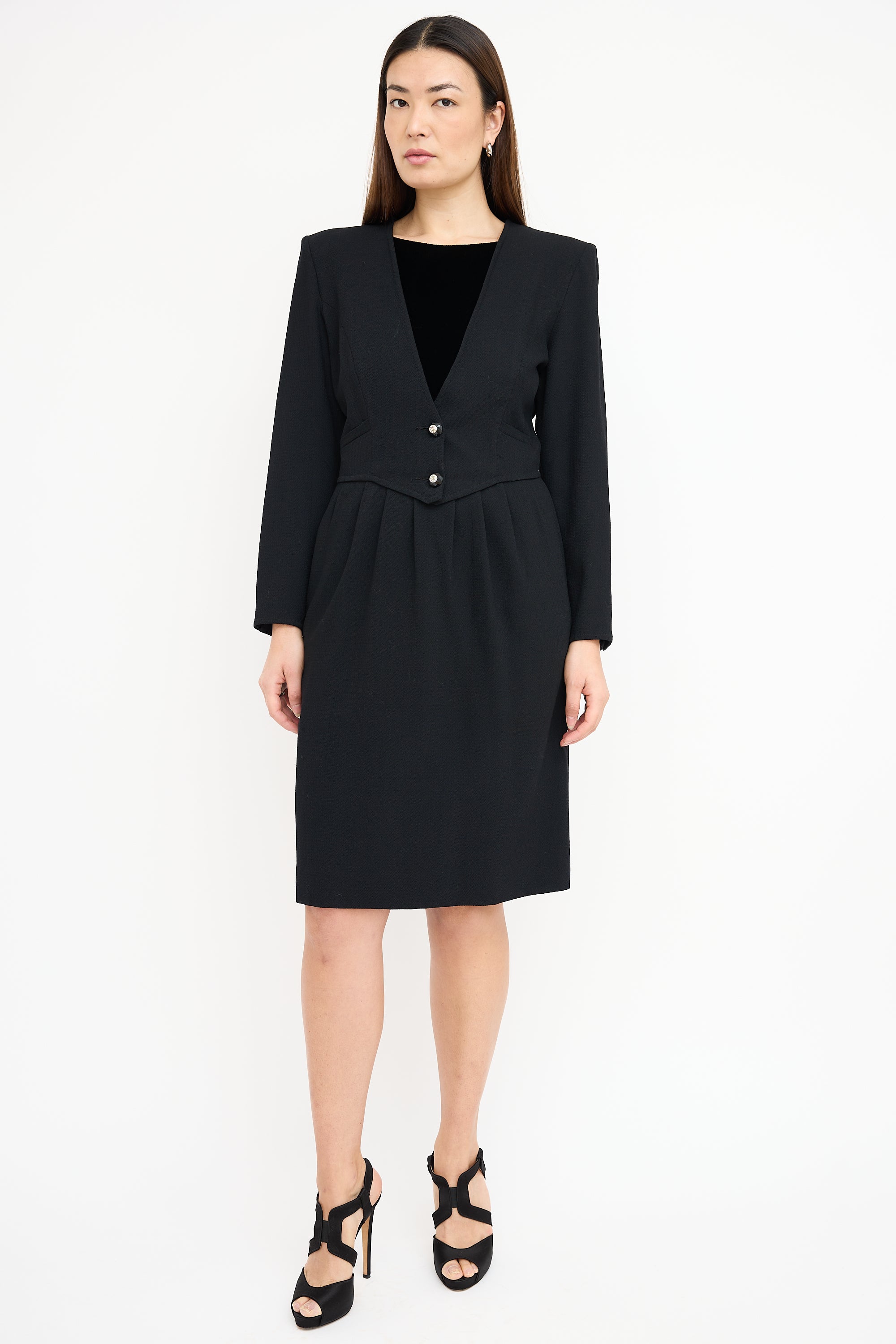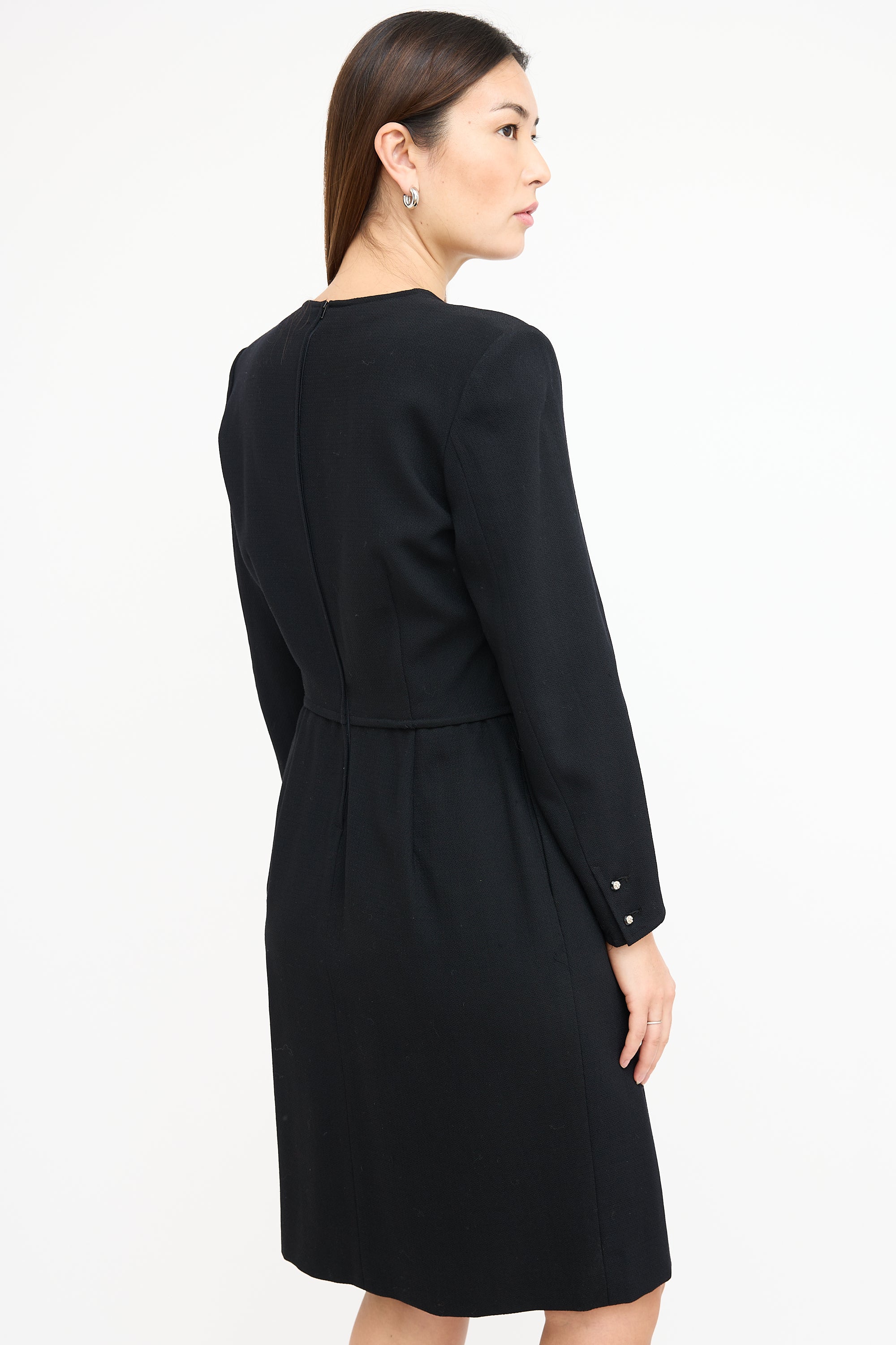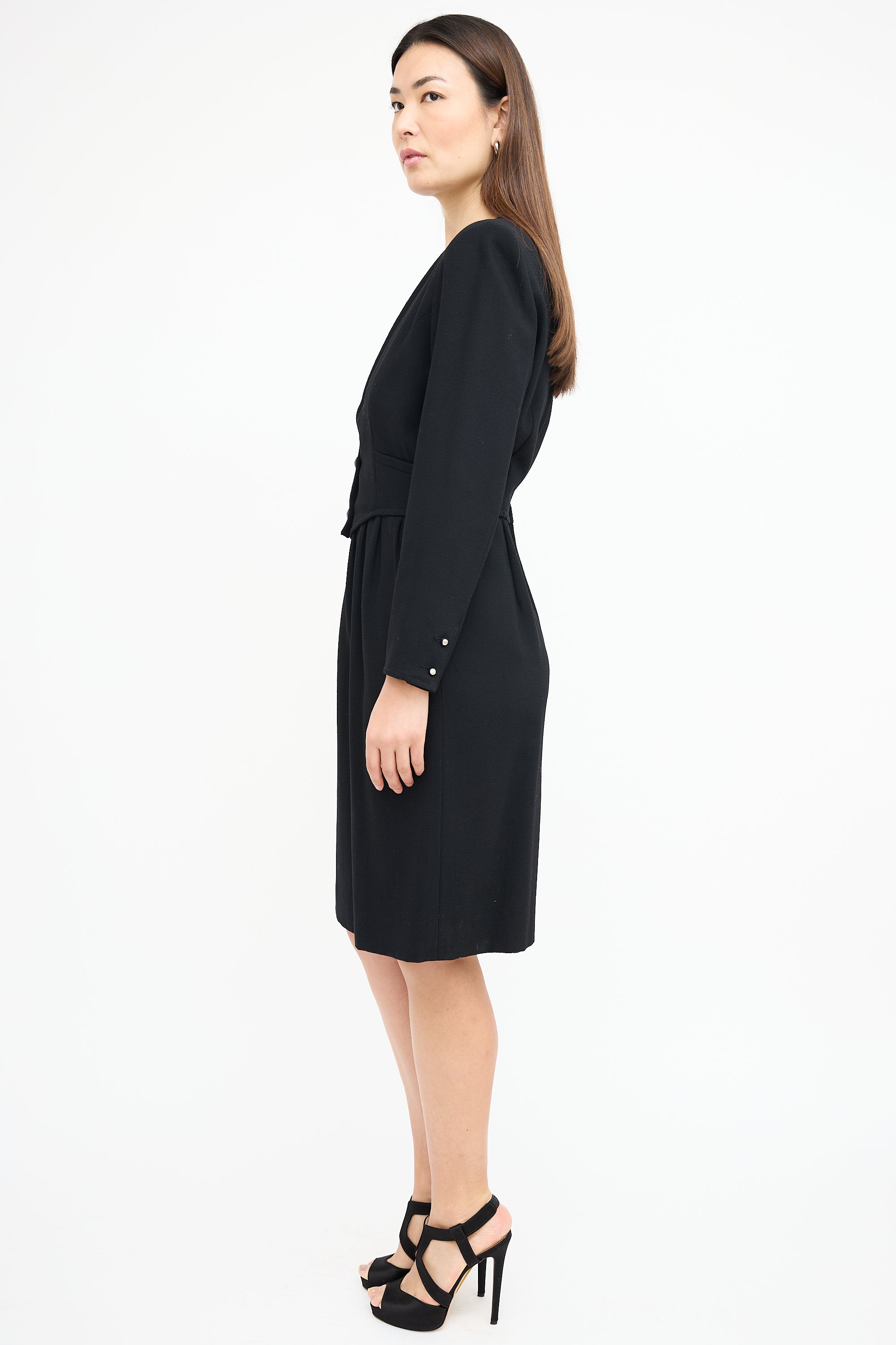 Pre-owned Valentino Miss V 1980s black wool midi dress featuring a round neckline, velvet panel at chest, two faux welt pockets and button front design, tucks at skirt waist, in seam pockets, padded shoulders, buttoned cuffs, and concealed back zip closure. Partially lined.