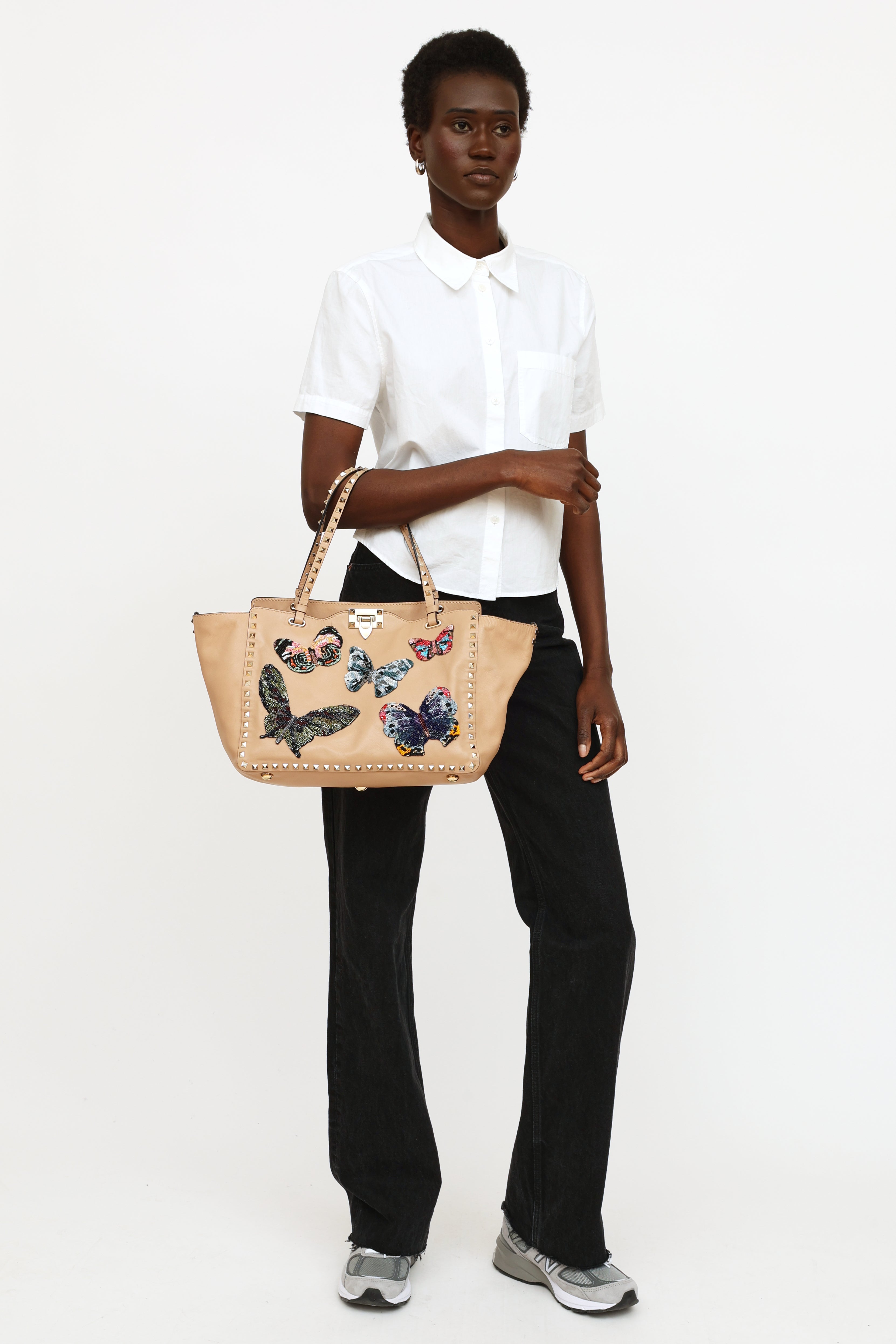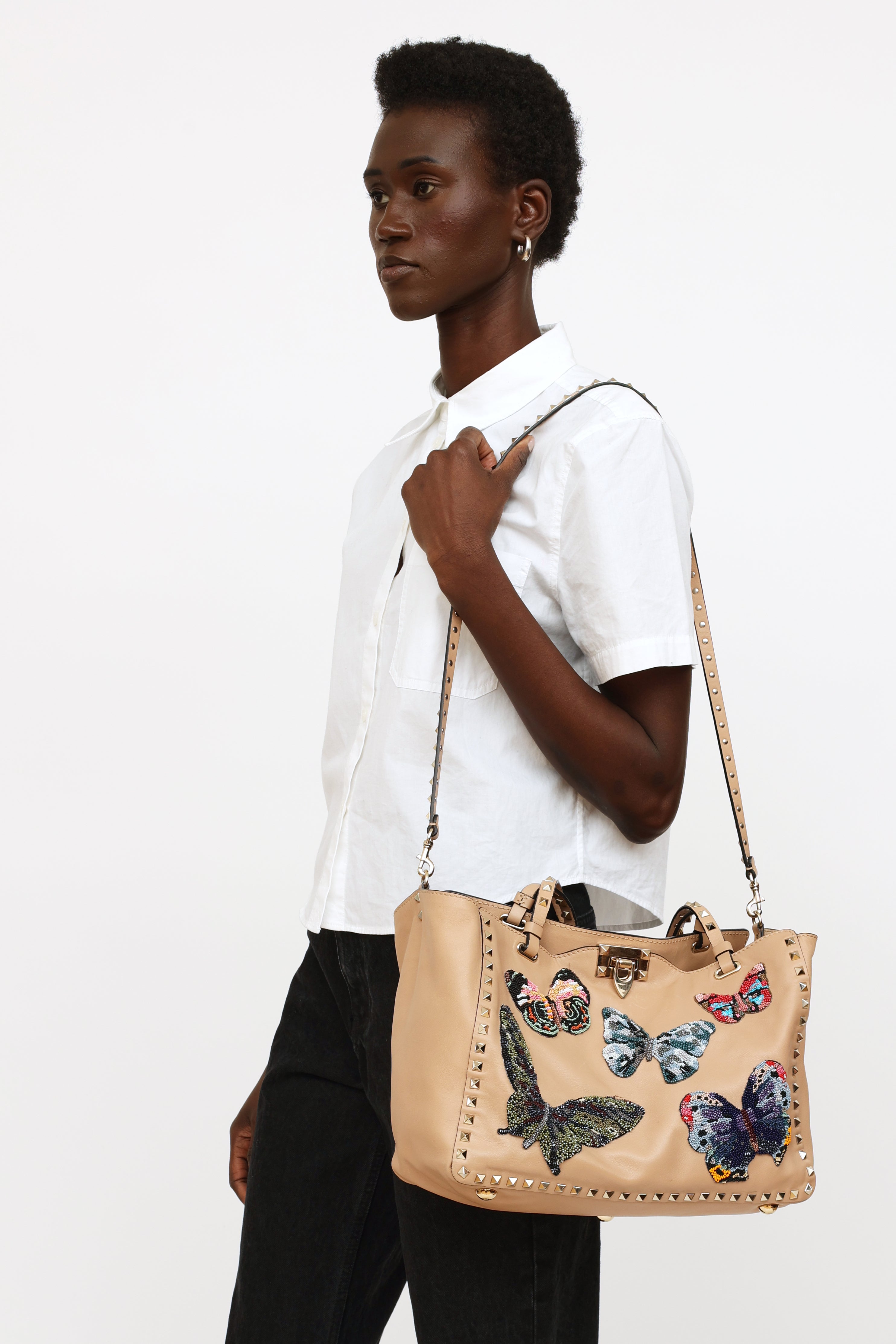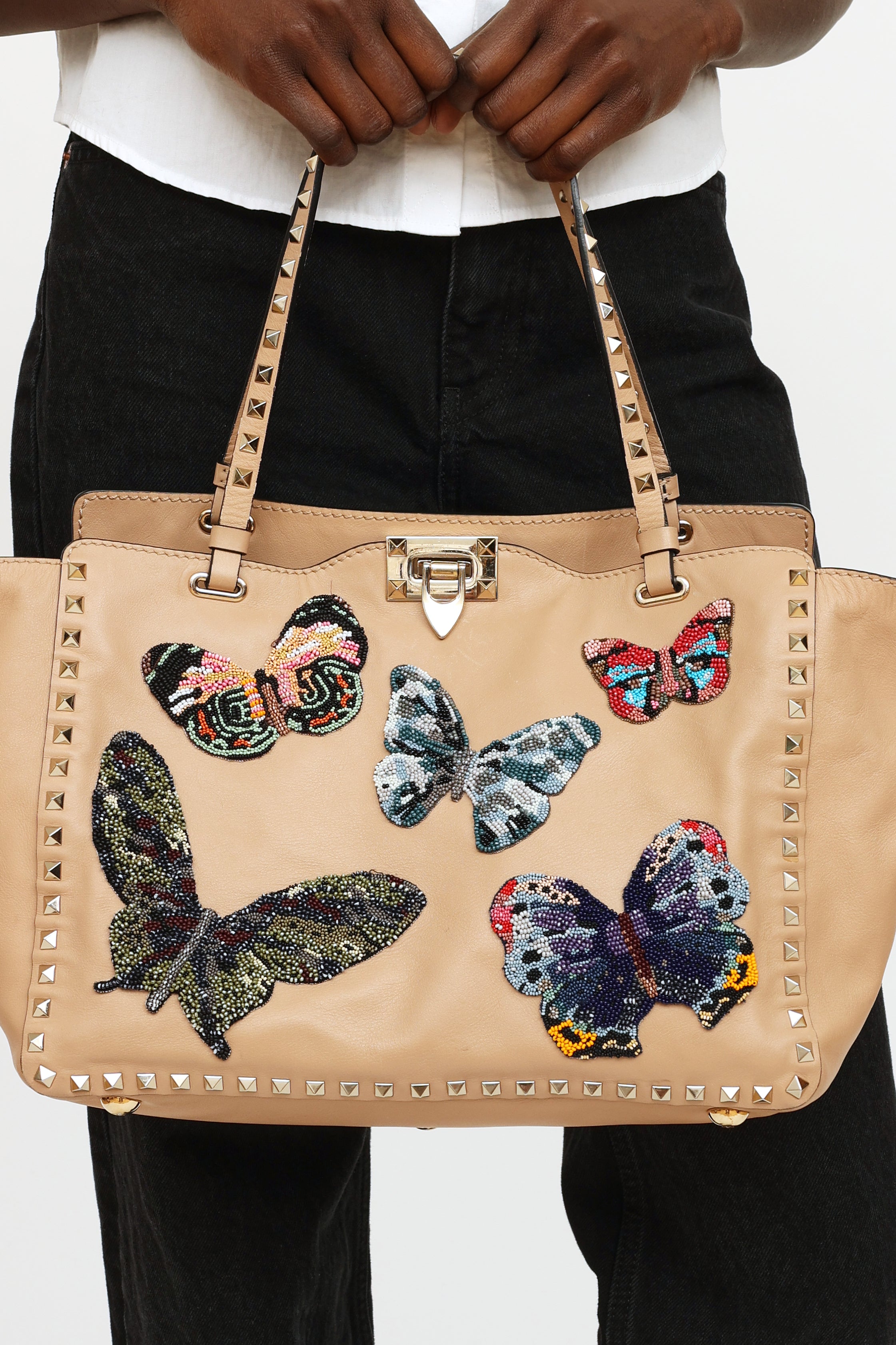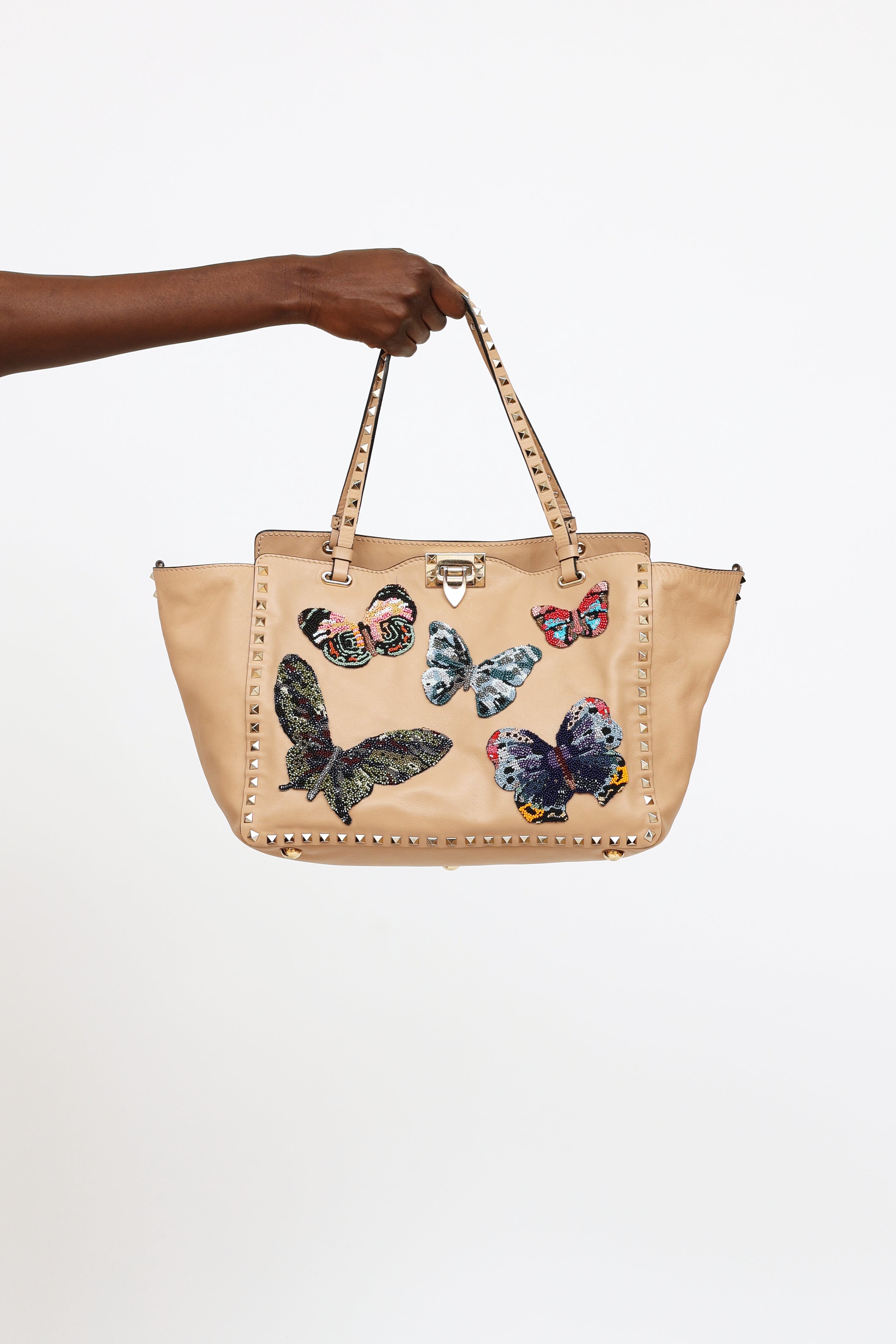 Pre-owned 2017 Valentino beige leather tote bag featuring embroidered beaded multicolored butterflies at front, two shoulder straps and one removable crossbody strap. Open top with gold-tone lift and pull lock, gold-tone rockstud trims. Suede lined interior featuring one zip pocket and two slip pockets. Pre-fall collection, limited edition.