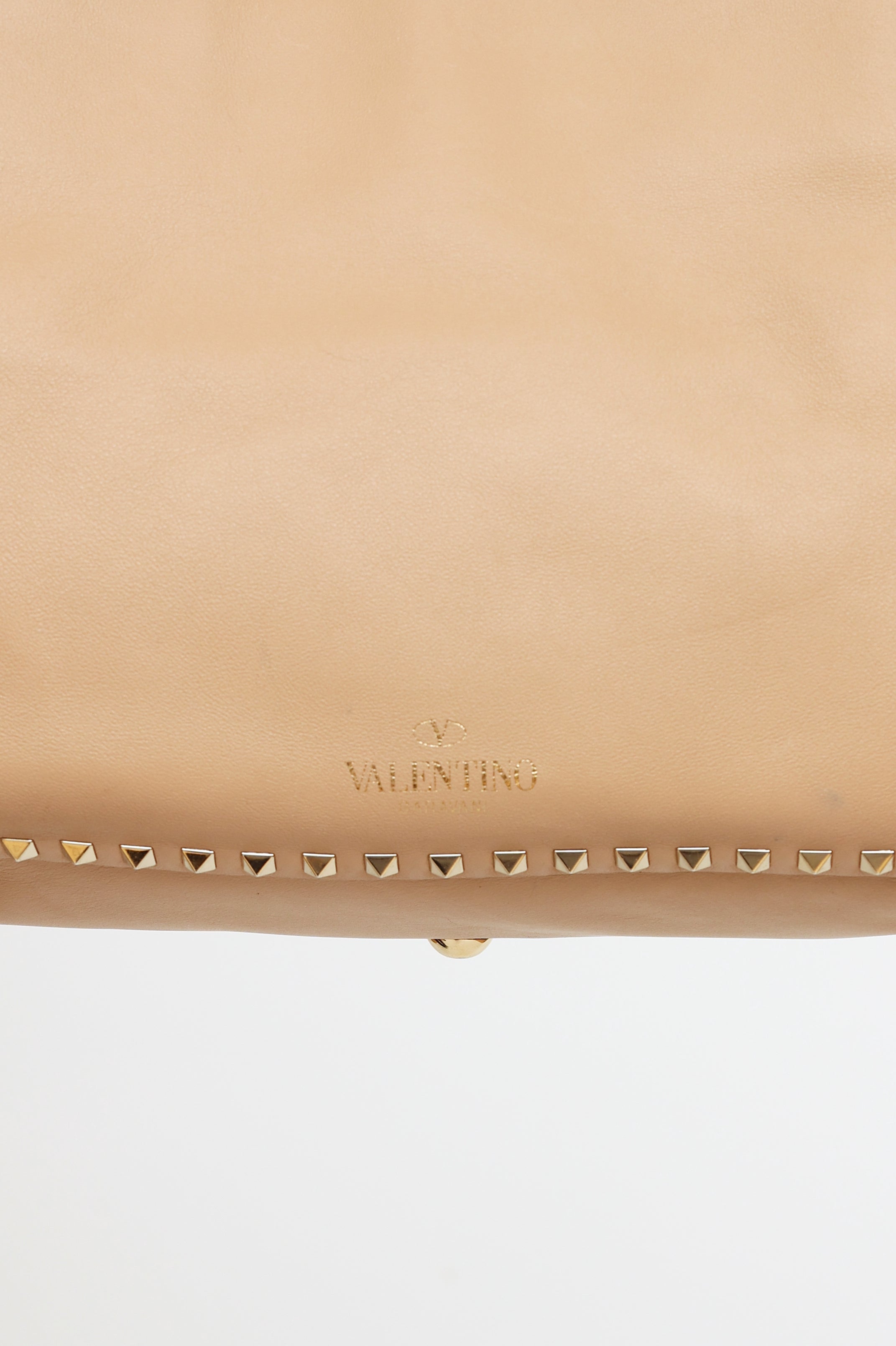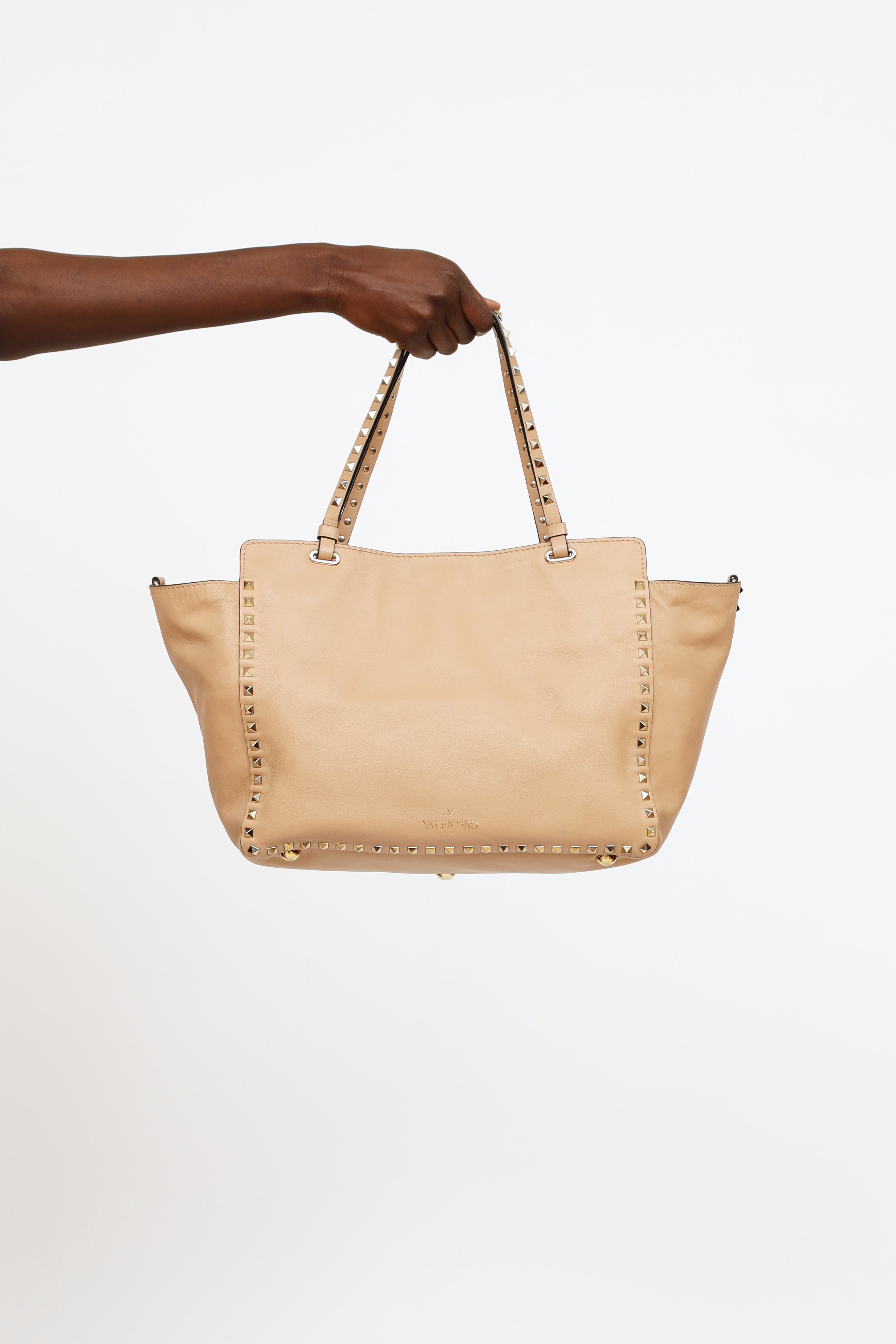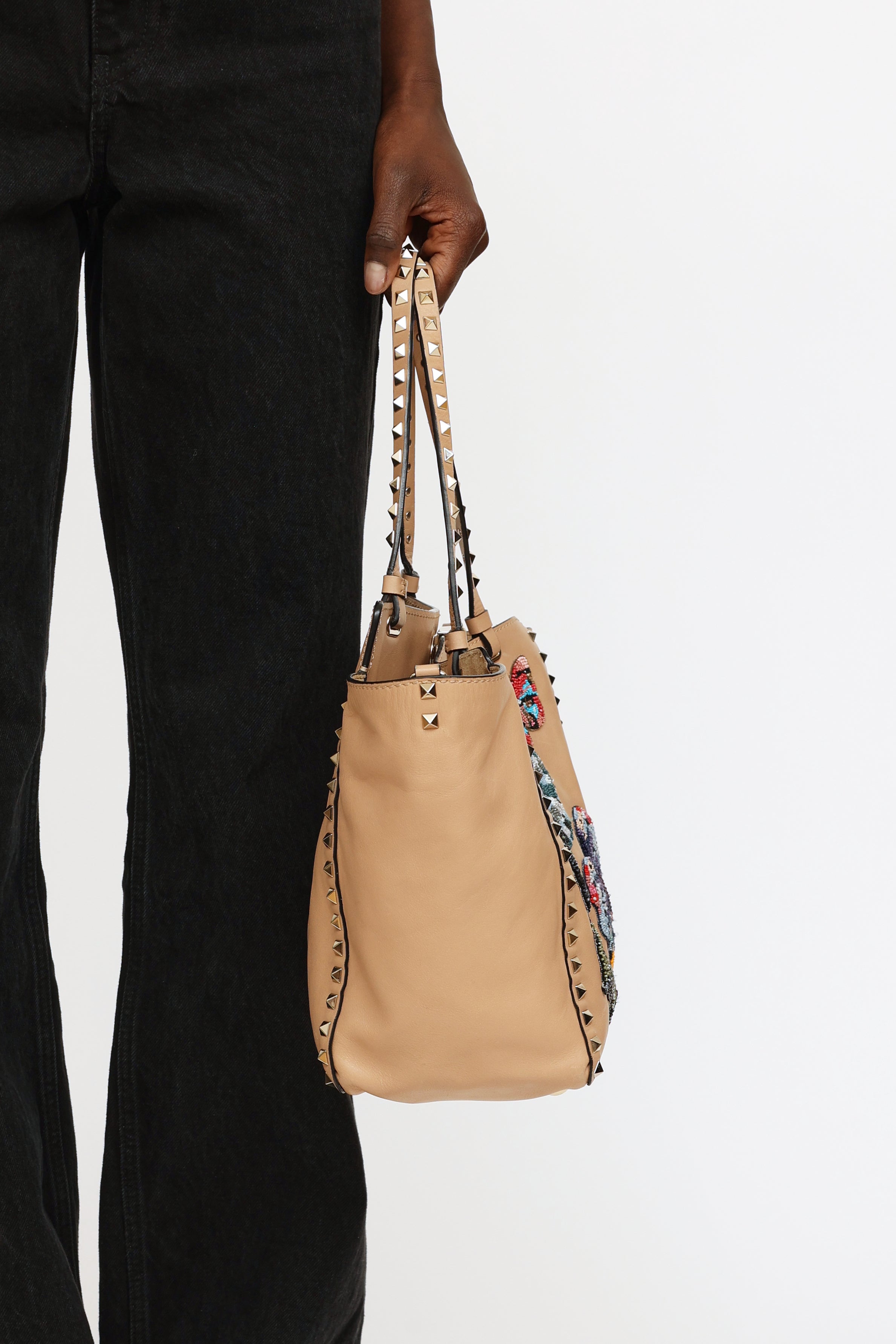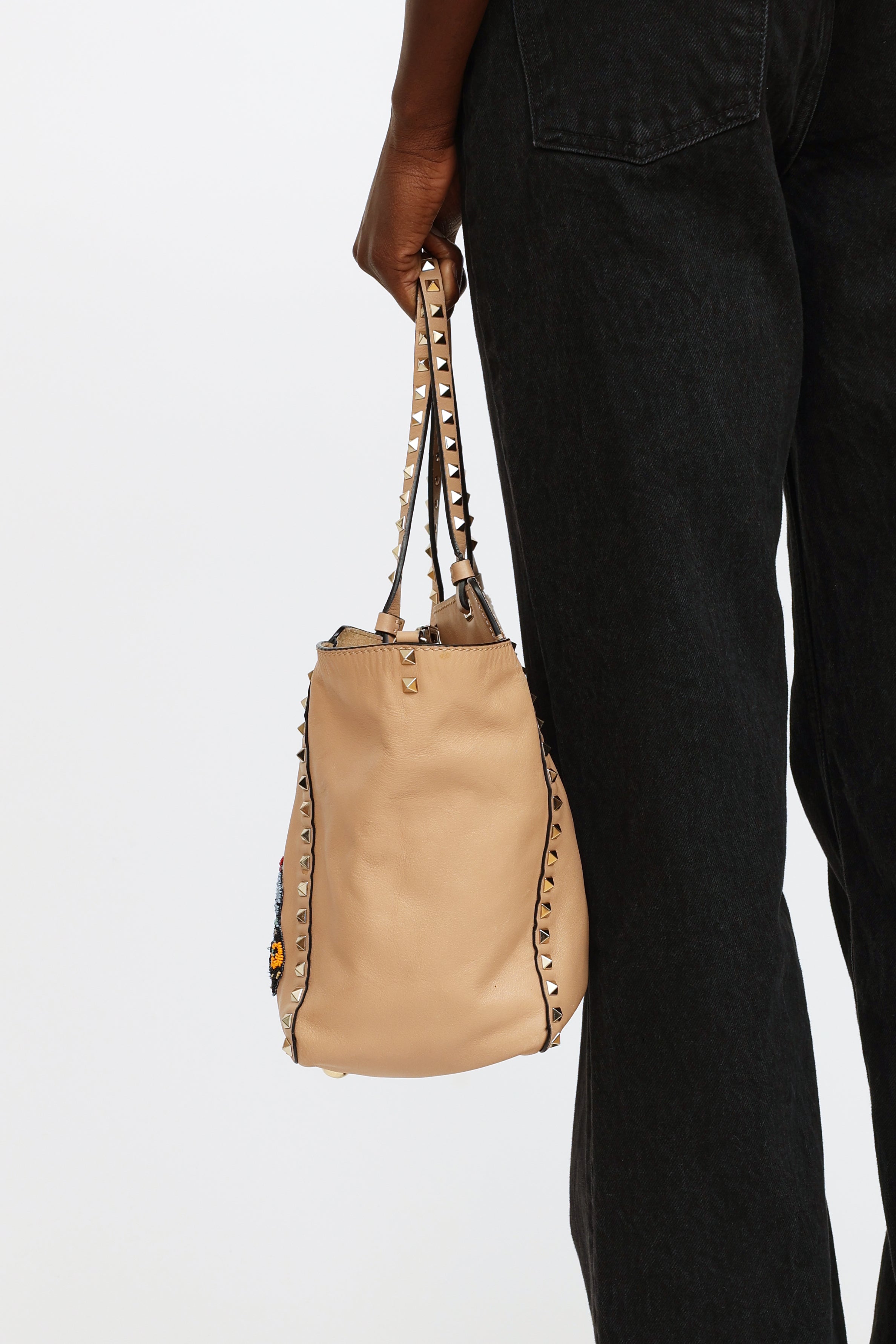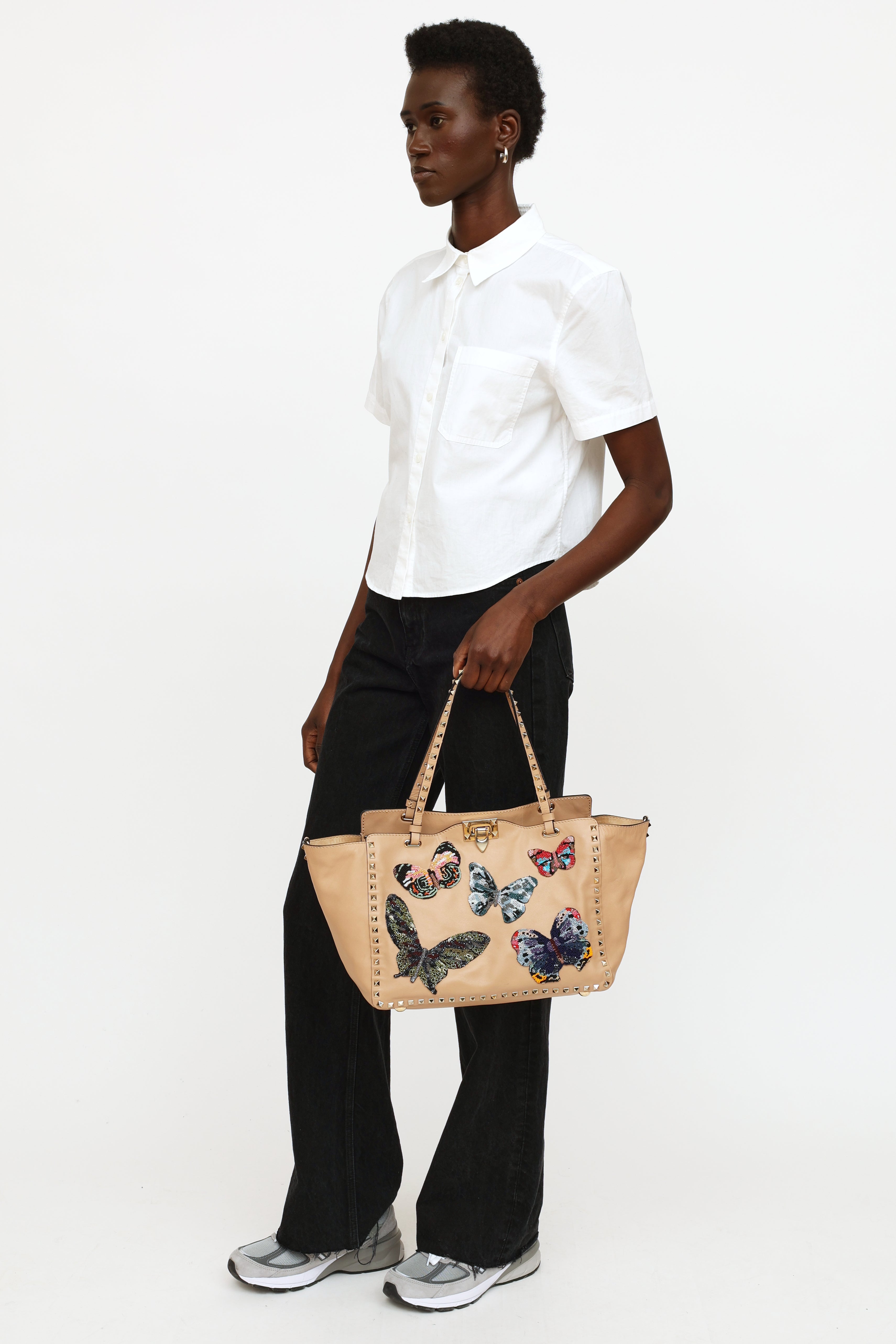 Pre-owned 2017 Valentino beige leather tote bag featuring embroidered beaded multicolored butterflies at front, two shoulder straps and one removable crossbody strap. Open top with gold-tone lift and pull lock, gold-tone rockstud trims. Suede lined interior featuring one zip pocket and two slip pockets. Pre-fall collection, limited edition.
