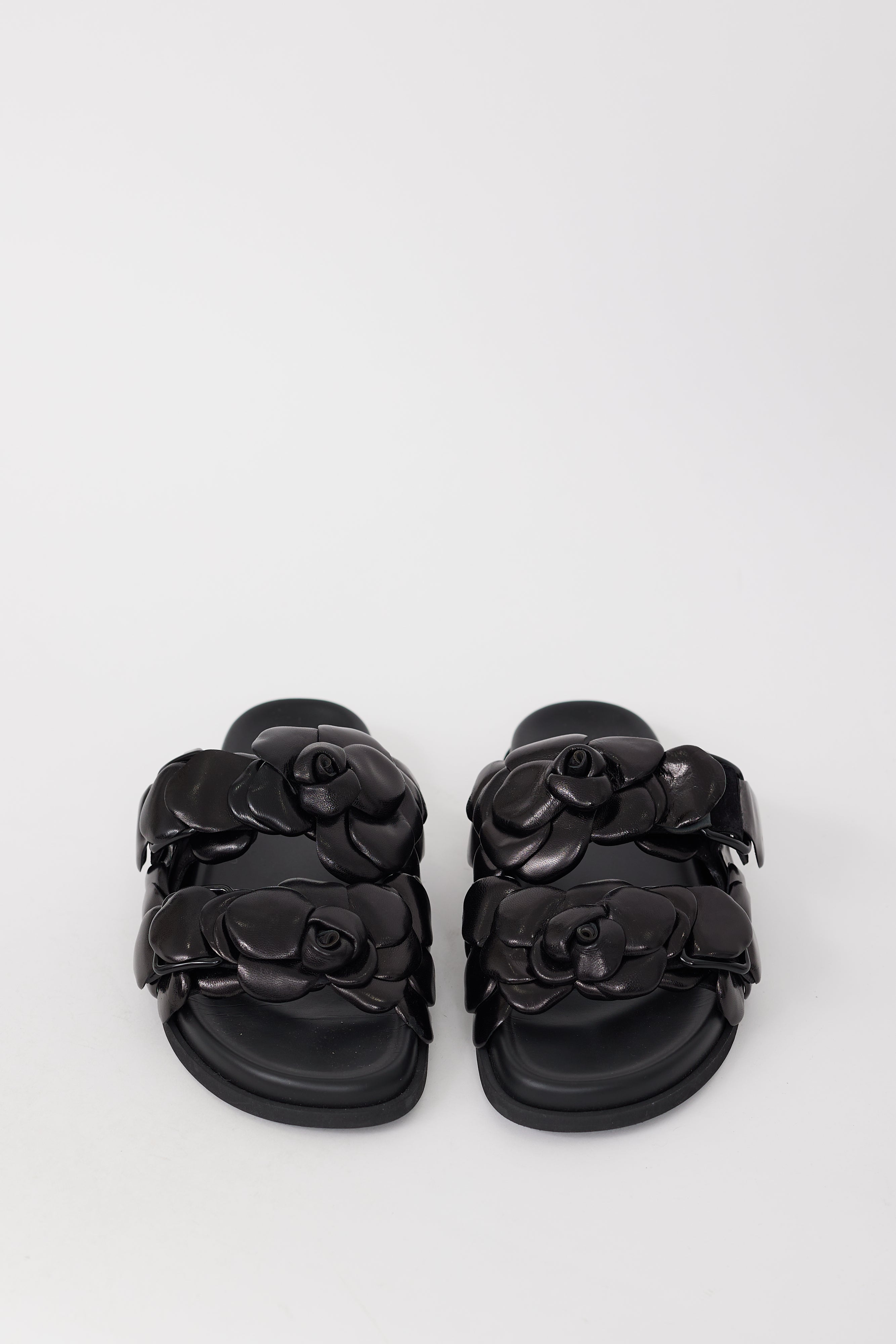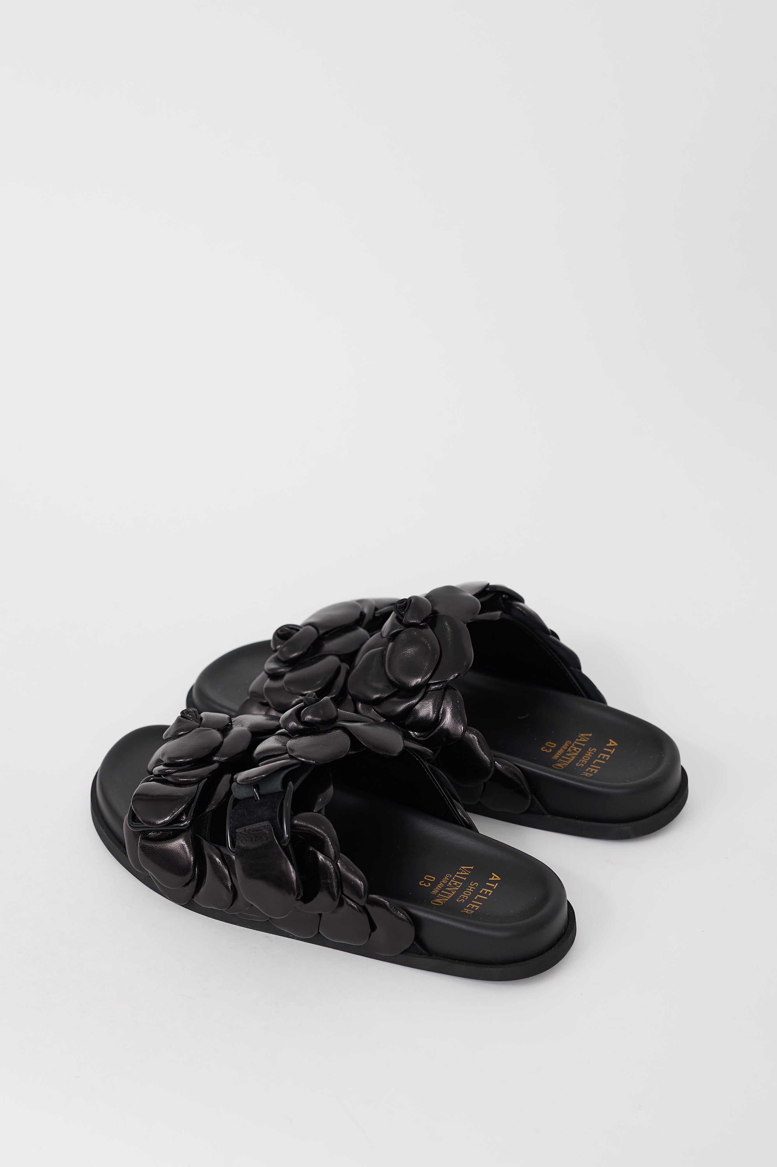 Pre-owned Valentino Atelier 03 black leather Rose Edition sandals featuring an open rounded toe, two buckled straps across vamp and instep with rosette and petal appliques throughout, leather midsole, and rubber outsole.