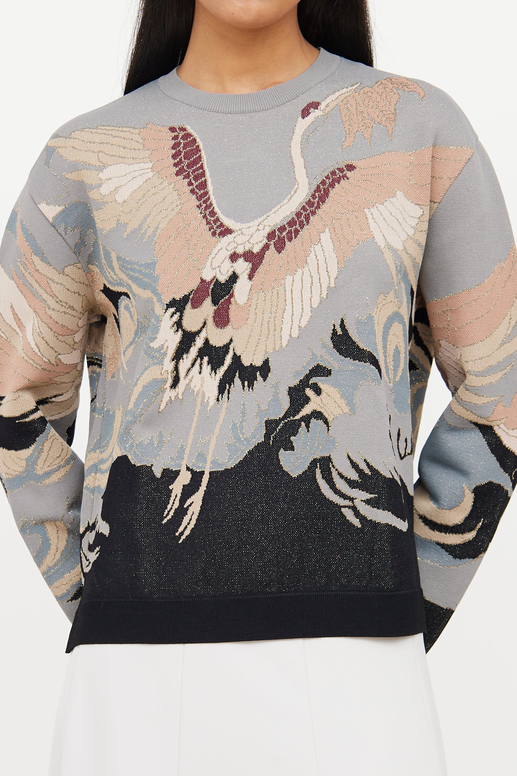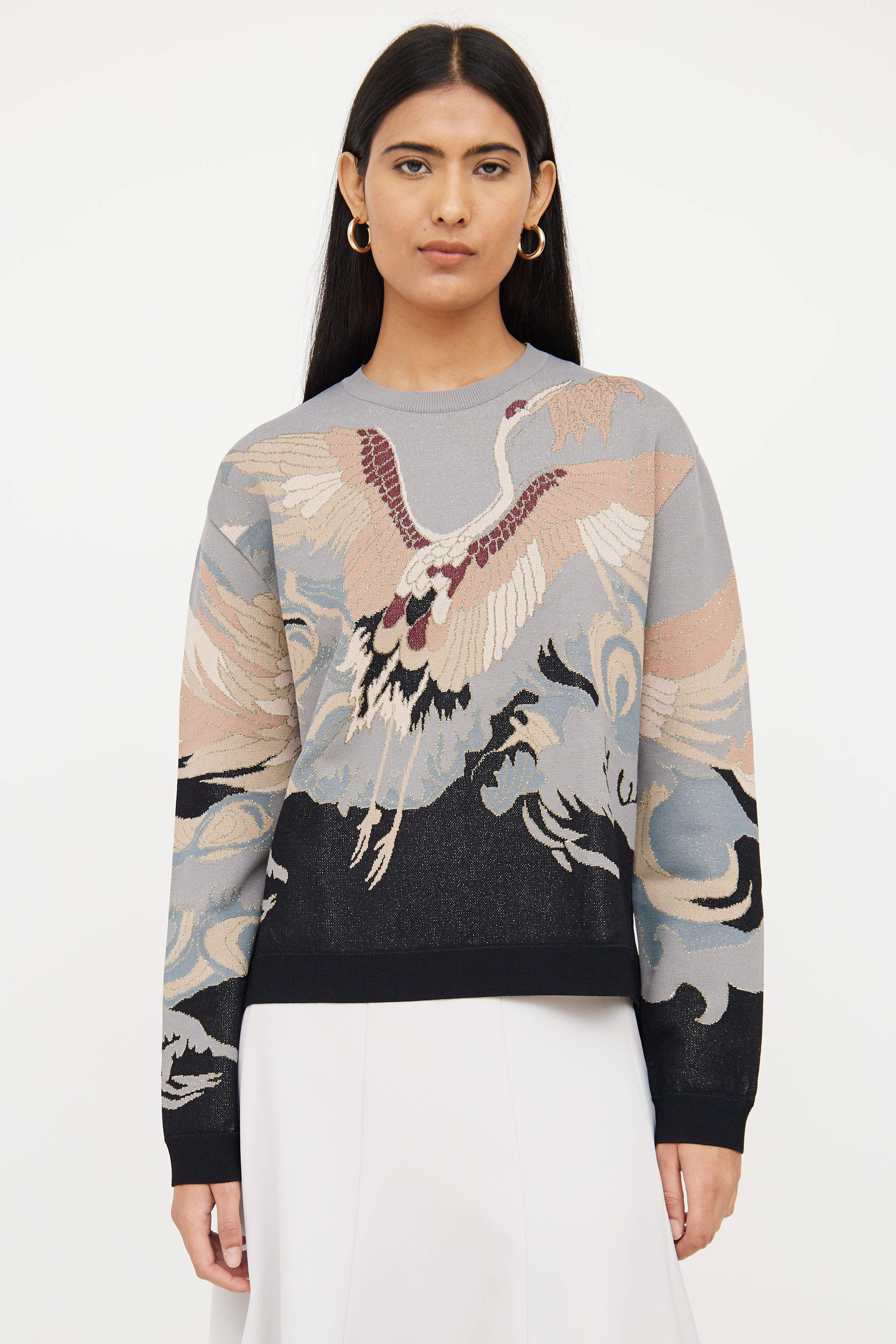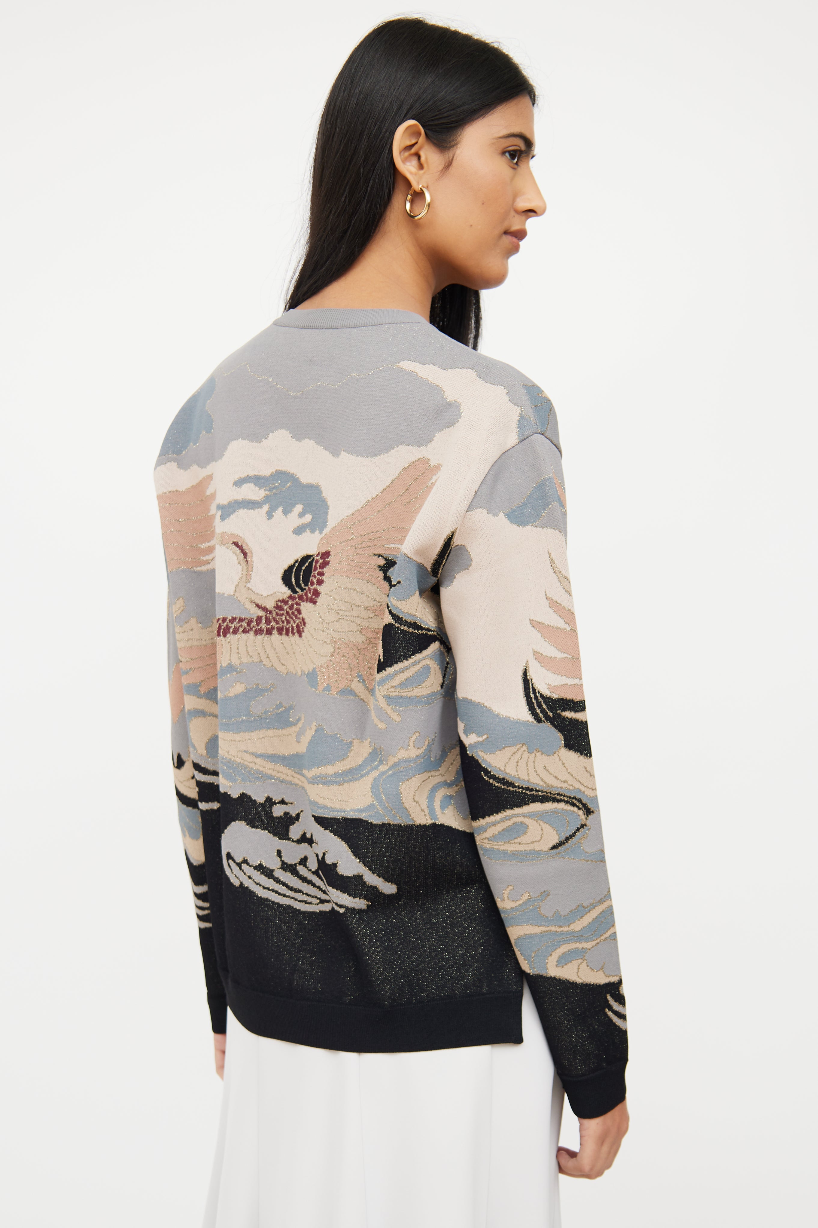 Pre-owned Valentino multicolour sweater featuring round rib knit neckline, long sleeves with rib knit cuffs, slight high-low rib knit hem with dual side split detail and multicolour crane and sky motif throughout.