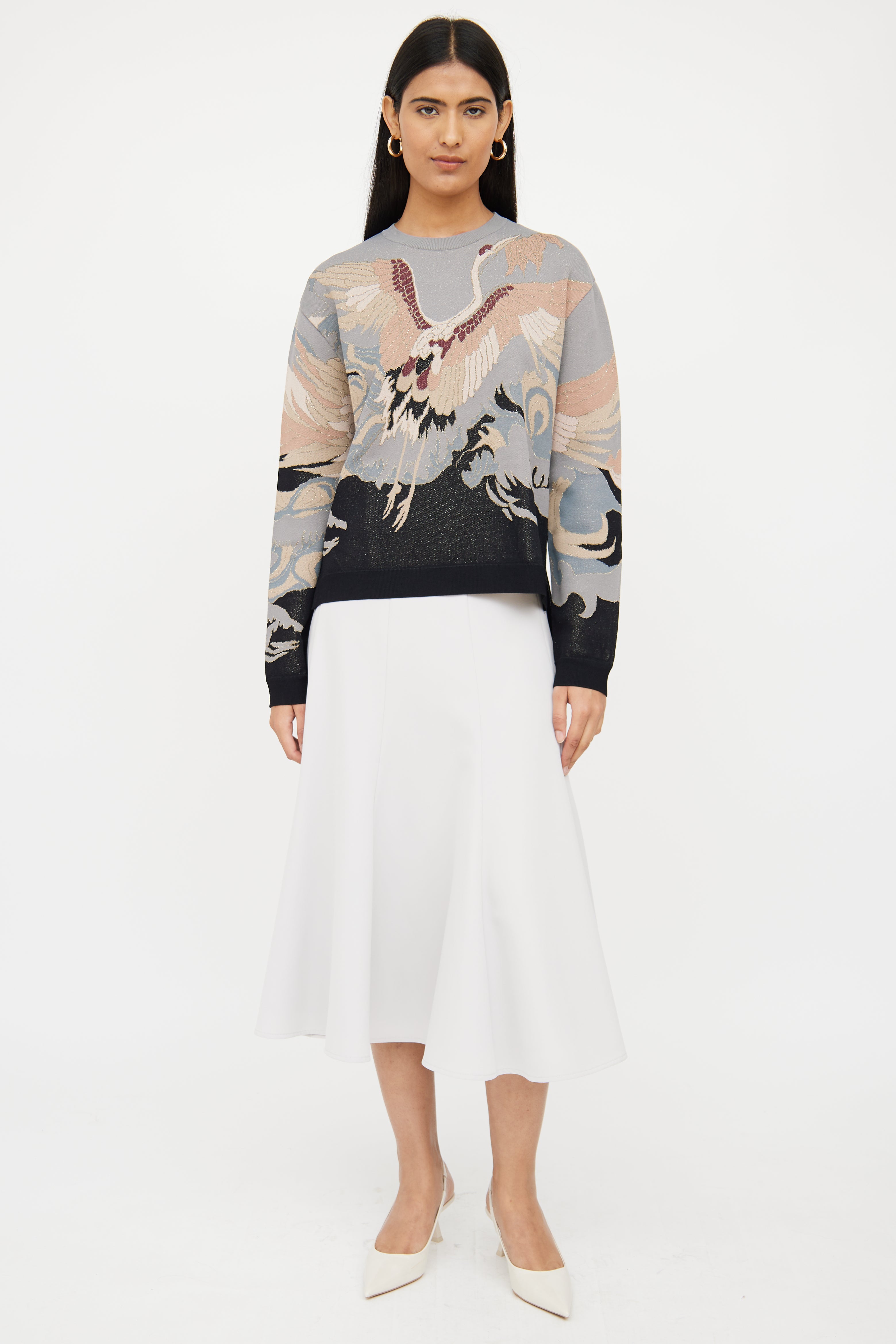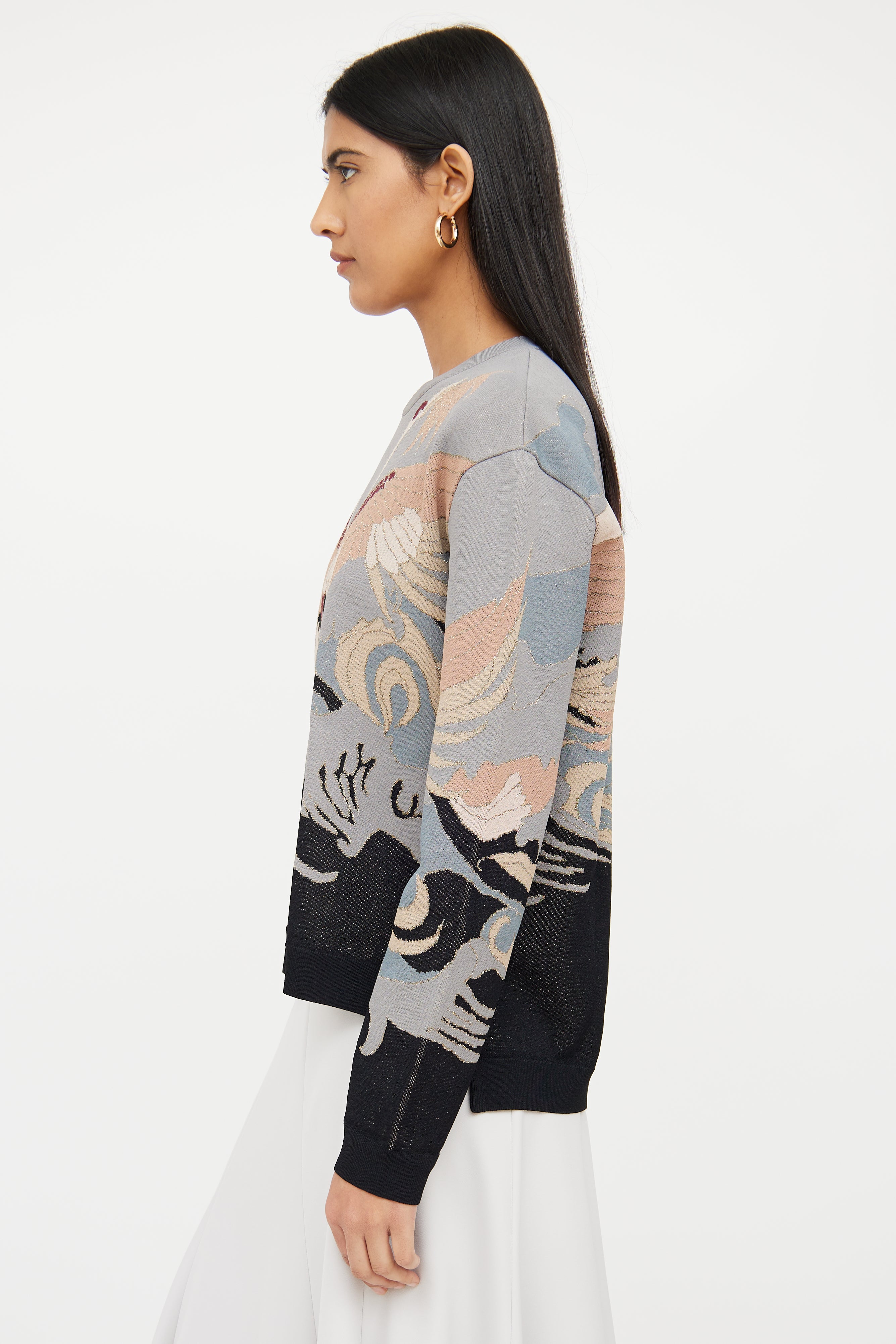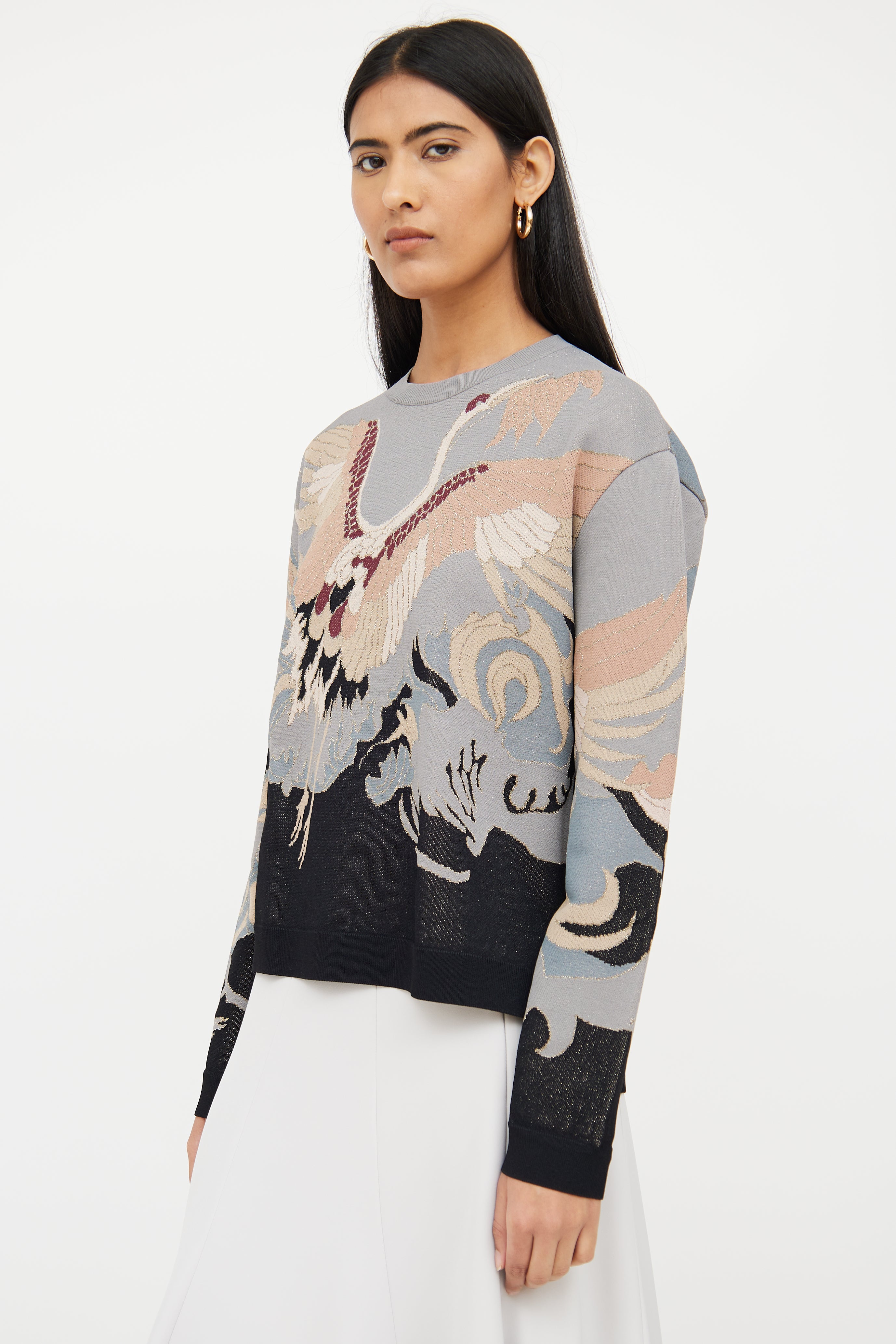 Pre-owned Valentino multicolour sweater featuring round rib knit neckline, long sleeves with rib knit cuffs, slight high-low rib knit hem with dual side split detail and multicolour crane and sky motif throughout.