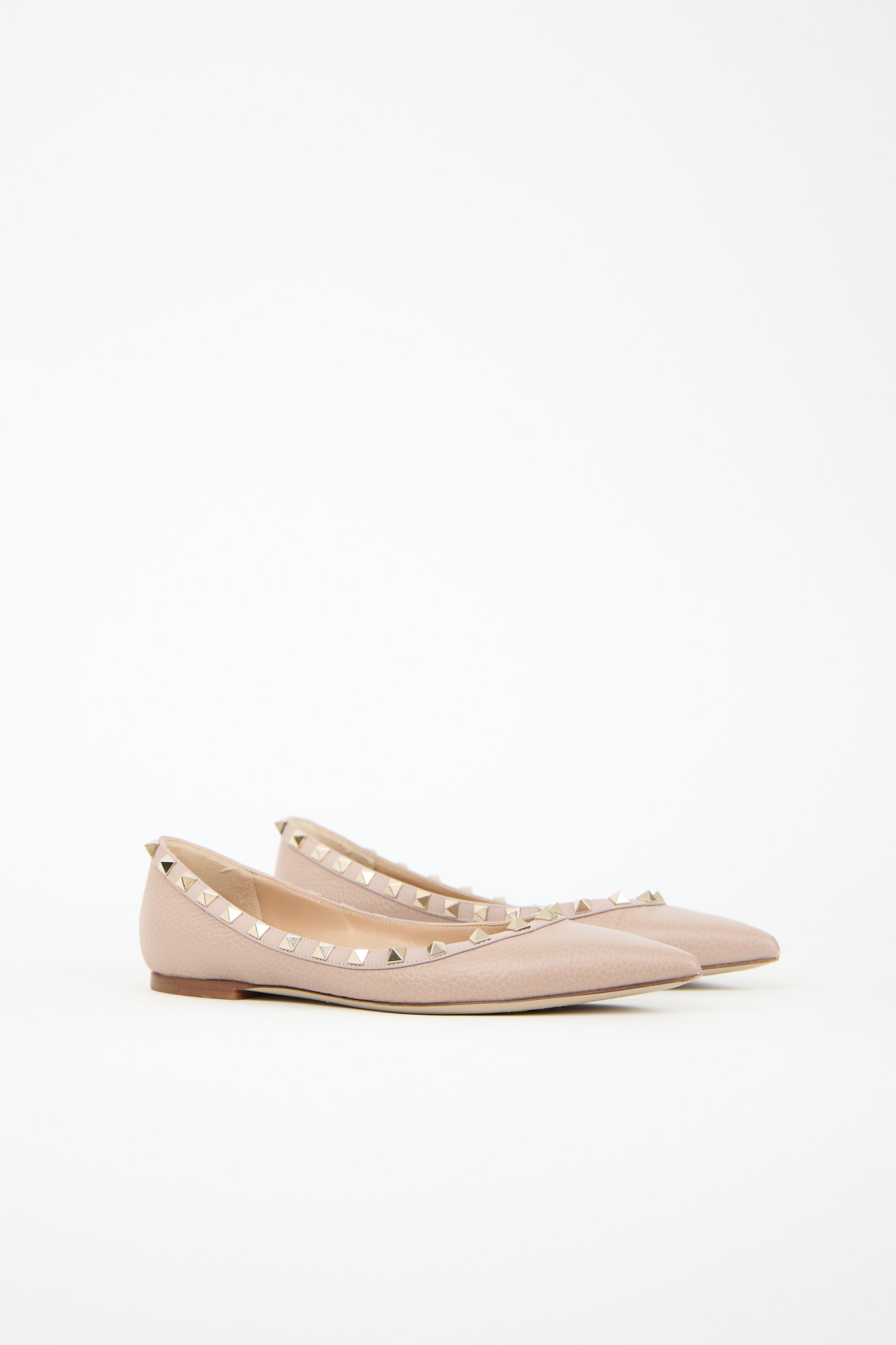 Pre-owned Valentino beige leather ballet flat featuring a pointed toe, gold tone Rockstud embellished topline, slip on entry, and a small stacked heel.