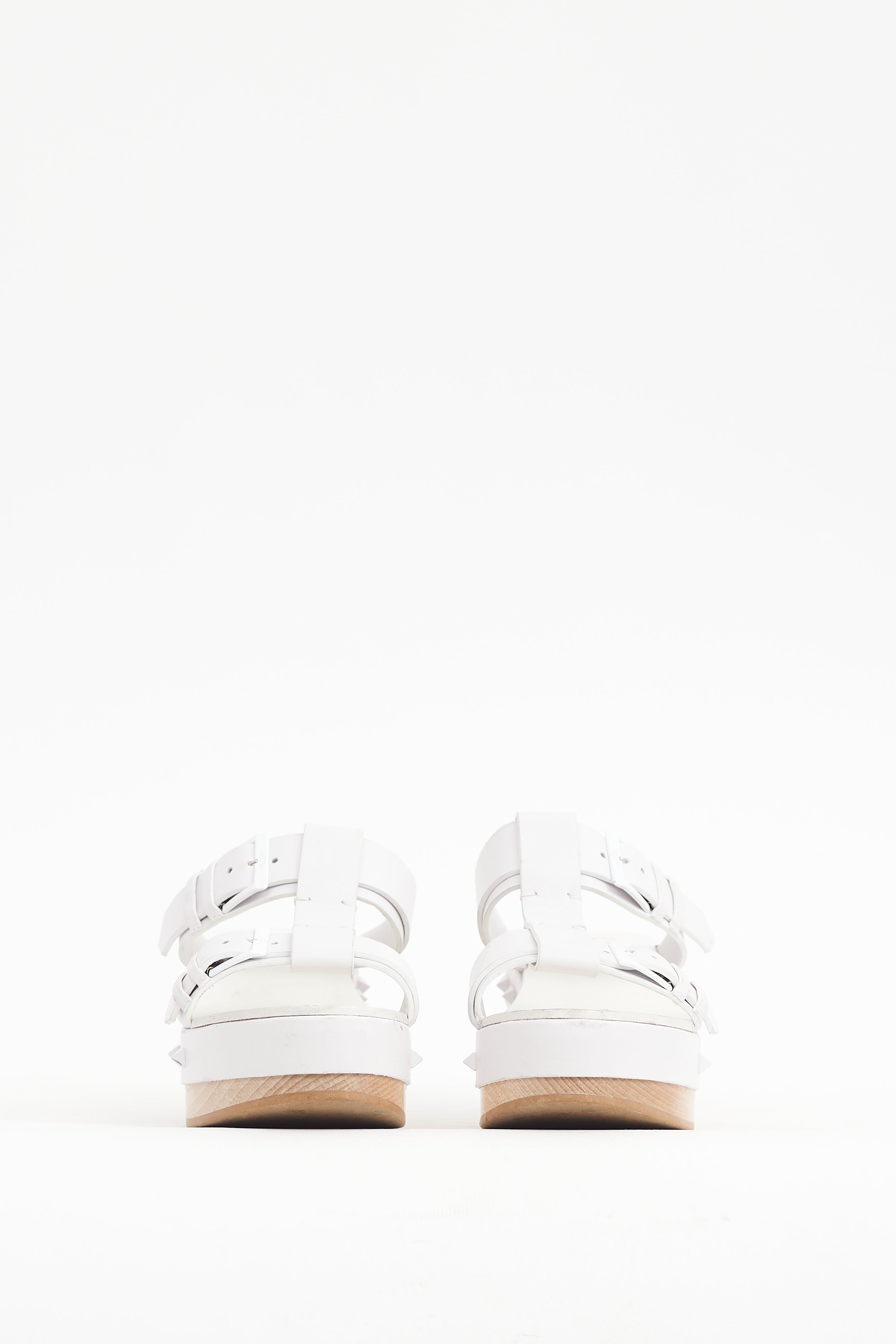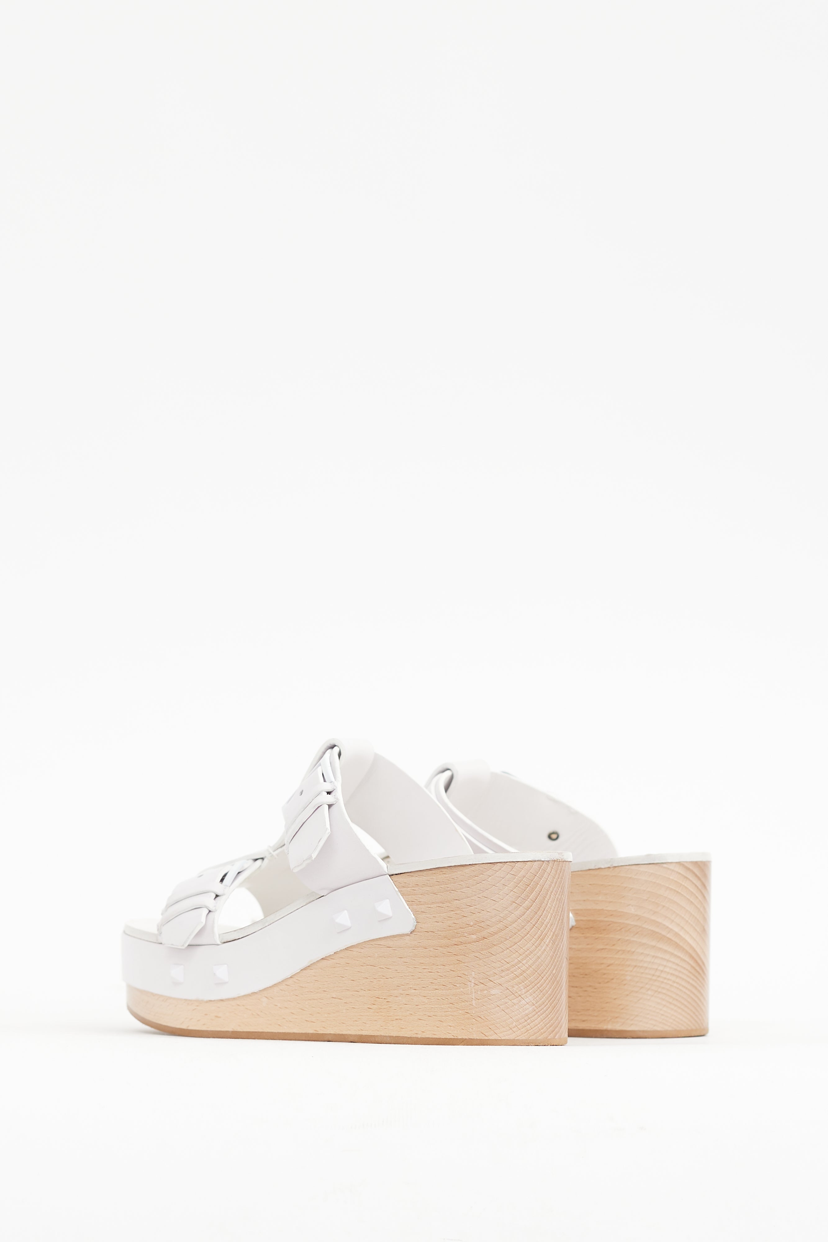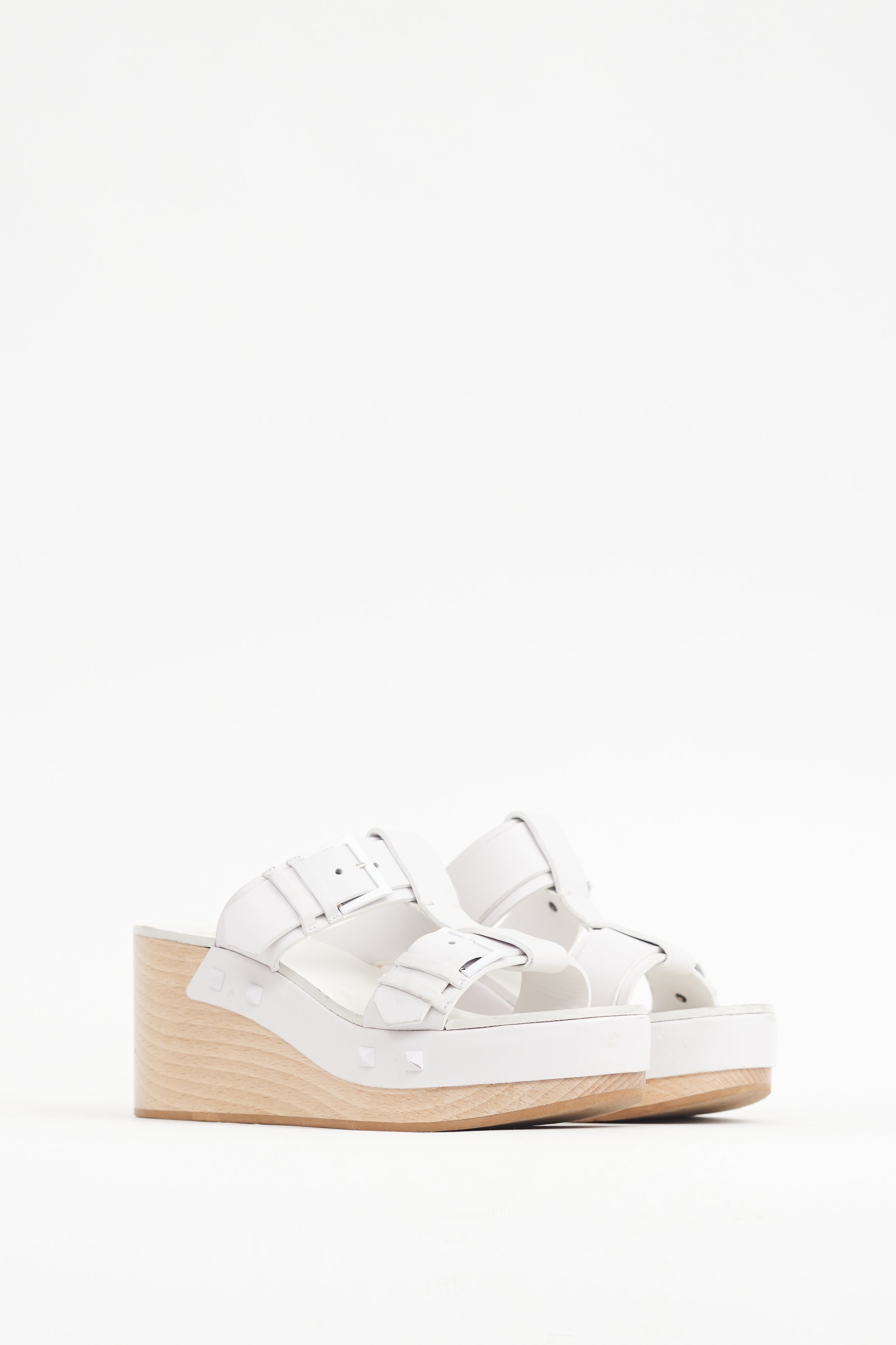 Pre-owned Valentino white heels featuring an open oblique toe, leather uppers, two connected thick buckled straps across vamp, and a beige wooden wedge heel with white leather trim and white Rockstud embellishments.