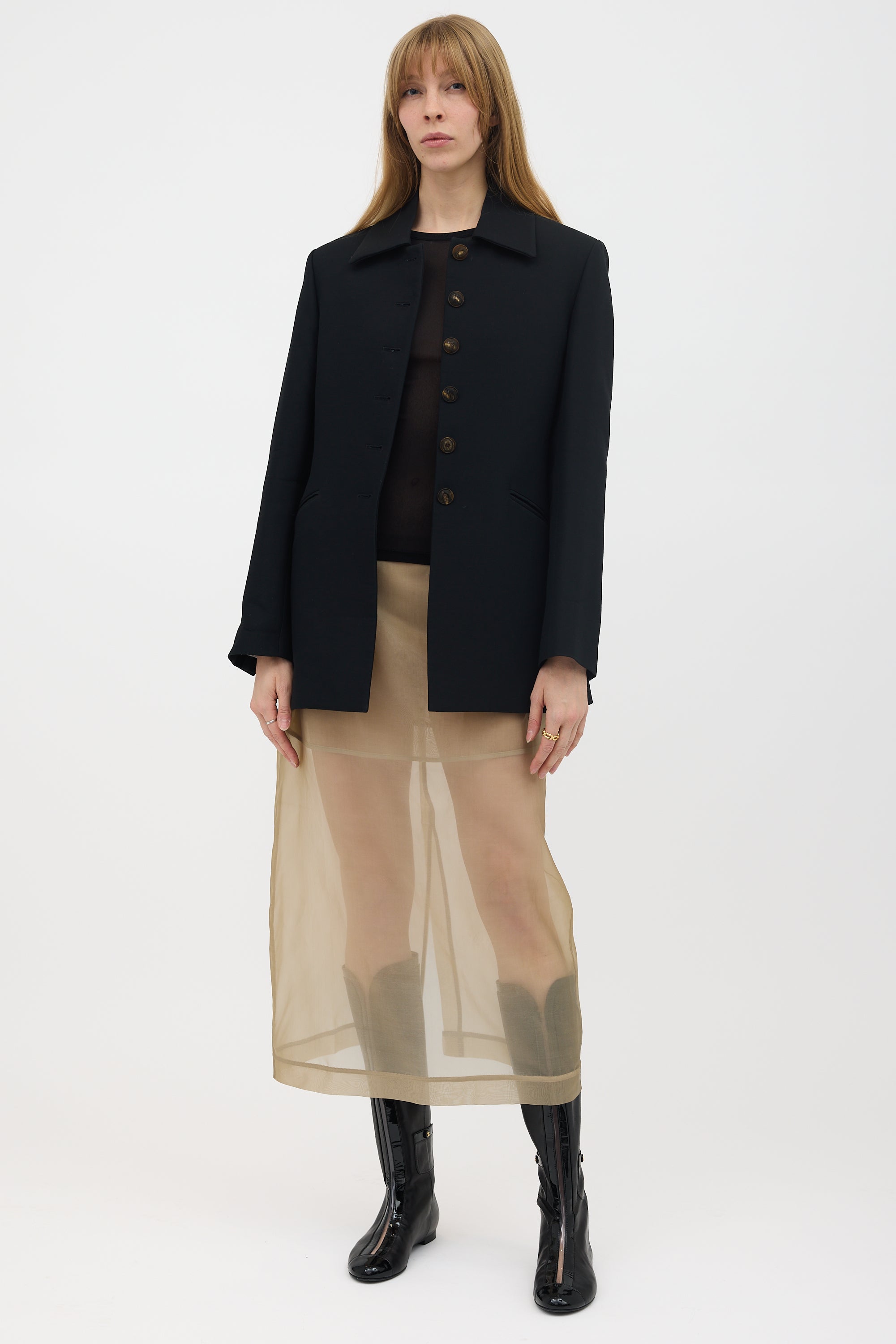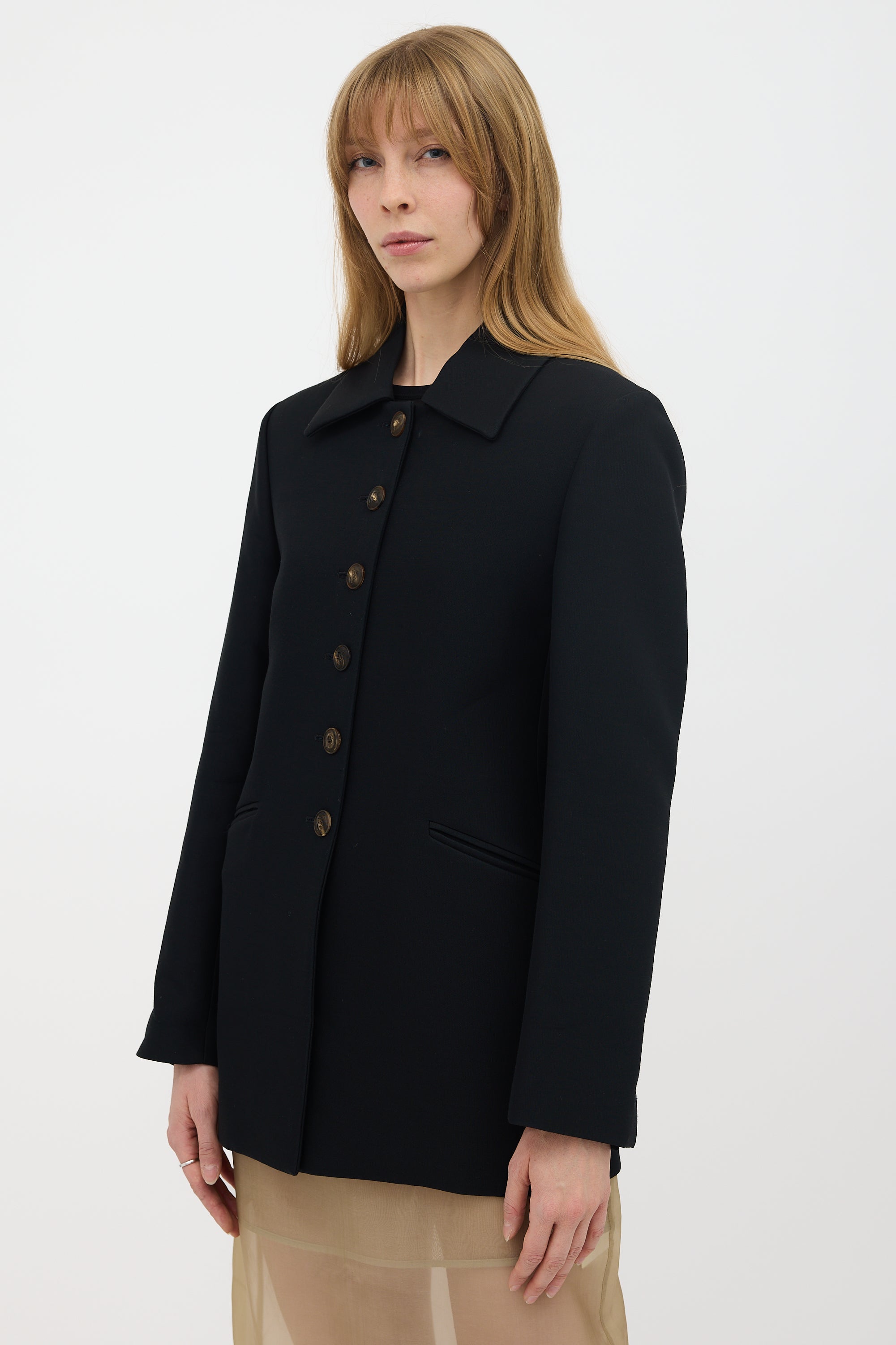 Pre-owned Veronica de Piante black wool blend Klara jacket featuring a spread collar, button front, and double welt pockets.