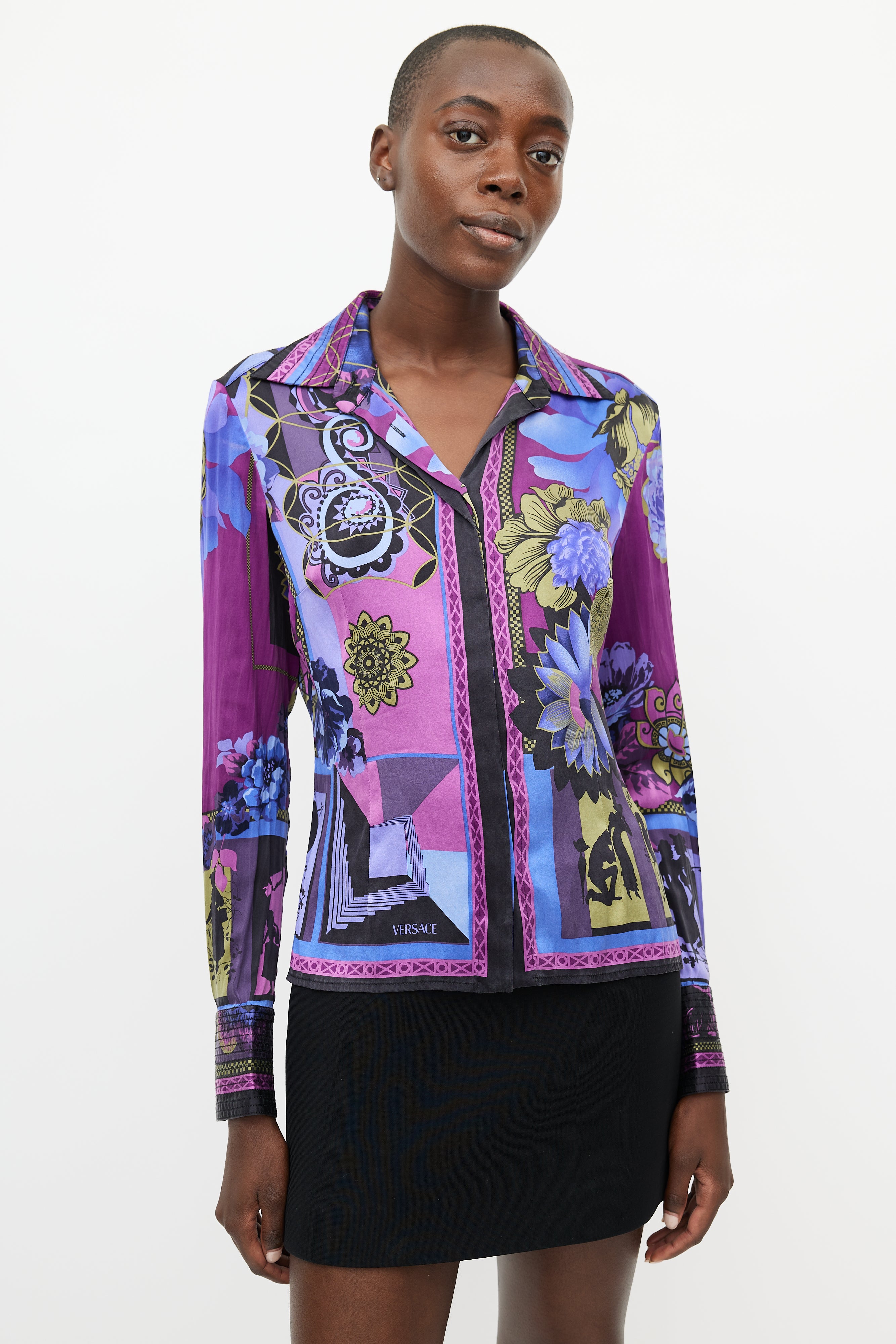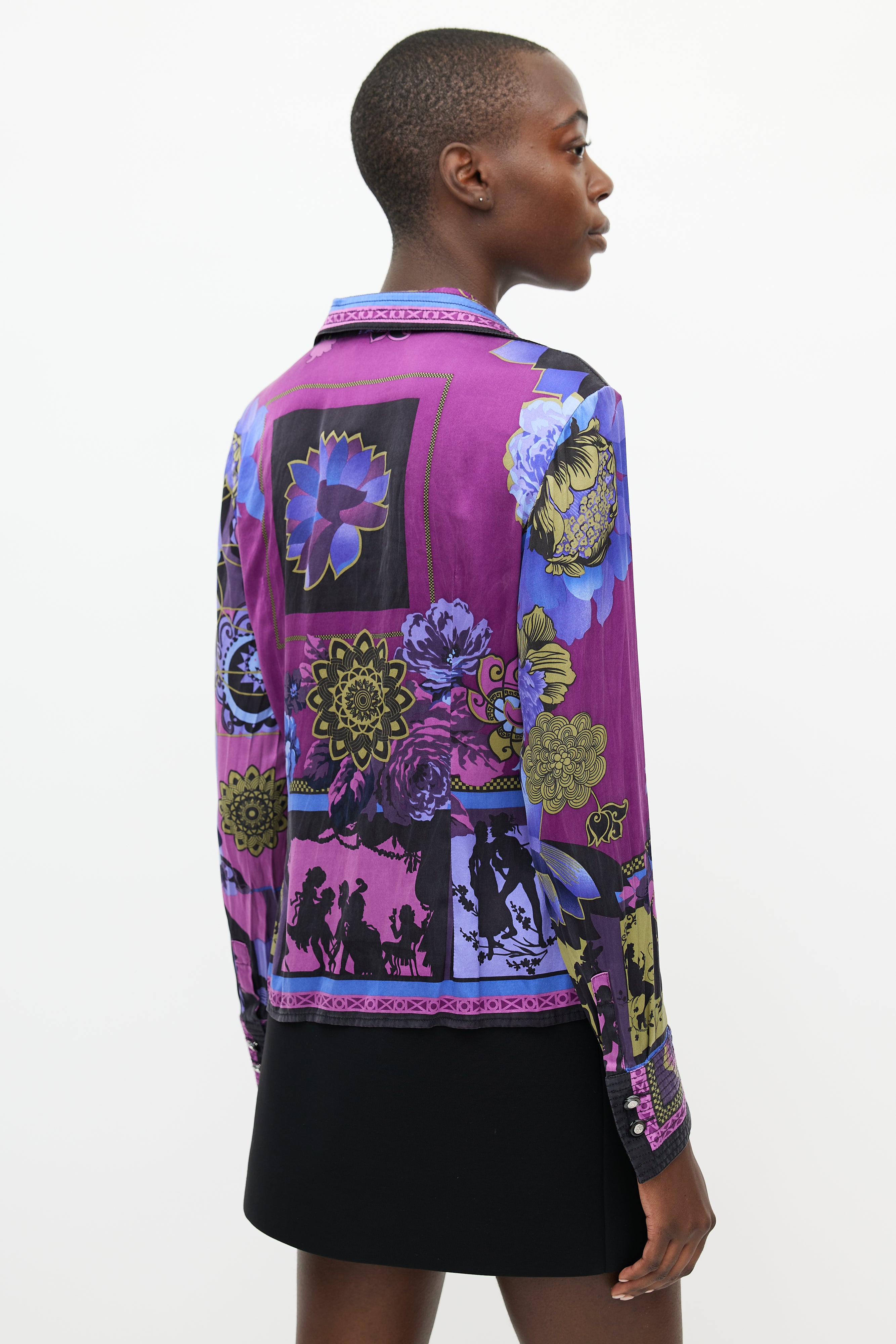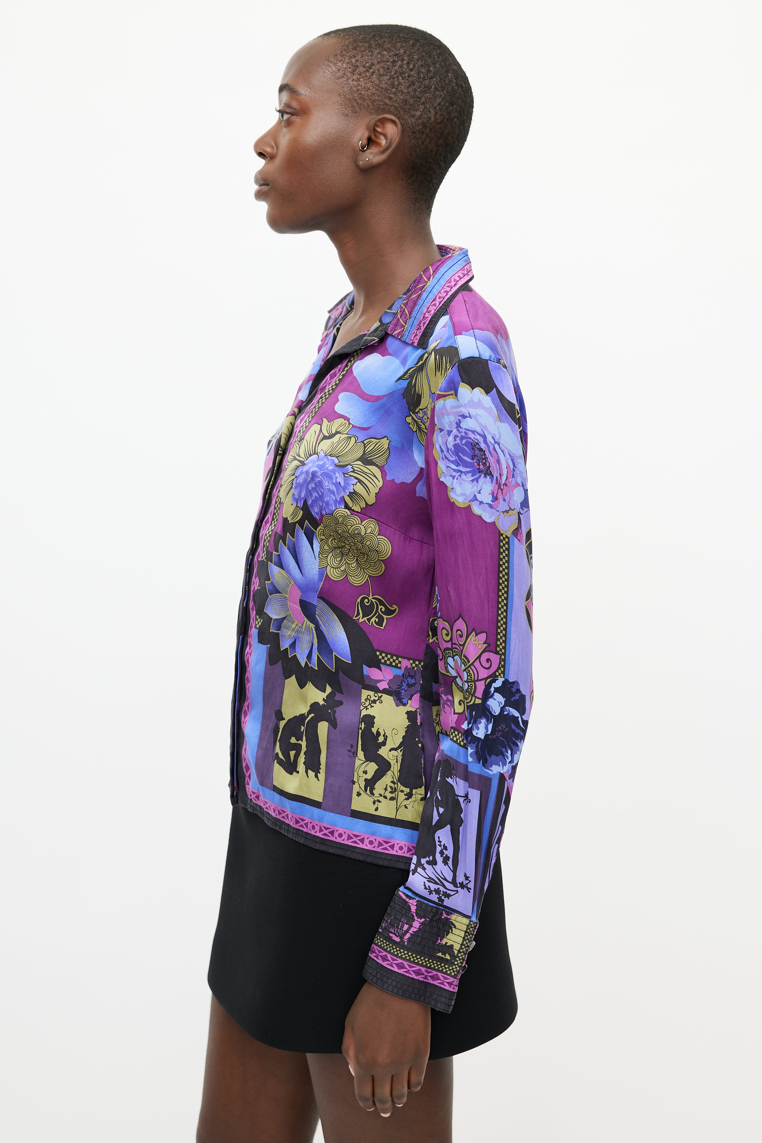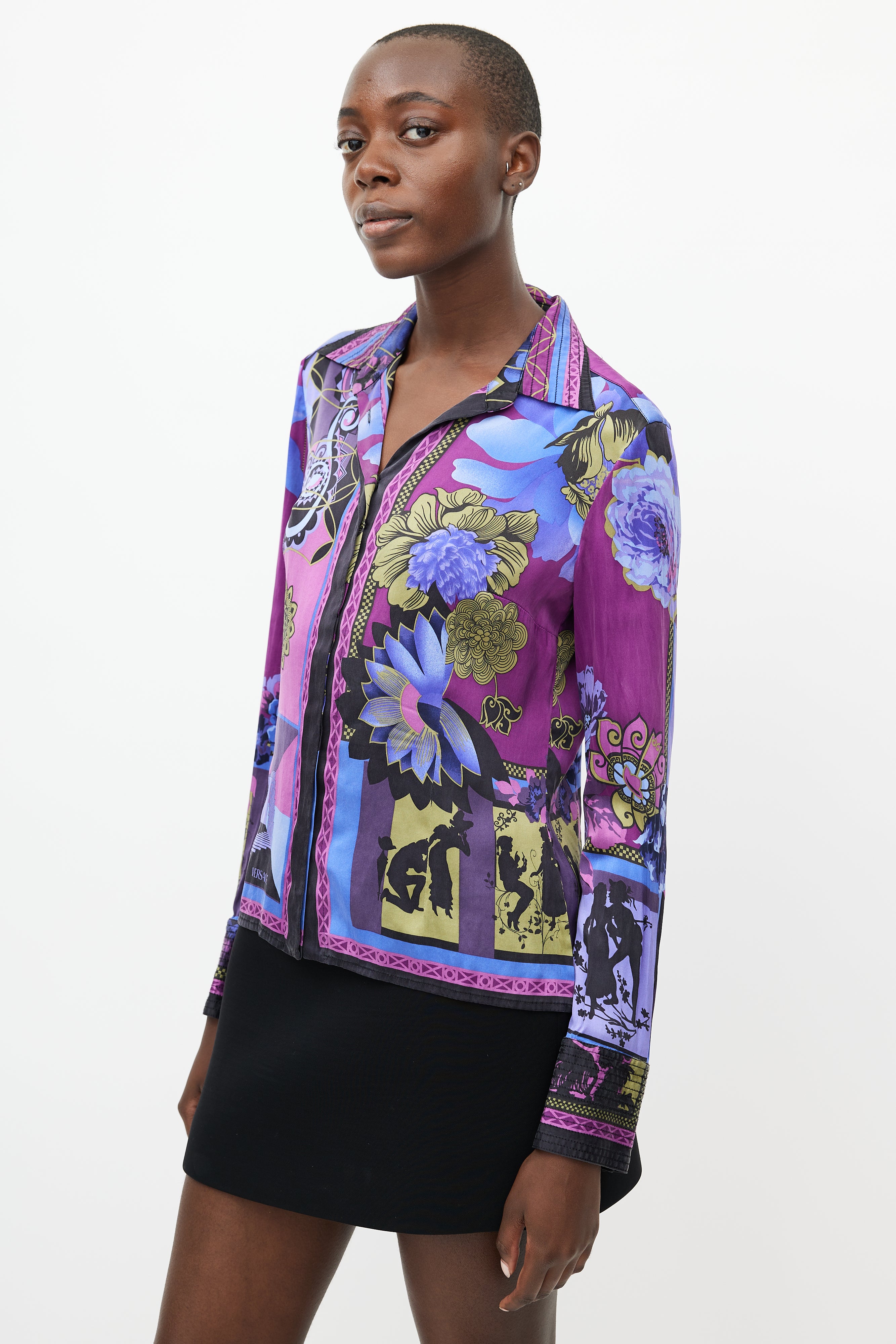 Pre-owned Versace purple silk shirt featuring a multicolour floral print throughout, pointed collar, long sleeves with buttoned cuffs, and button up front.