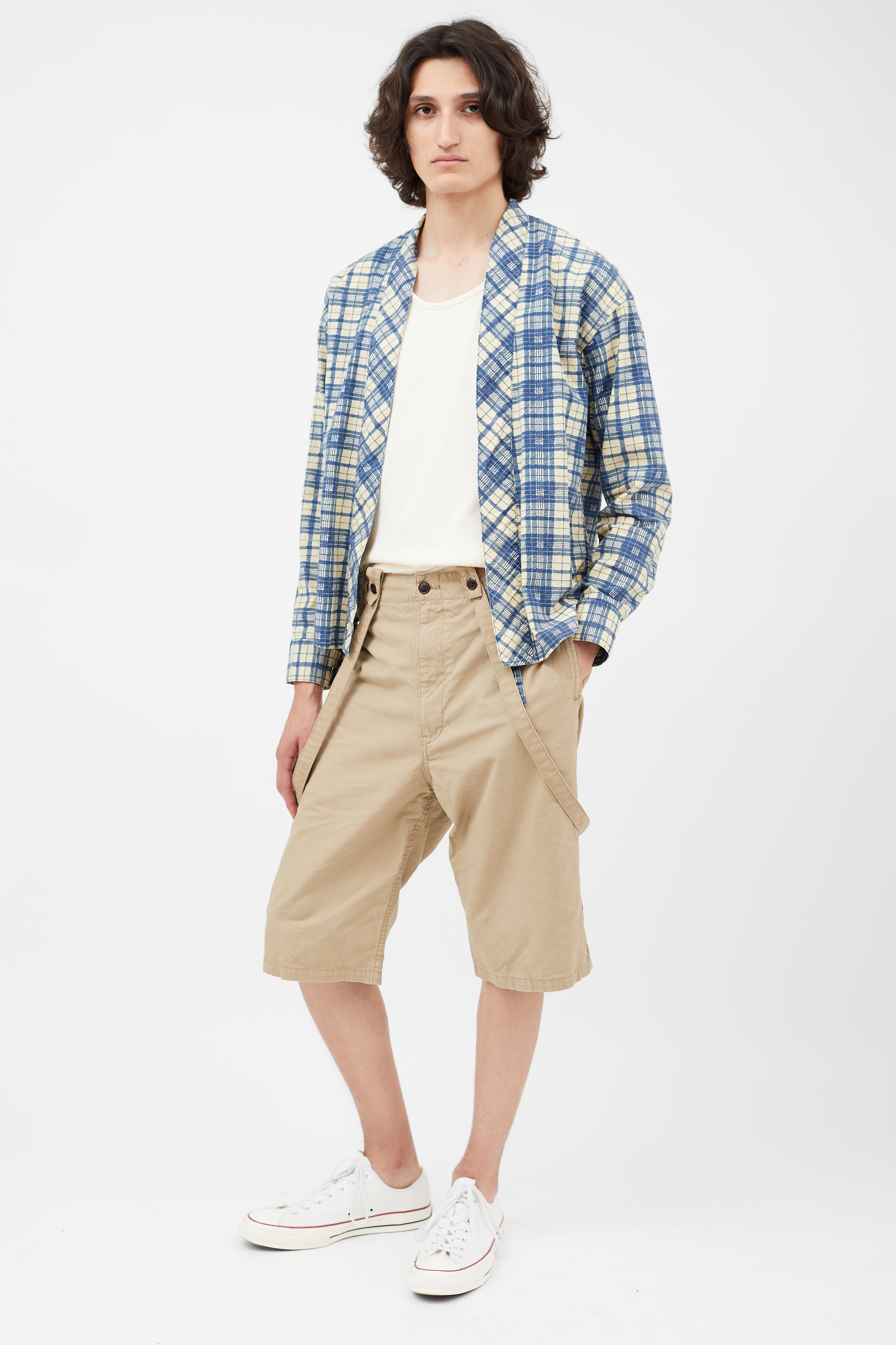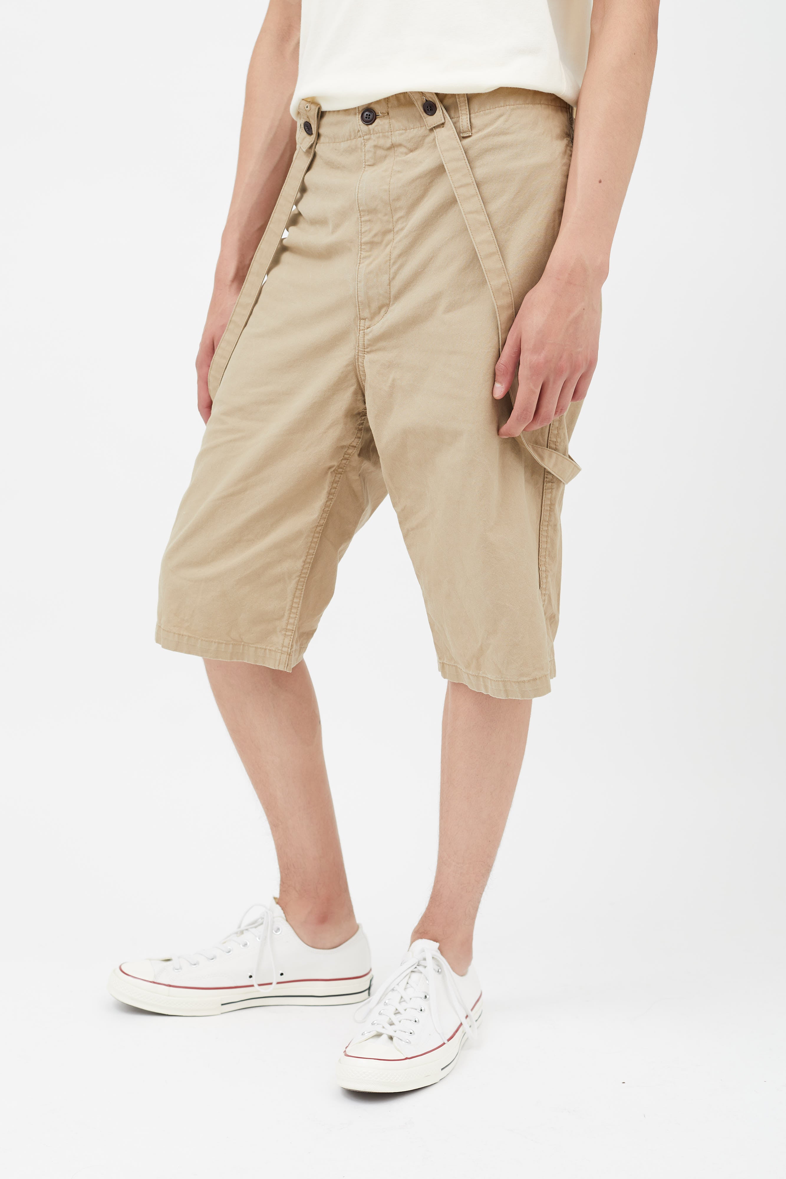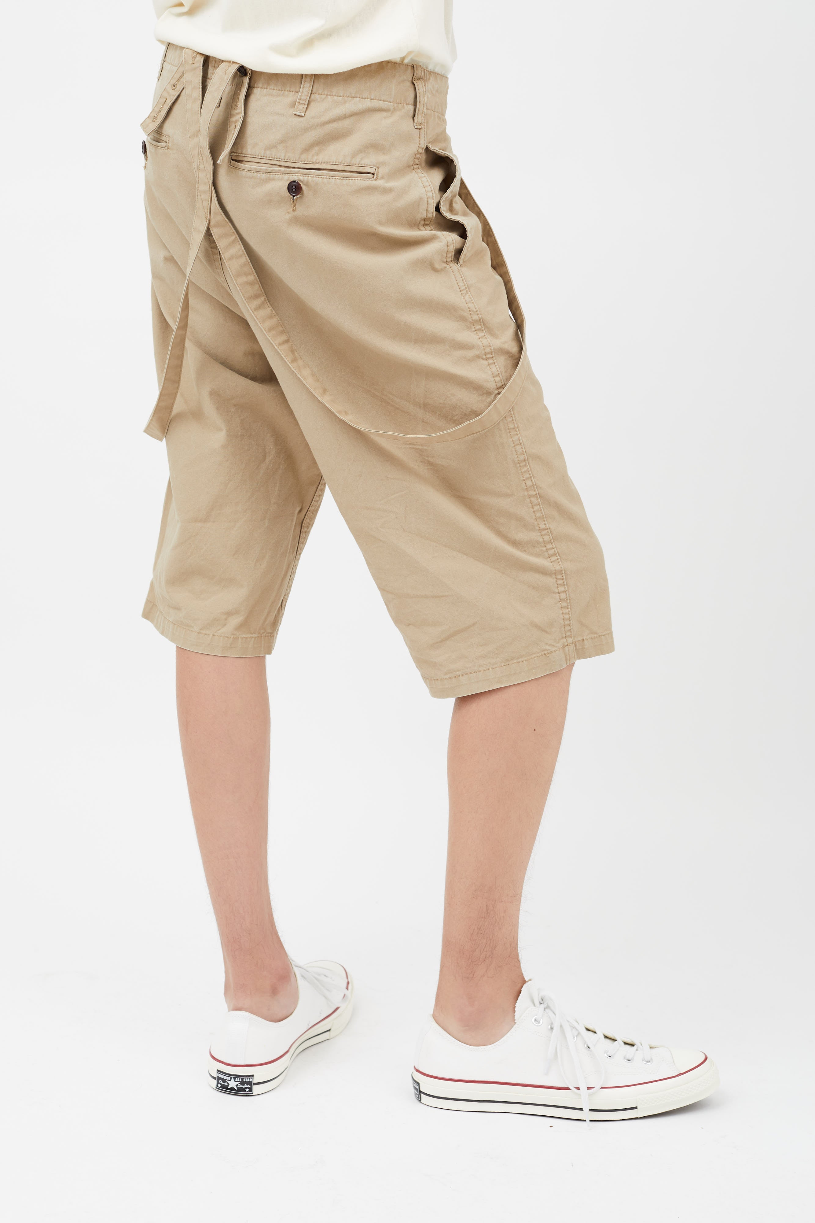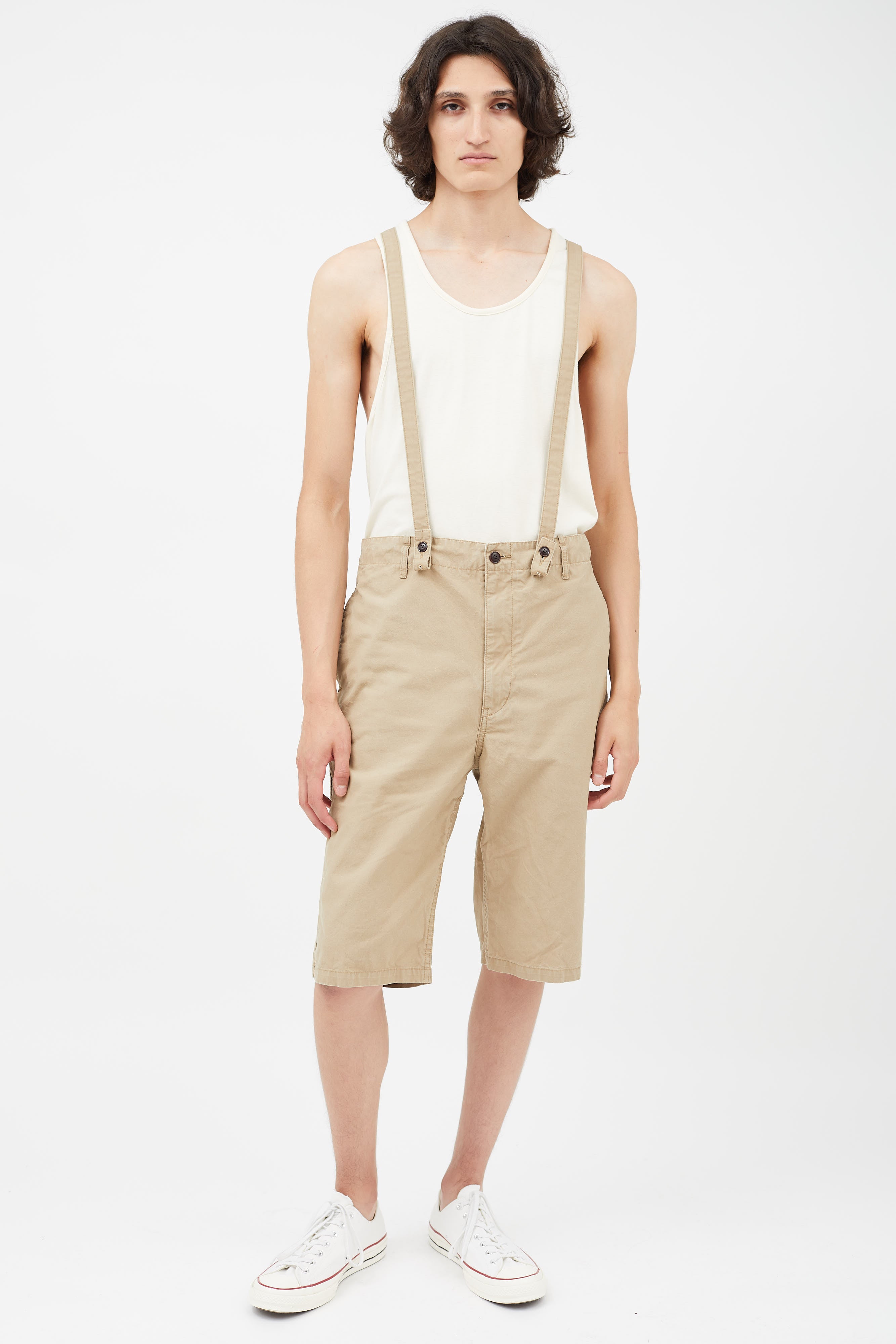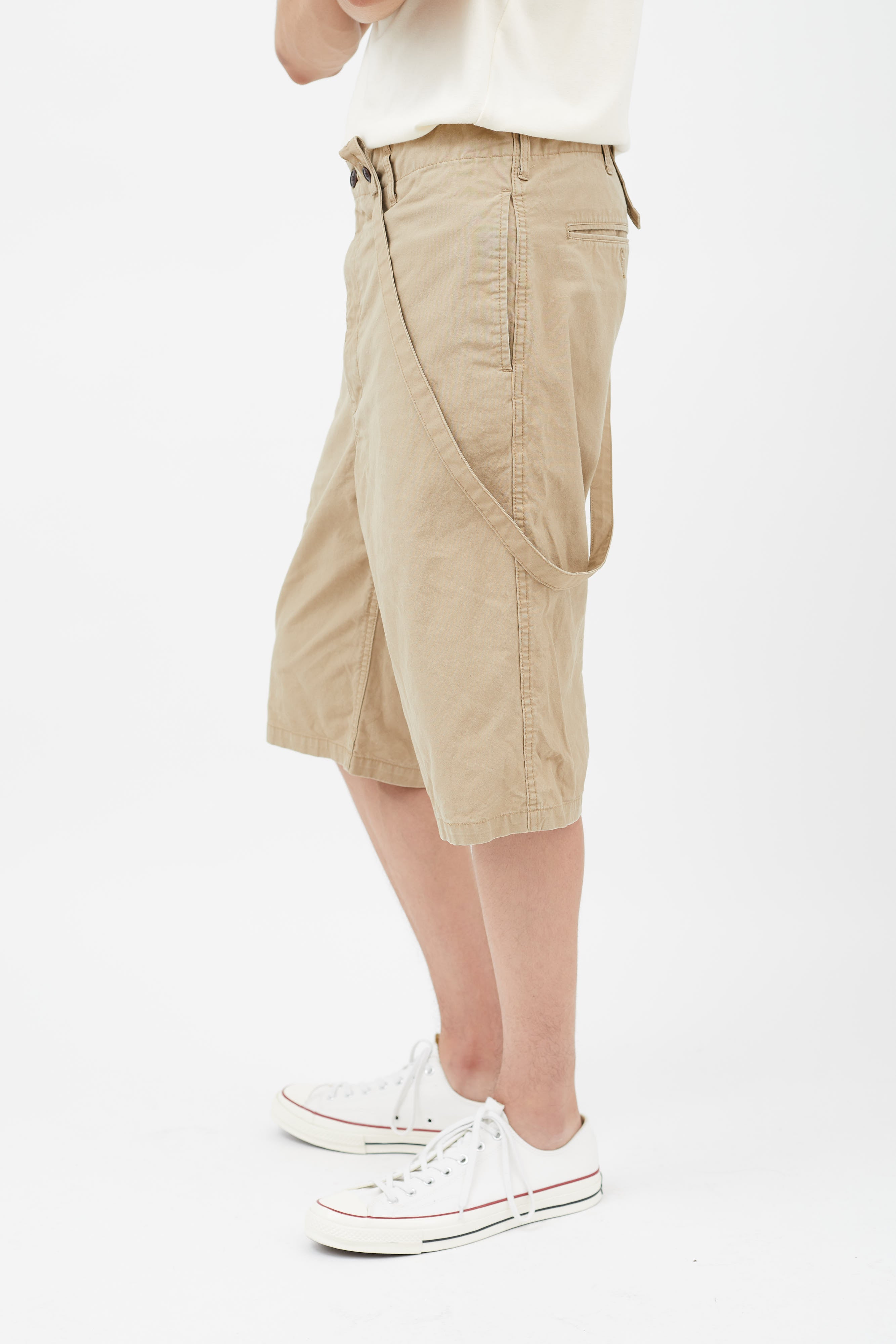 Pre-owned Visvim brown shorts featuring removable suspender detail, two slit pockets at hip, two buttoned welt pockets at back, and zip fly with button closure.