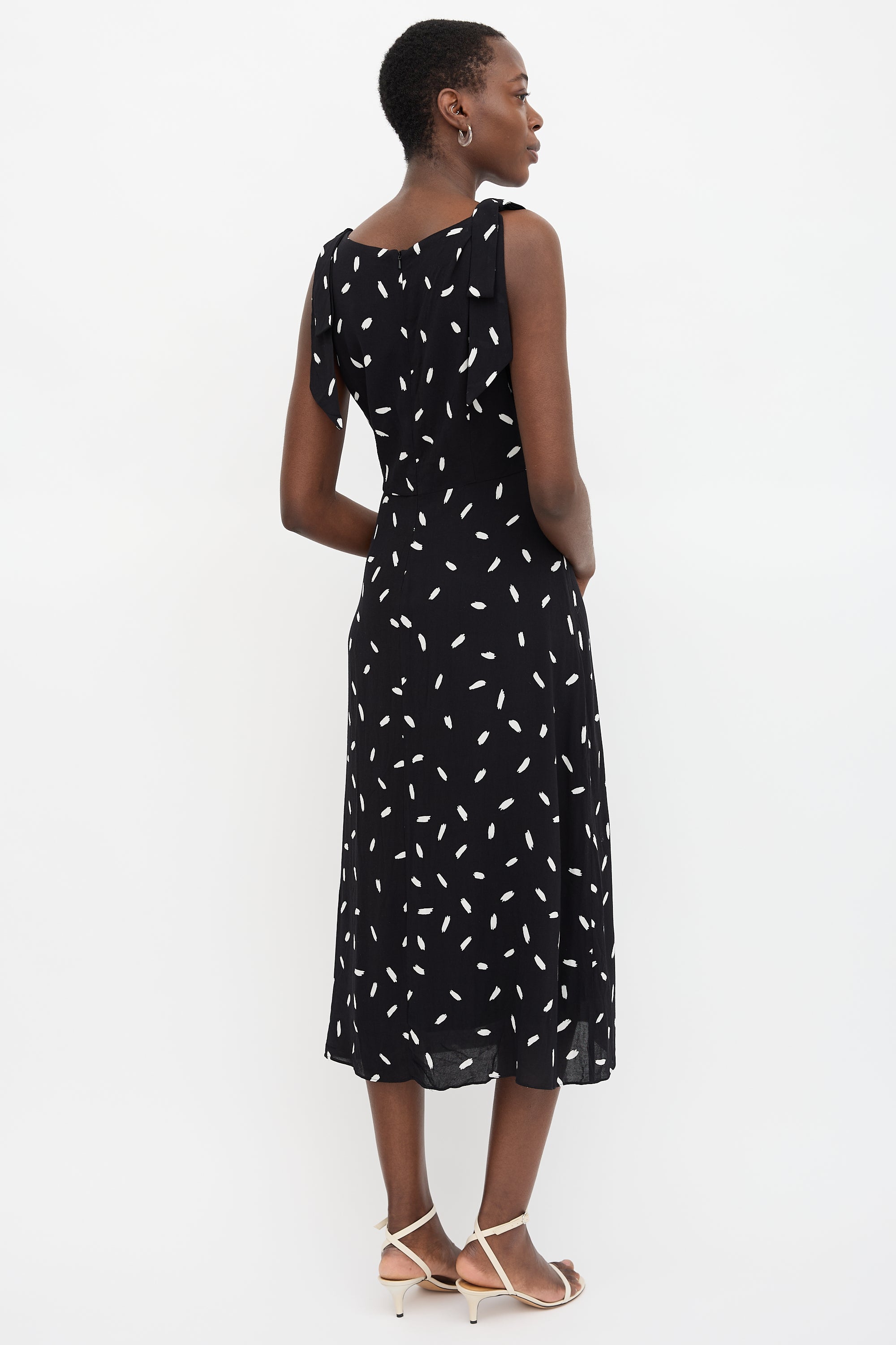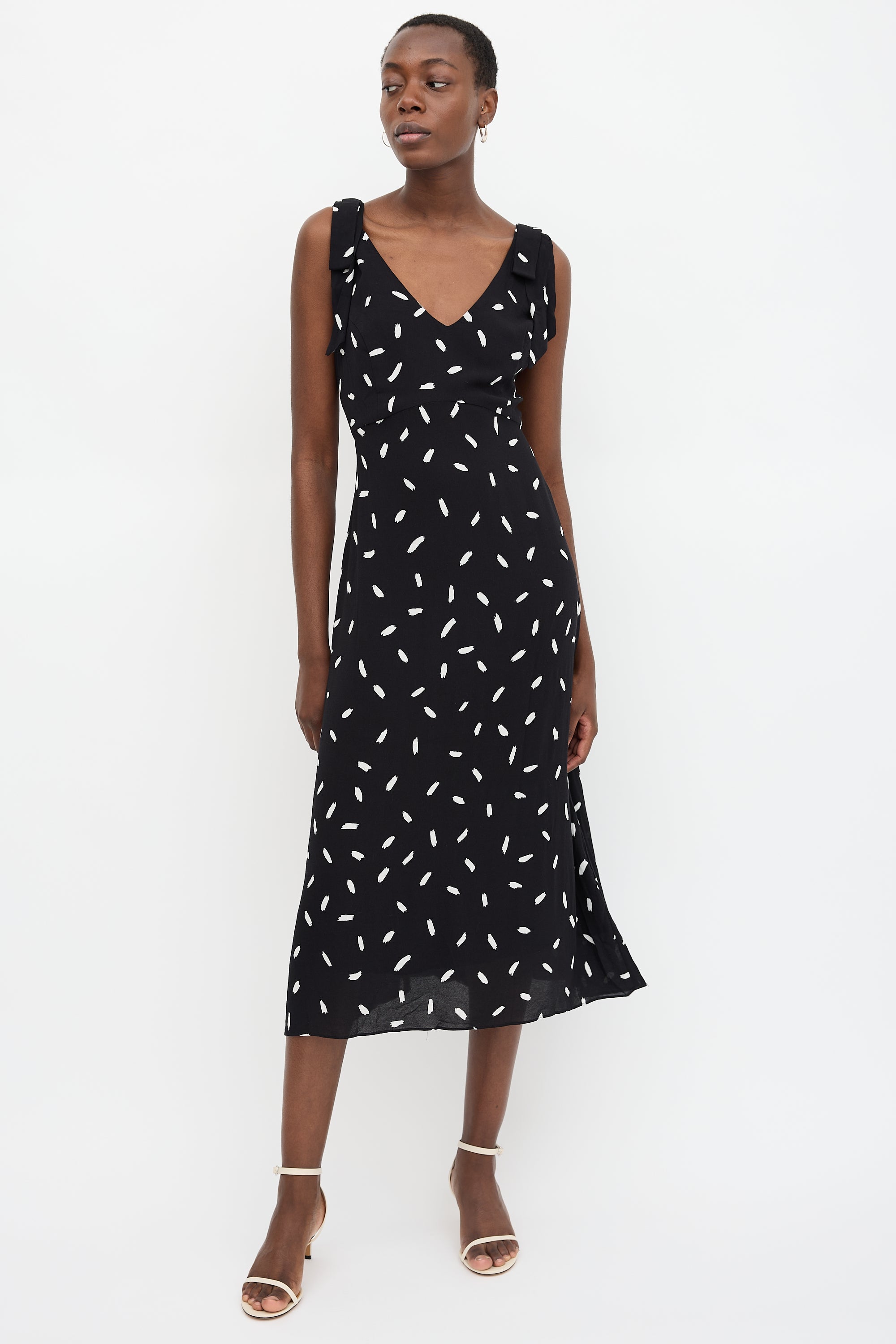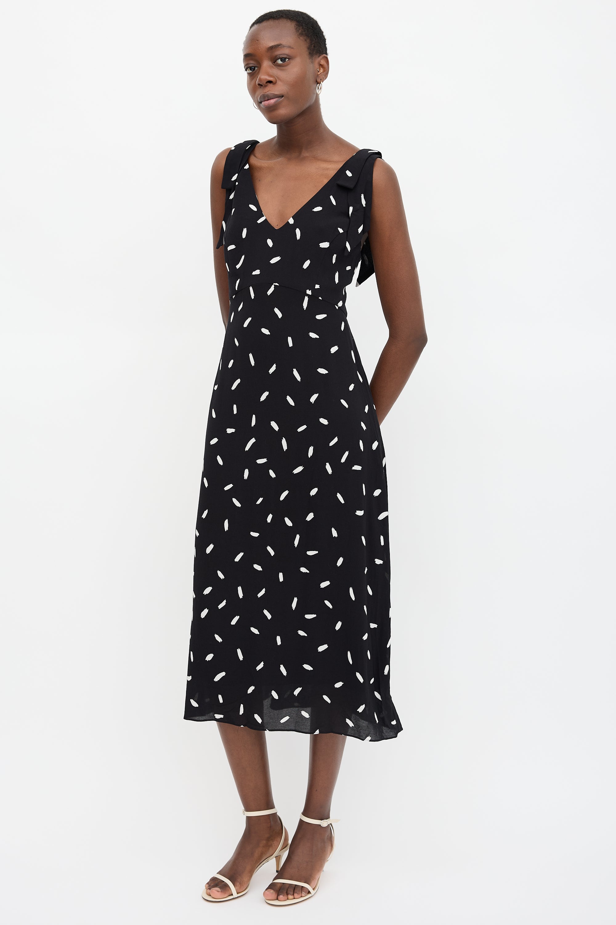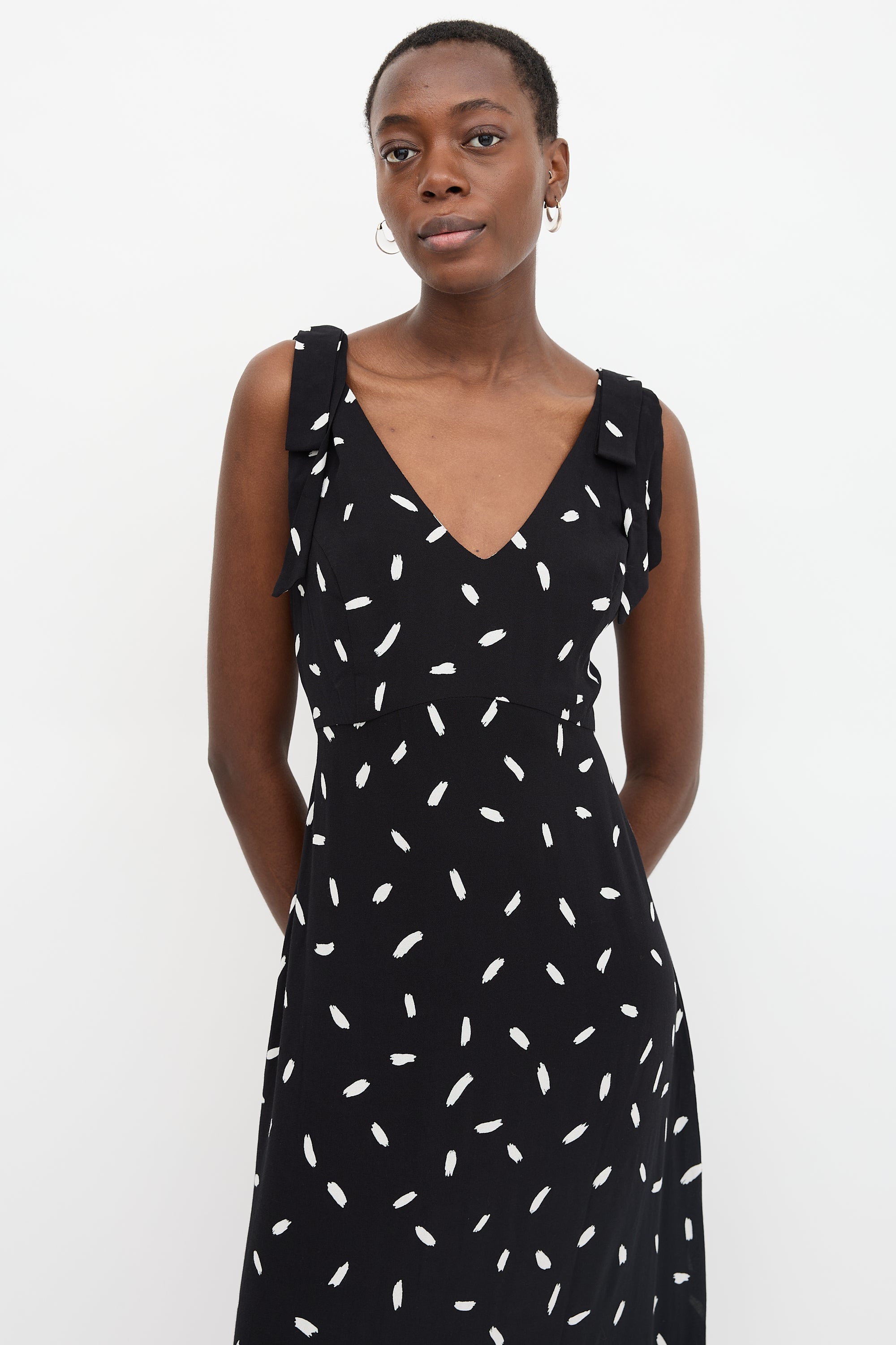 Pre-owned Zimmermann black dress featuring white dot print, V-neckline, shoulder bow detail, and concealed back zip. Lined. Clipped to fit model.