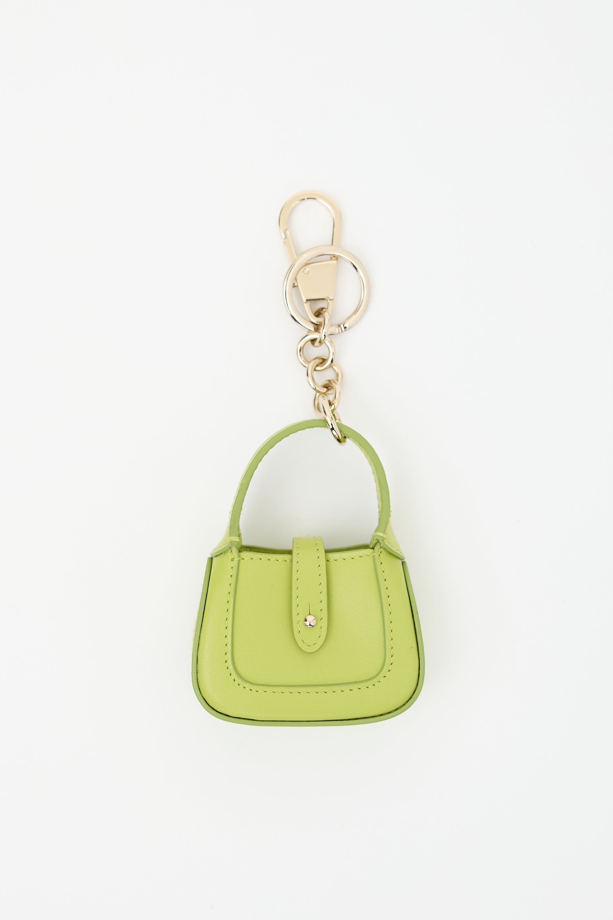 Pre-owned Gucci green leather Jackie 1961 keychain featuring pale gold hardware, lobster clasp closure, O-ring, top strap with push pin closure, and one main compartment.