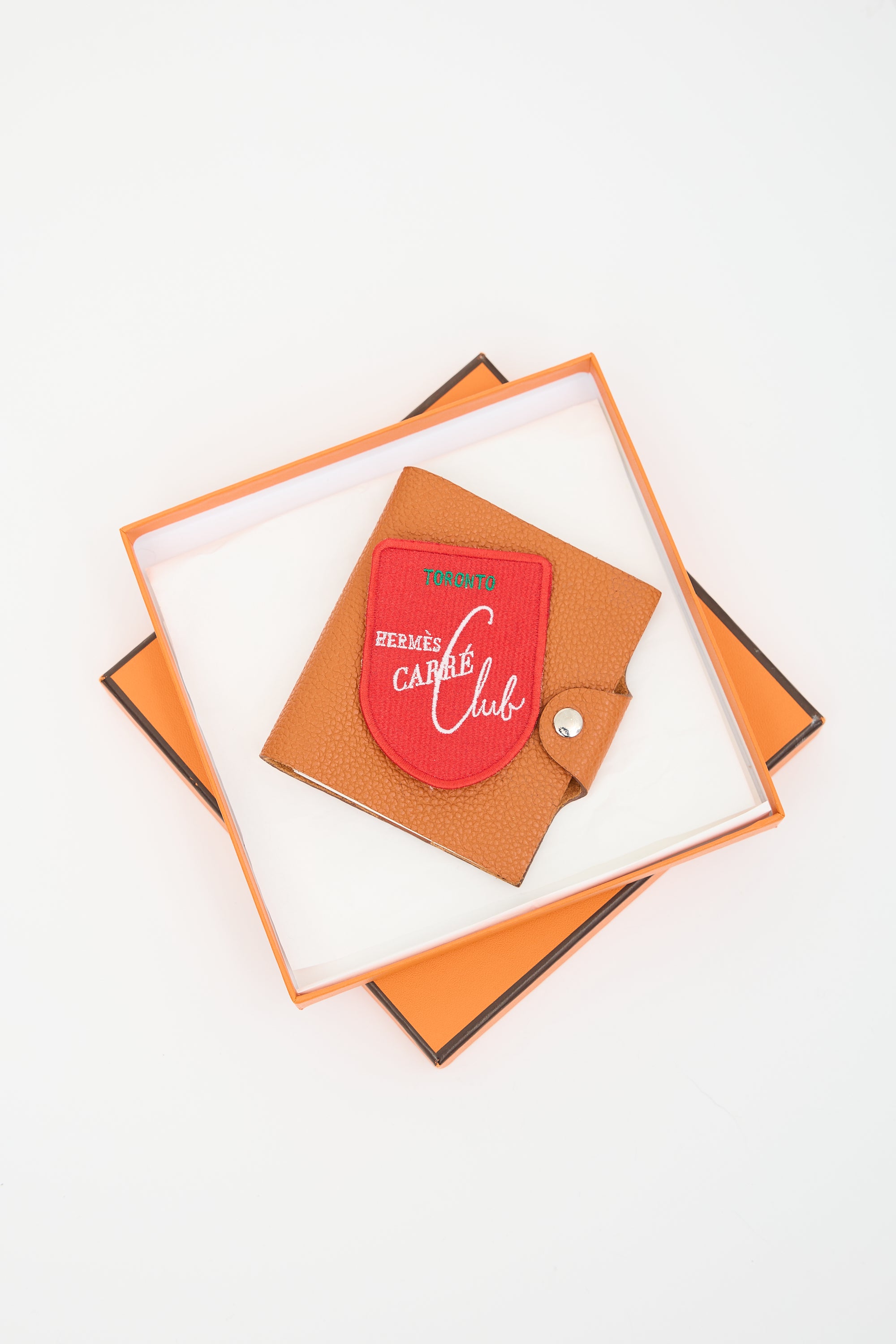 Pre-owned Hermès 2008 orange Ulysses notebook in Togo calfskin leather featuring silver tone hardware, debossed logo studs, side strap closure, and coil notepad. Comes with embroidered patch and original box.