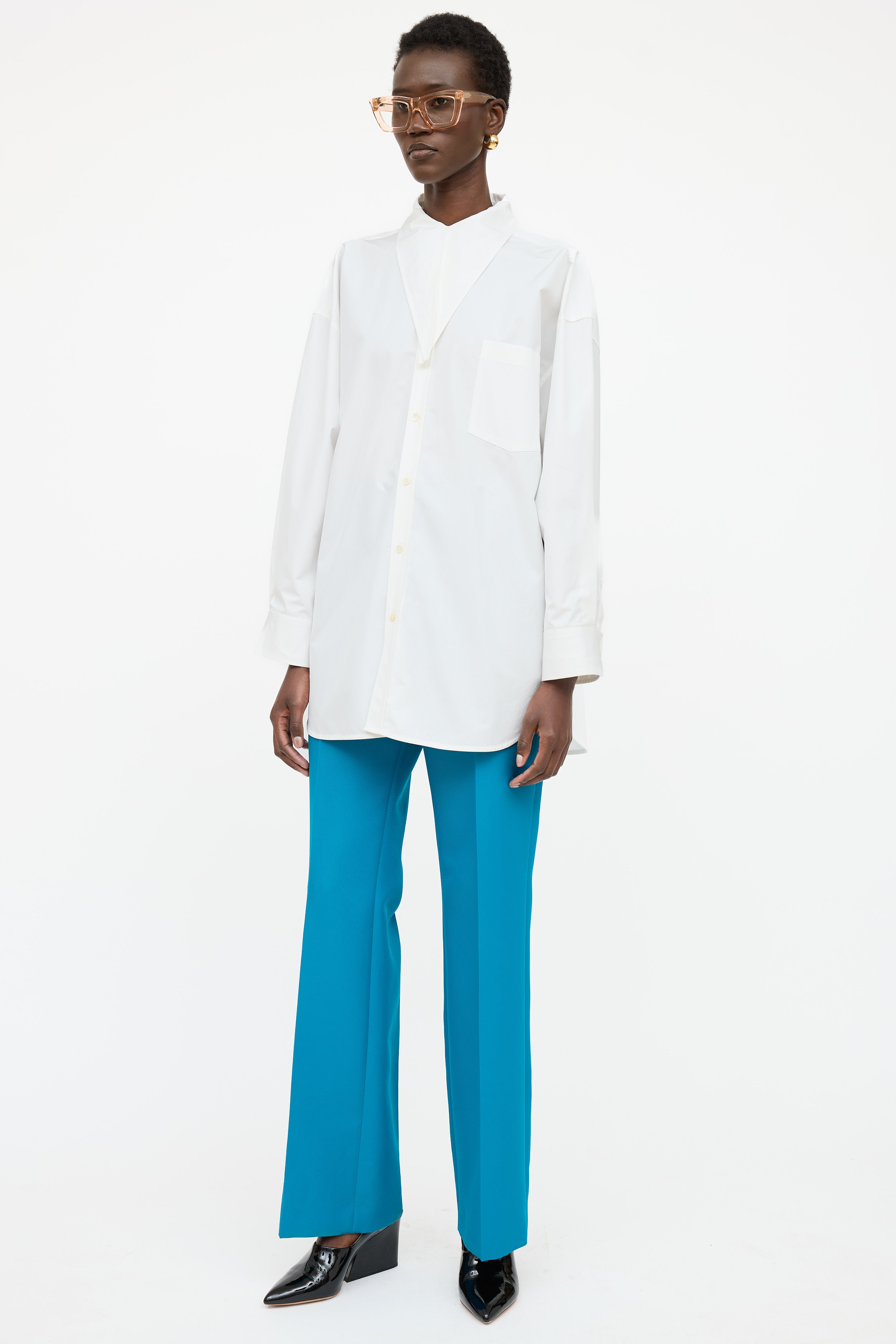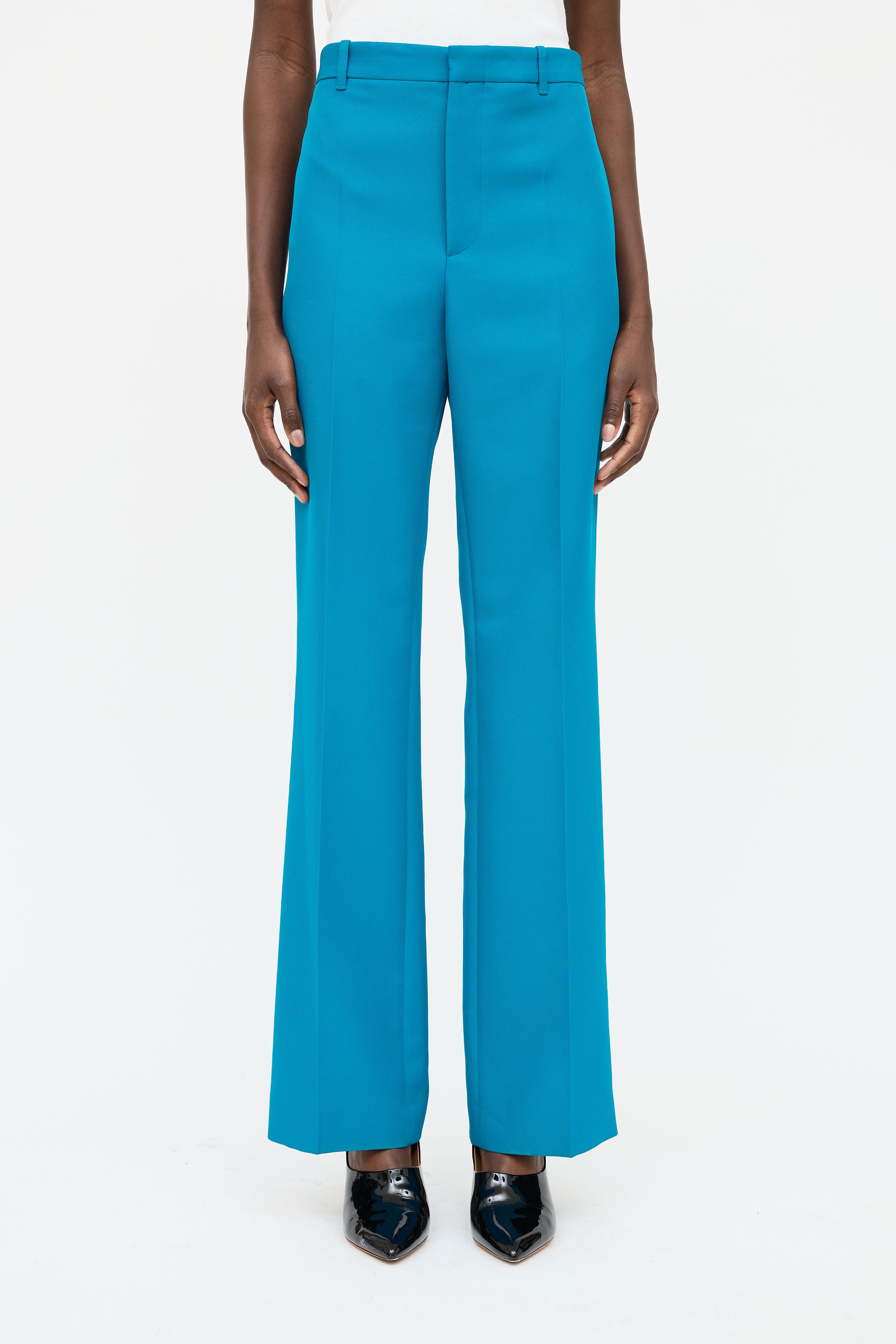 Pre-owned Balenciaga 2019 teal straight pant featuring hooked zip closure, belt loops, slit pockets at hip, and centre crease at front.