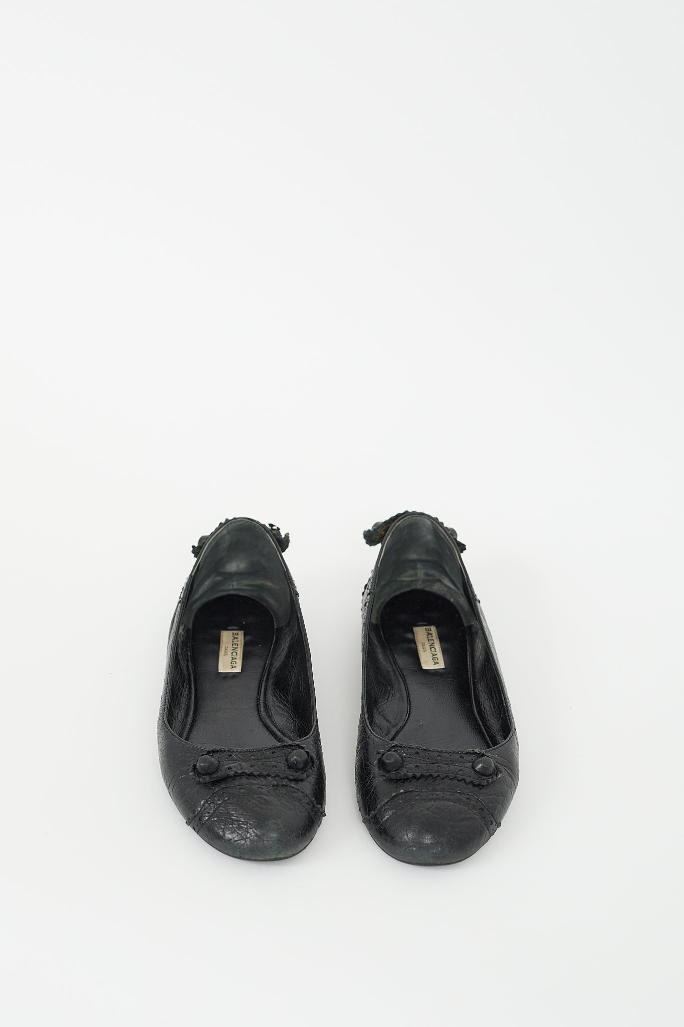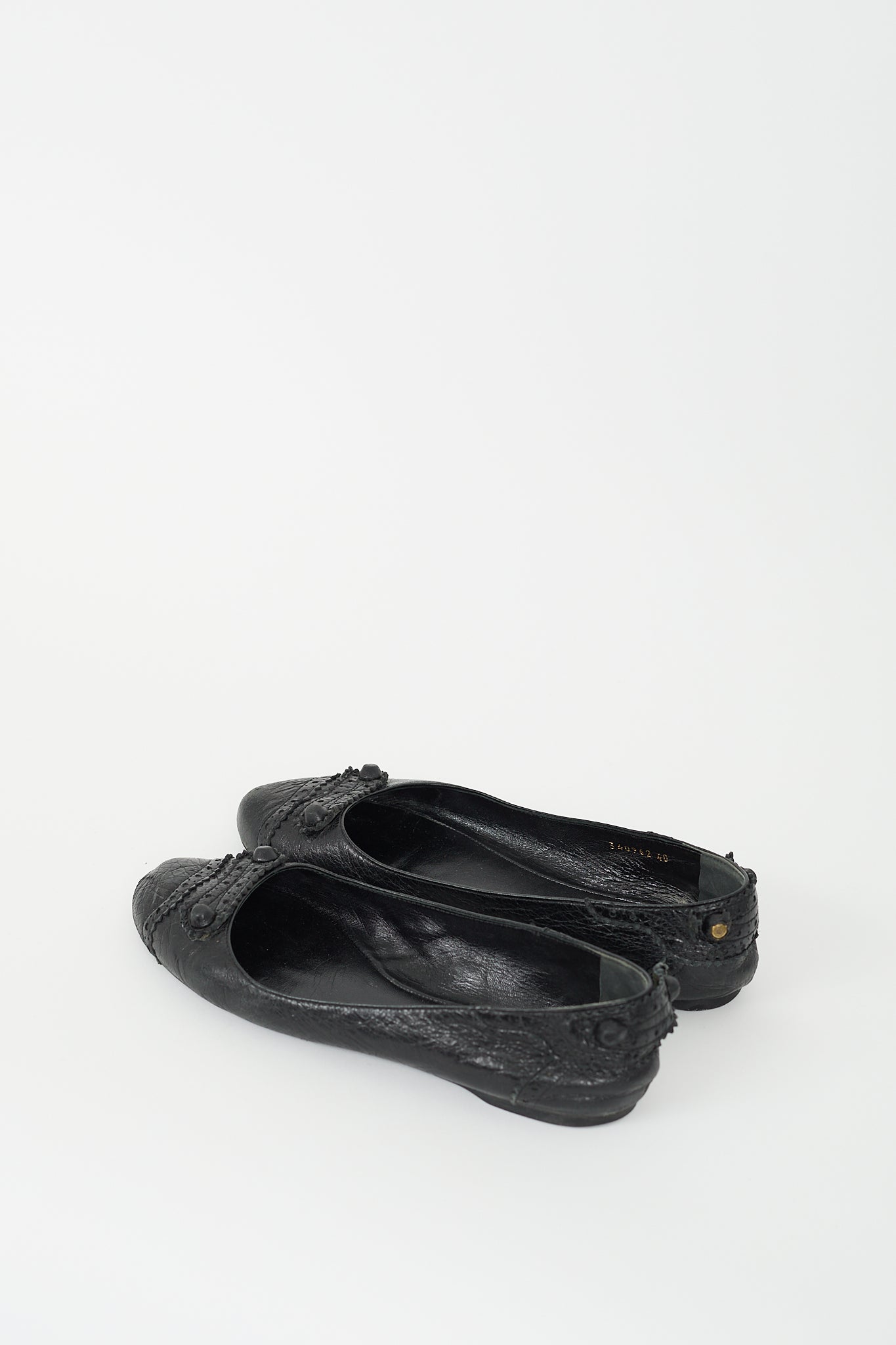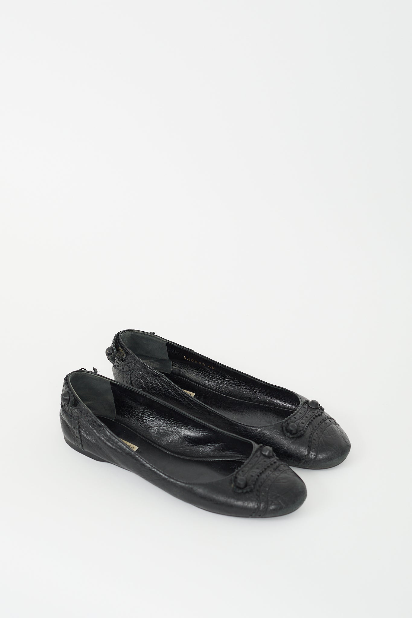 Pre-owned Balenciaga black leather Arena ballet flat featuring rounded toe, brogue detailing throughout, tonal leather covered studs at vamp and counter, rubber outsole, and slip on entry.