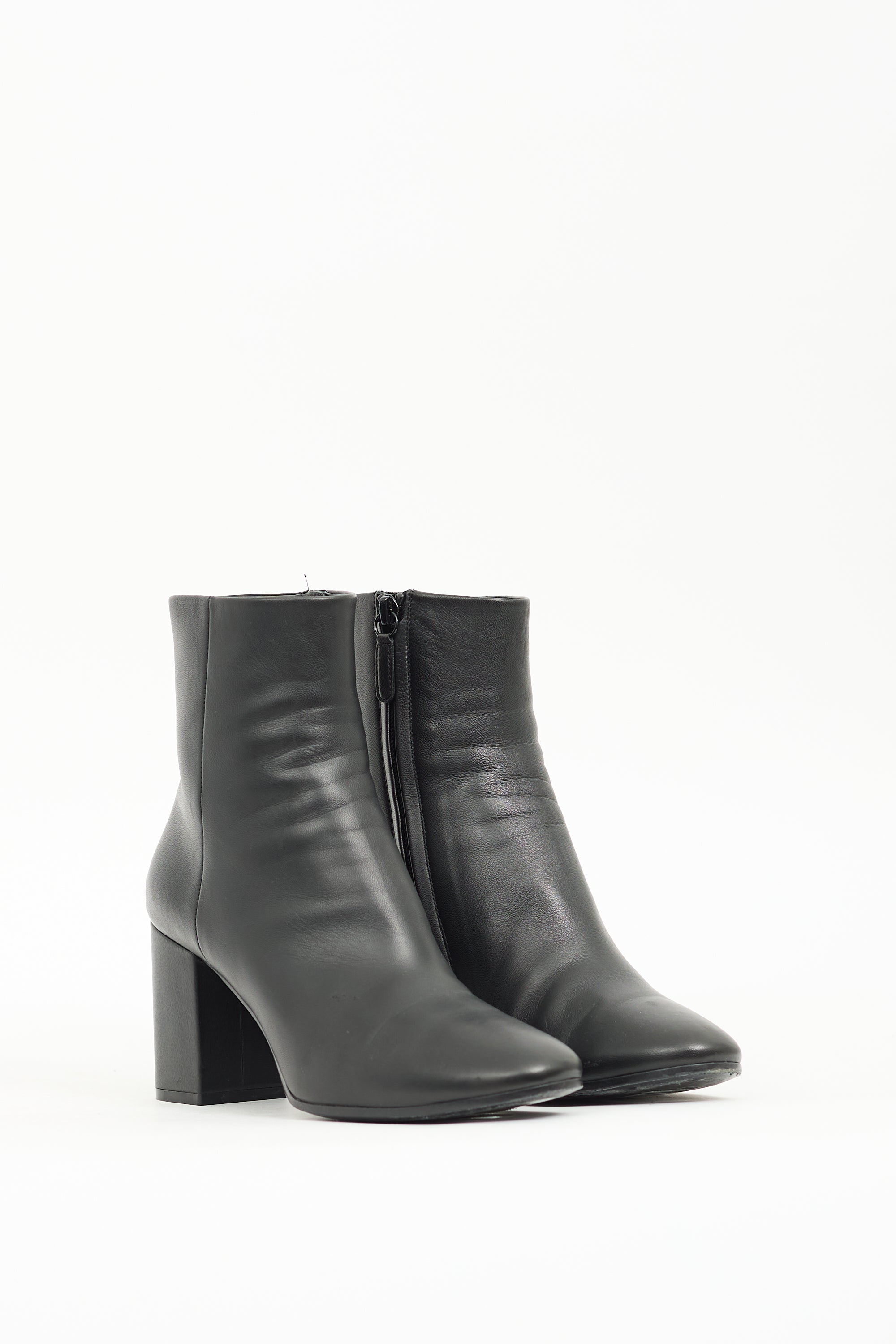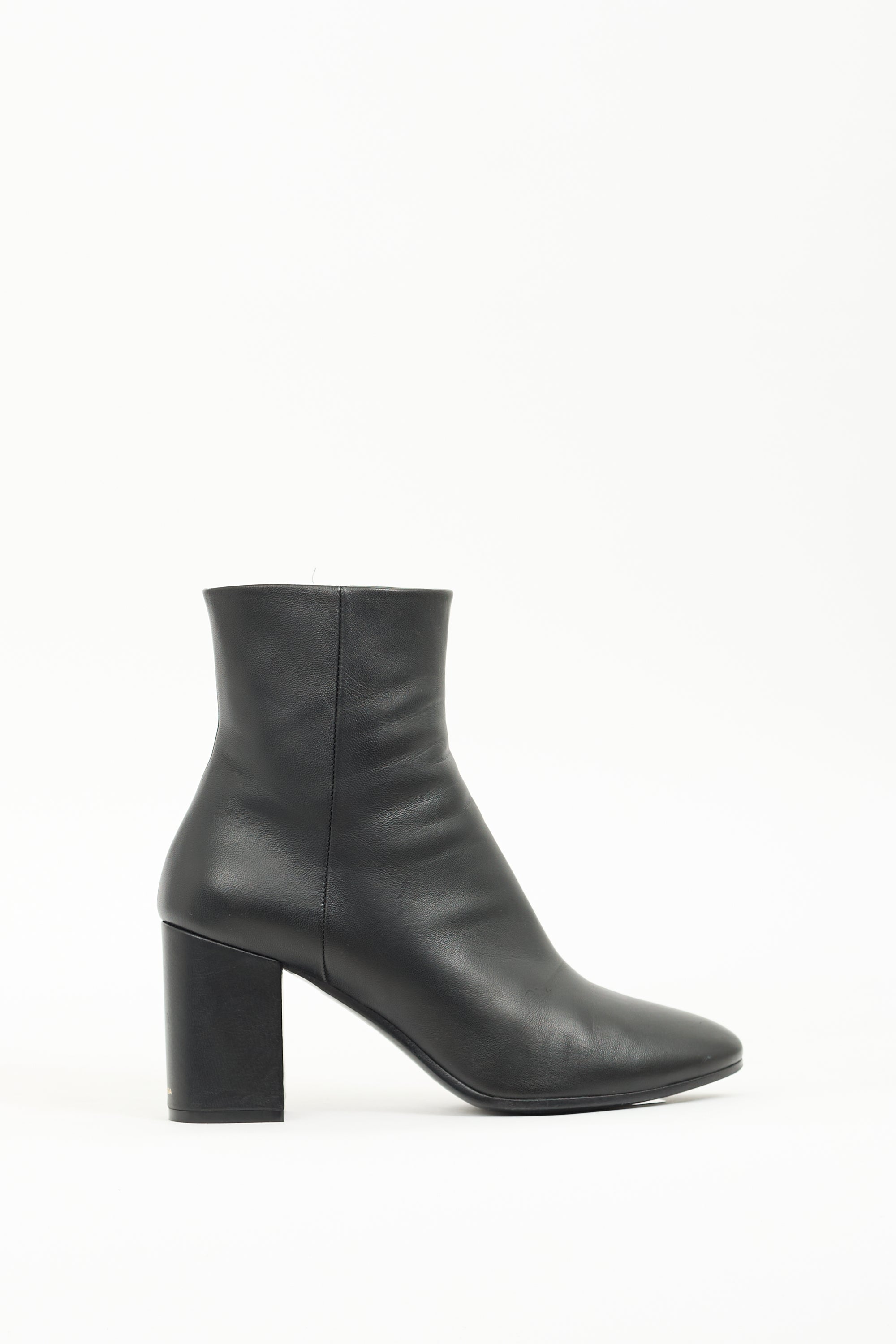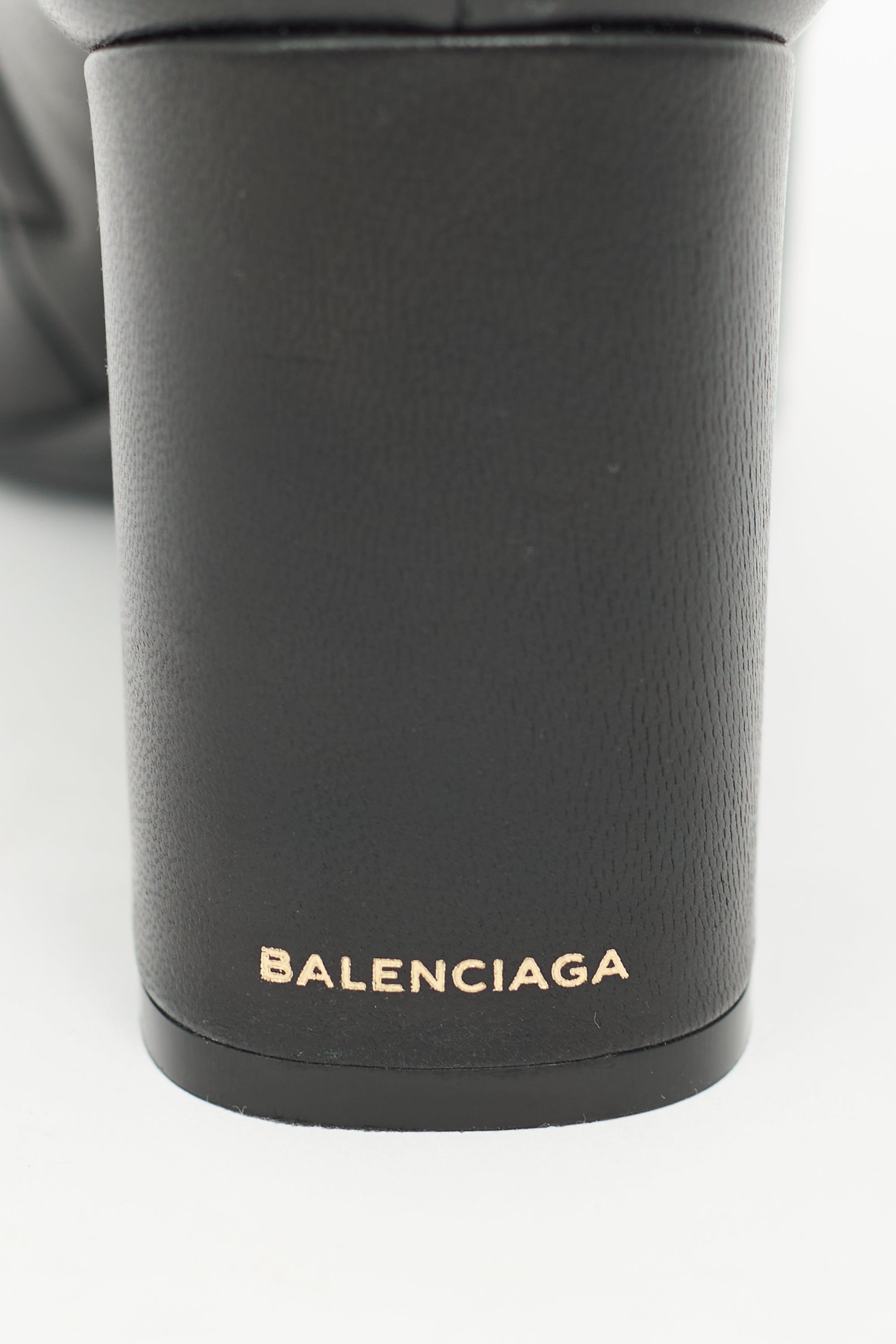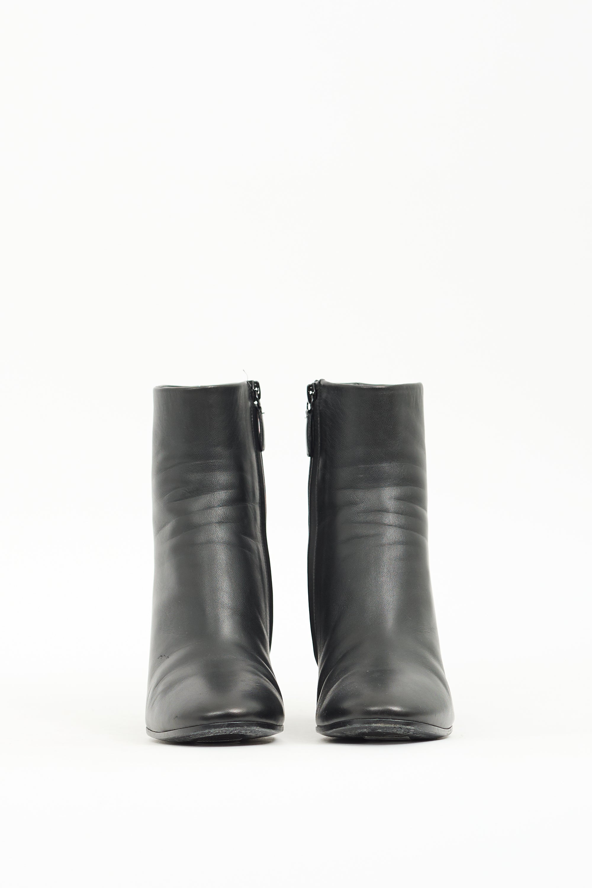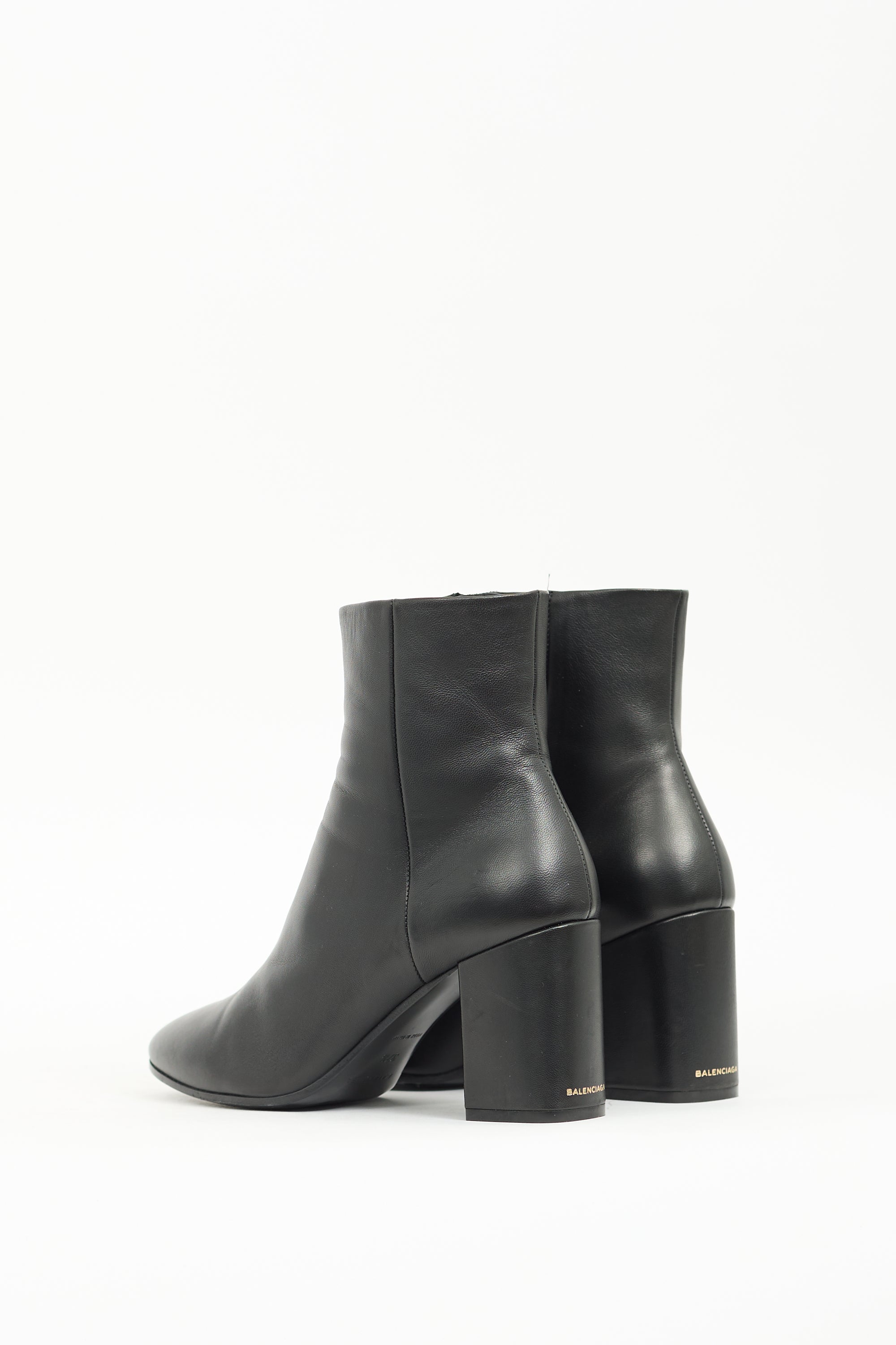 Pre-owned Balenciaga black leather heeled ankle boots featuring rounded toe, side zip closure, stamped logo at heel, and covered block heel. Comes with original dust bag.