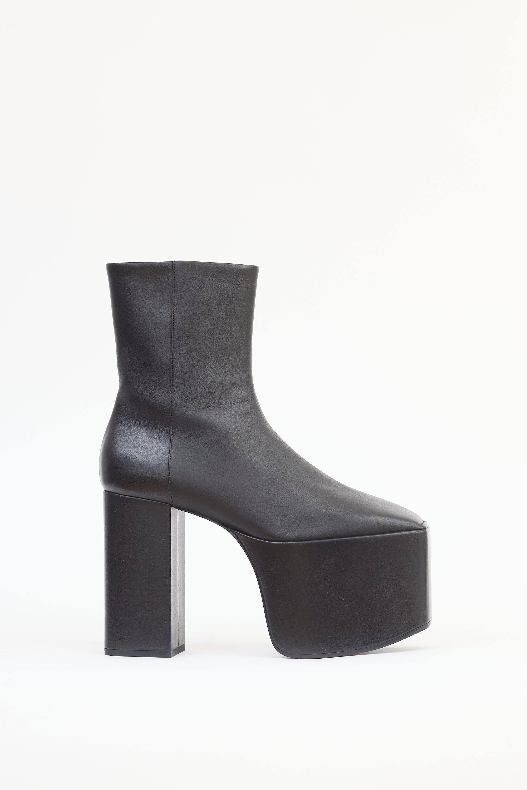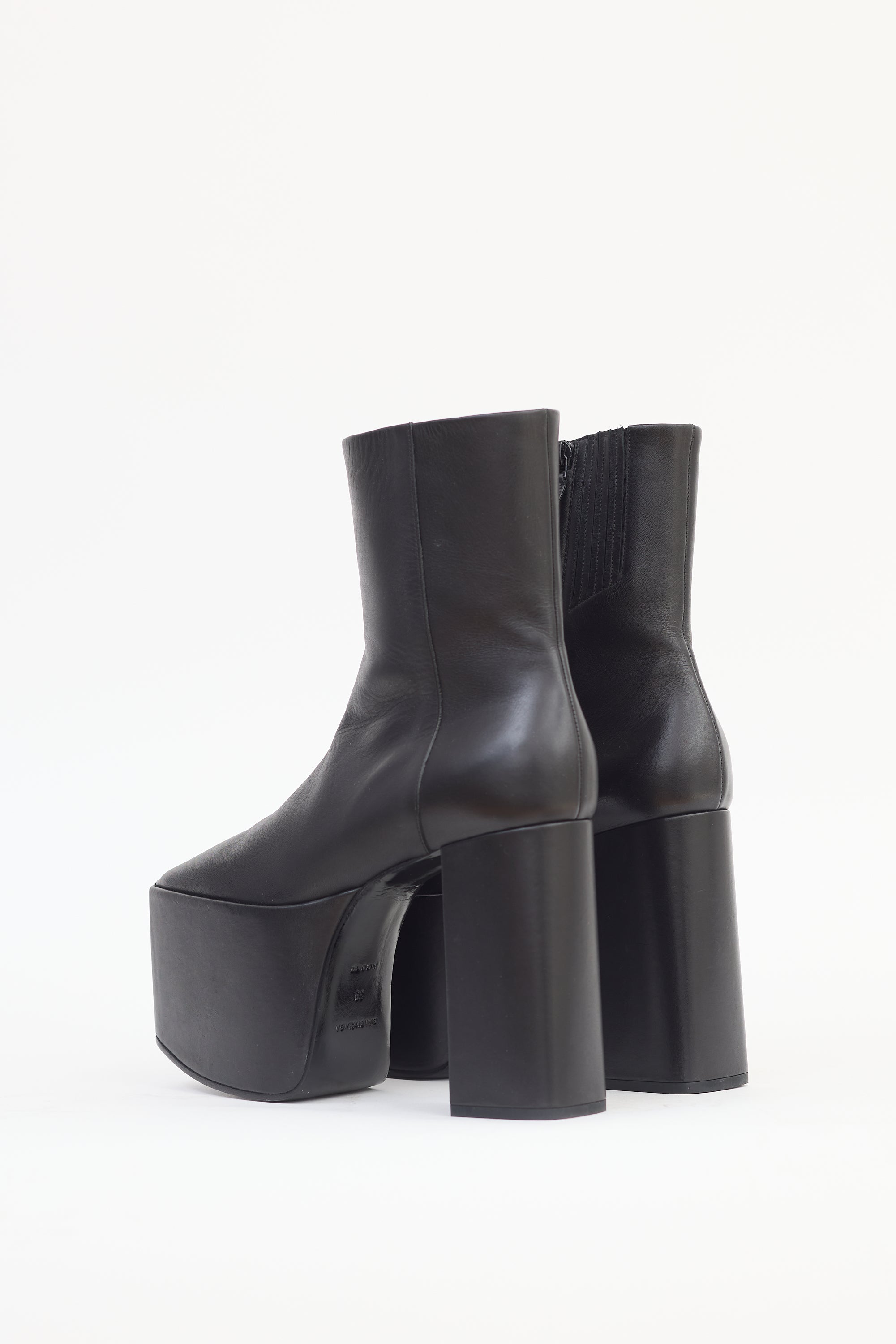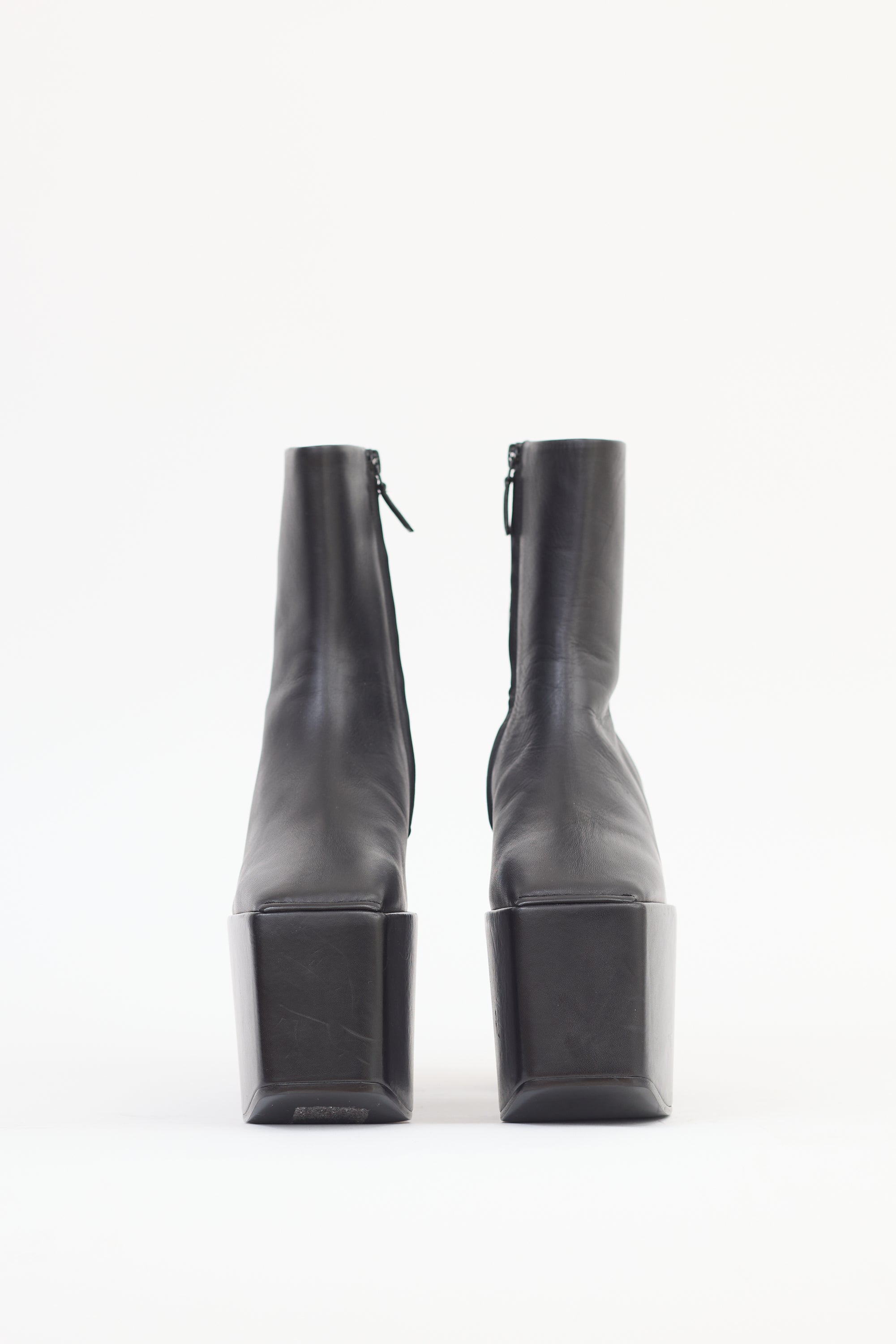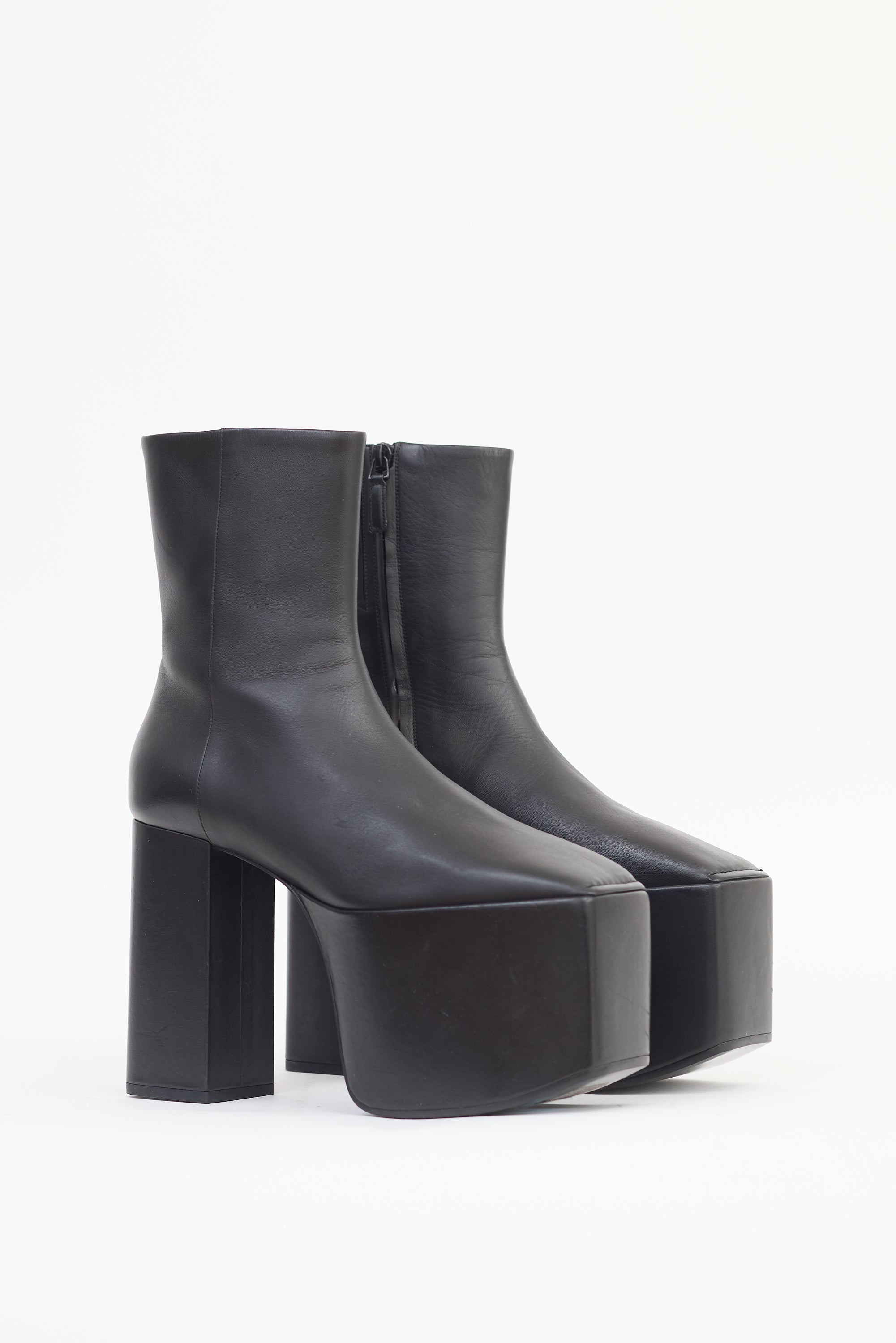 Pre-owned Balenciaga black leather boots featuring a square toe, platform midsole, wrapped block heel, ankle height shaft, and zip closure at side.