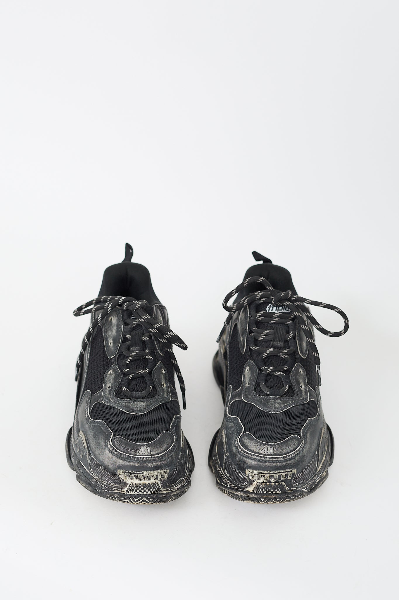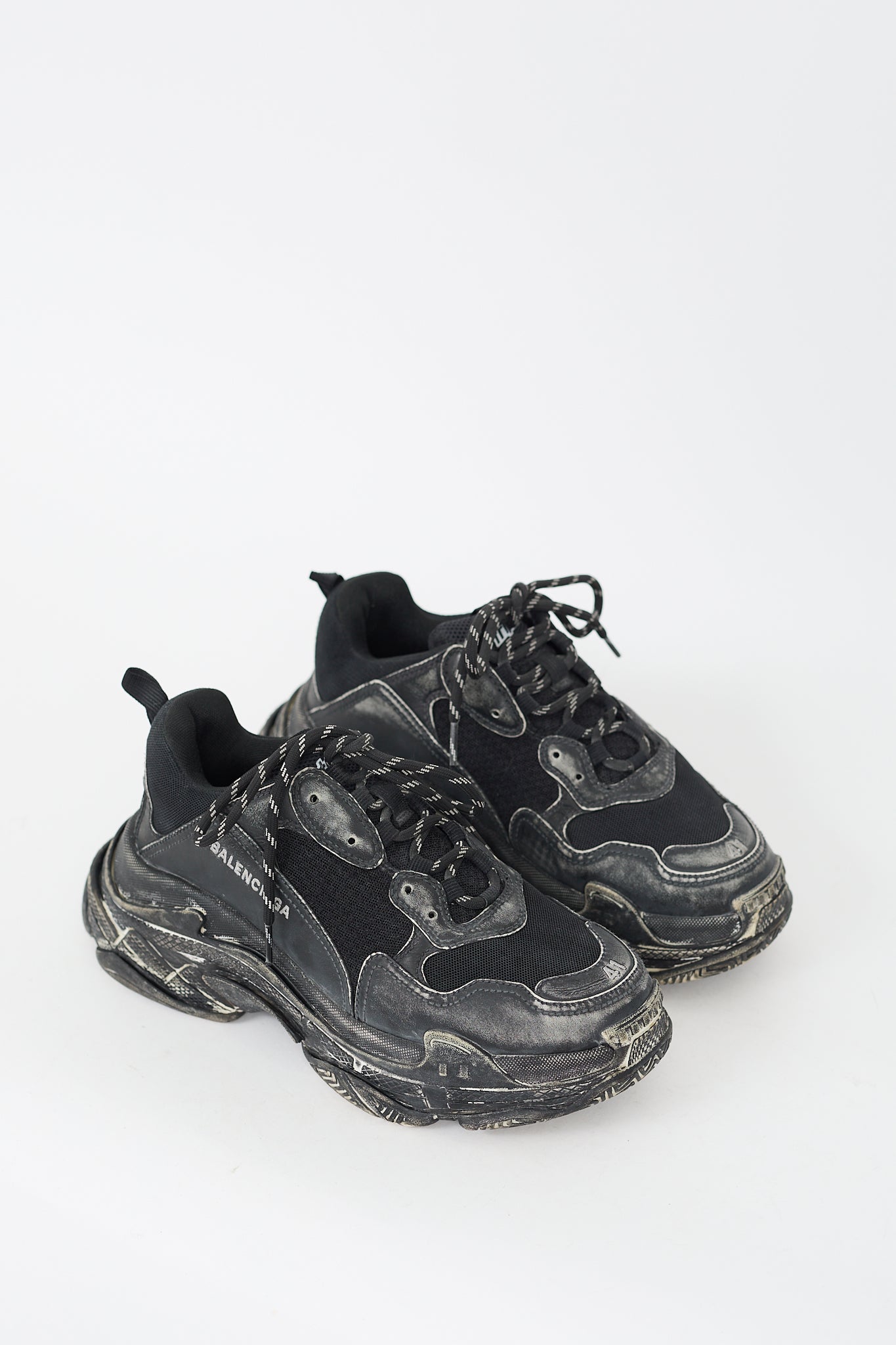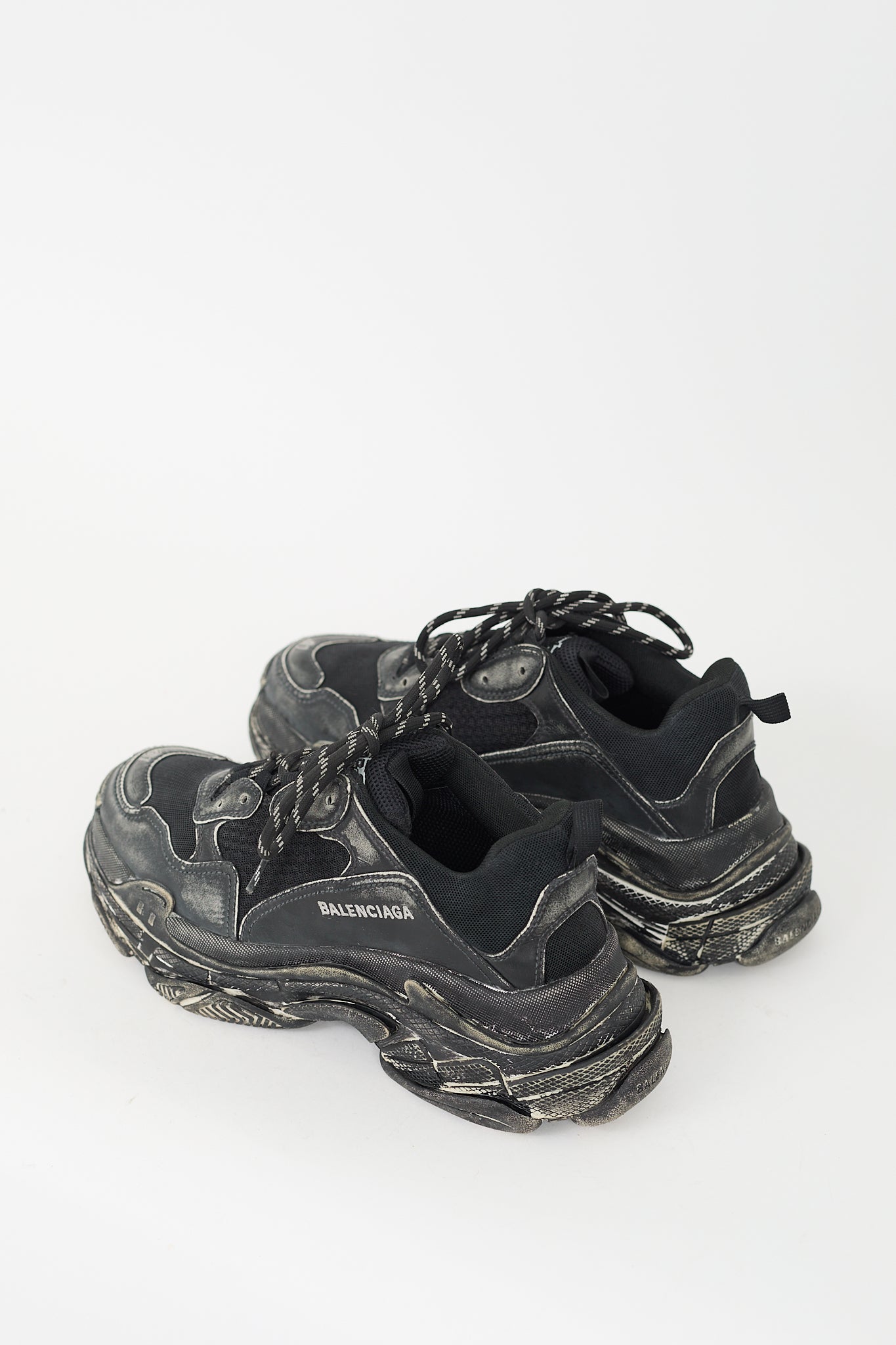 Pre-owned Balenciaga black leather Triple S Faded sneakers featuring rounded toe with "41" embroidery, lace up front, leather and mesh panelling at upper, pull tab at heel and tongue, and chunky midsole.