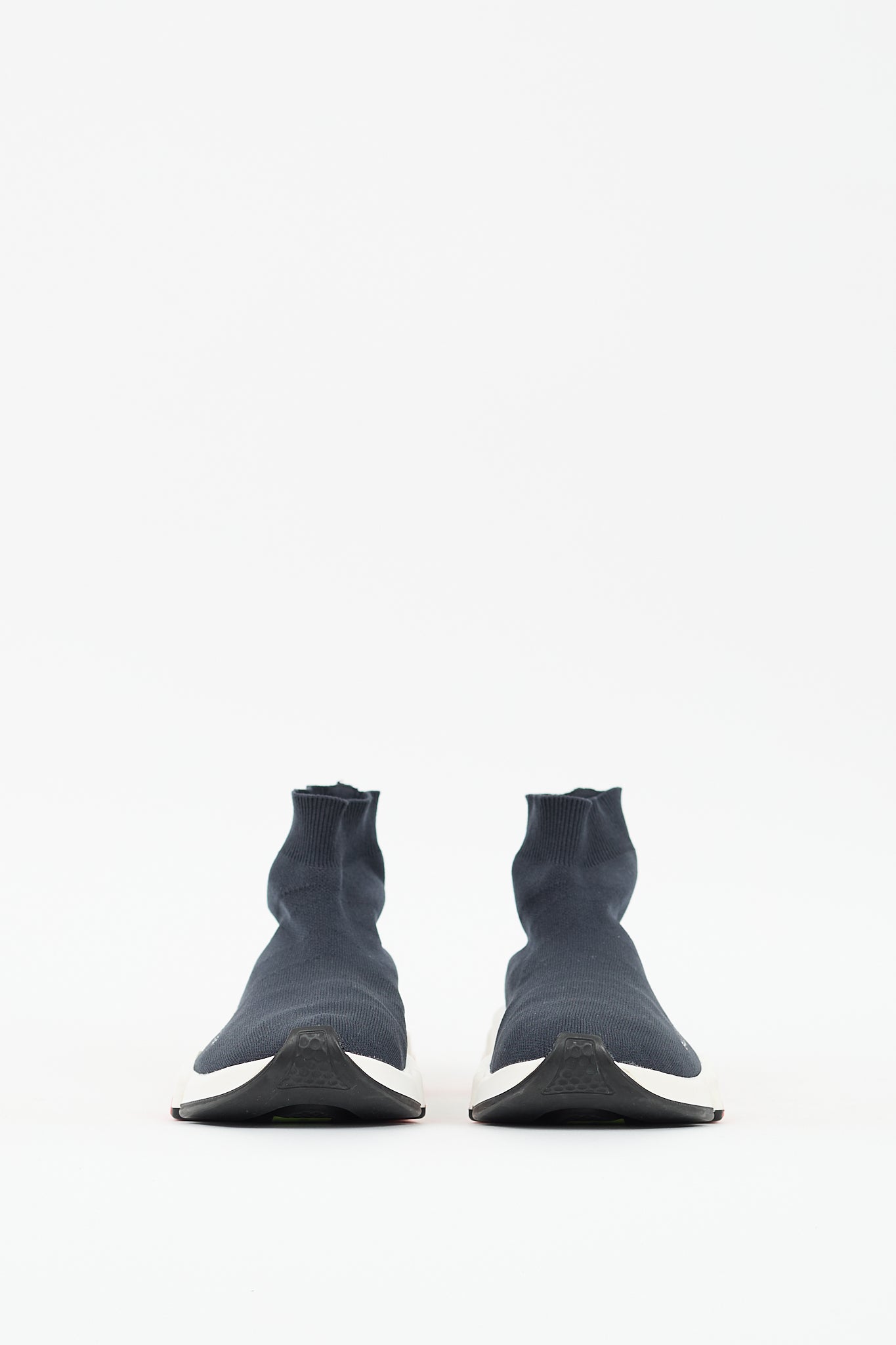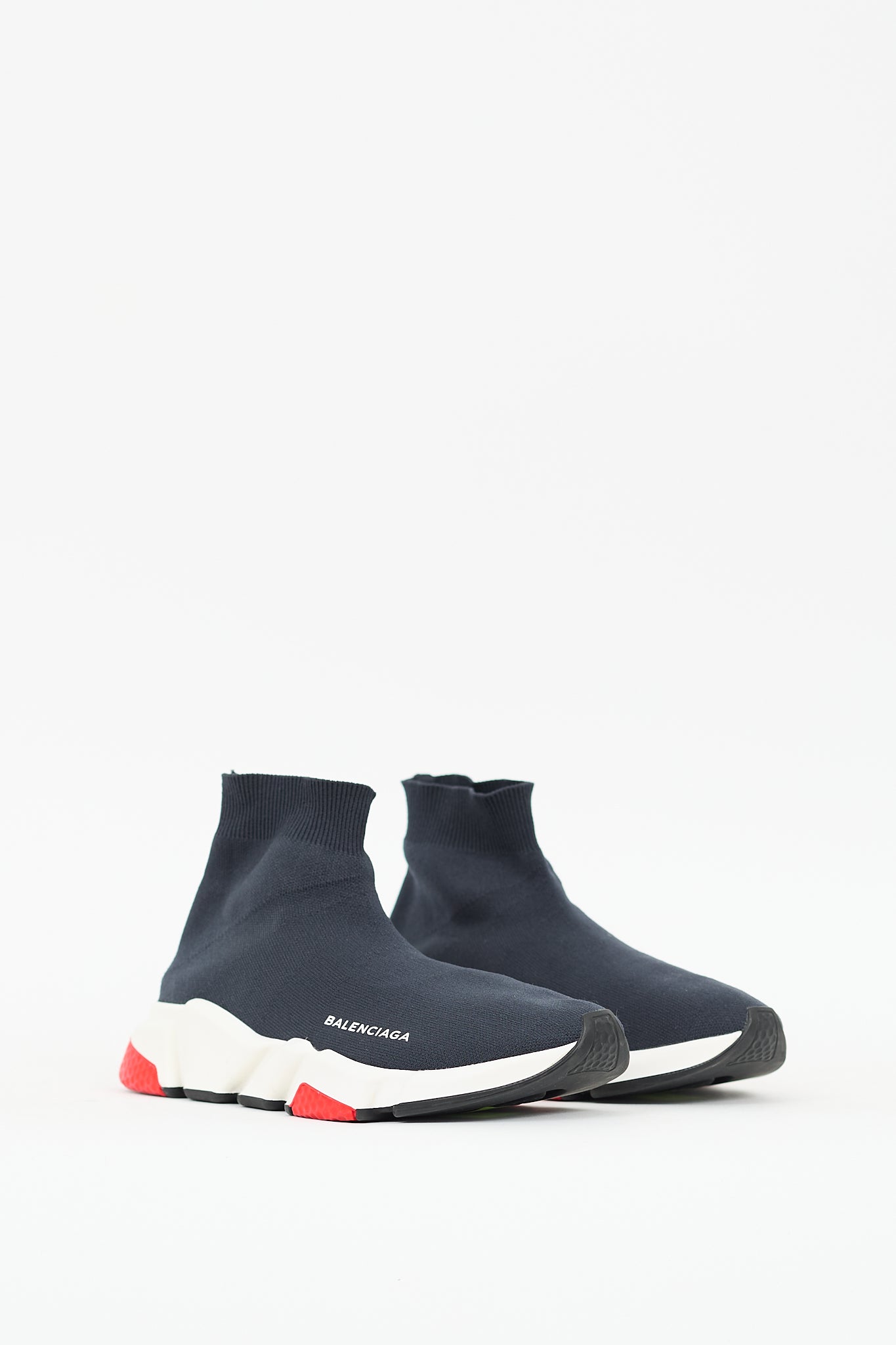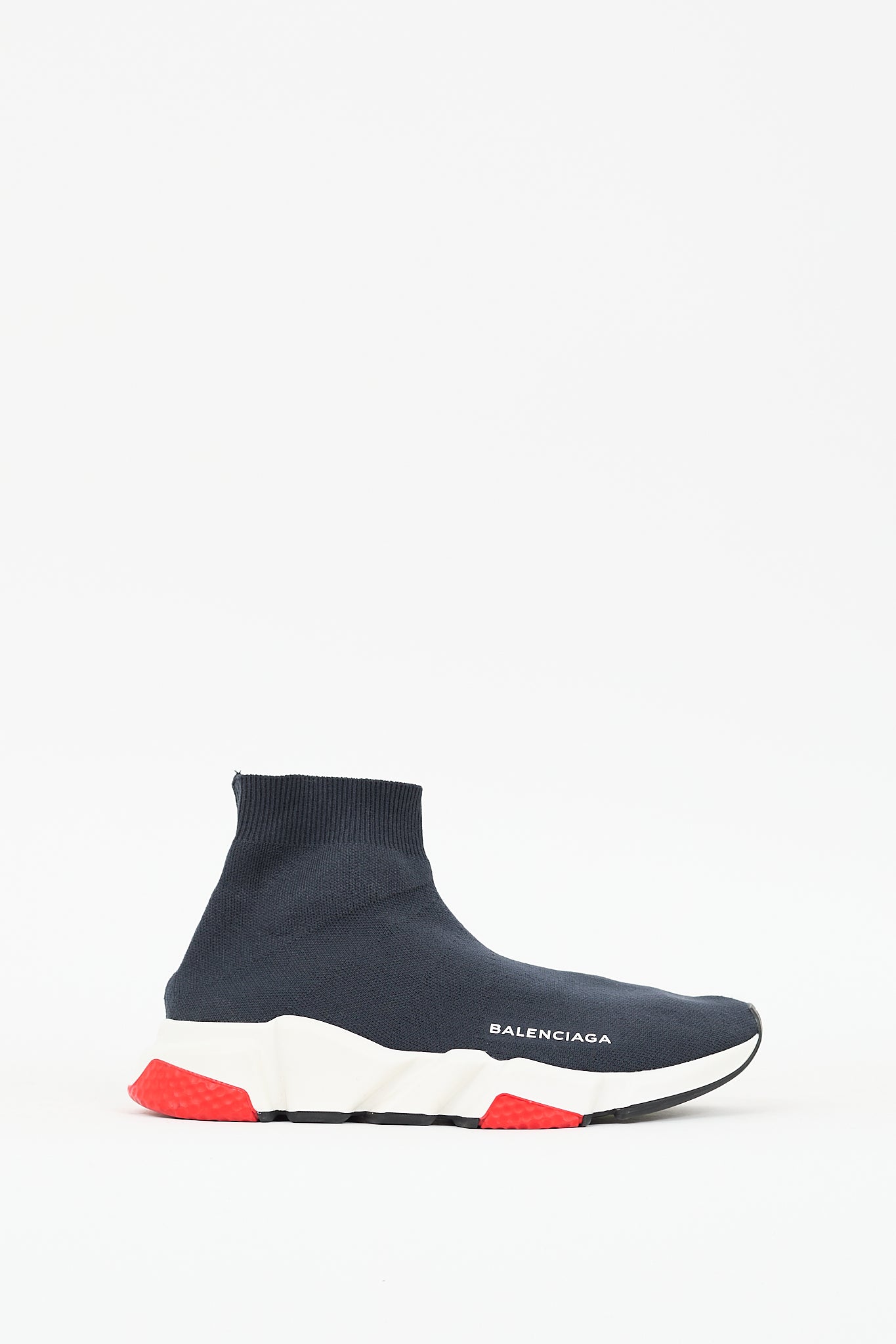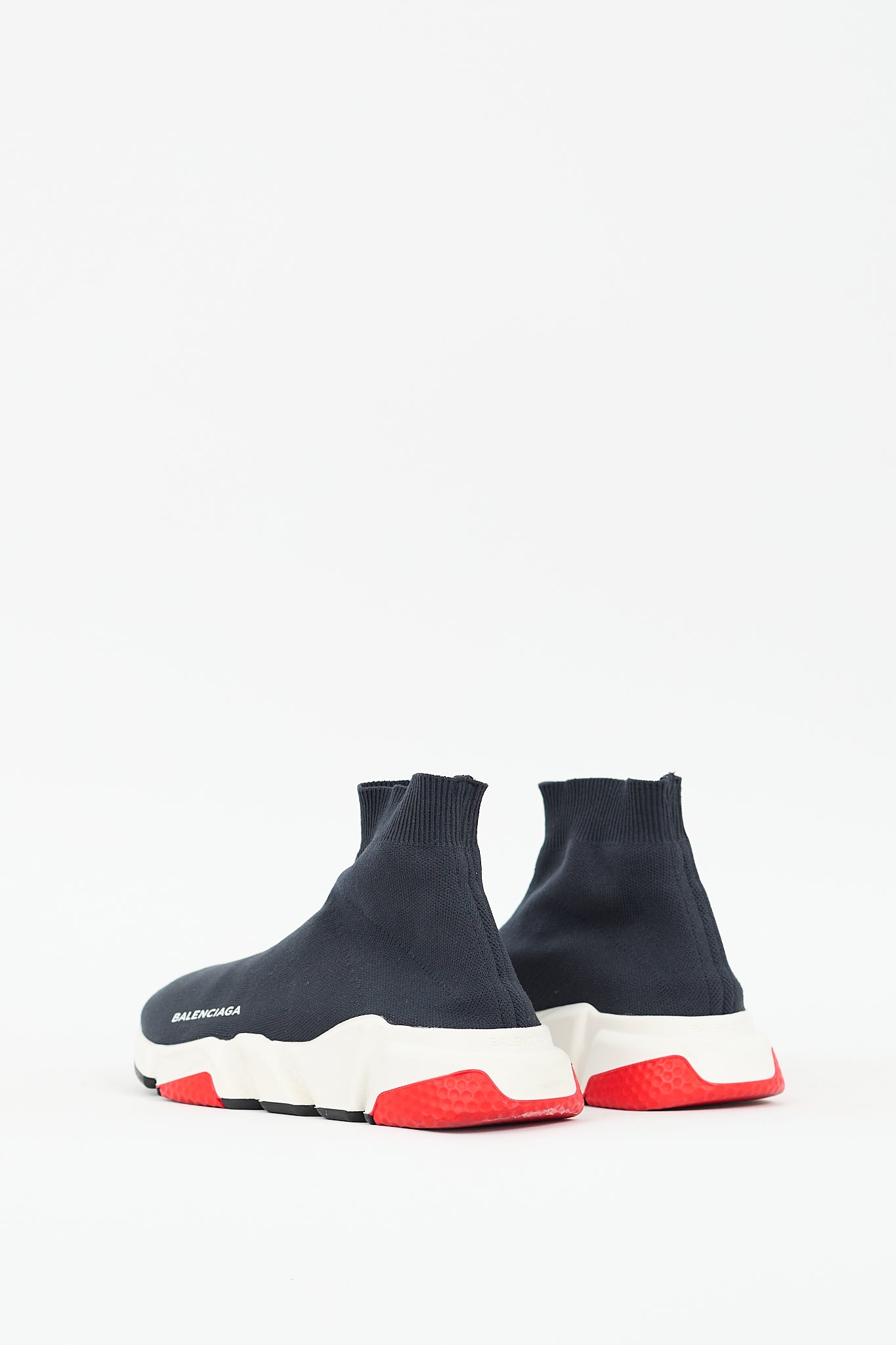 Pre-owned Balenciaga black and red Speed Knit sneakers featuring rounded toe, textile upper with printed logo at outer sides, red and white rubber midsole with debossed logo at heel, and elasticized entry.