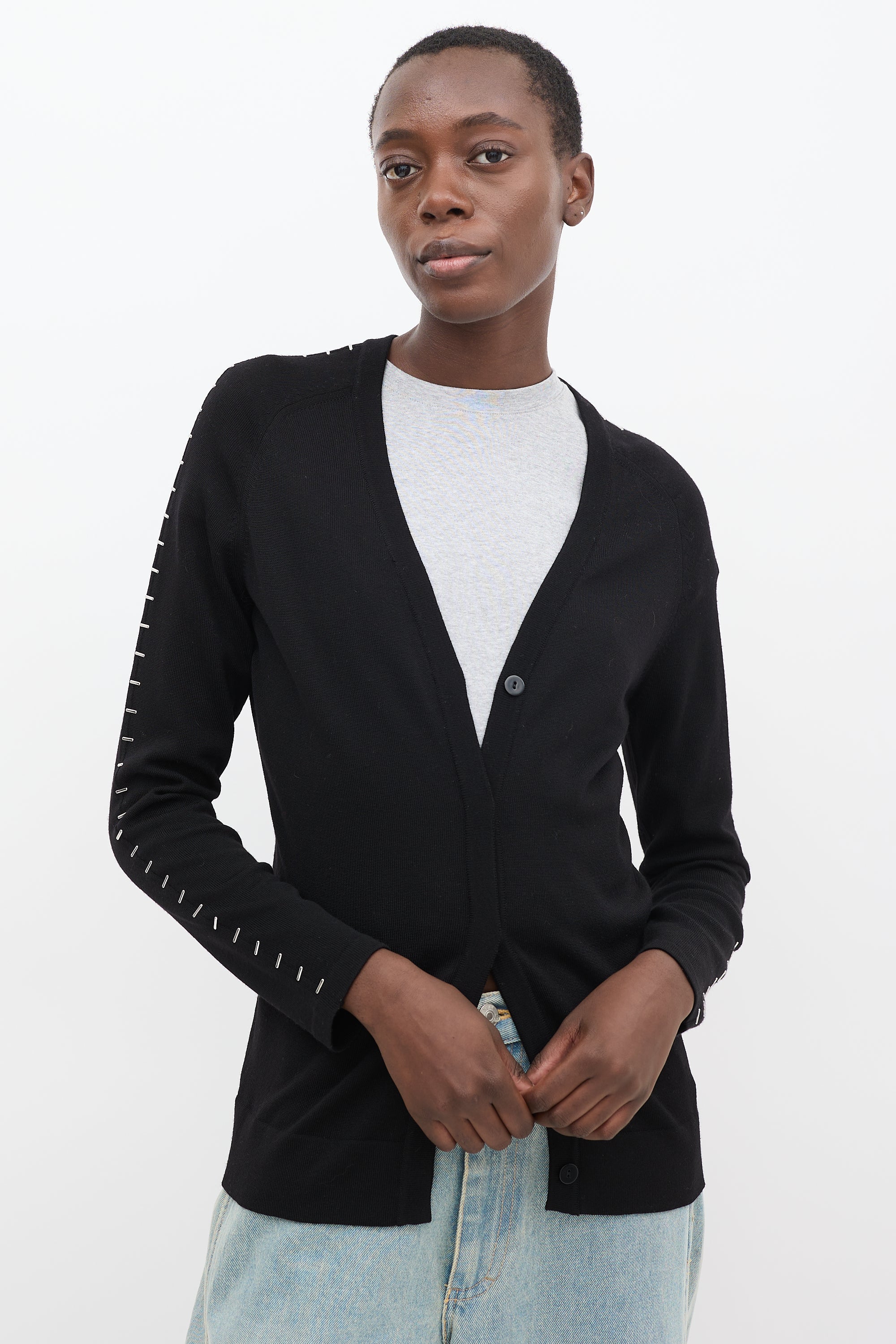 Pre-owned Balenciaga black wool cardigan featuring a V-neckline, concealed button up front, even hem, long sleeves, ribbing at placket, hem, and cuffs, and silver tone staple detail along shoulders and arms.