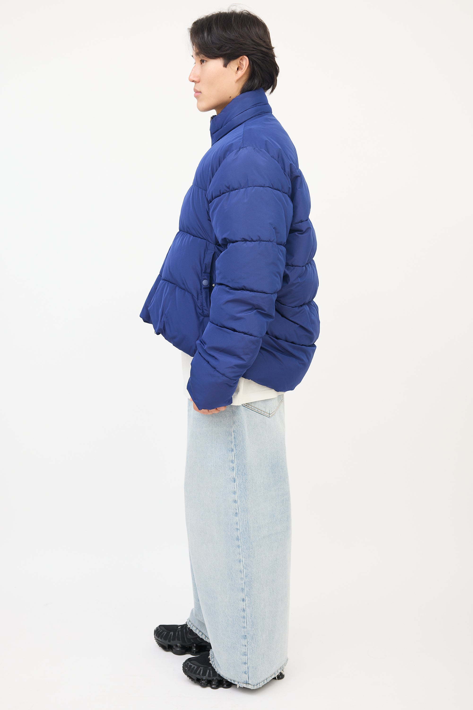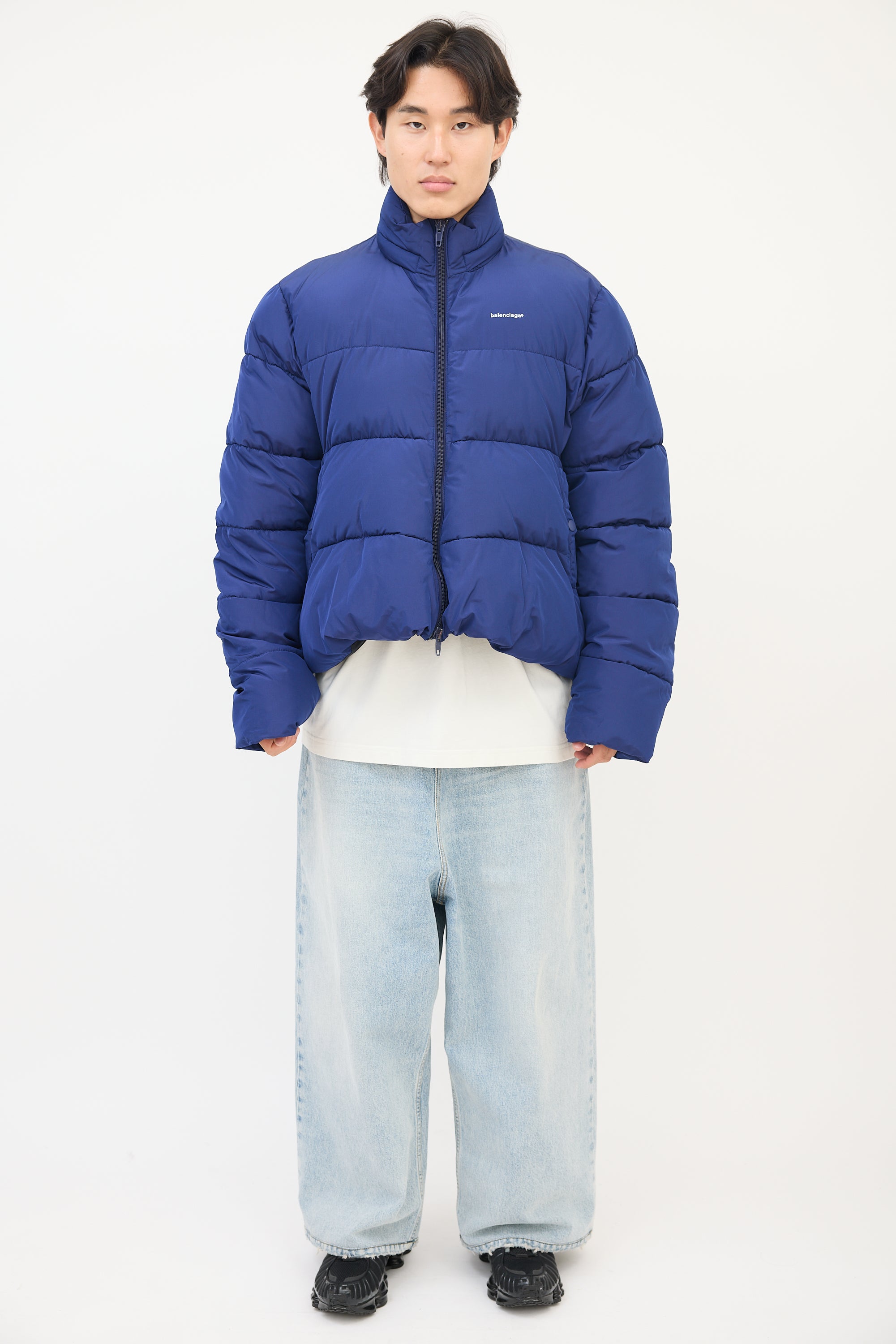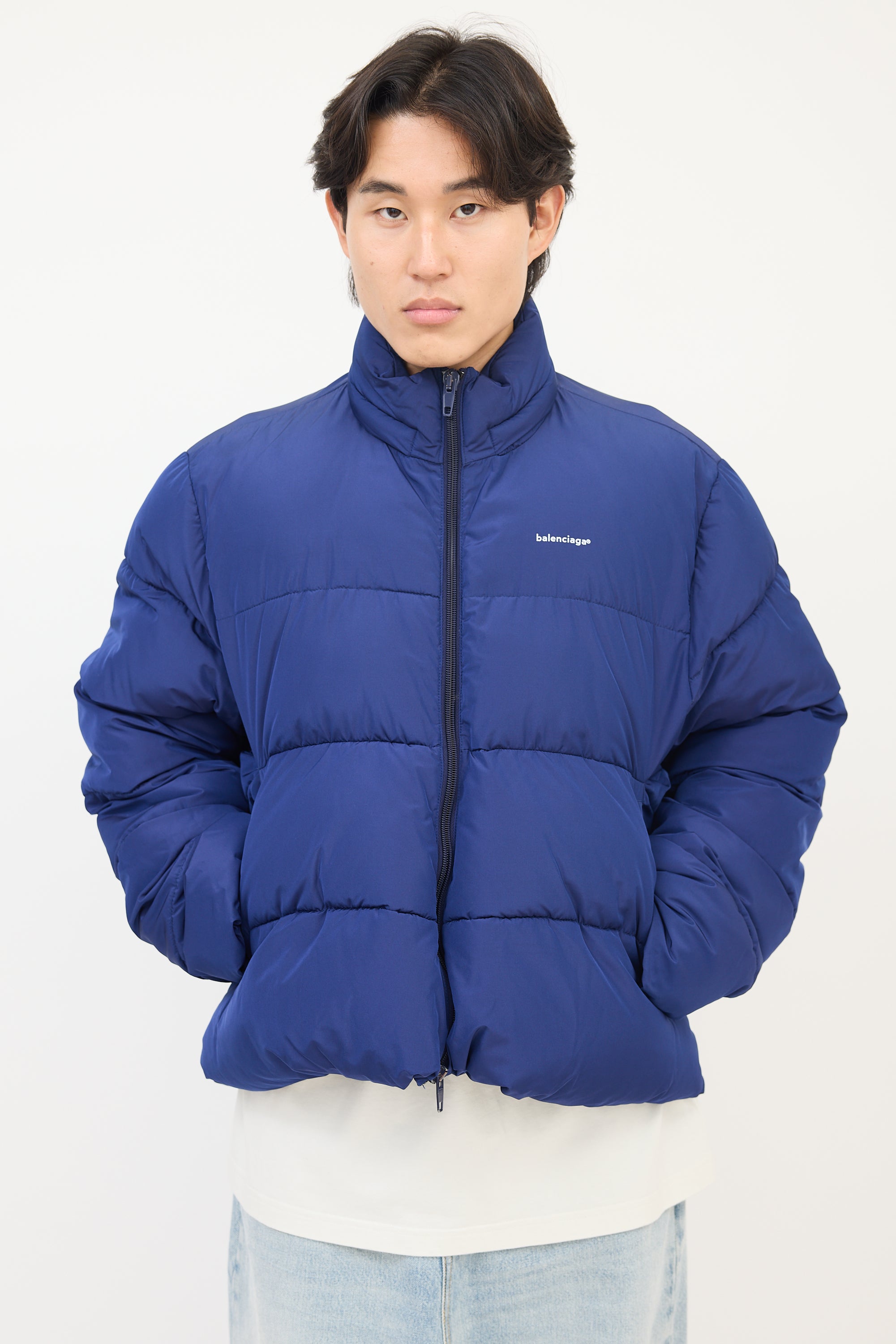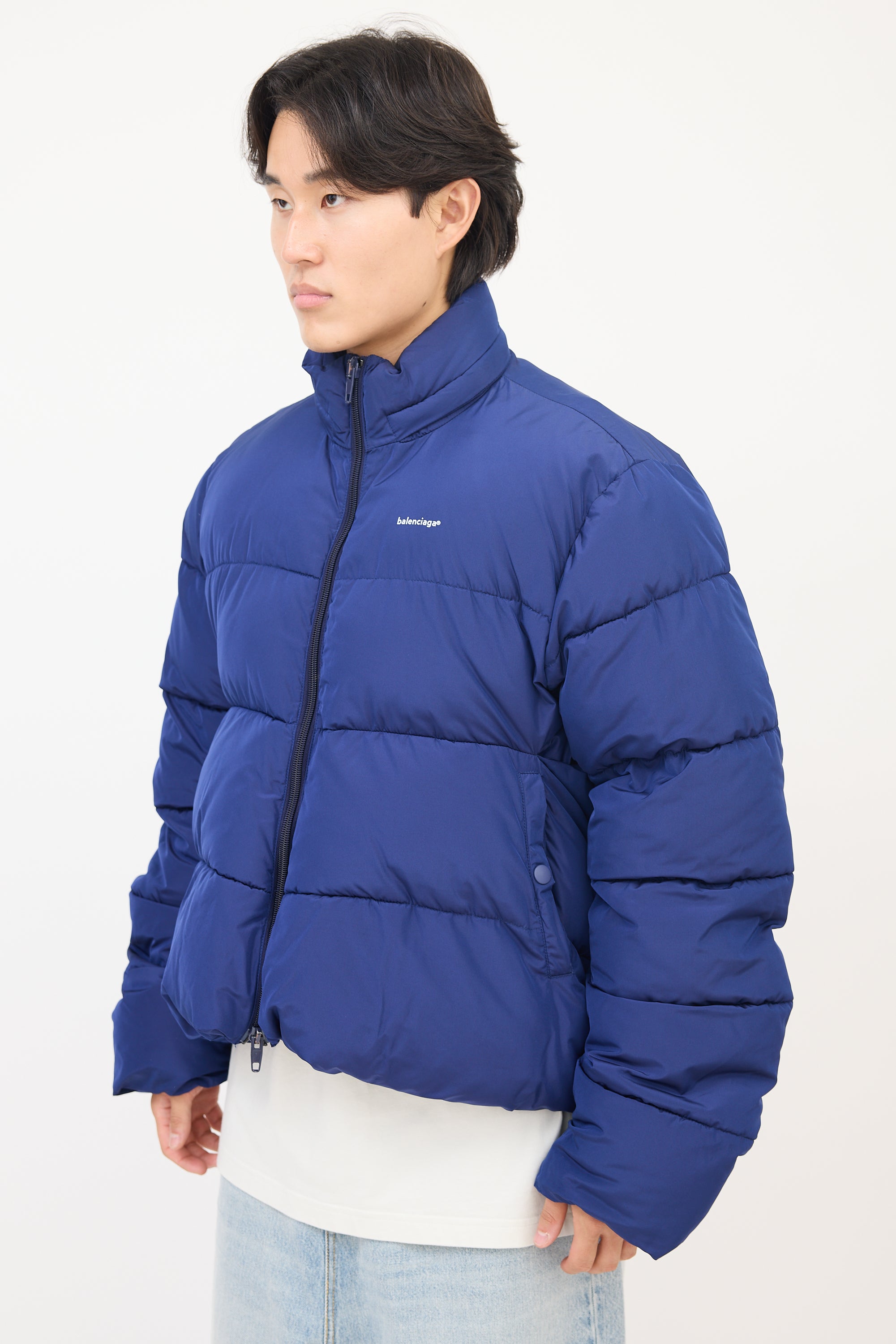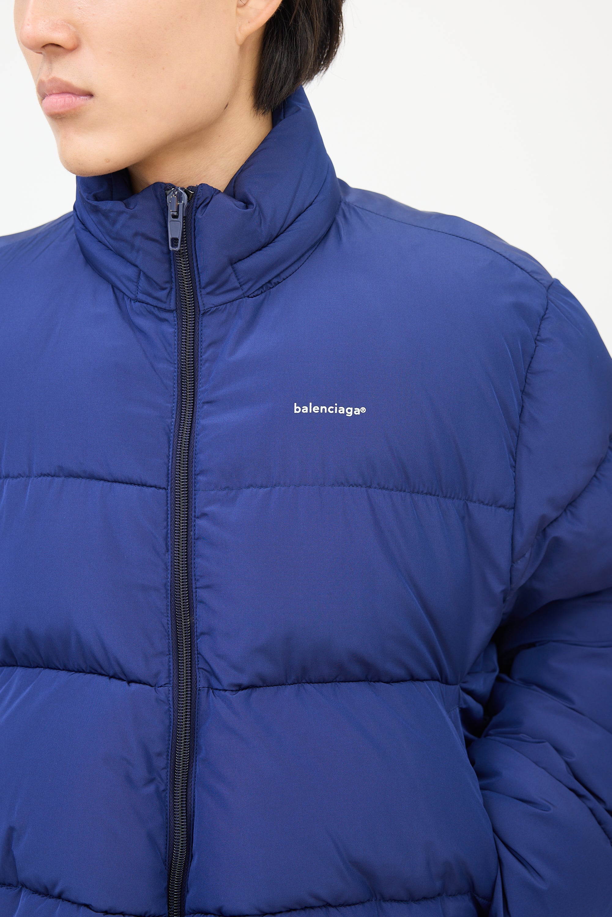 Pre-owned Balenciaga blue puffer jacket featuring a funnel collar, packable hood, front double zip, two buttoned welt pockets at front waist, hand warm pocket with underarm entry, white printed logo at left chest, even hem, and long sleeves. Padded and lined. Comes with original garment bag and hanger.