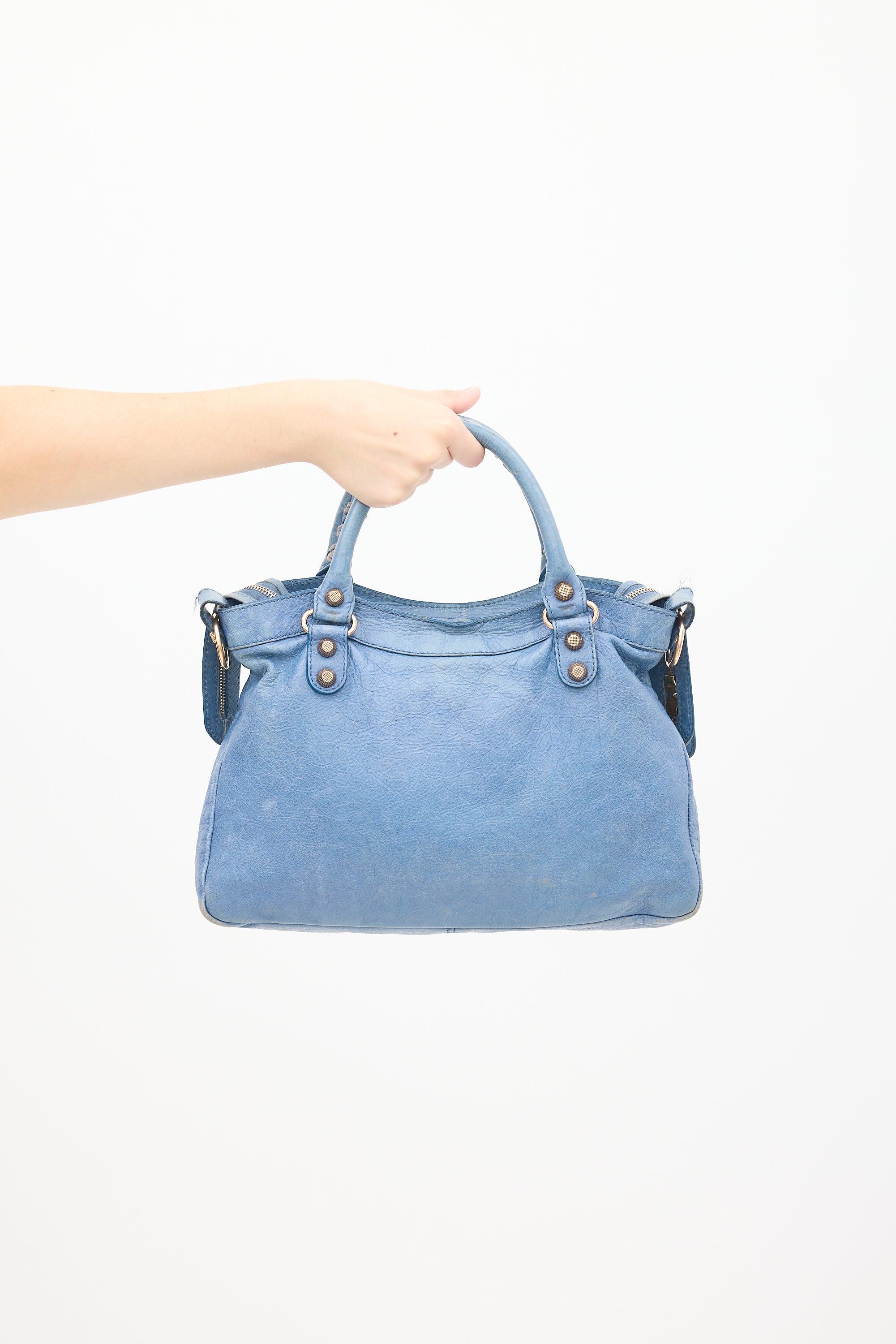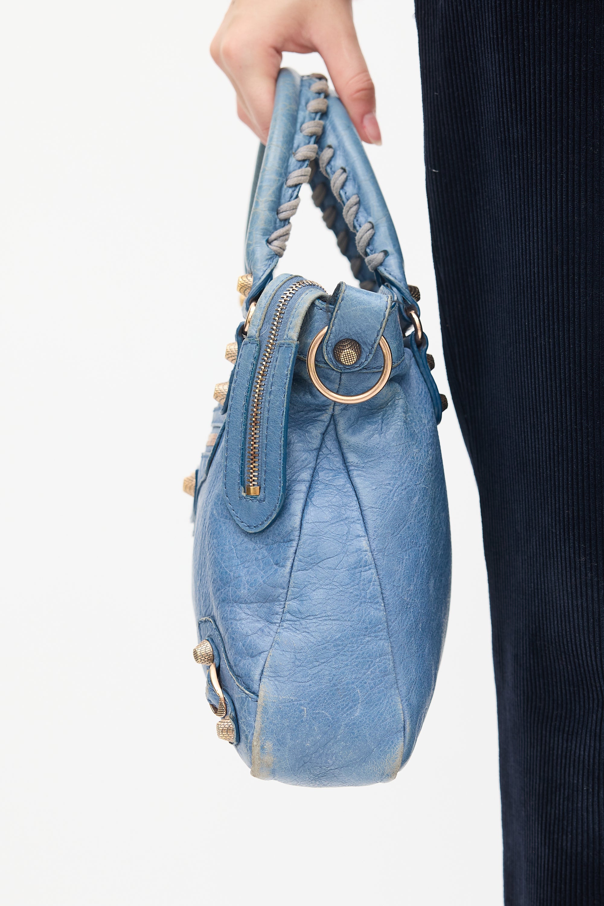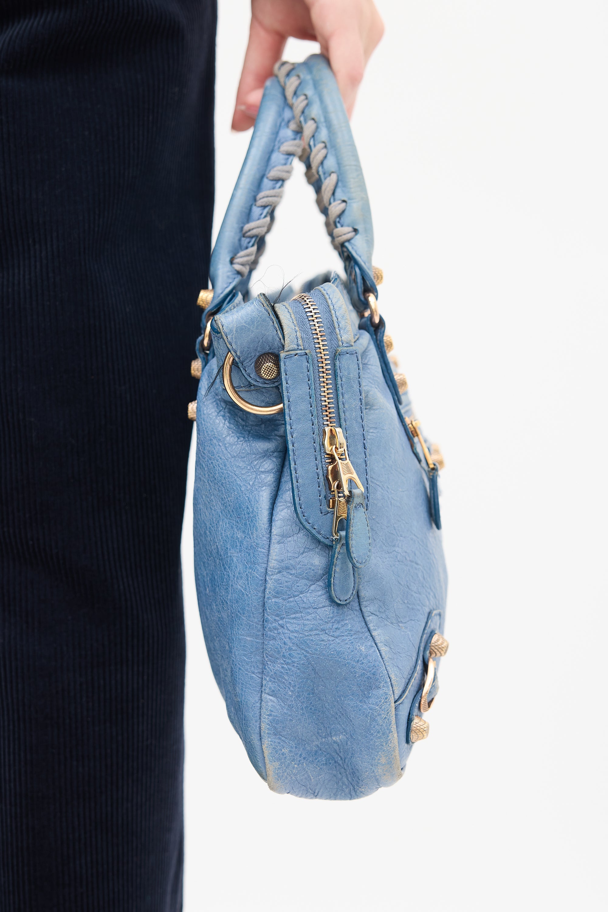 Pre-owned Balenciaga blue Motocross City leather bag featuring two braided top handles, front exterior zip pocket, detachable shoulder strap, one main compartment with two slip pockets and one zip pocket, gold tone hardware, and top zip closure.